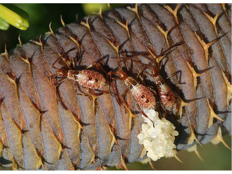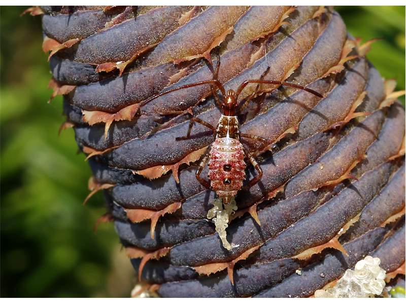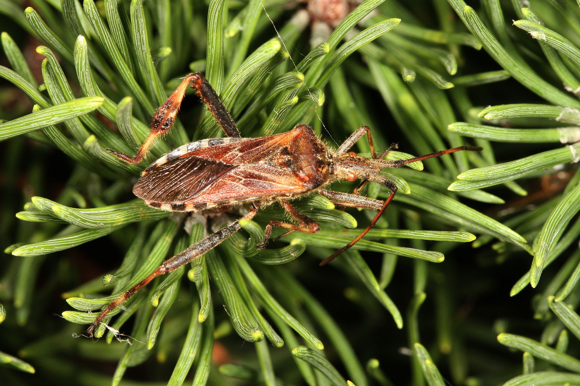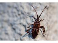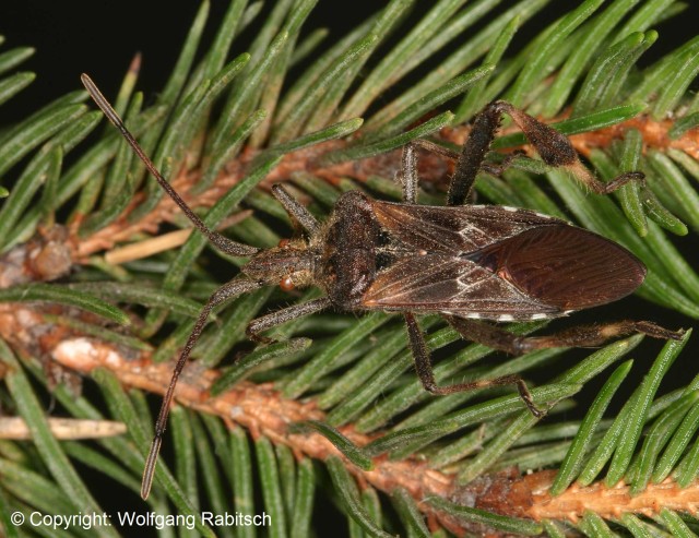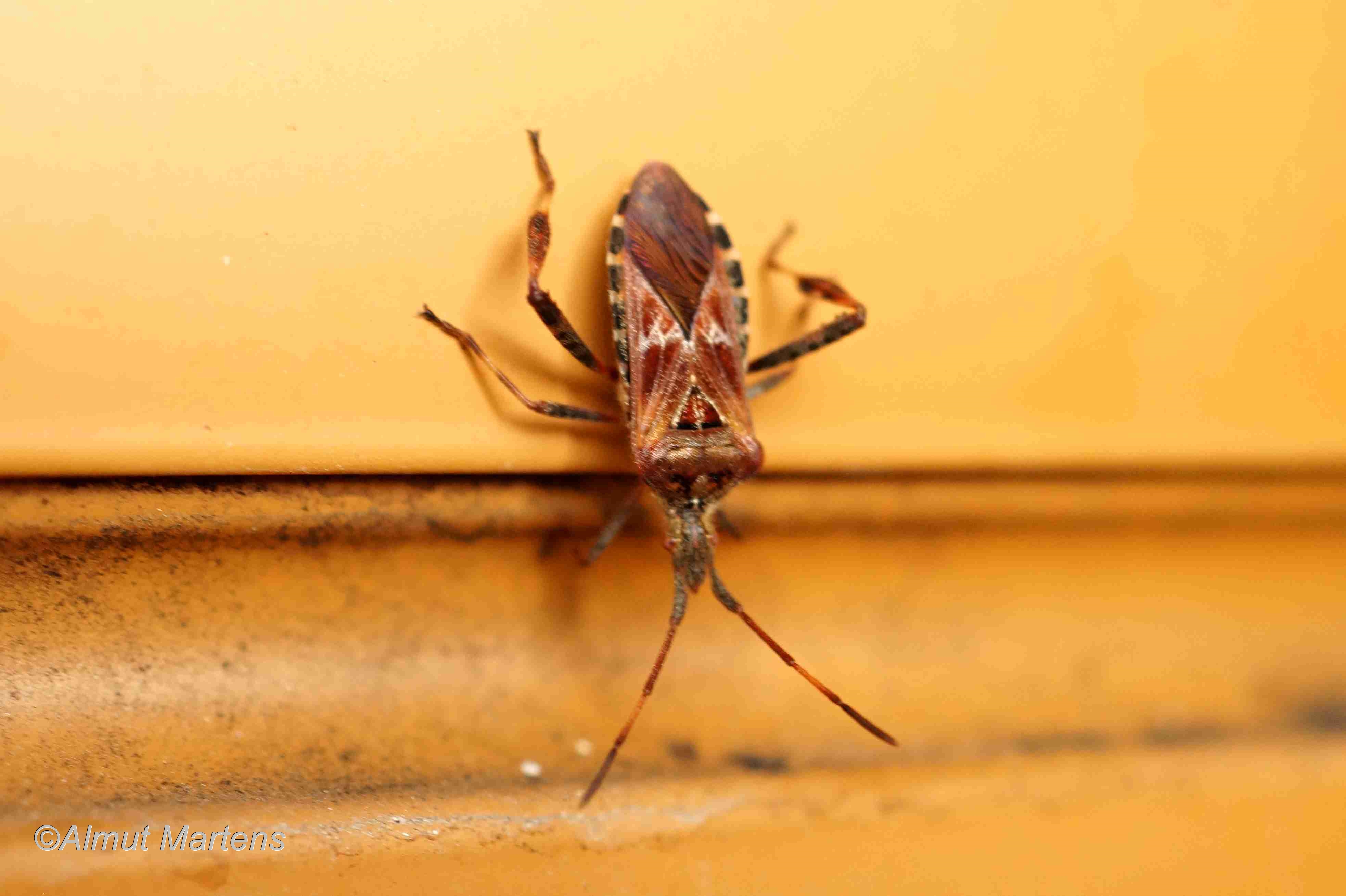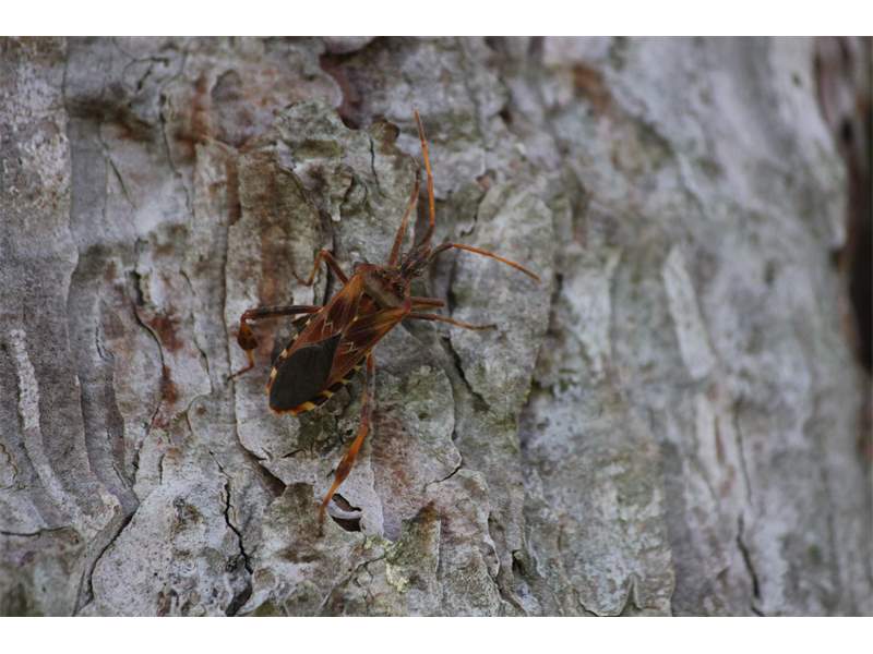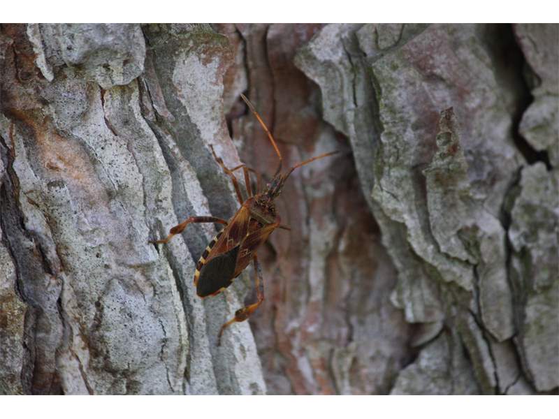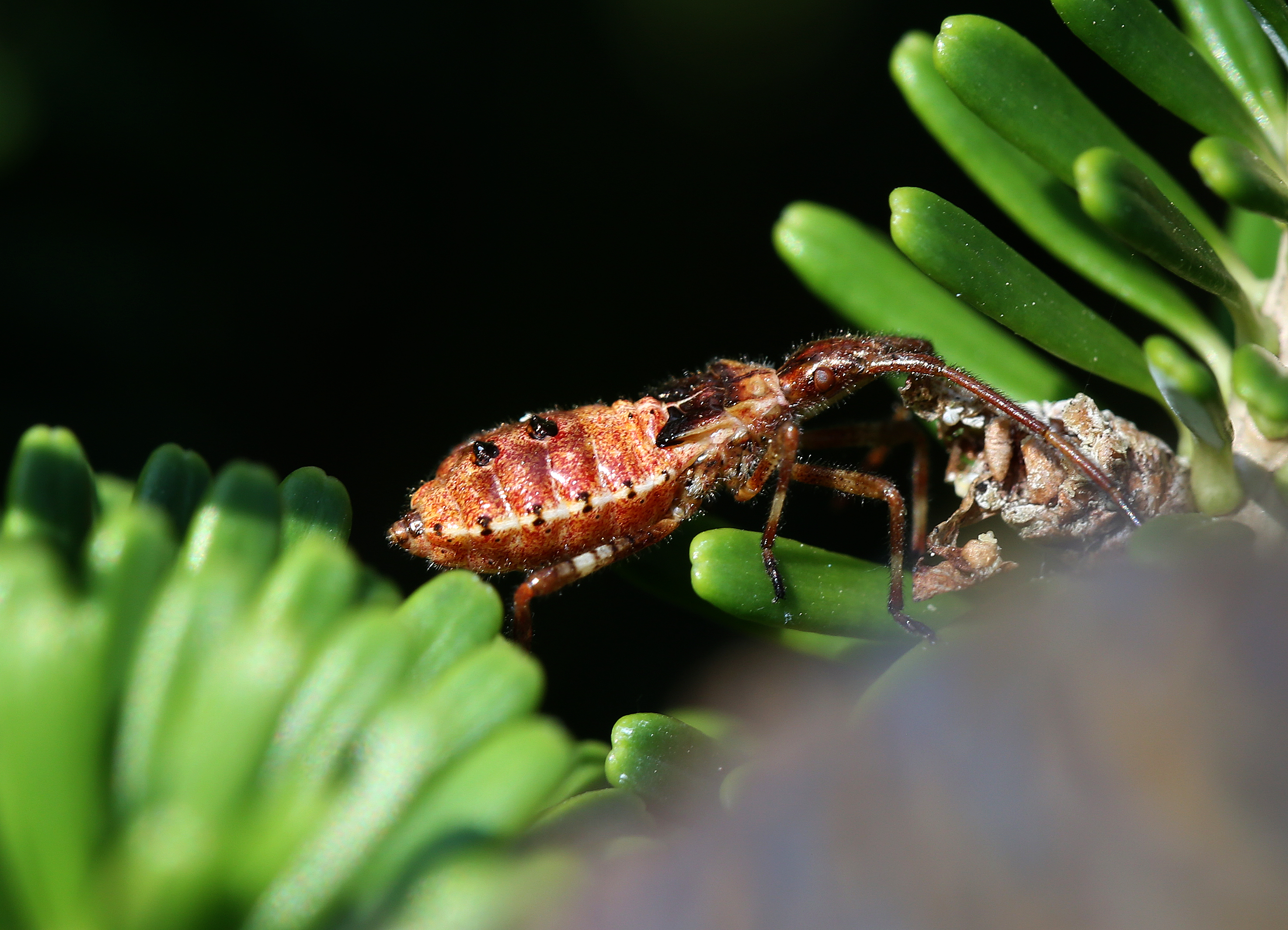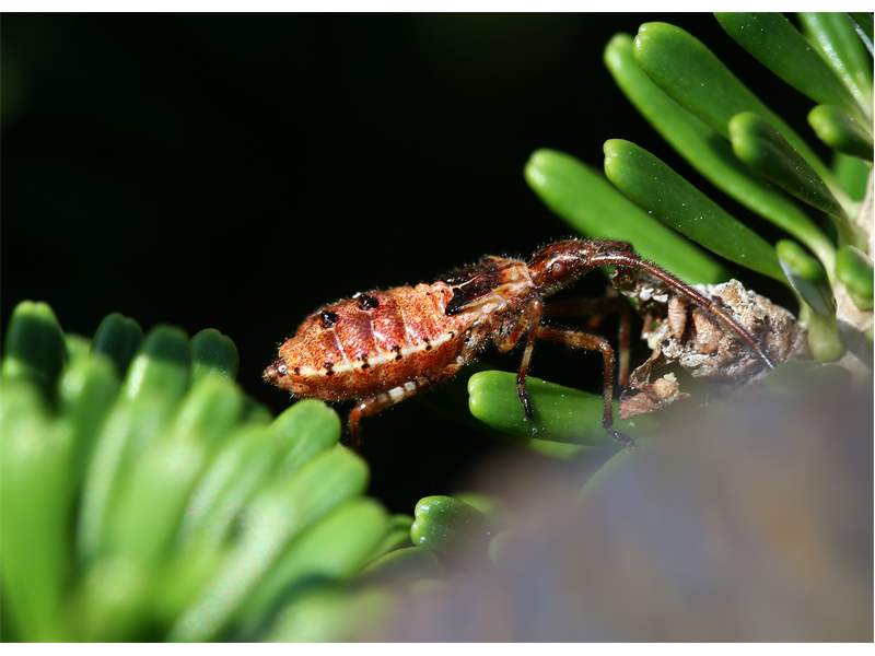 Larve der Amerikanischen Zapfenwanze ( Leptoglossus occidentalis). Deutschland, Baden-Württemberg, Baden-Baden, einzeln stehende Kiefer nord-nord-westlich Ortsteil Sandweier, 30.06.2012 (© Michael Münch)( Bild vergrößern)