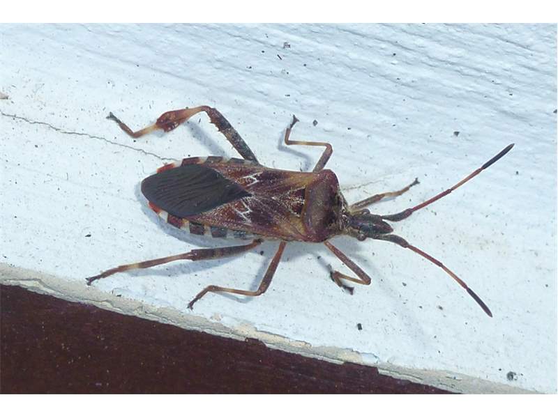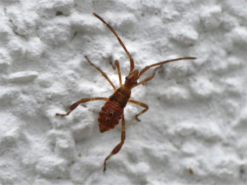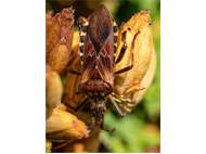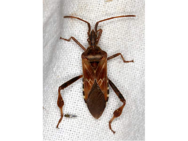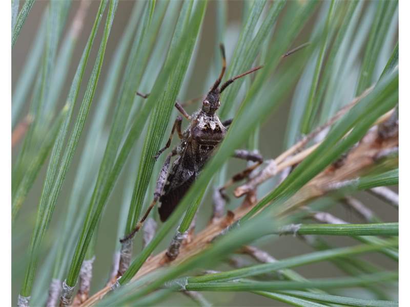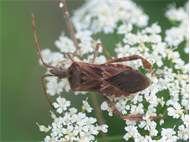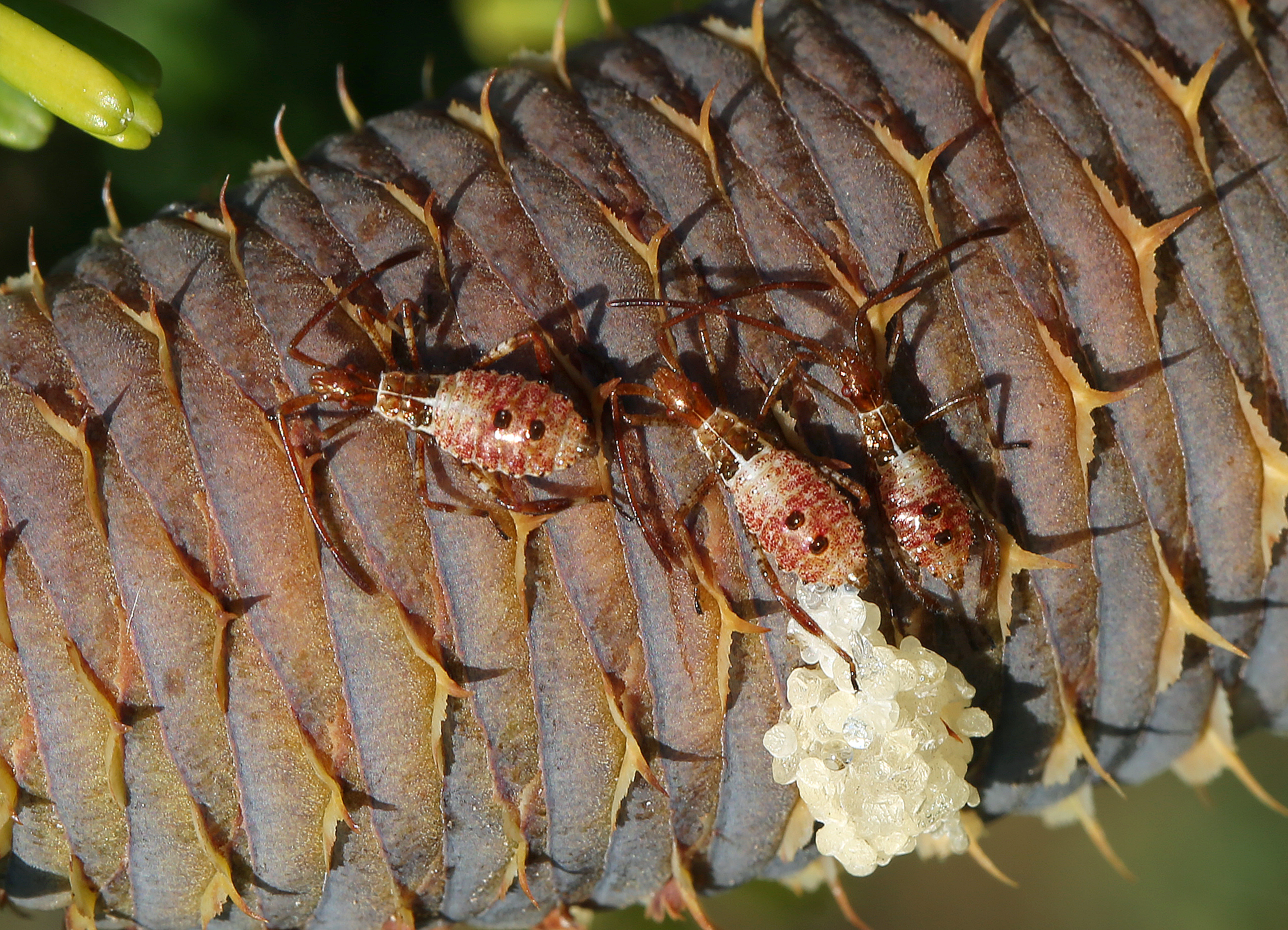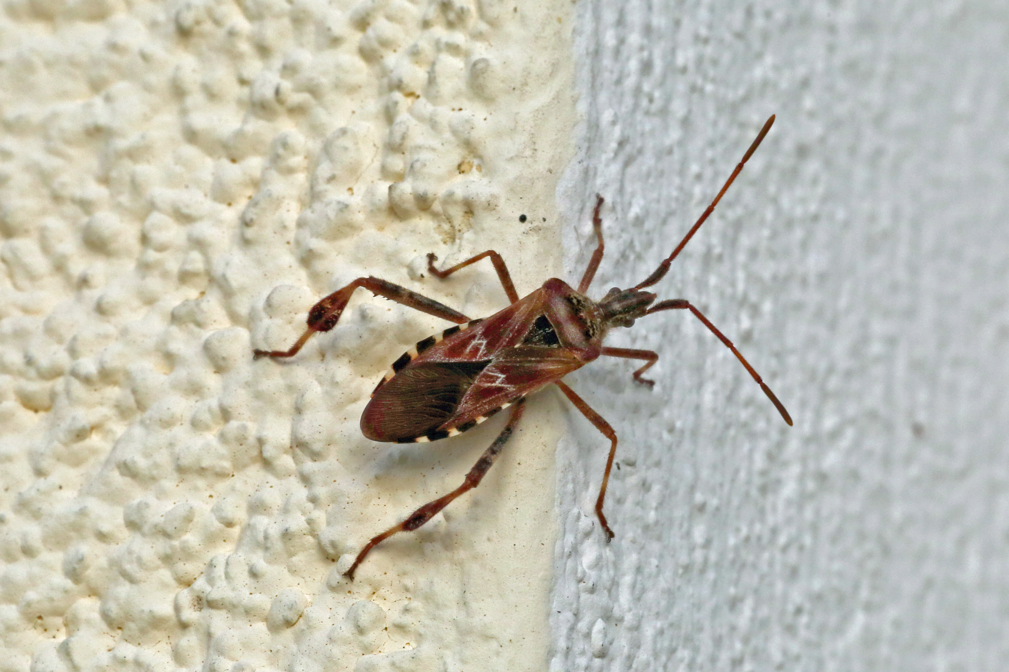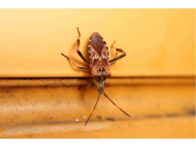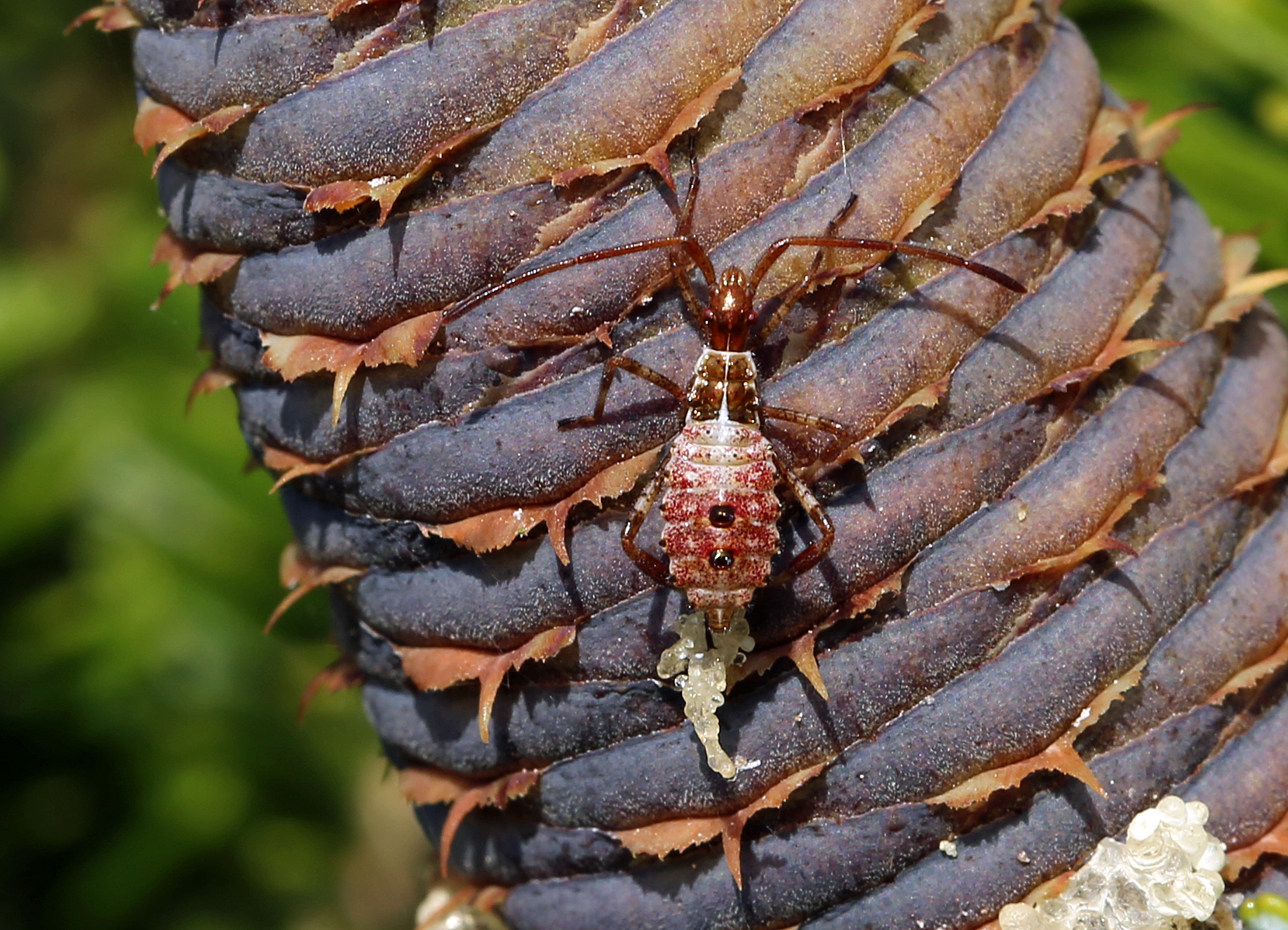 Larve der Amerikanischen Zapfenwanze ( Leptoglossus occidentalis). Deutschland, Baden-Württemberg, Baden-Baden, einzeln stehende Kiefer nord-nord-westlich Ortsteil Sandweier, 30.06.2012 (© Michael Münch)( Bild vergrößern)