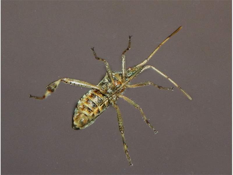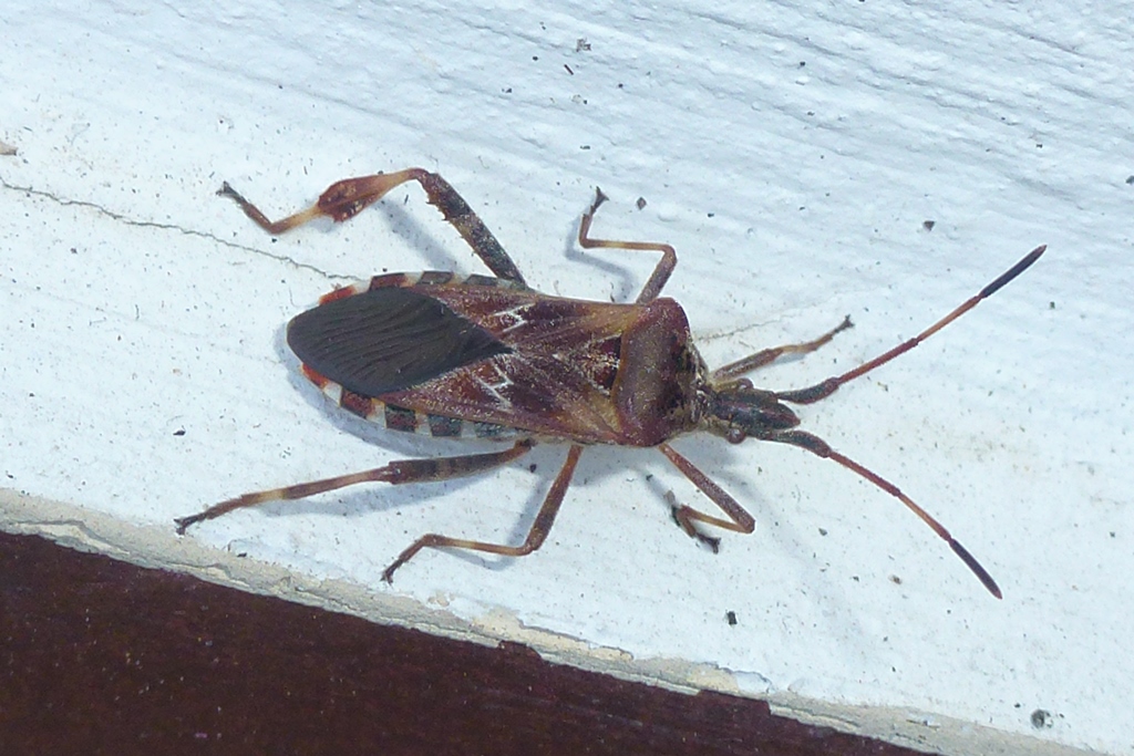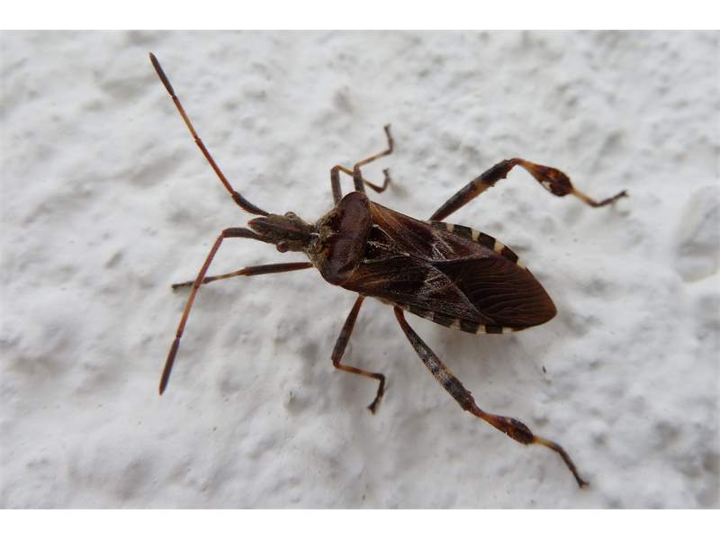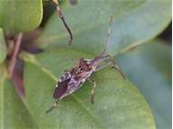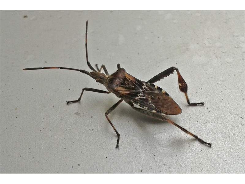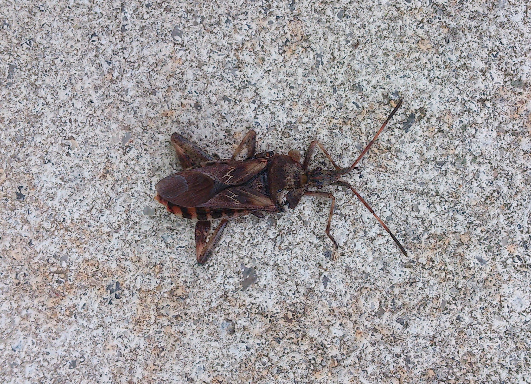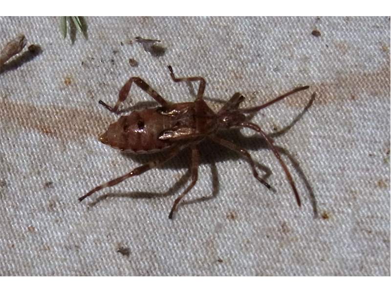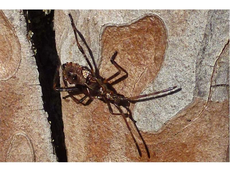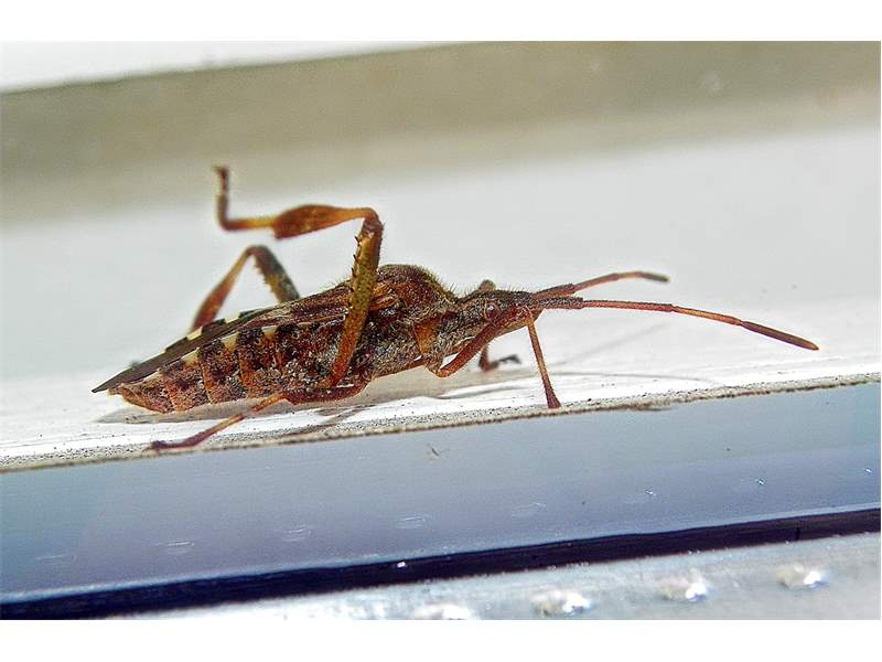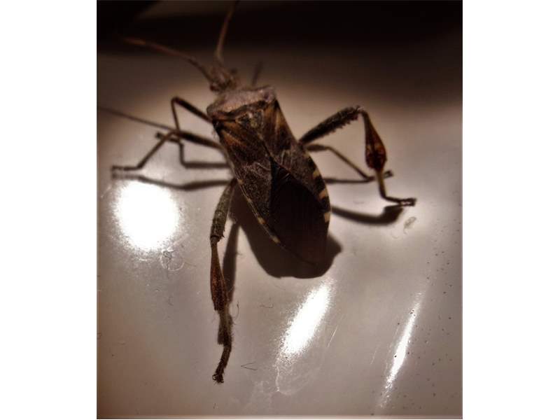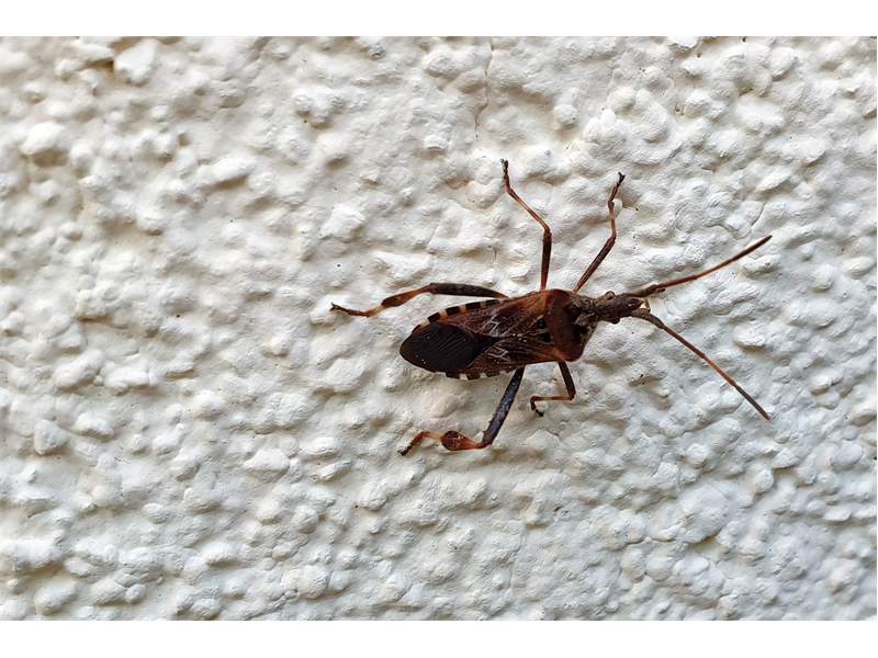 Larve der Amerikanischen Zapfenwanze ( Leptoglossus occidentalis). Deutschland, Baden-Württemberg, Baden-Baden, einzeln stehende Kiefer nord-nord-westlich Ortsteil Sandweier, 30.06.2012 (© Michael Münch)( Bild vergrößern)