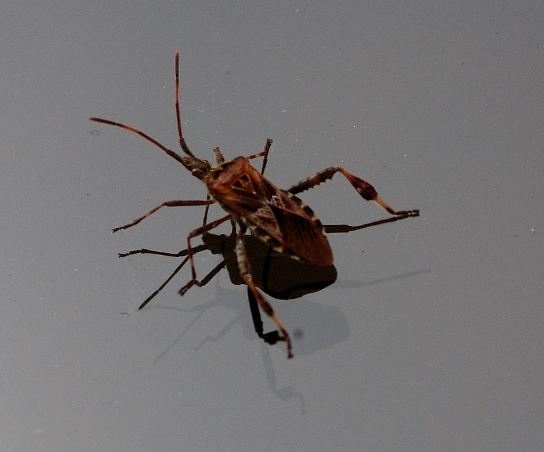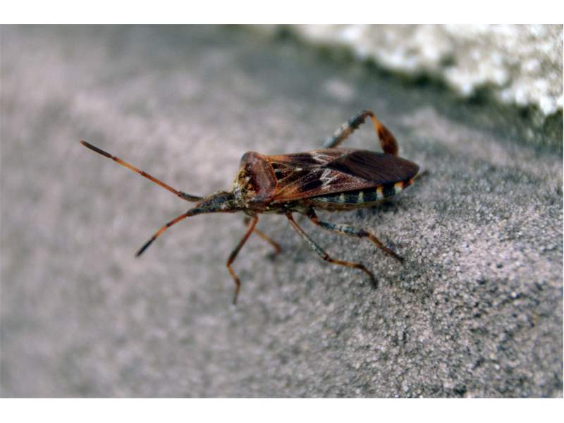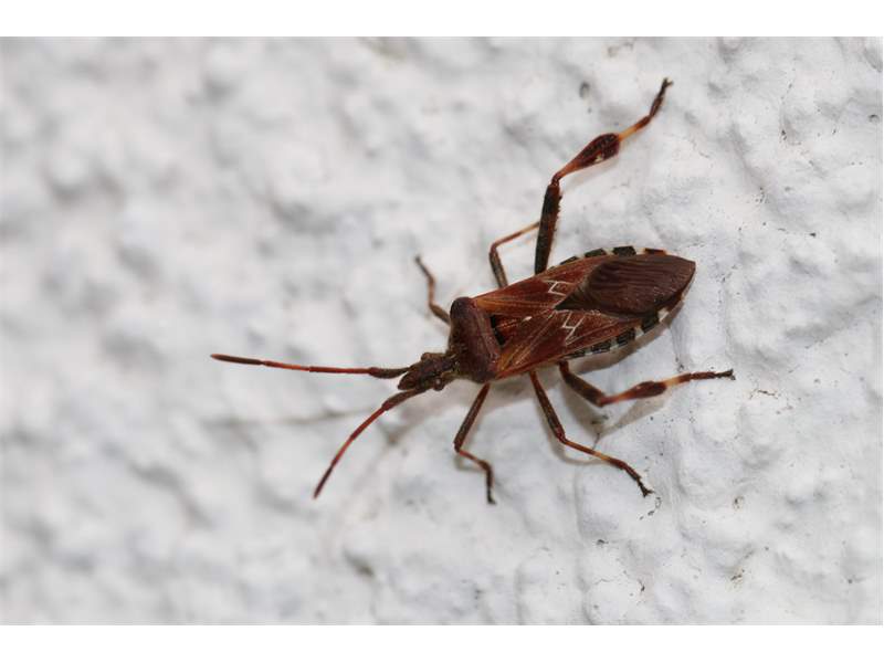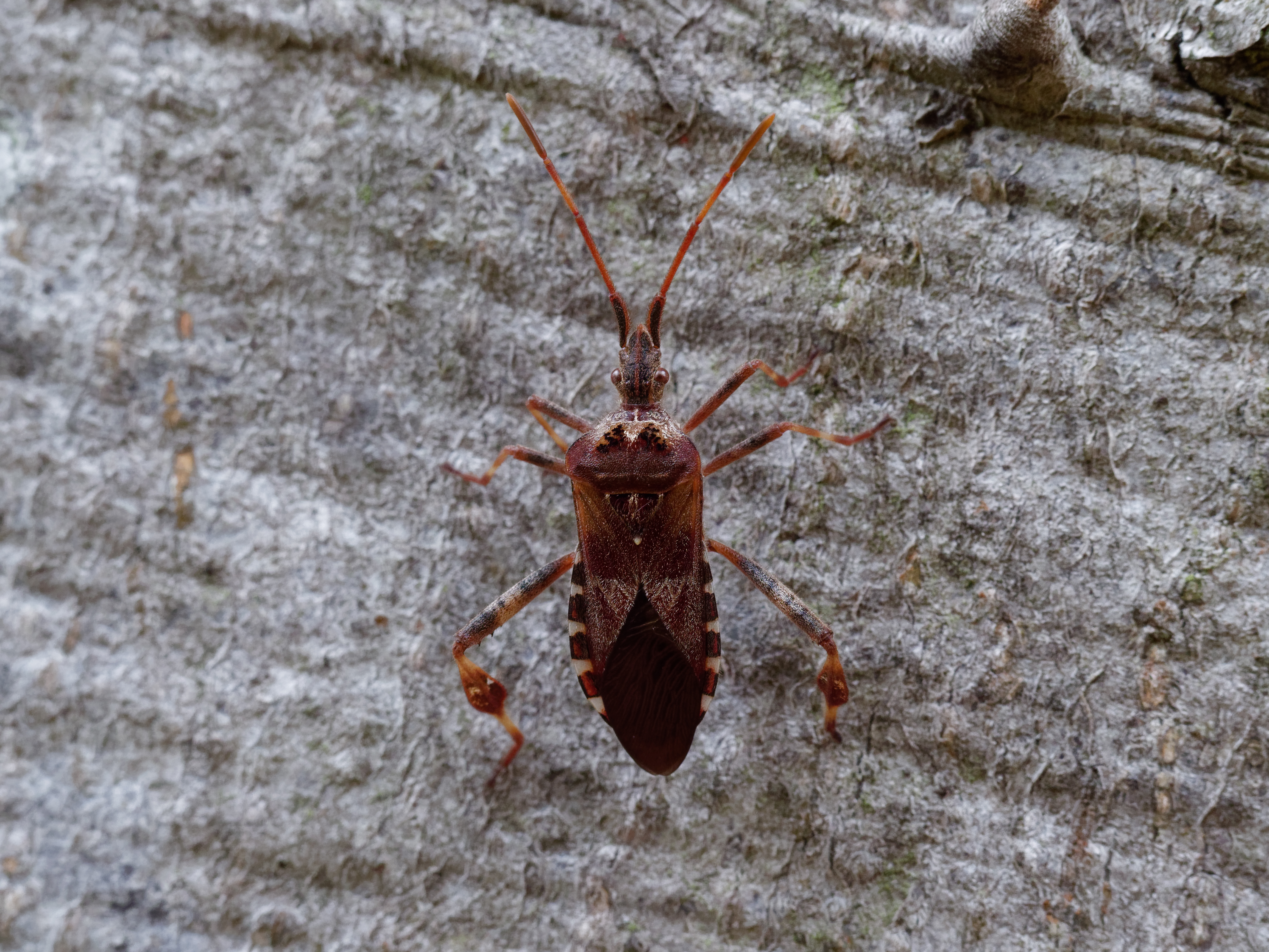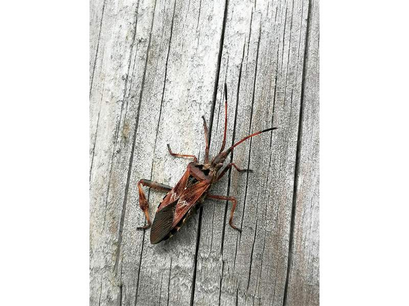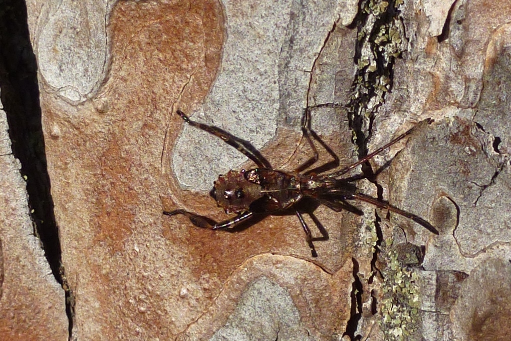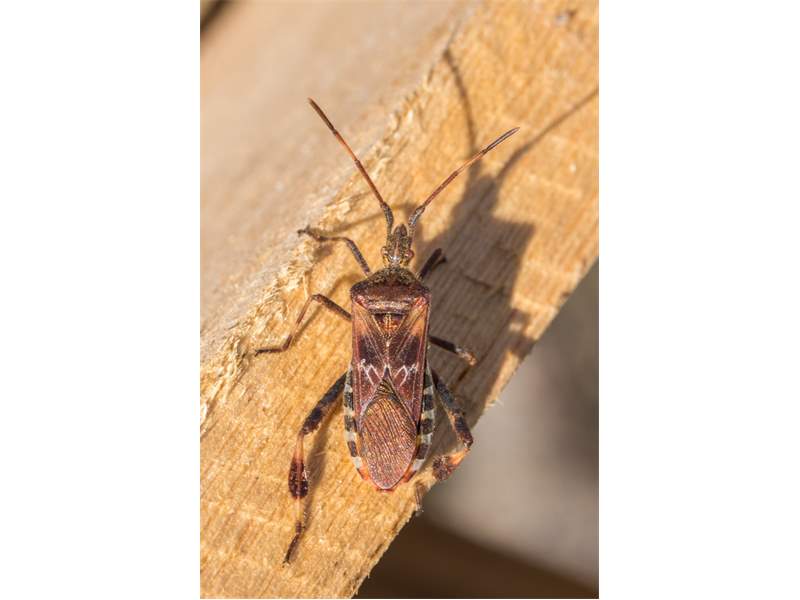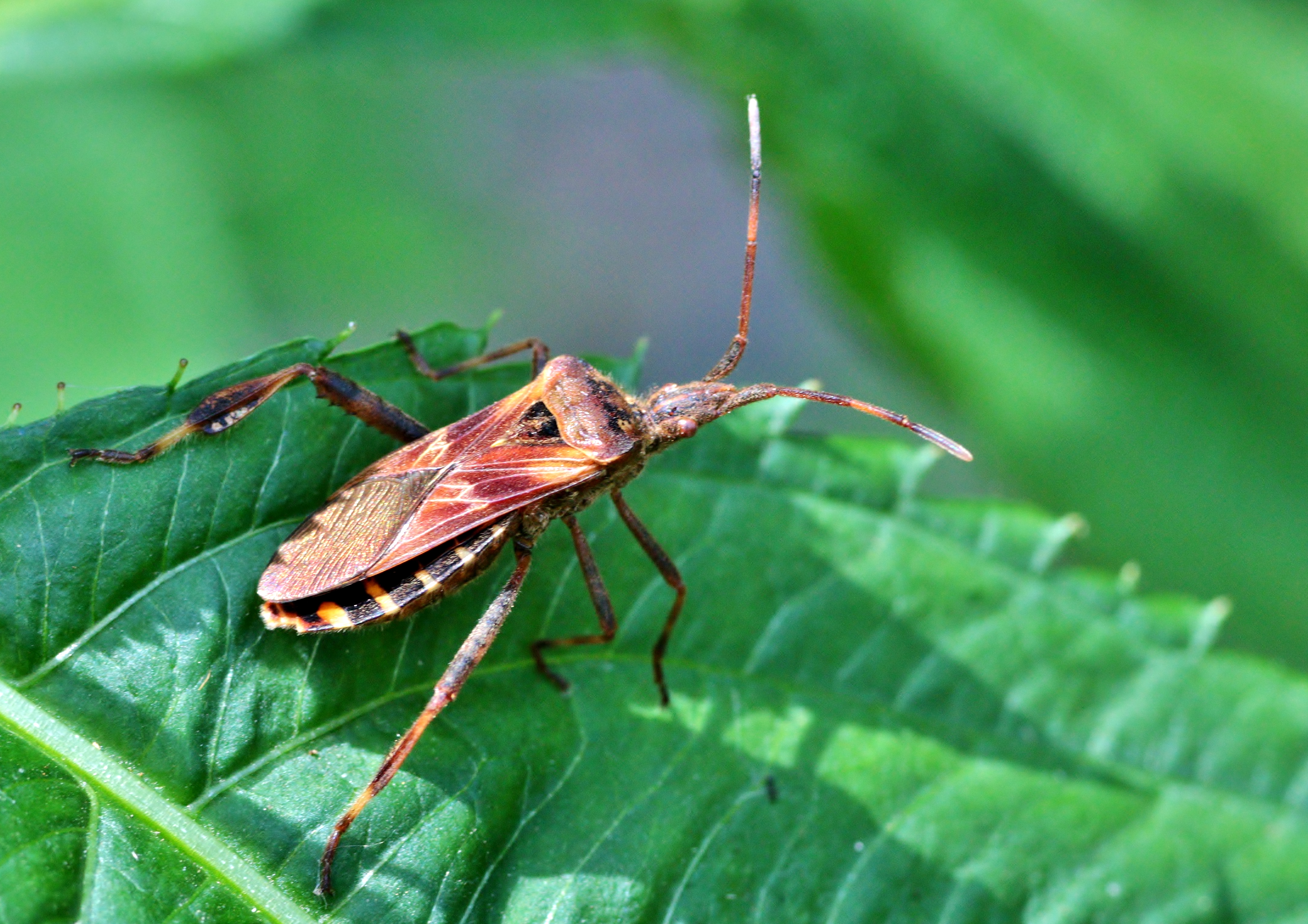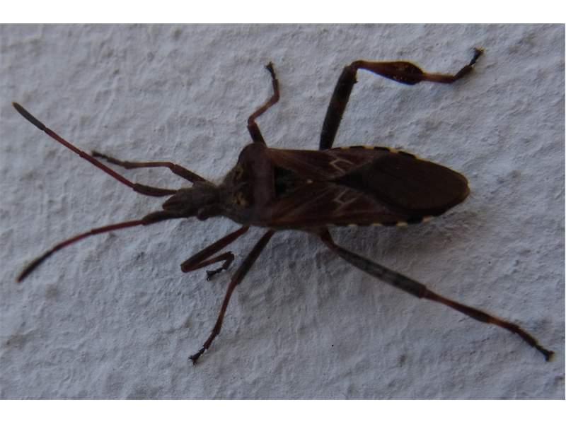 Larve der Amerikanischen Zapfenwanze ( Leptoglossus occidentalis). Deutschland, Baden-Württemberg, Baden-Baden, einzeln stehende Kiefer nord-nord-westlich Ortsteil Sandweier, 30.06.2012 (© Michael Münch)( Bild vergrößern)