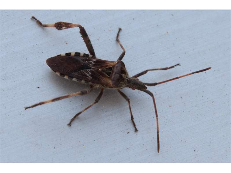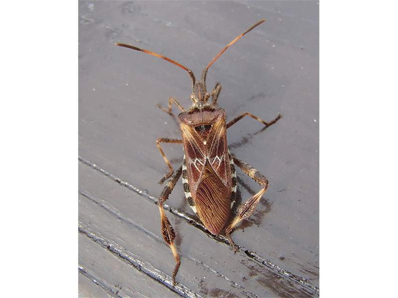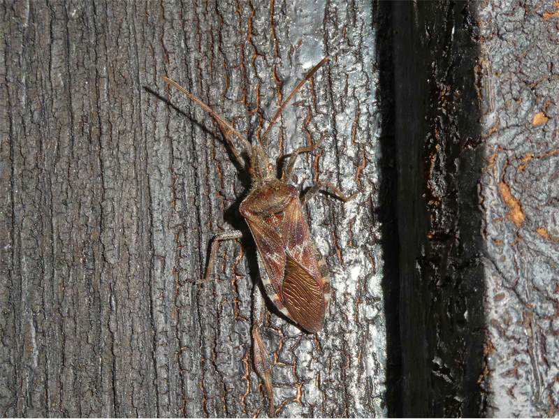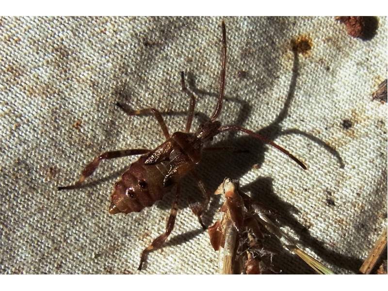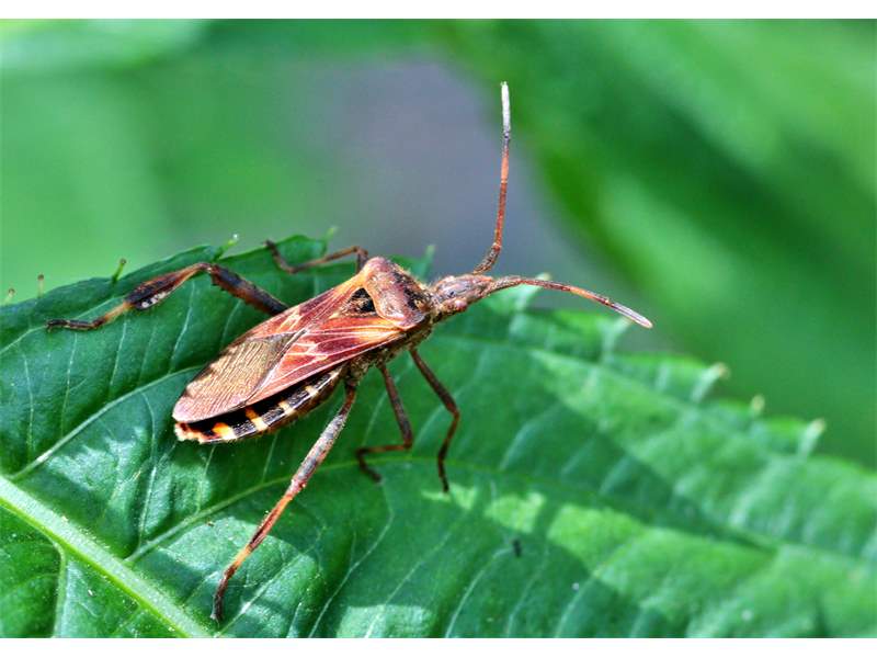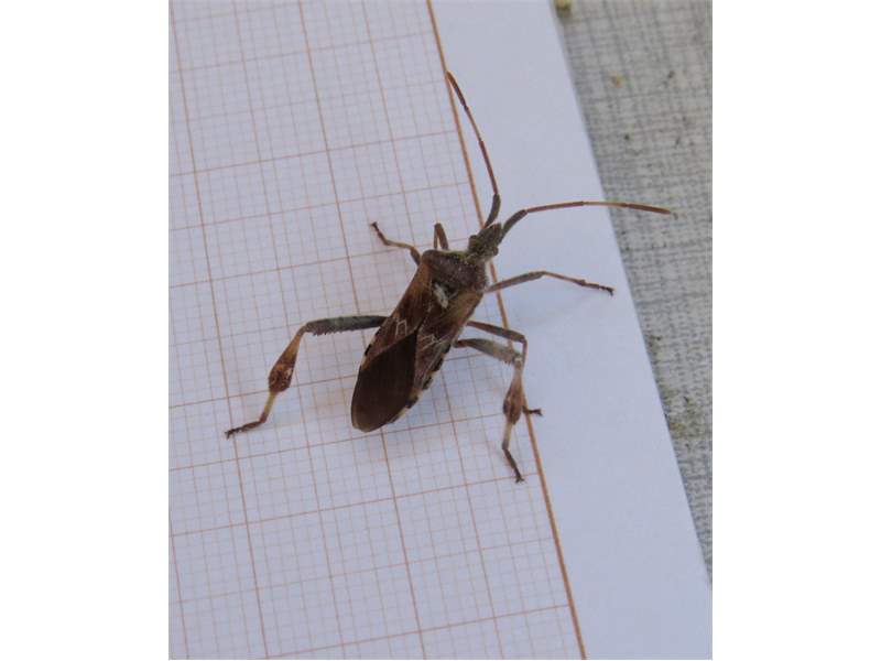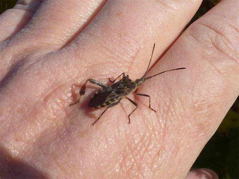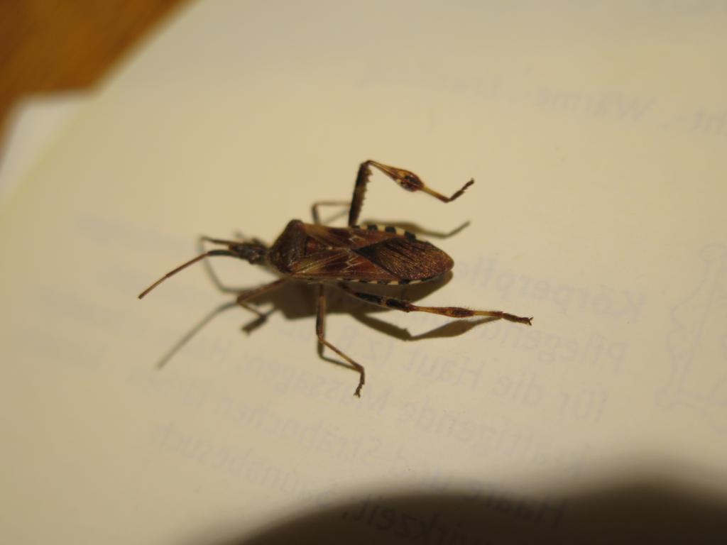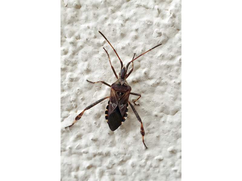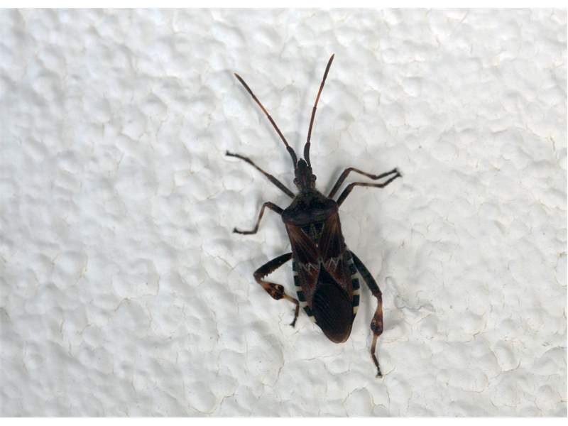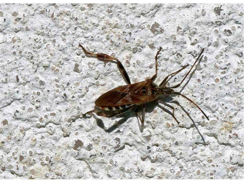 Larve der Amerikanischen Zapfenwanze ( Leptoglossus occidentalis). Deutschland, Baden-Württemberg, Baden-Baden, einzeln stehende Kiefer nord-nord-westlich Ortsteil Sandweier, 30.06.2012 (© Michael Münch)( Bild vergrößern)