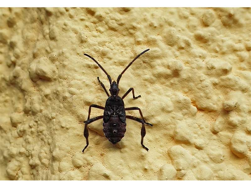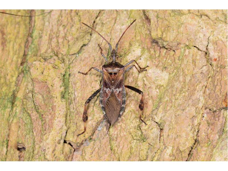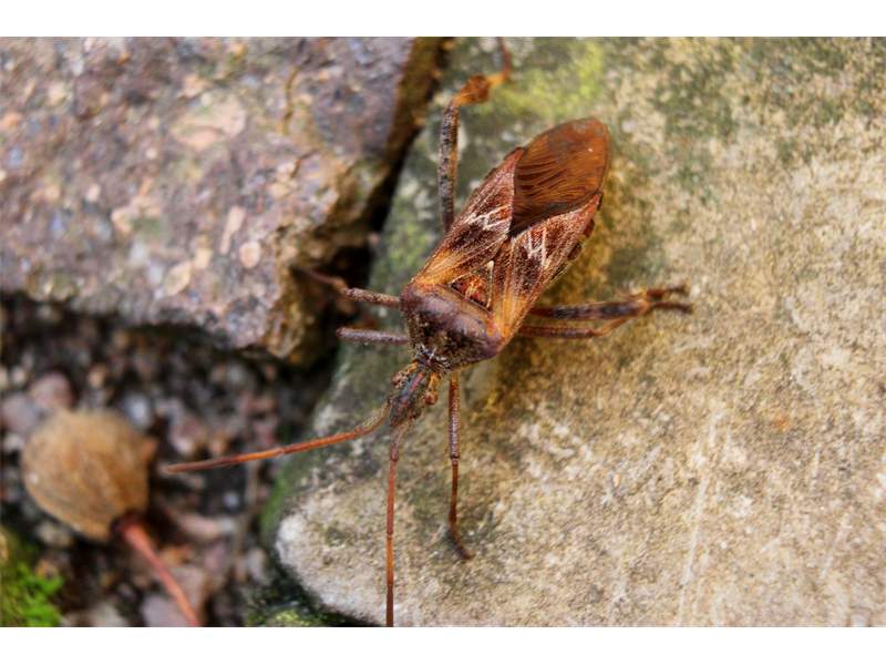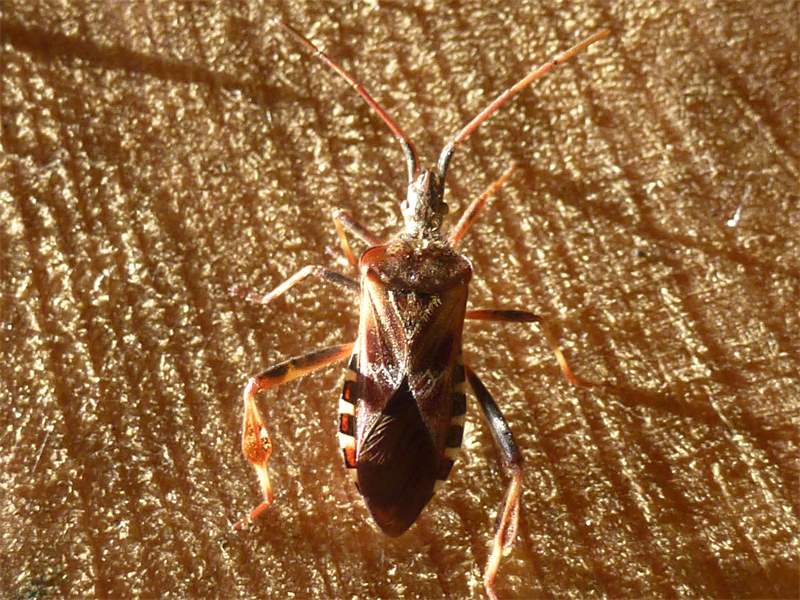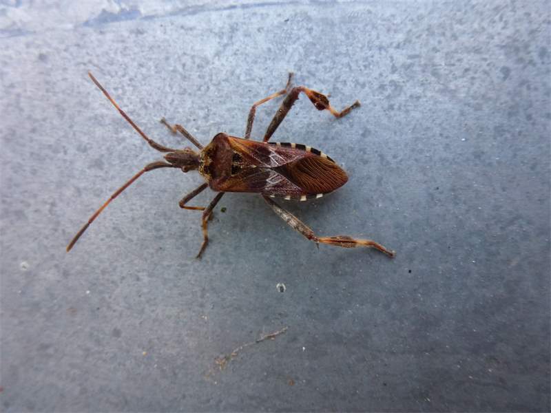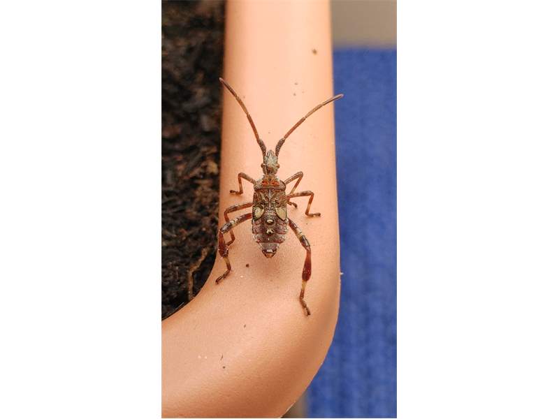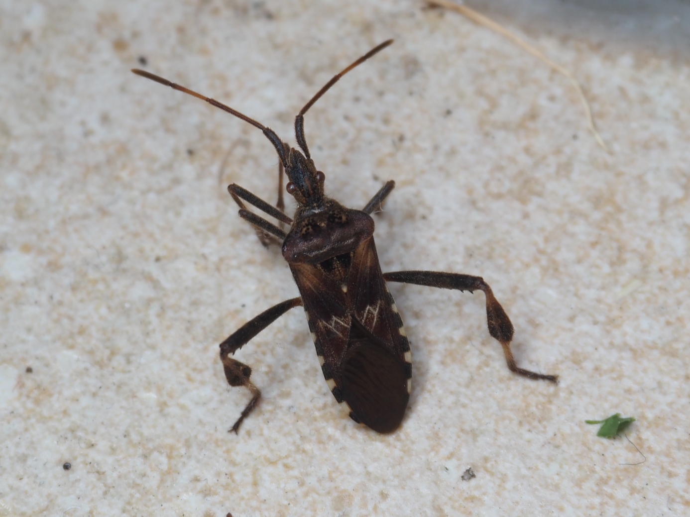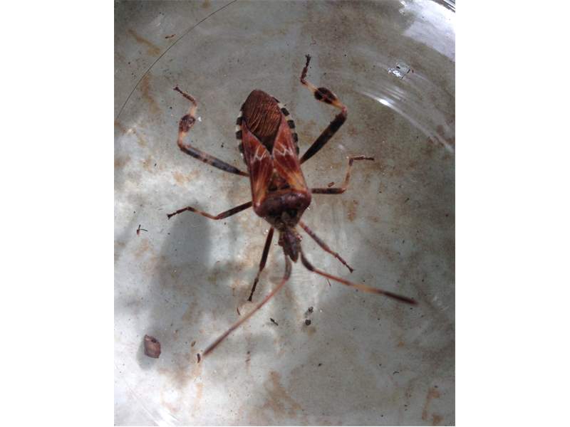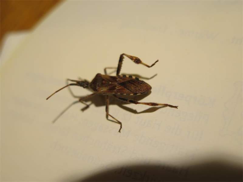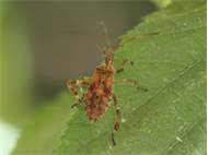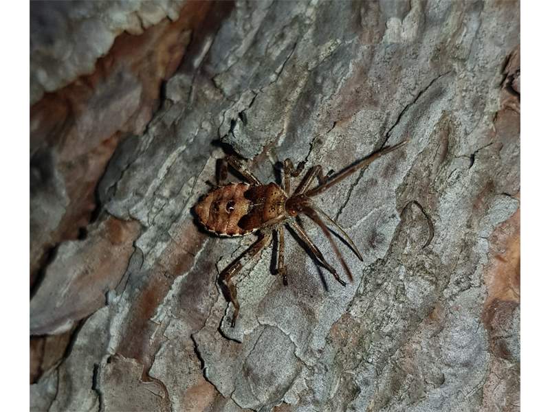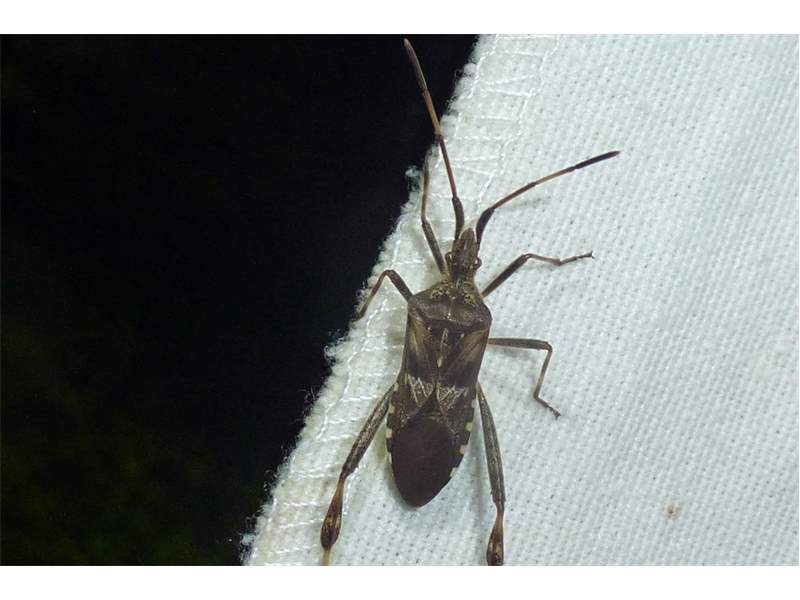 Larve der Amerikanischen Zapfenwanze ( Leptoglossus occidentalis). Deutschland, Baden-Württemberg, Baden-Baden, einzeln stehende Kiefer nord-nord-westlich Ortsteil Sandweier, 30.06.2012 (© Michael Münch)( Bild vergrößern)