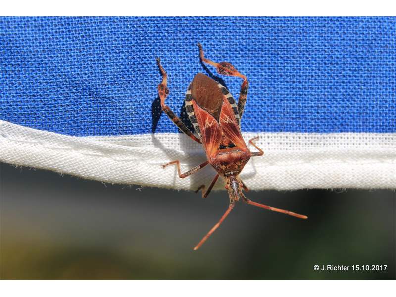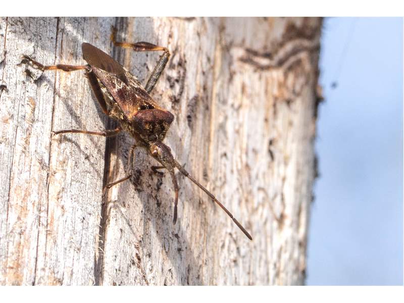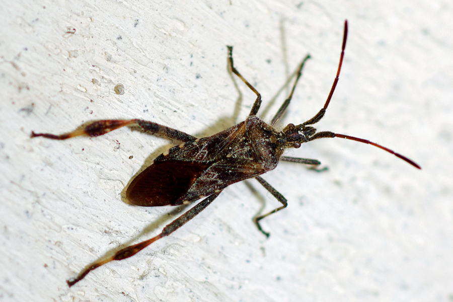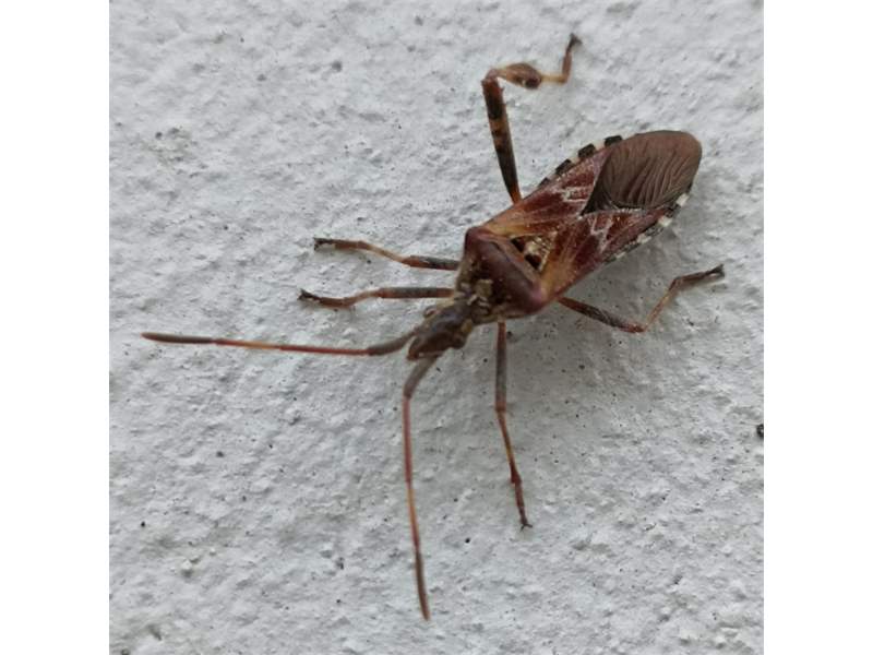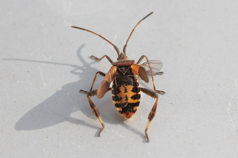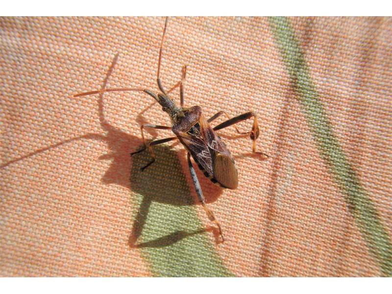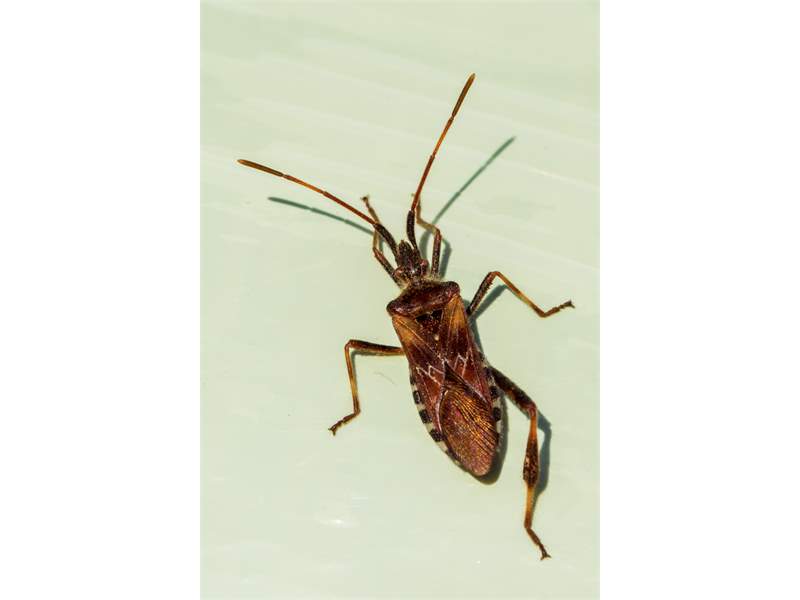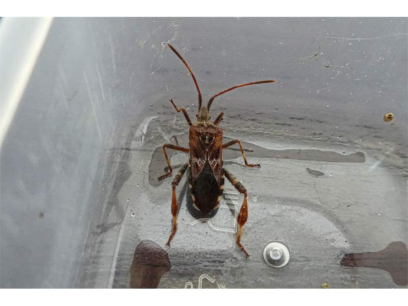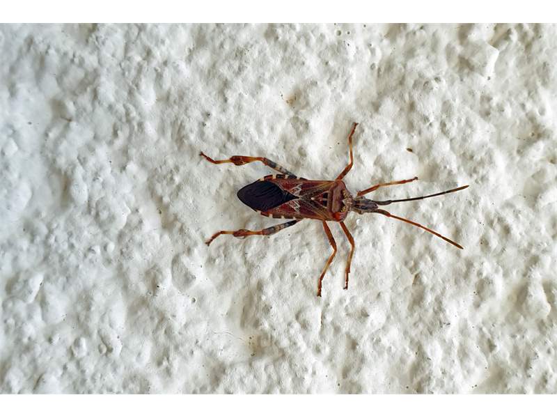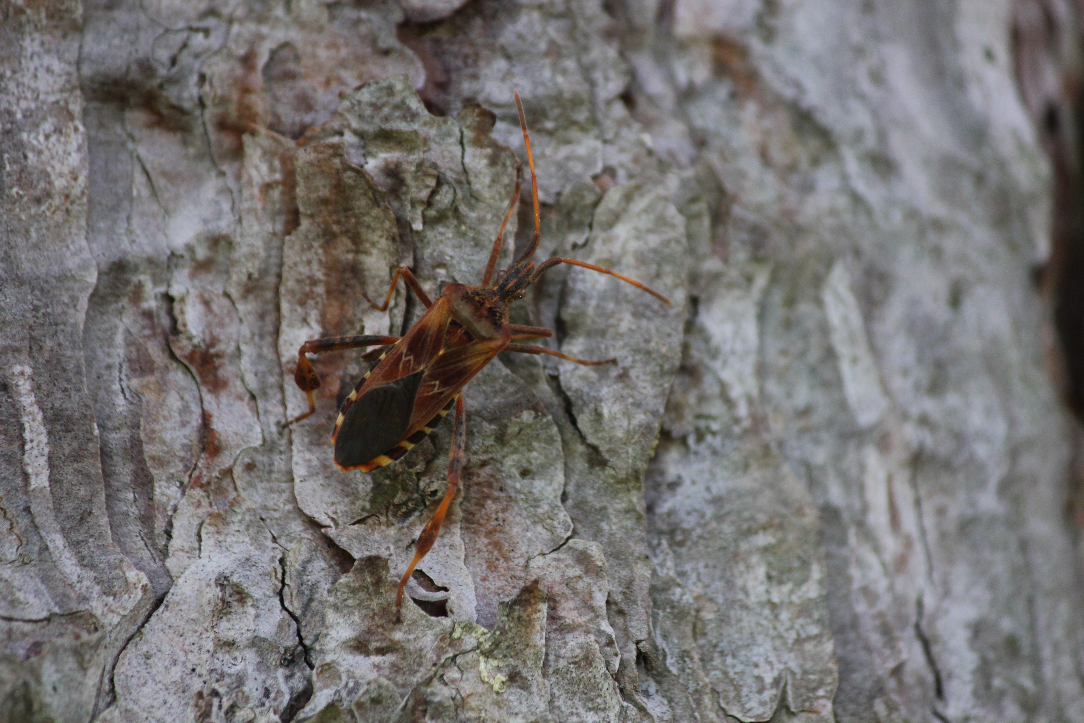 Larve der Amerikanischen Zapfenwanze ( Leptoglossus occidentalis). Deutschland, Baden-Württemberg, Baden-Baden, einzeln stehende Kiefer nord-nord-westlich Ortsteil Sandweier, 30.06.2012 (© Michael Münch)( Bild vergrößern)