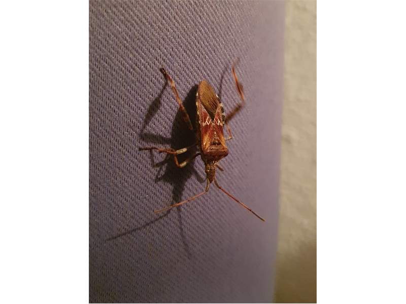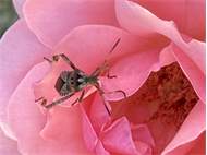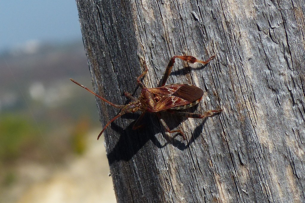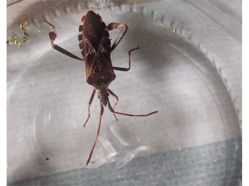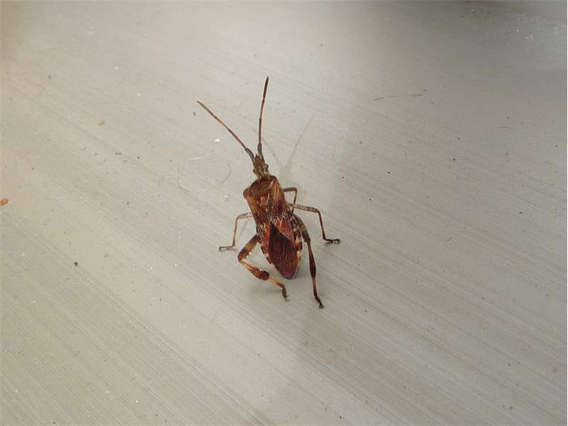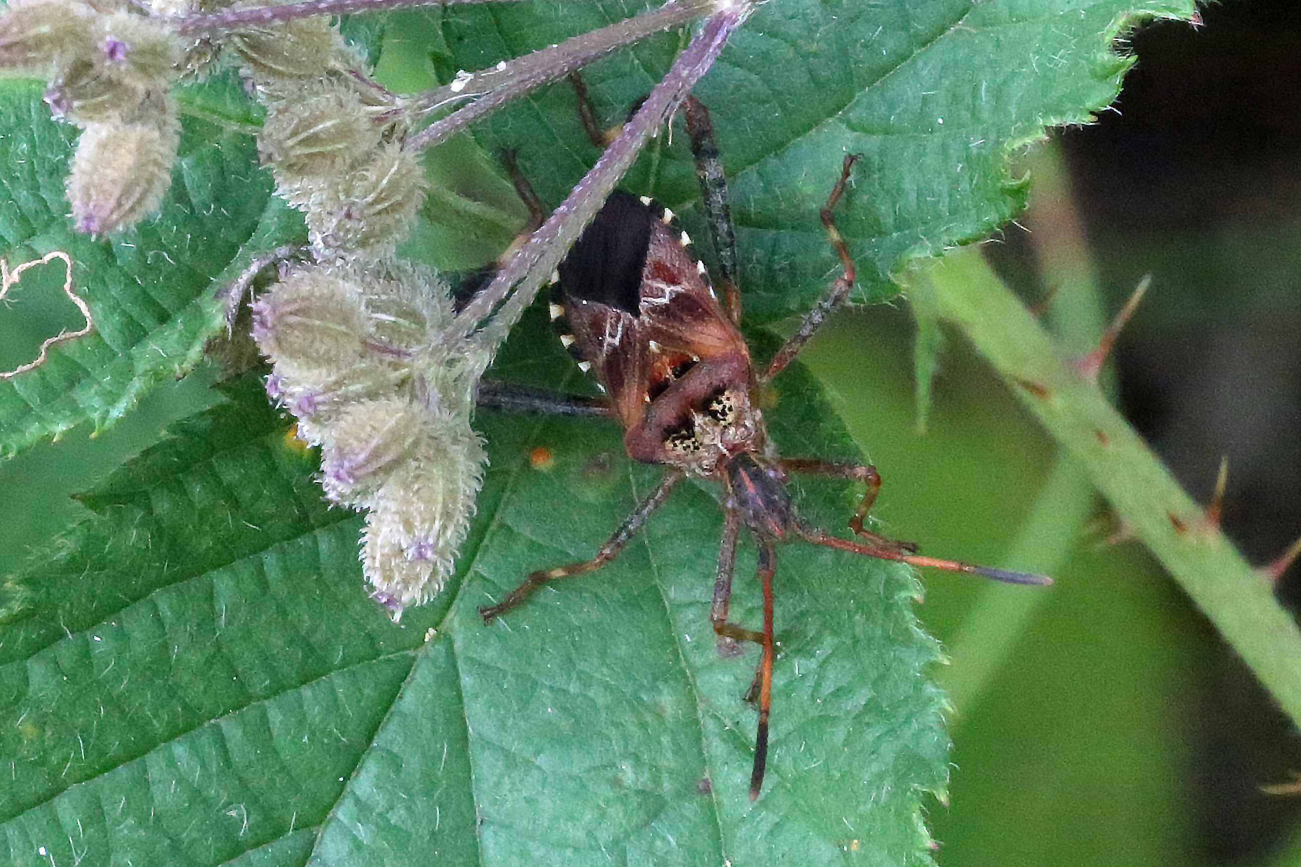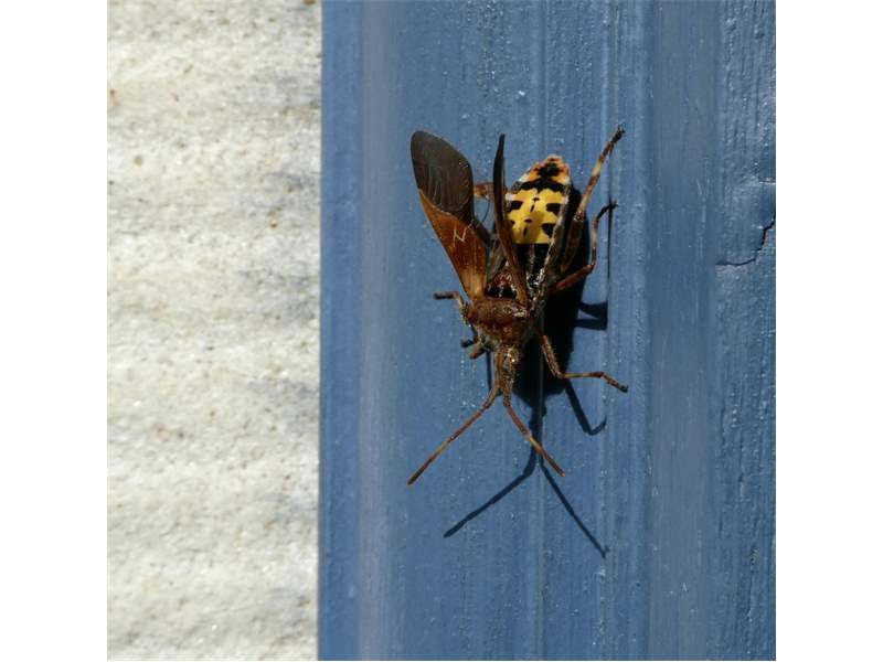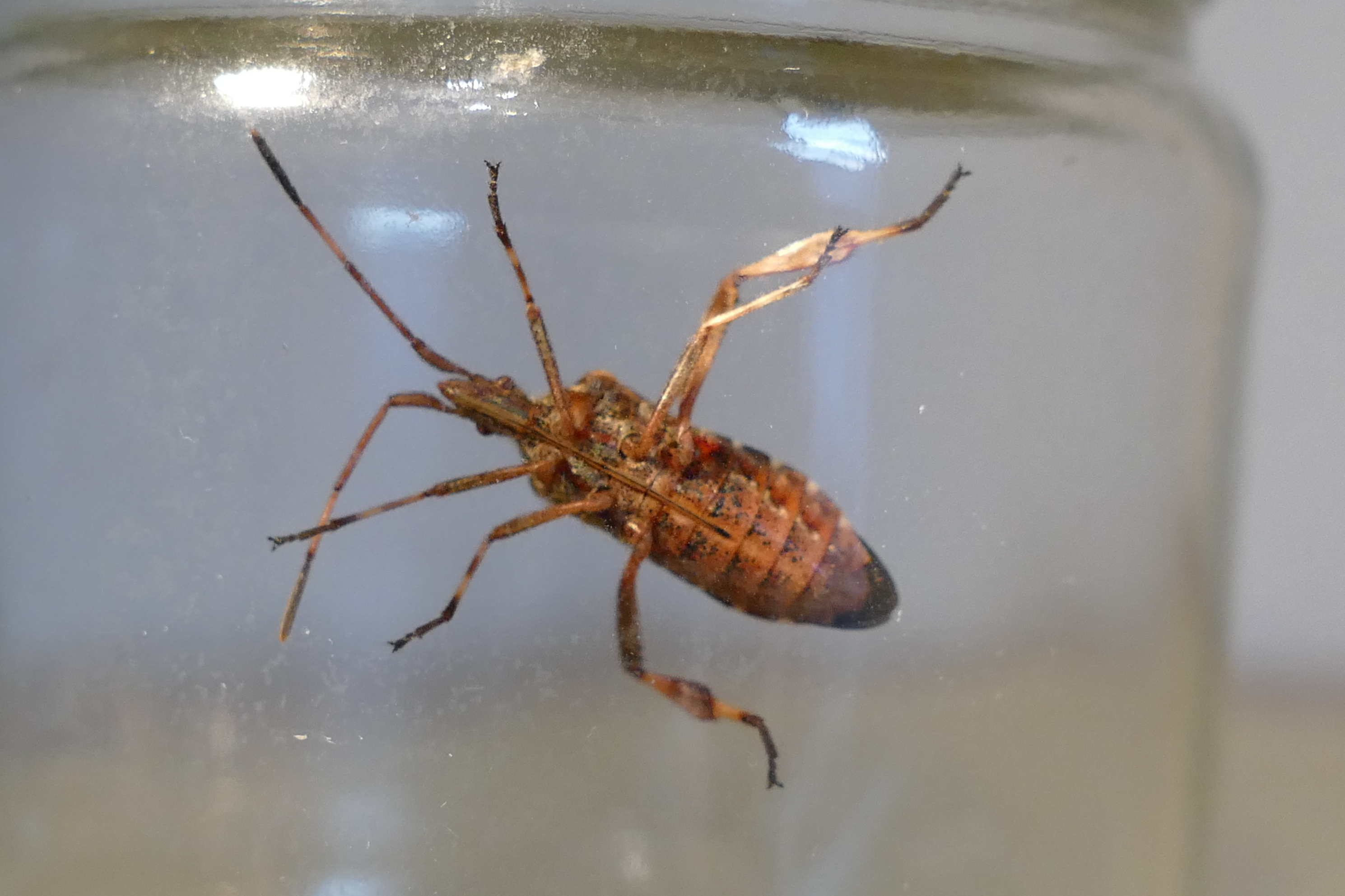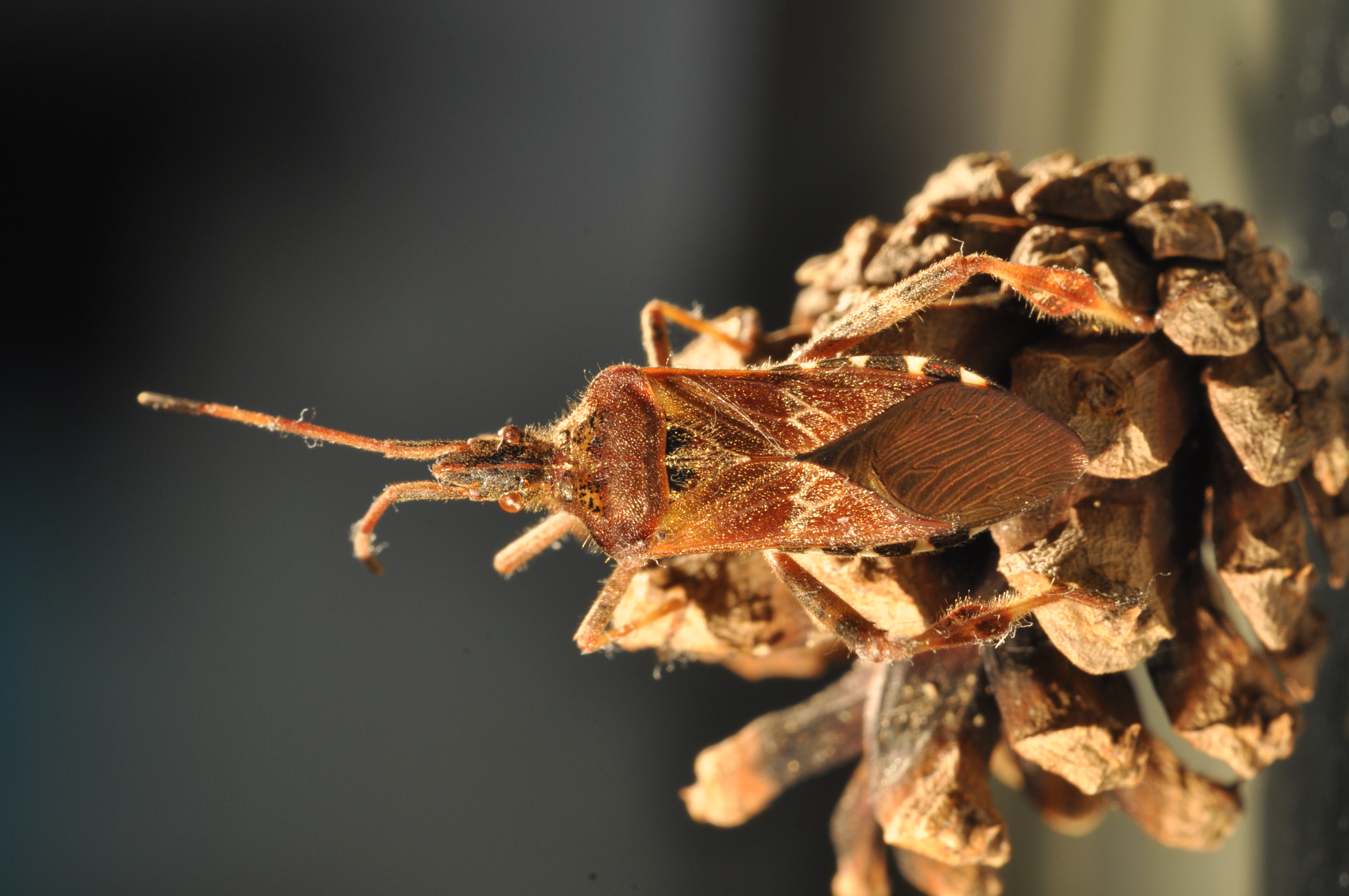 Larve der Amerikanischen Zapfenwanze ( Leptoglossus occidentalis). Deutschland, Baden-Württemberg, Baden-Baden, einzeln stehende Kiefer nord-nord-westlich Ortsteil Sandweier, 30.06.2012 (© Michael Münch)( Bild vergrößern)