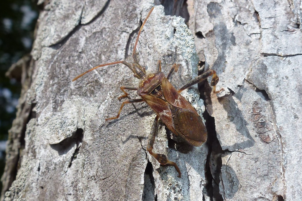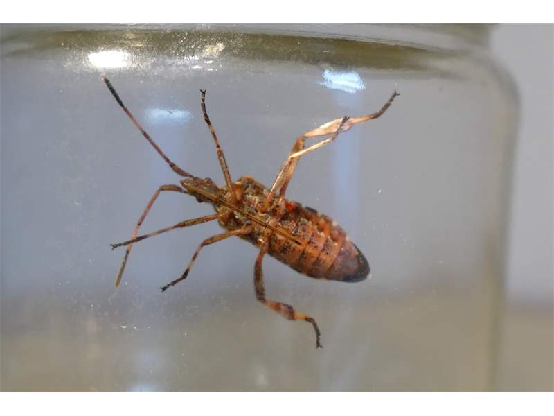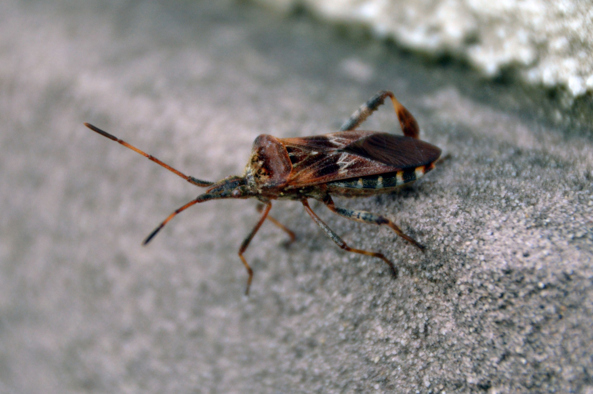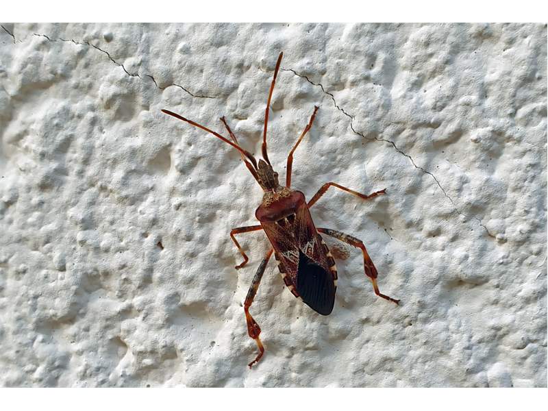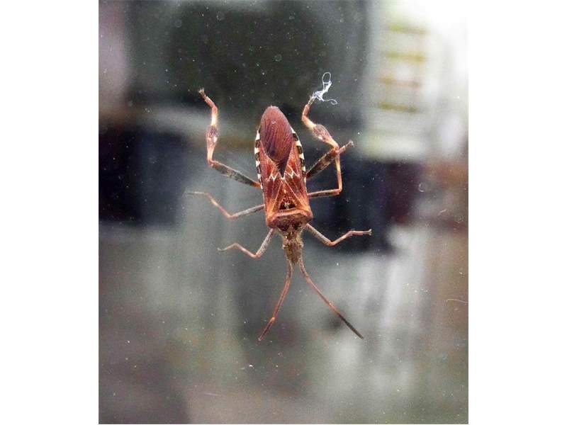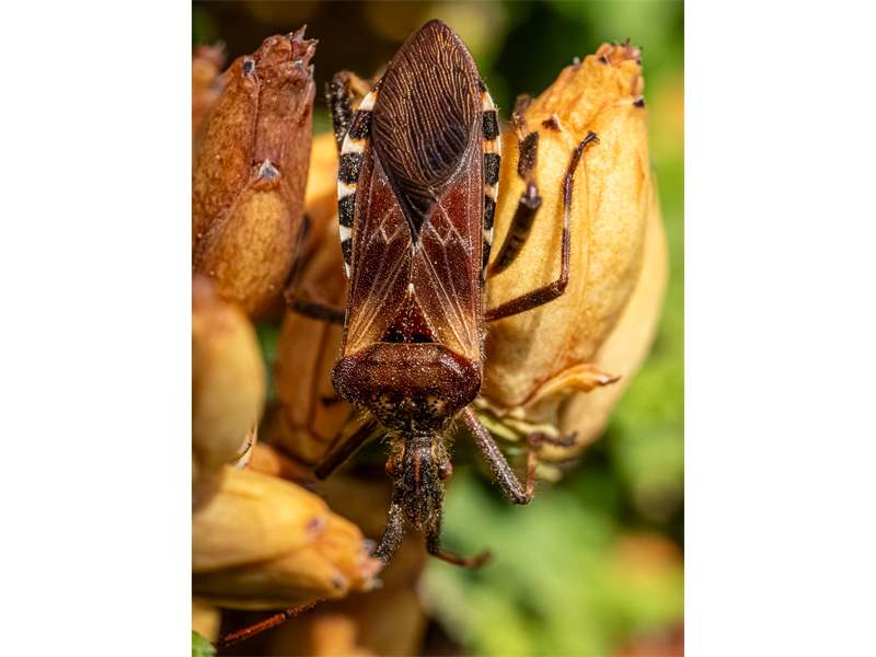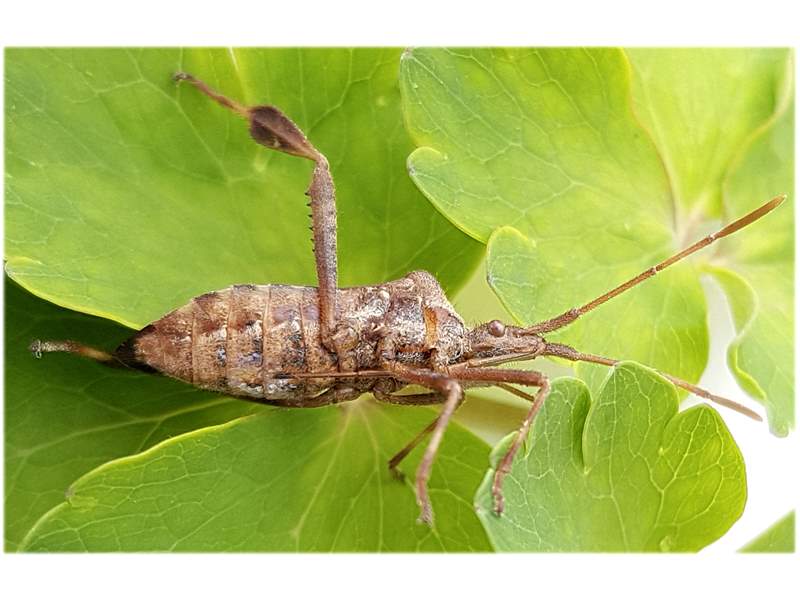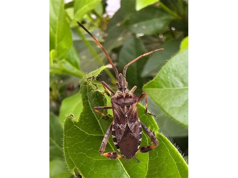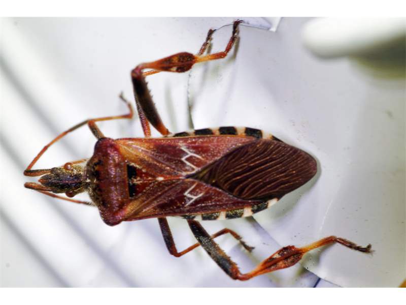 Larve der Amerikanischen Zapfenwanze ( Leptoglossus occidentalis). Deutschland, Baden-Württemberg, Baden-Baden, einzeln stehende Kiefer nord-nord-westlich Ortsteil Sandweier, 30.06.2012 (© Michael Münch)( Bild vergrößern)