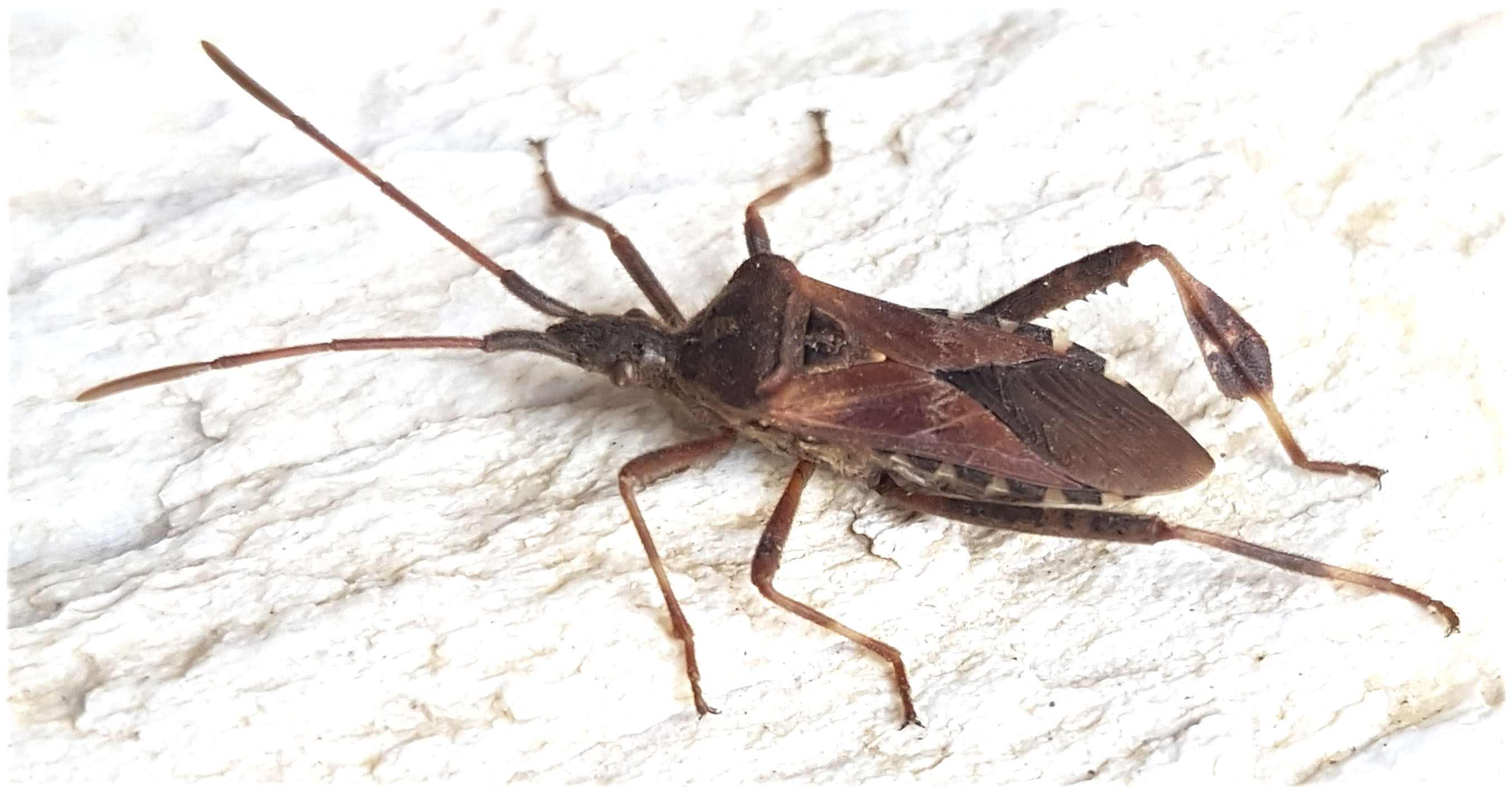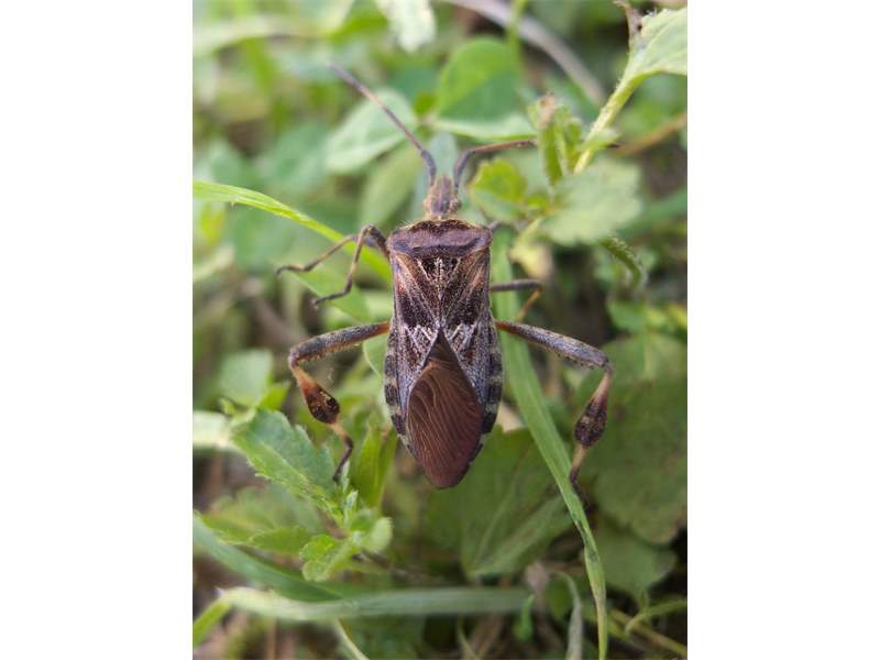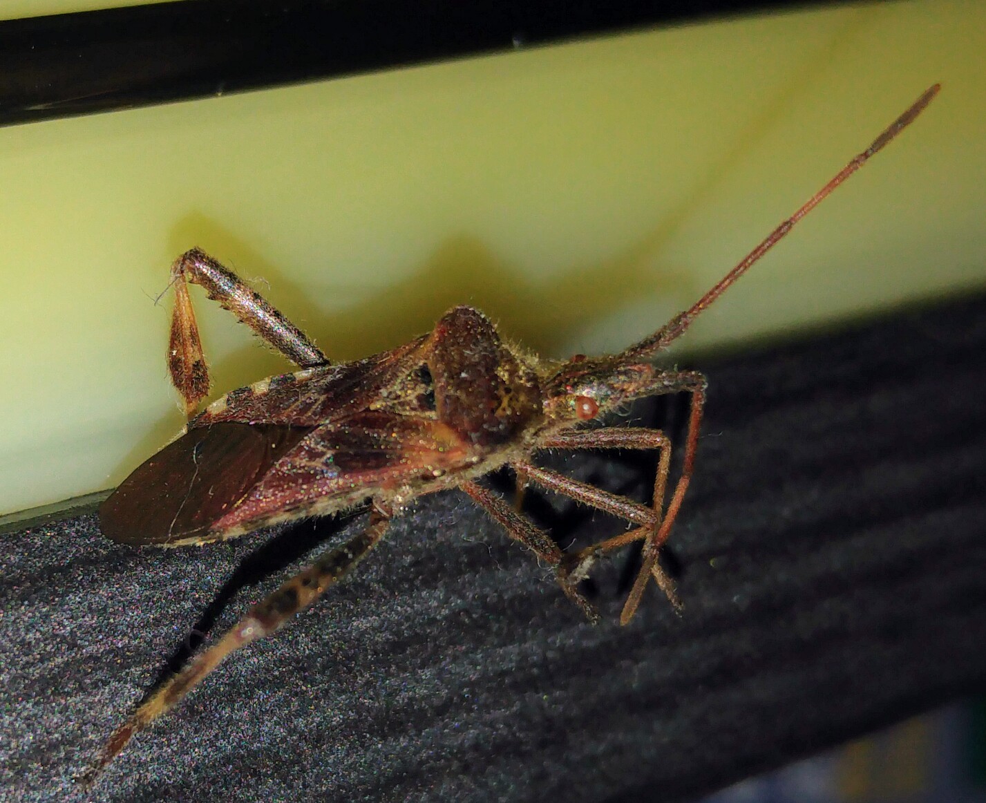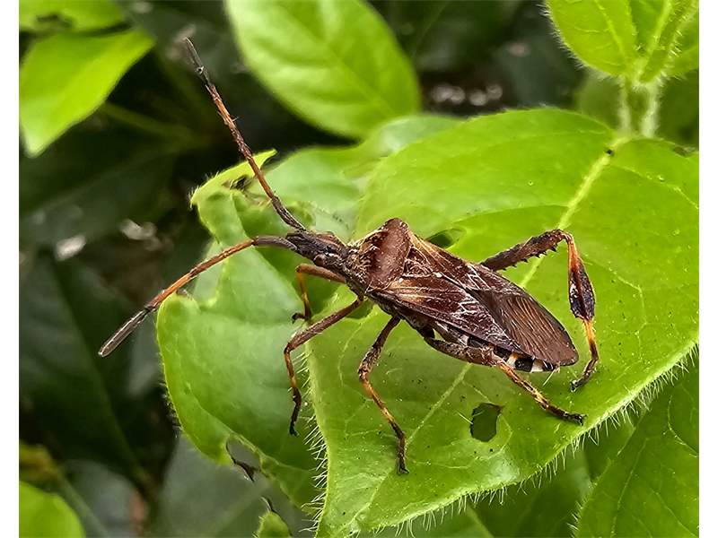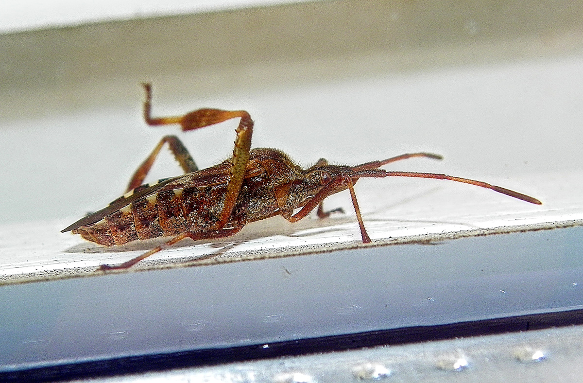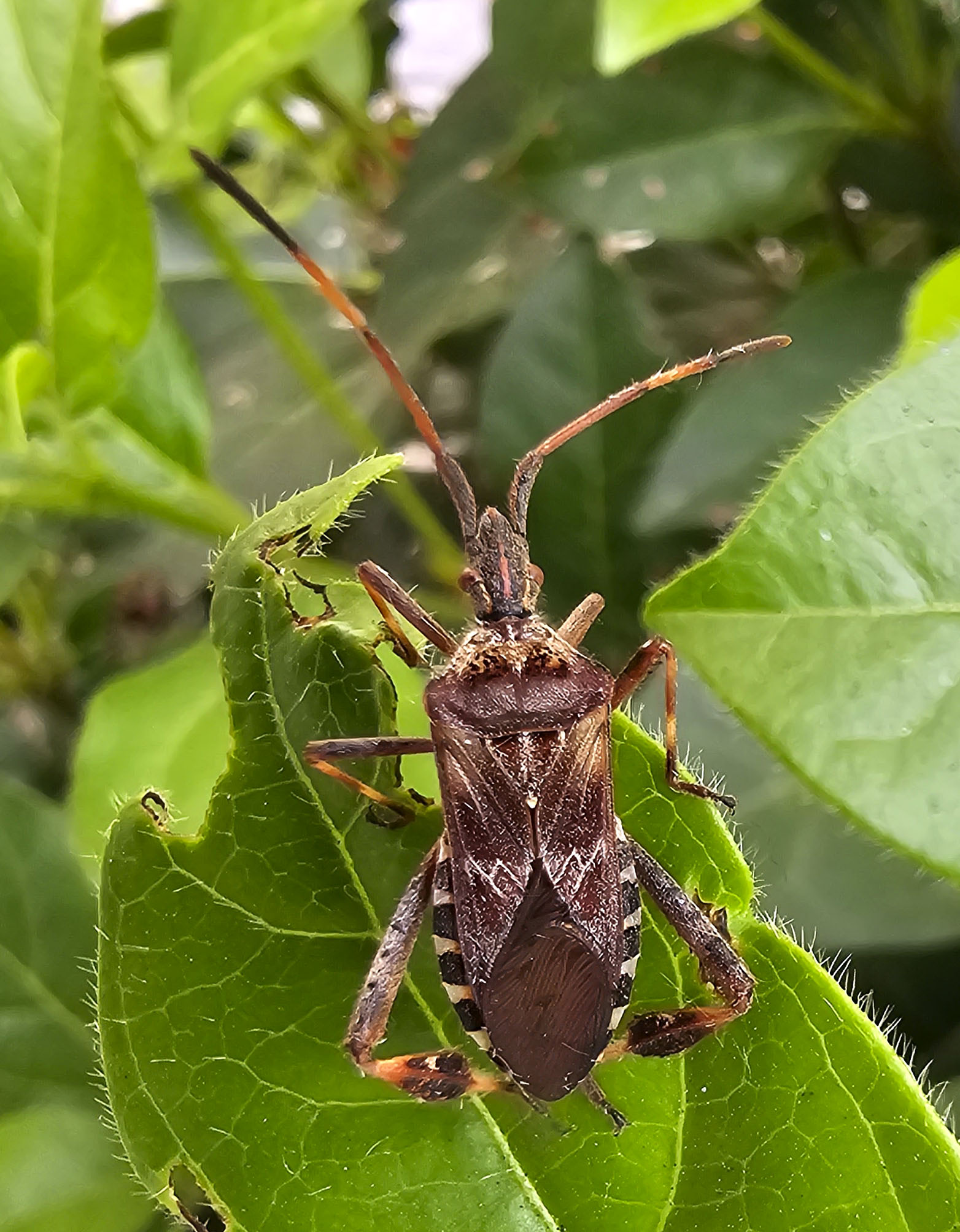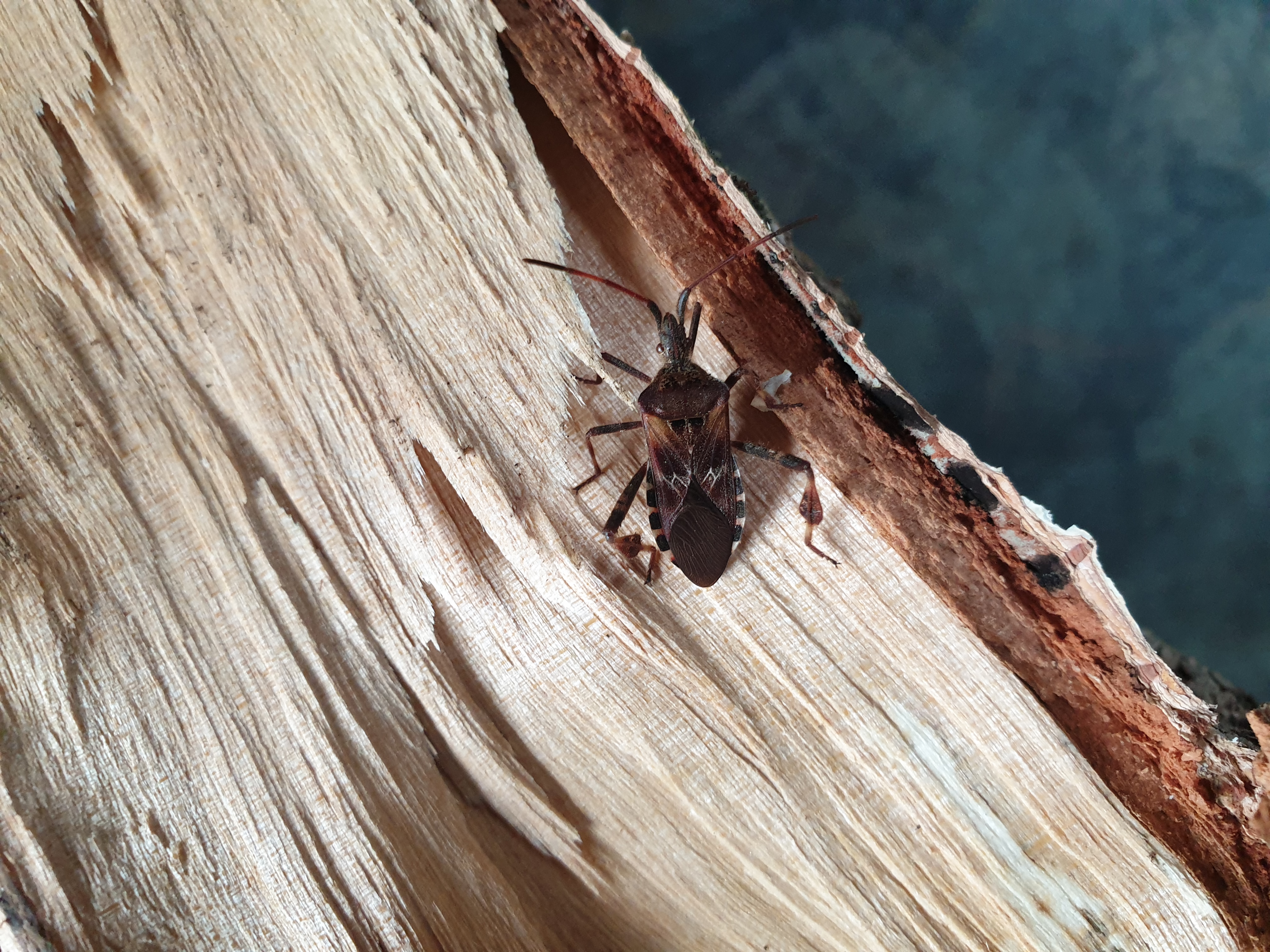 Larve der Amerikanischen Zapfenwanze ( Leptoglossus occidentalis). Deutschland, Baden-Württemberg, Baden-Baden, einzeln stehende Kiefer nord-nord-westlich Ortsteil Sandweier, 30.06.2012 (© Michael Münch)( Bild vergrößern)