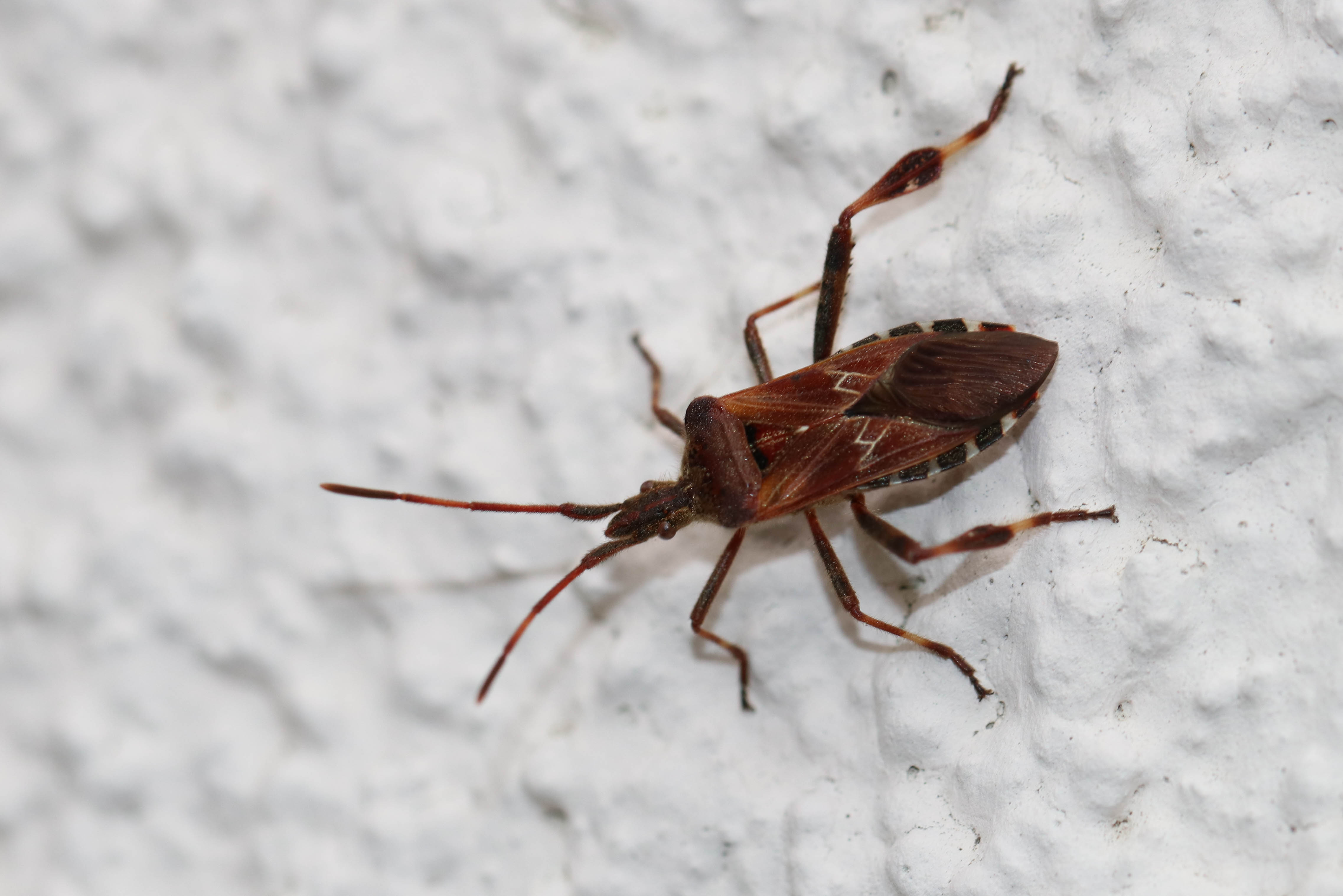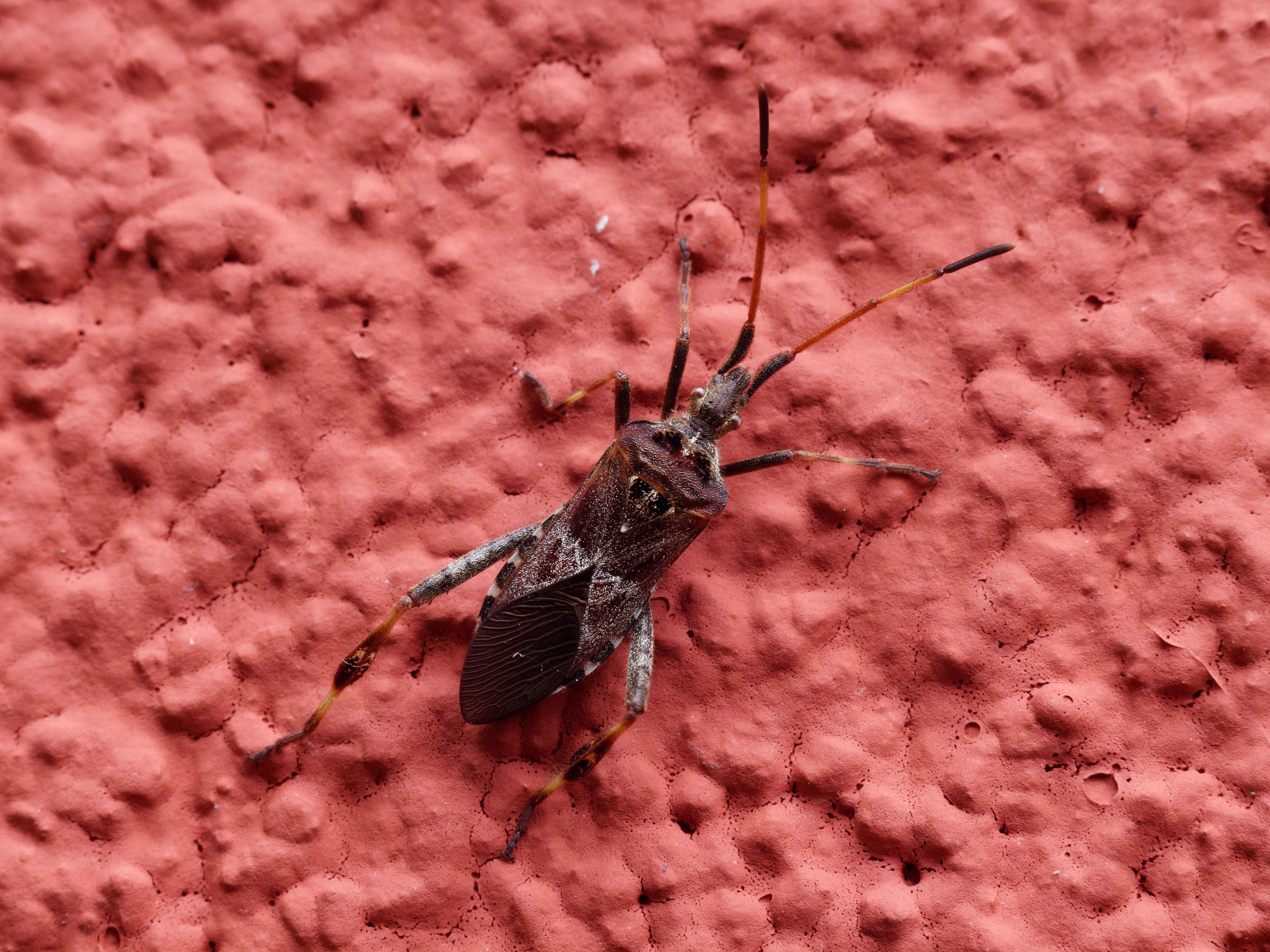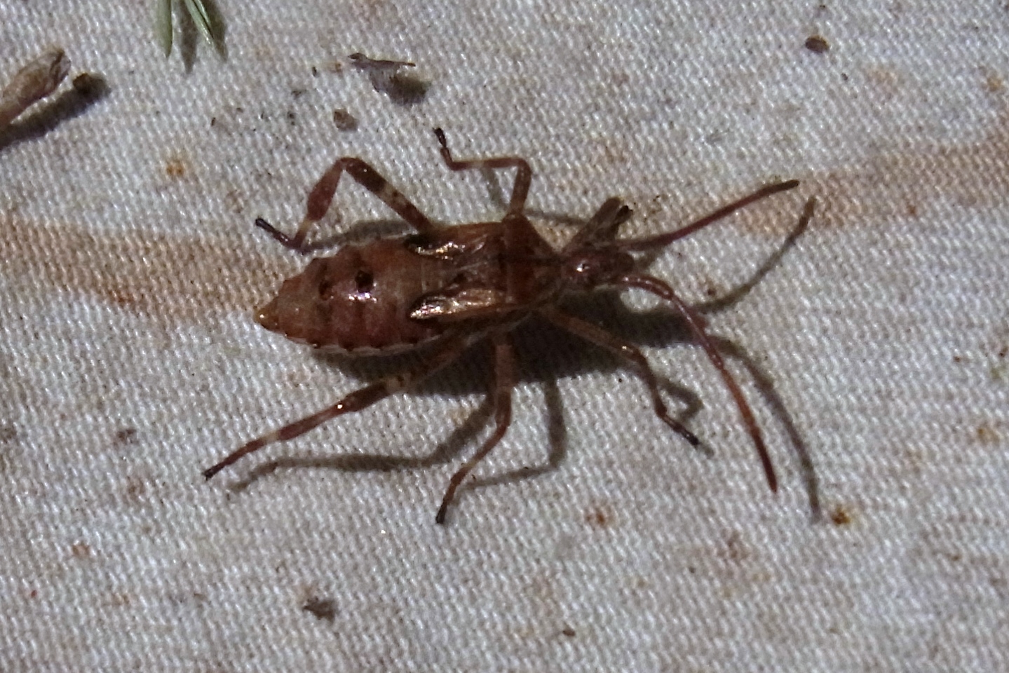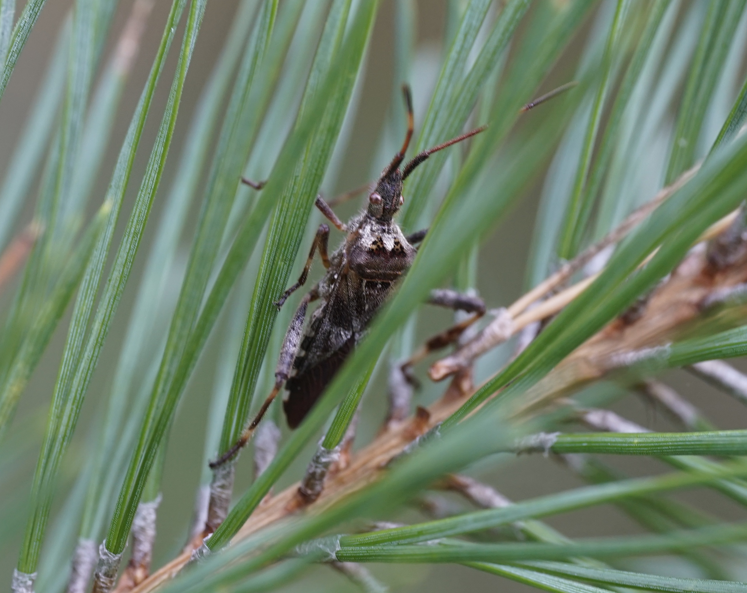 Larve der Amerikanischen Zapfenwanze ( Leptoglossus occidentalis). Deutschland, Baden-Württemberg, Baden-Baden, einzeln stehende Kiefer nord-nord-westlich Ortsteil Sandweier, 30.06.2012