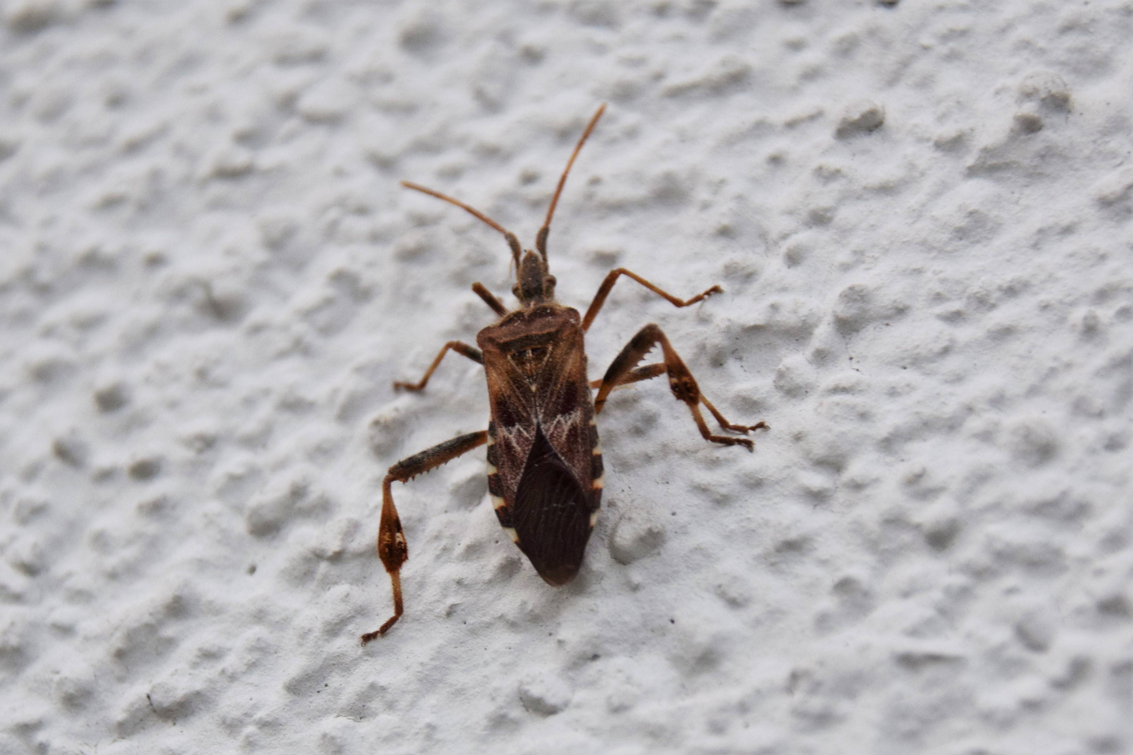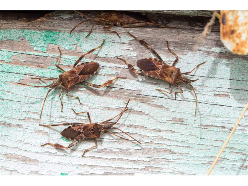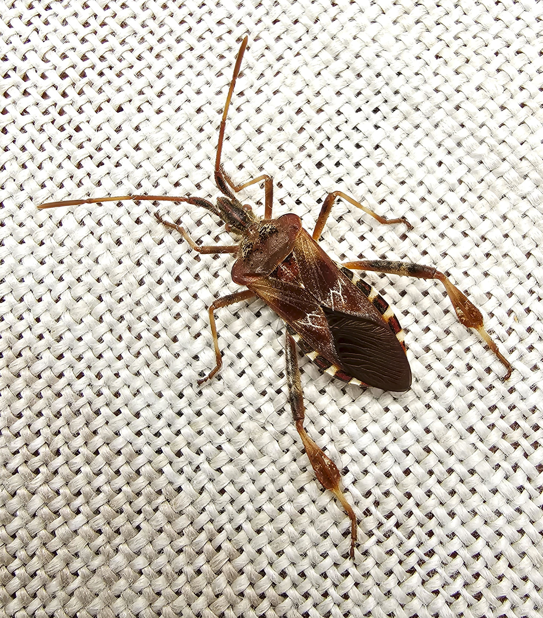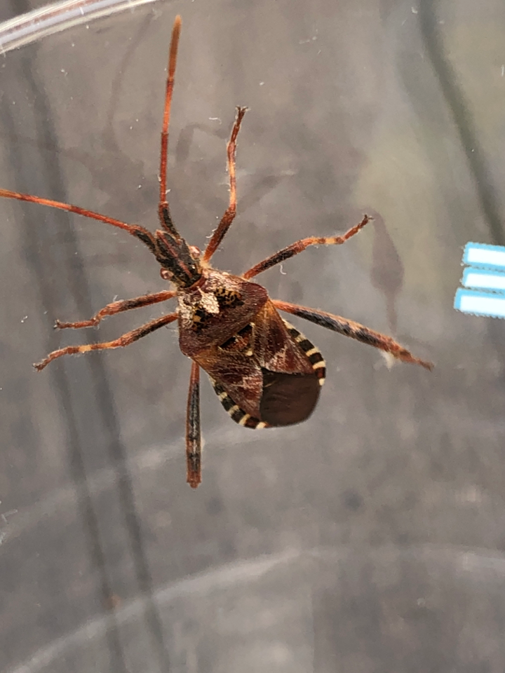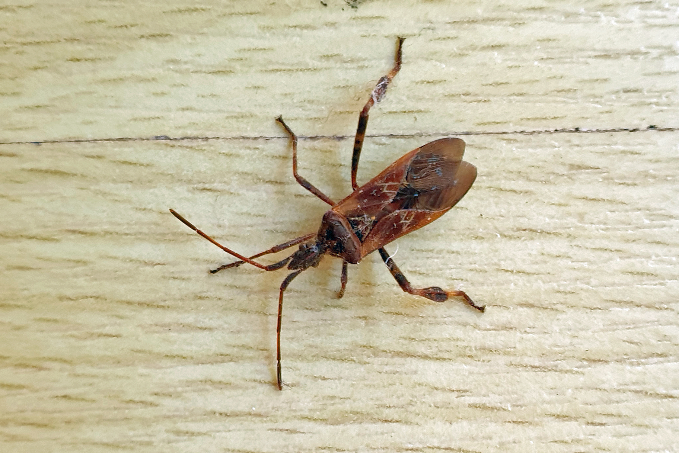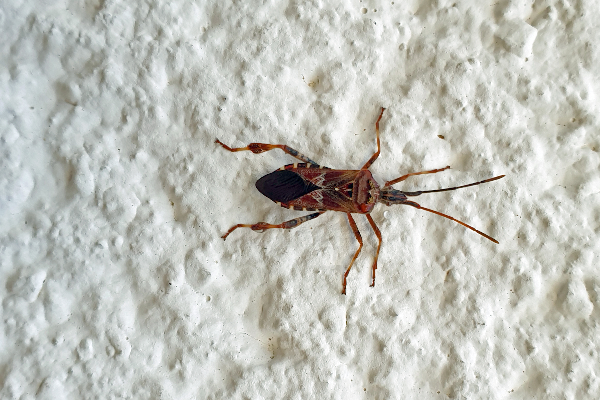 Larve der Amerikanischen Zapfenwanze ( Leptoglossus occidentalis). Deutschland, Baden-Württemberg, Baden-Baden, einzeln stehende Kiefer nord-nord-westlich Ortsteil Sandweier, 30.06.2012