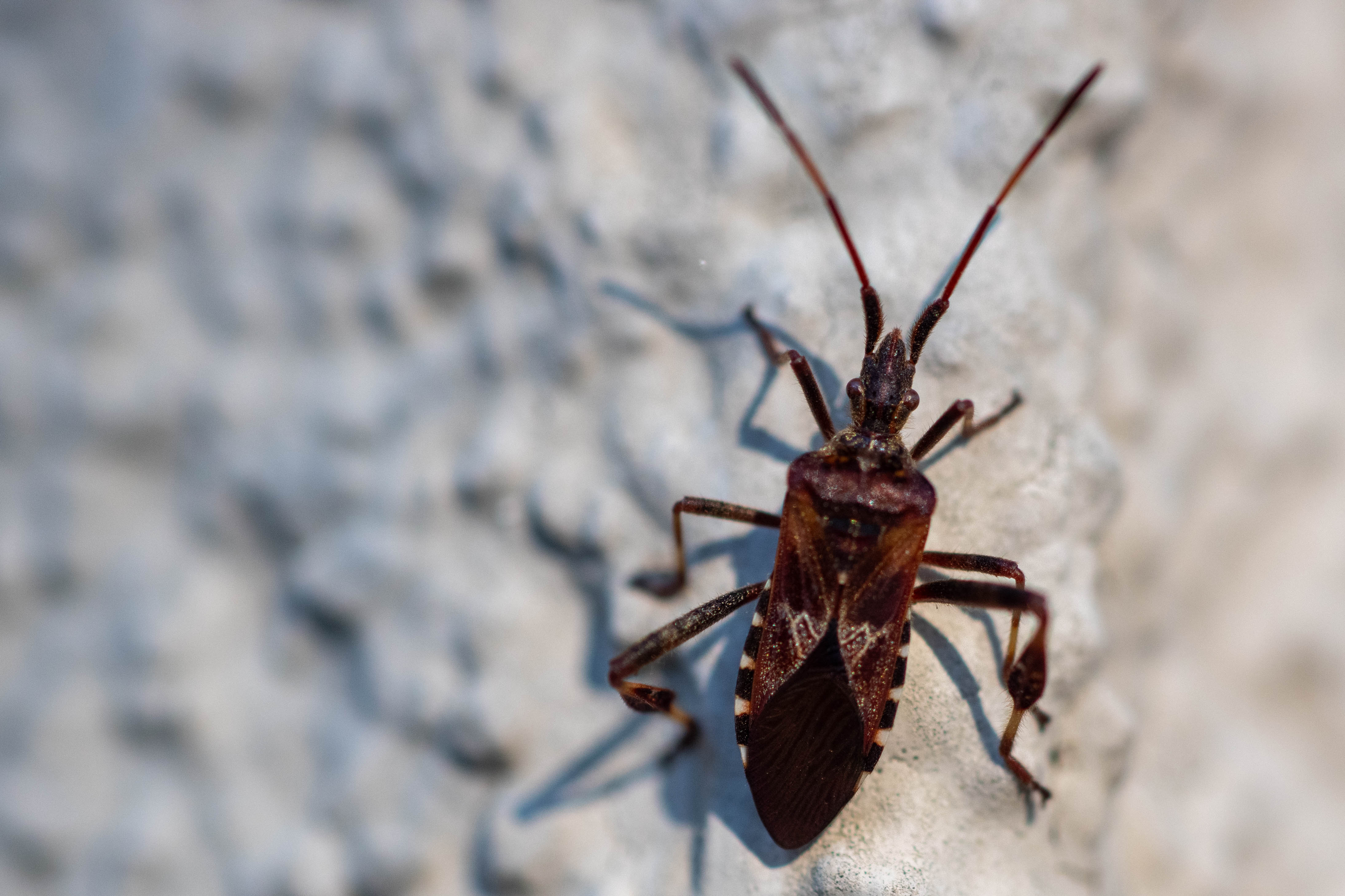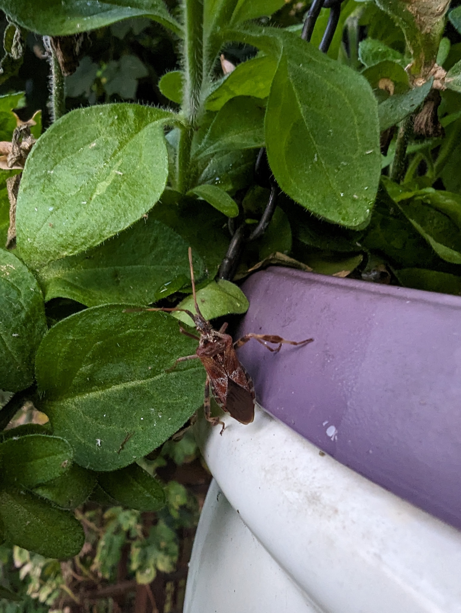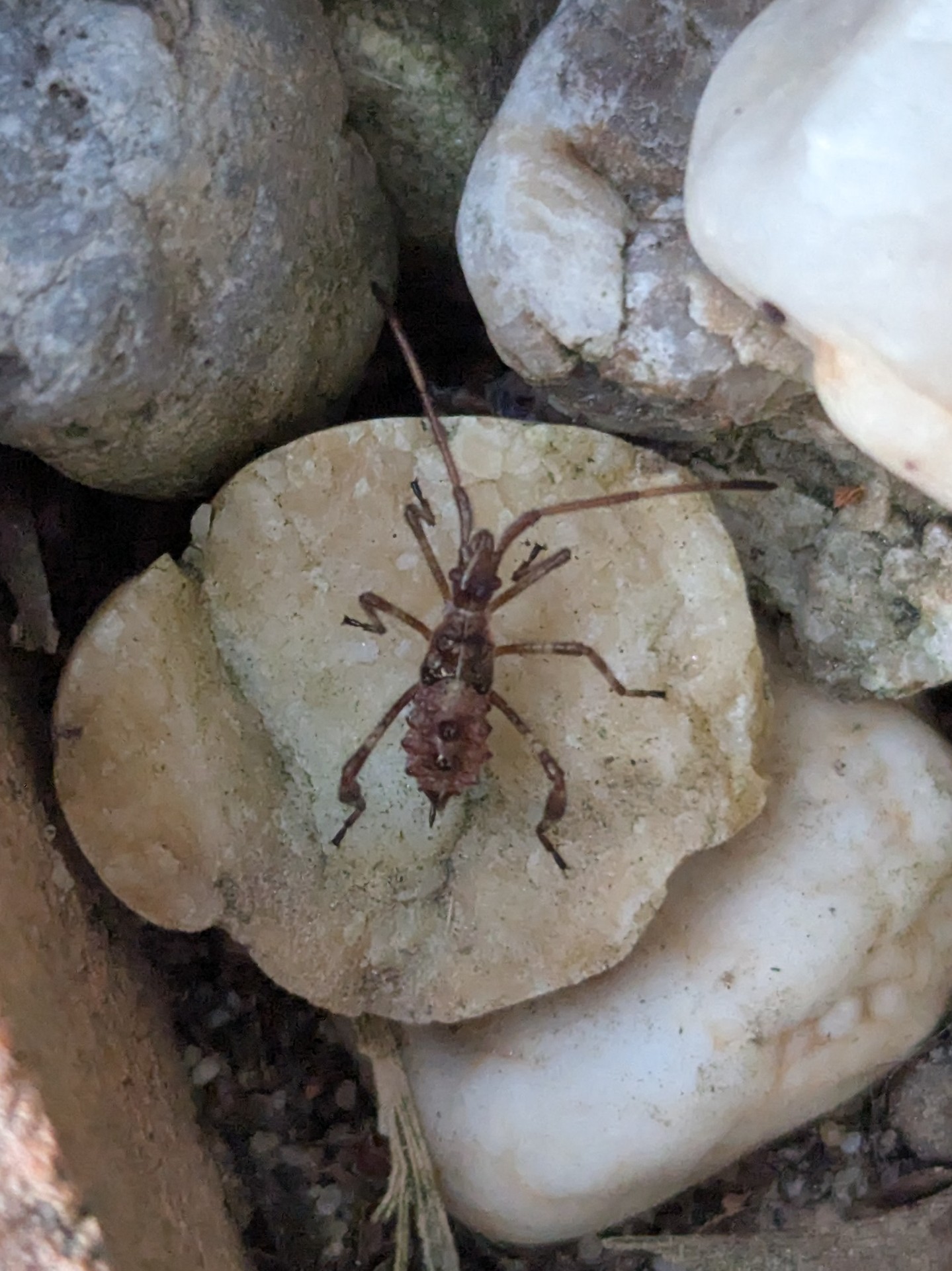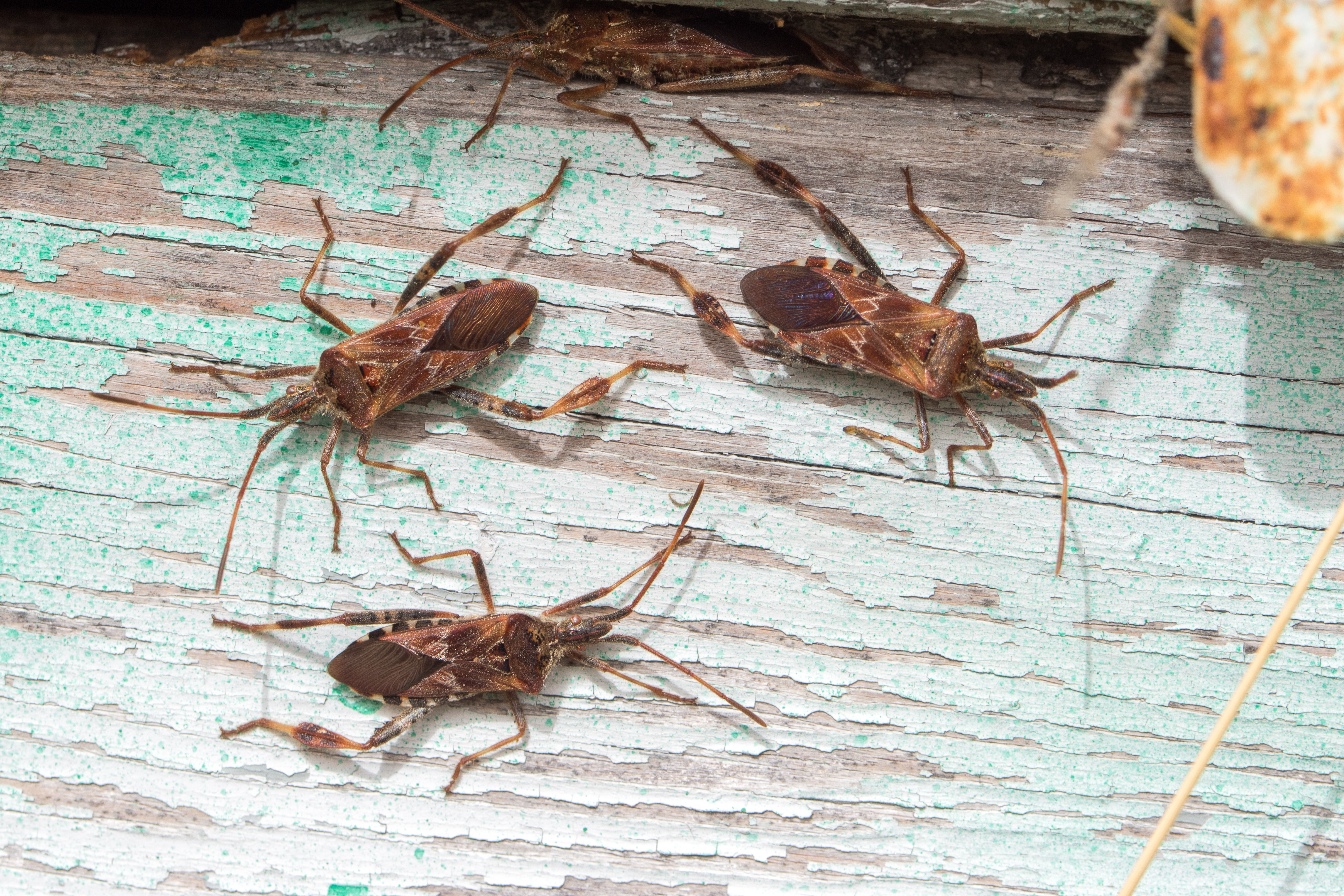 Larve der Amerikanischen Zapfenwanze ( Leptoglossus occidentalis). Deutschland, Baden-Württemberg, Baden-Baden, einzeln stehende Kiefer nord-nord-westlich Ortsteil Sandweier, 30.06.2012