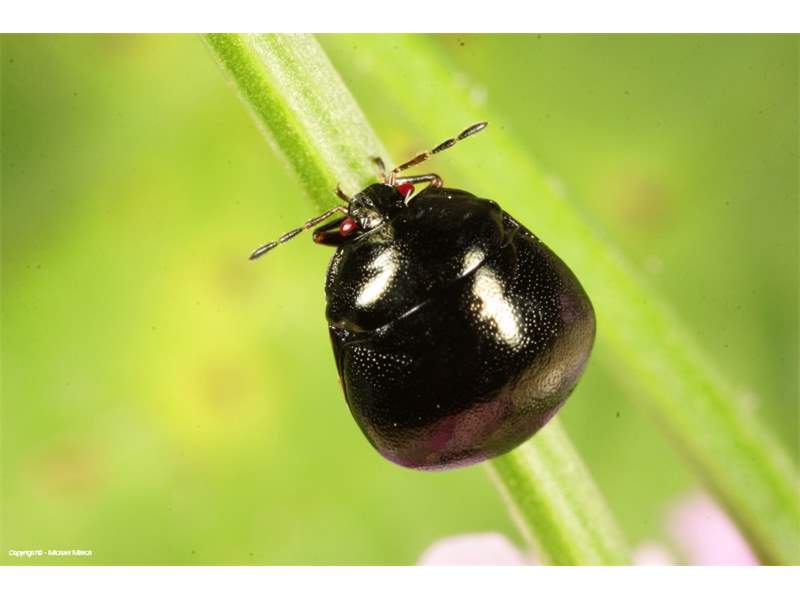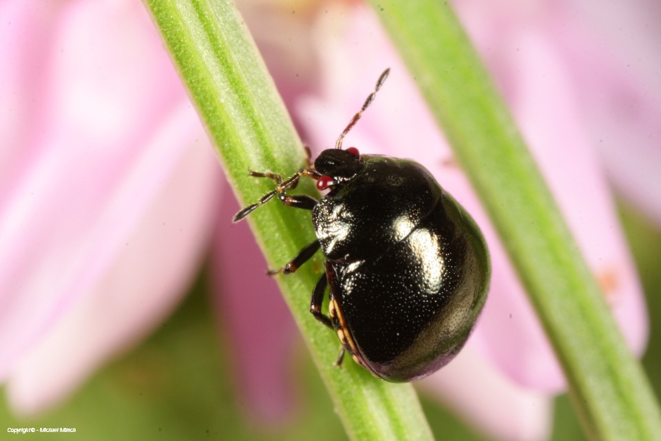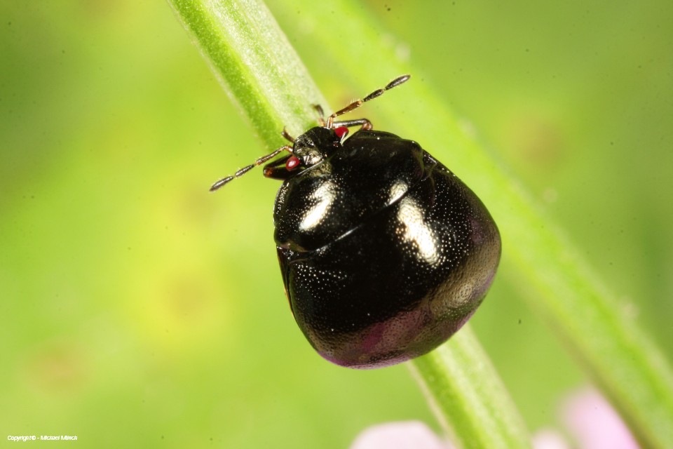 Kugelwanze (Coptosoma scutellatum). Die unverkennbare Körperform ist in der Draufsicht gut zu erkennen. Dresden-Heller, Nord-Teil, lichter Wegsaum 1,2 km nördlich Deponie bzw. 1 km östlich Gewerbegebiet Augustusweg (Deutschland, Sachsen, Stadt Dresden), 24.06.2010 (© Michael Münch)( Bild vergrößern)