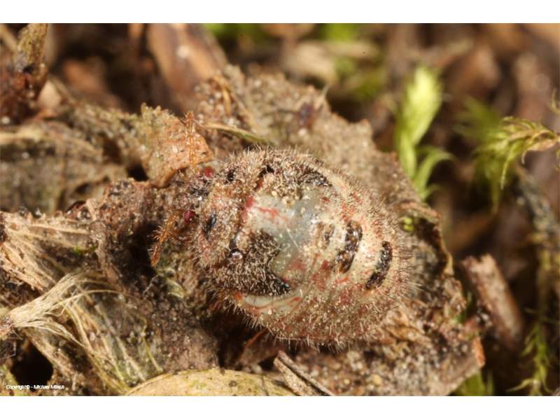 Larve der Kugelwanze im 5.Stadium. Noch ist die typische Körperform erwachsener Tiere in der Draufsicht nicht zu erahnen. Am Boden im Detritus an einem Wegrain zwischen Weinbergen bei Bickensohl (Stadt Vogtsburg im Kaiserstuhl, Baden-Württemberg, Landkreis Breisgau-Hochschwarzwald), 13.05.2012. (© Michael Münch)( Bild vergrößern)
