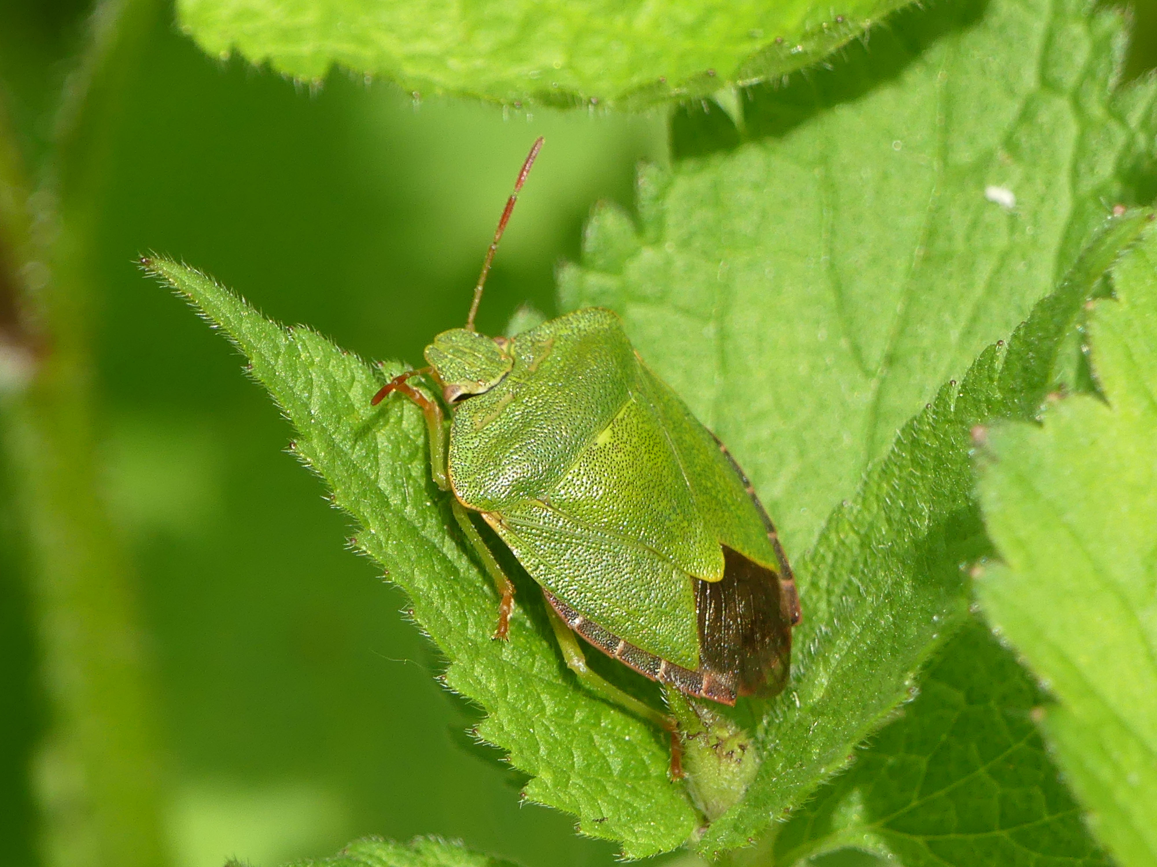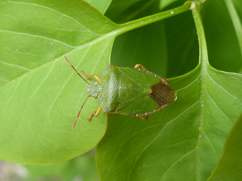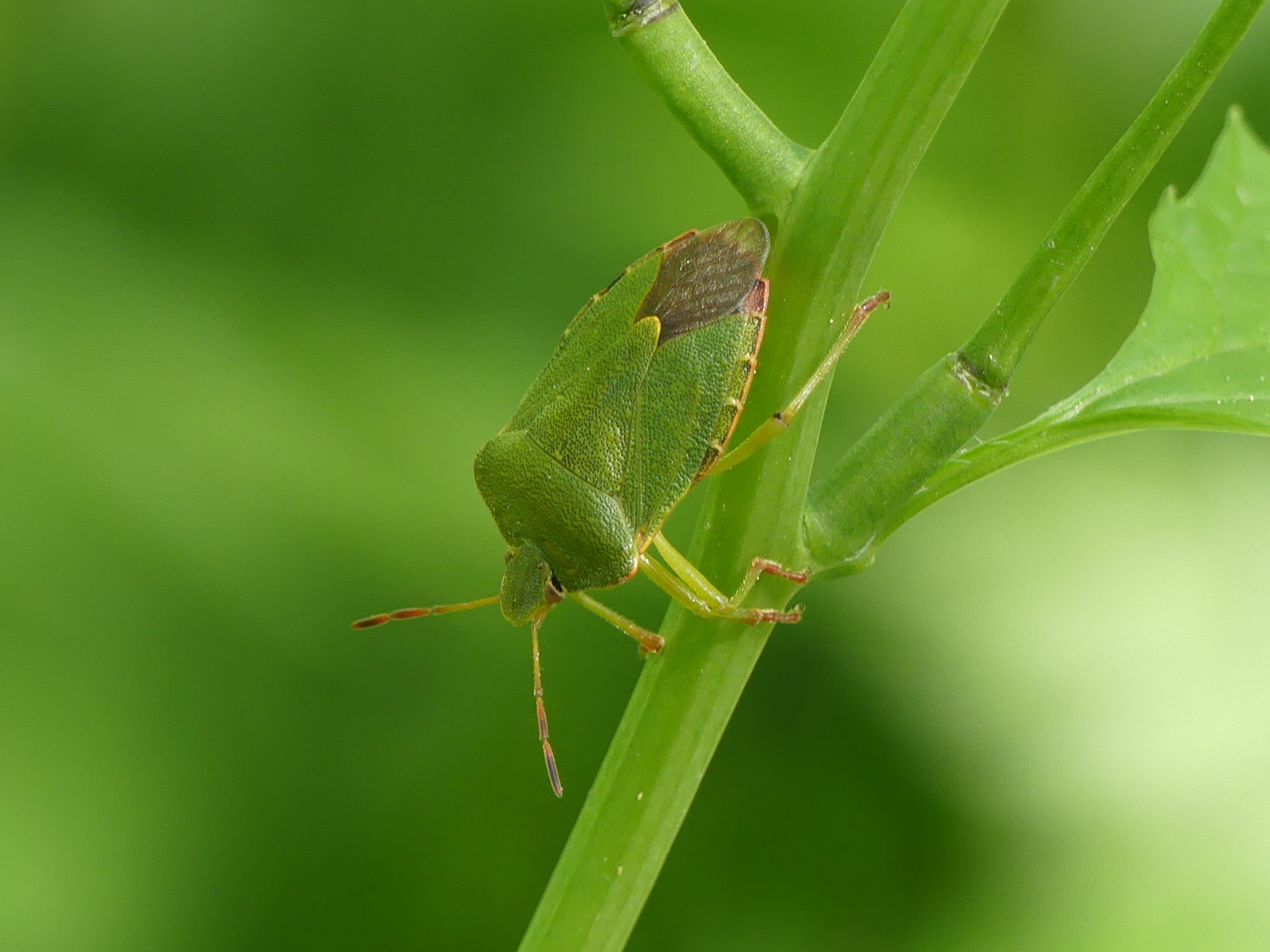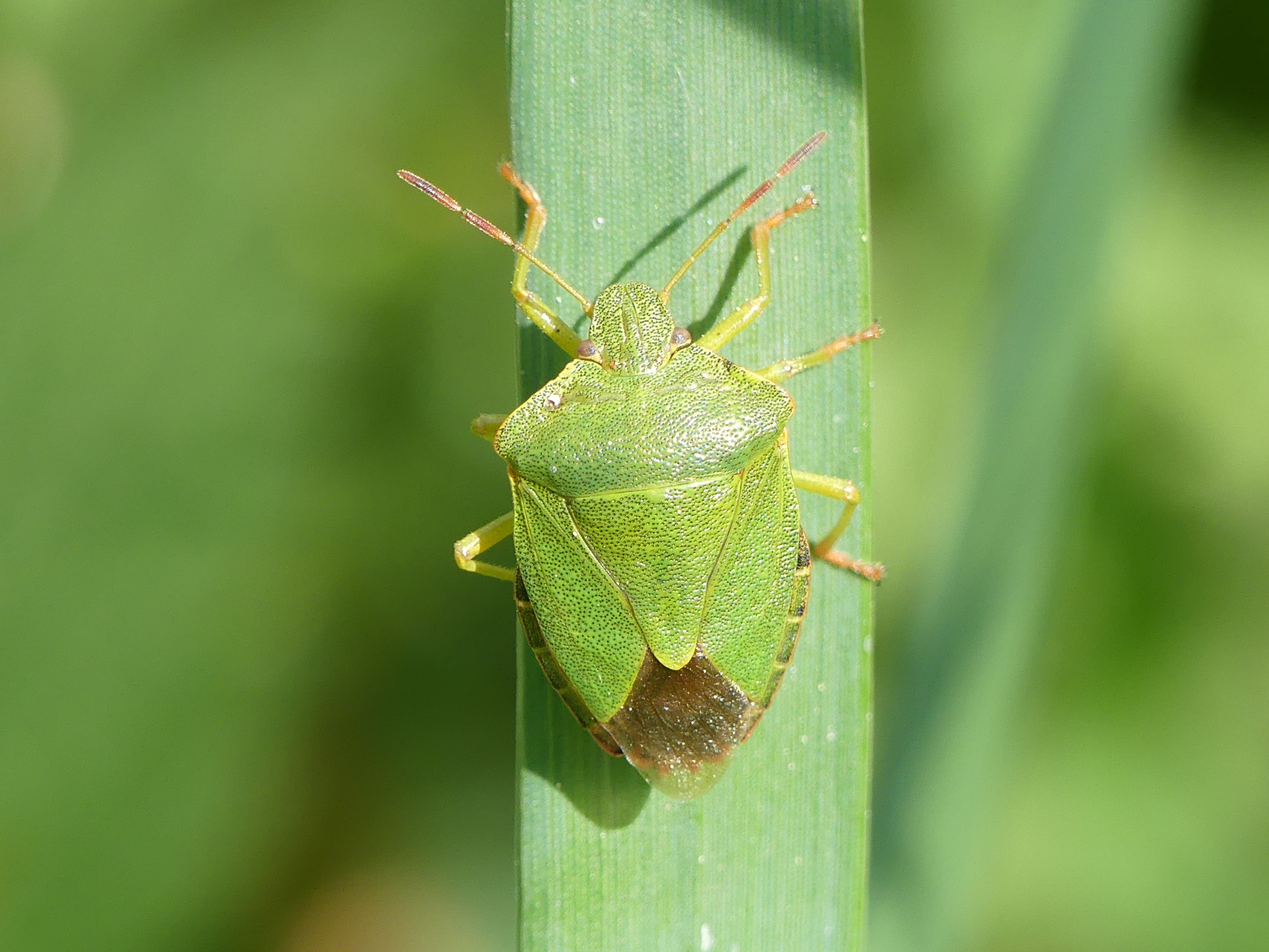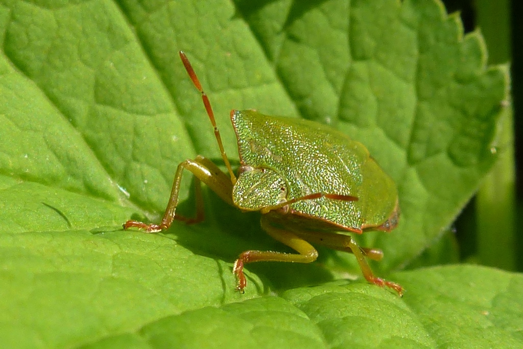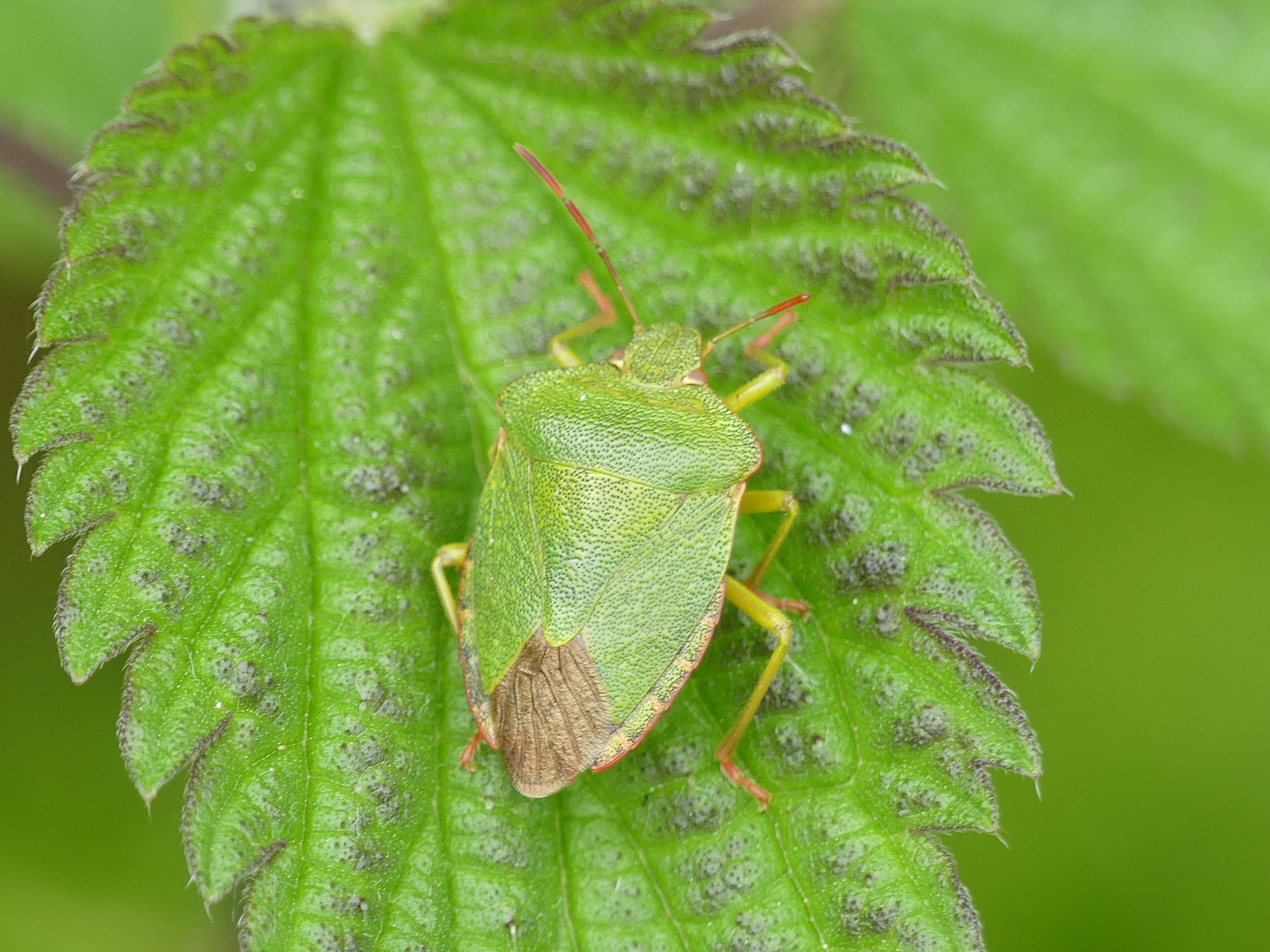 Grüne Stinkwanze (Palomena prasina (Linnaeus, 1761)), das zweite und dritte Fühlerglied sind annähernd gleich lang, im Unterschied zu Palomena viridissima, wo das dritte Fühlerglied kürzer als das zweite ist, am 1. Mai 2013 im Seifersdorfer Tal.