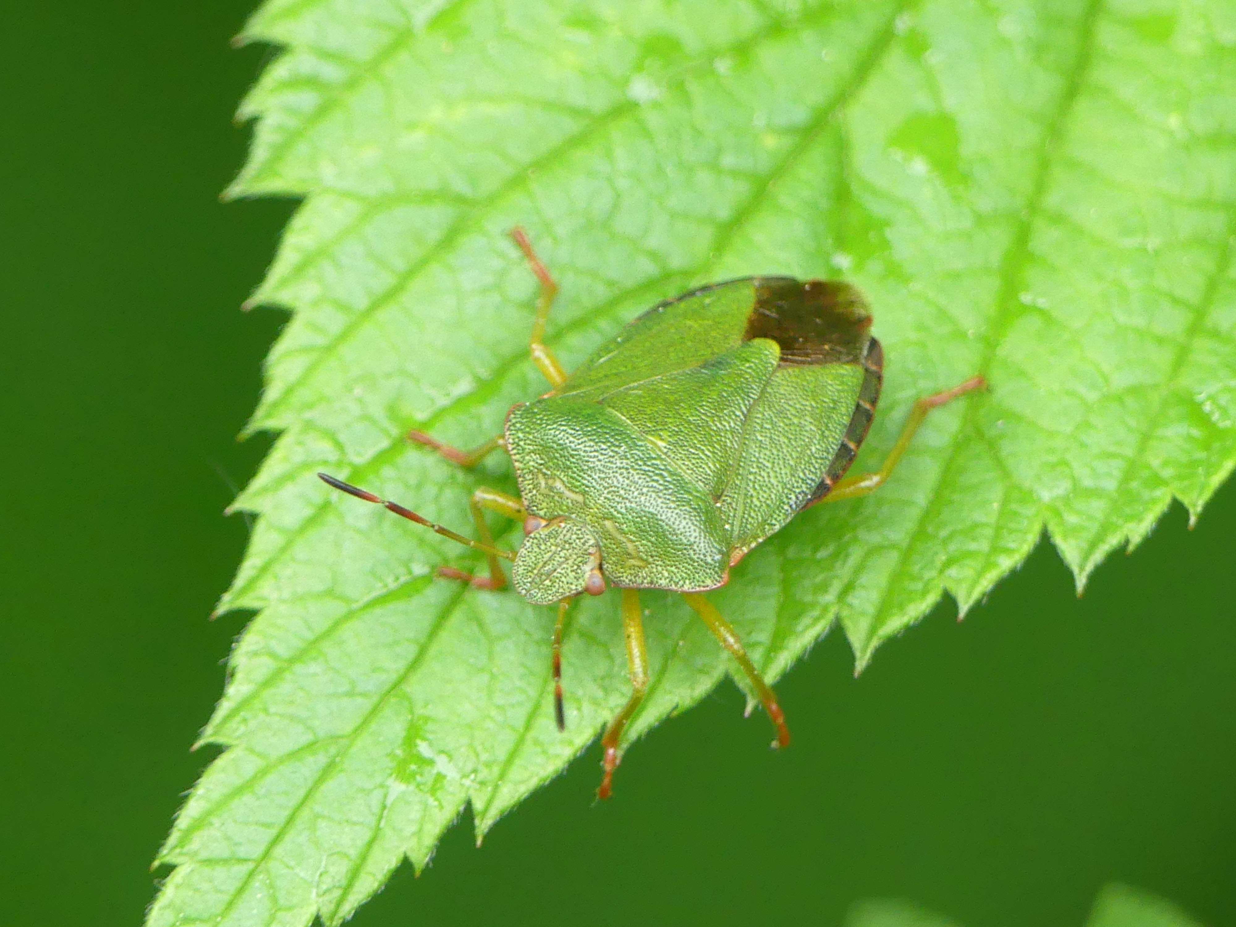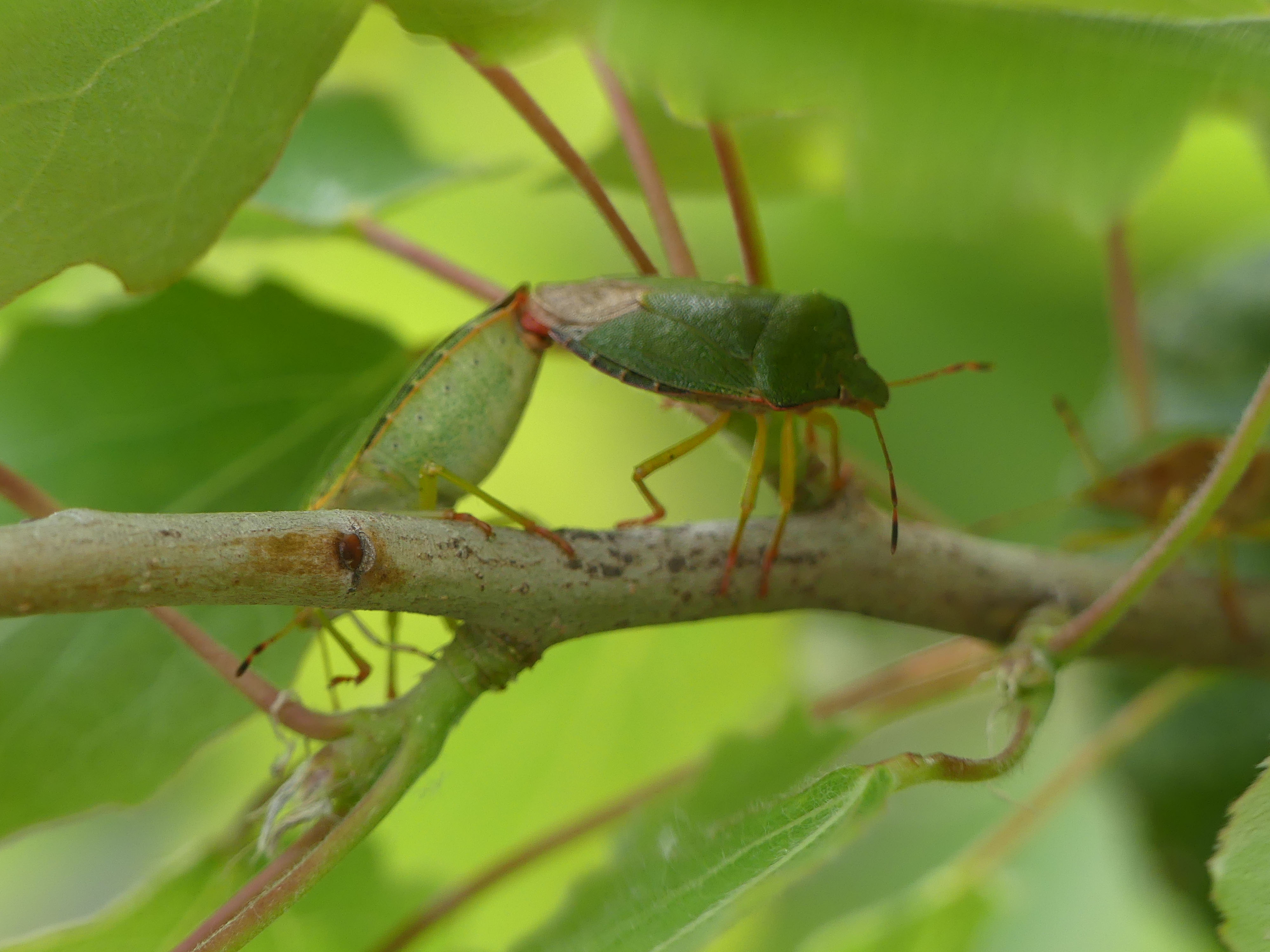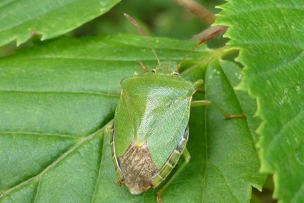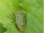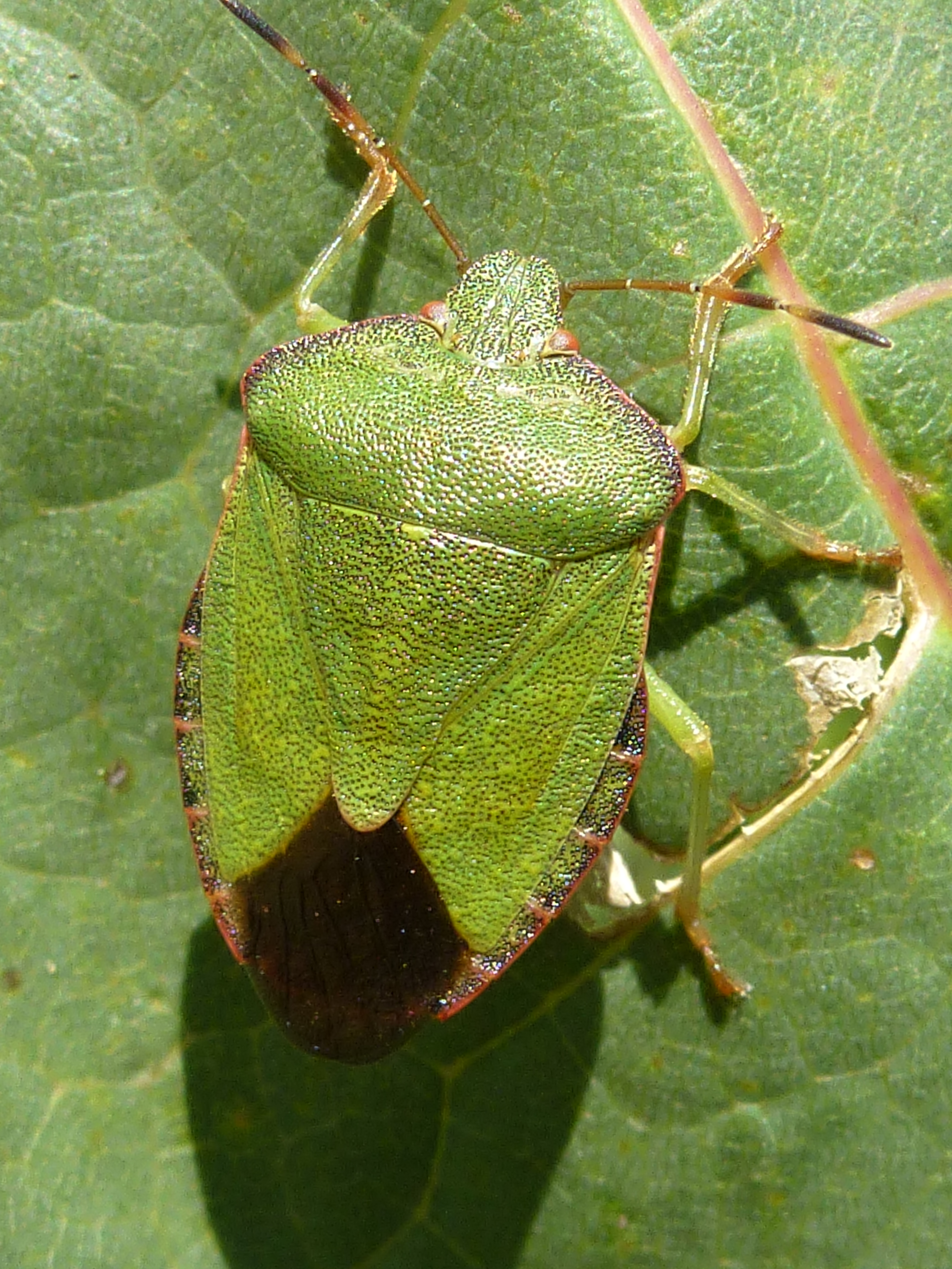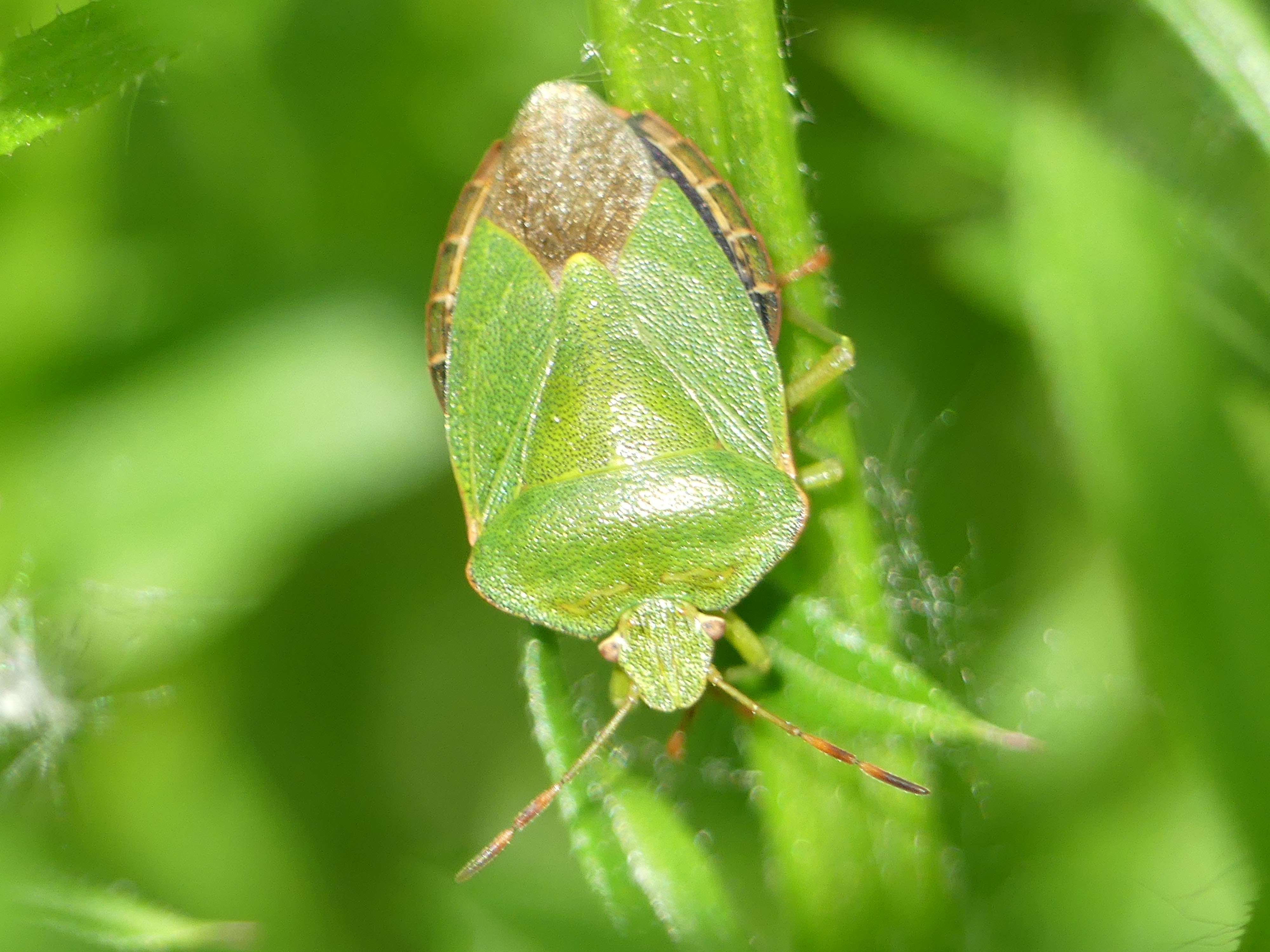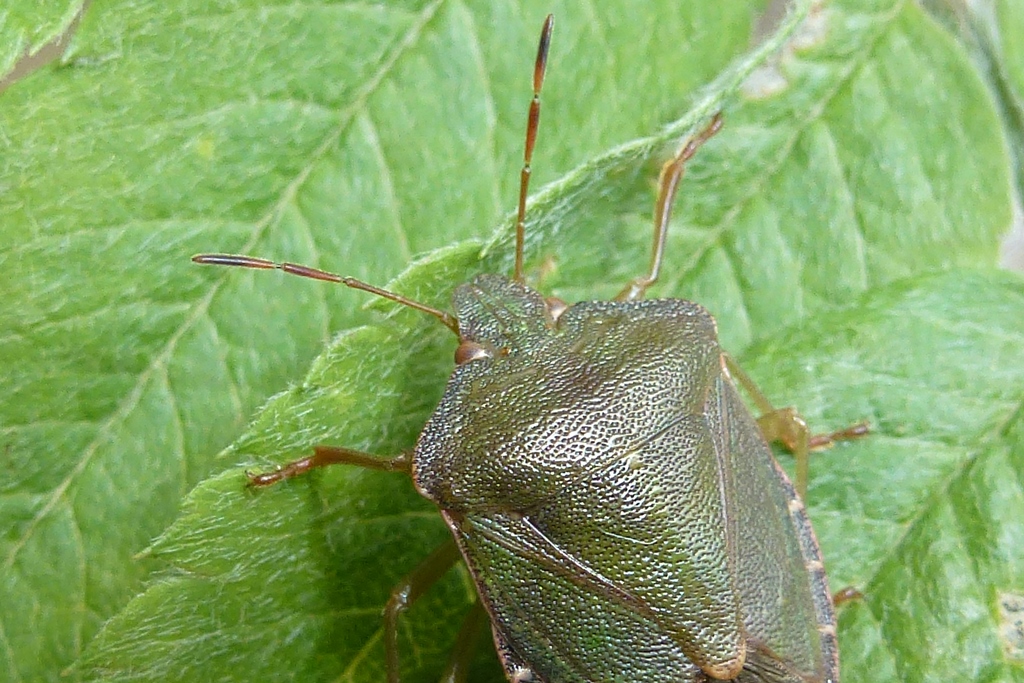 Grüne Stinkwanze (Palomena prasina (Linnaeus, 1761)), das zweite und dritte Fühlerglied sind annähernd gleich lang, im Unterschied zu Palomena viridissima, wo das dritte Fühlerglied kürzer als das zweite ist, am 1. Mai 2013 im Seifersdorfer Tal.