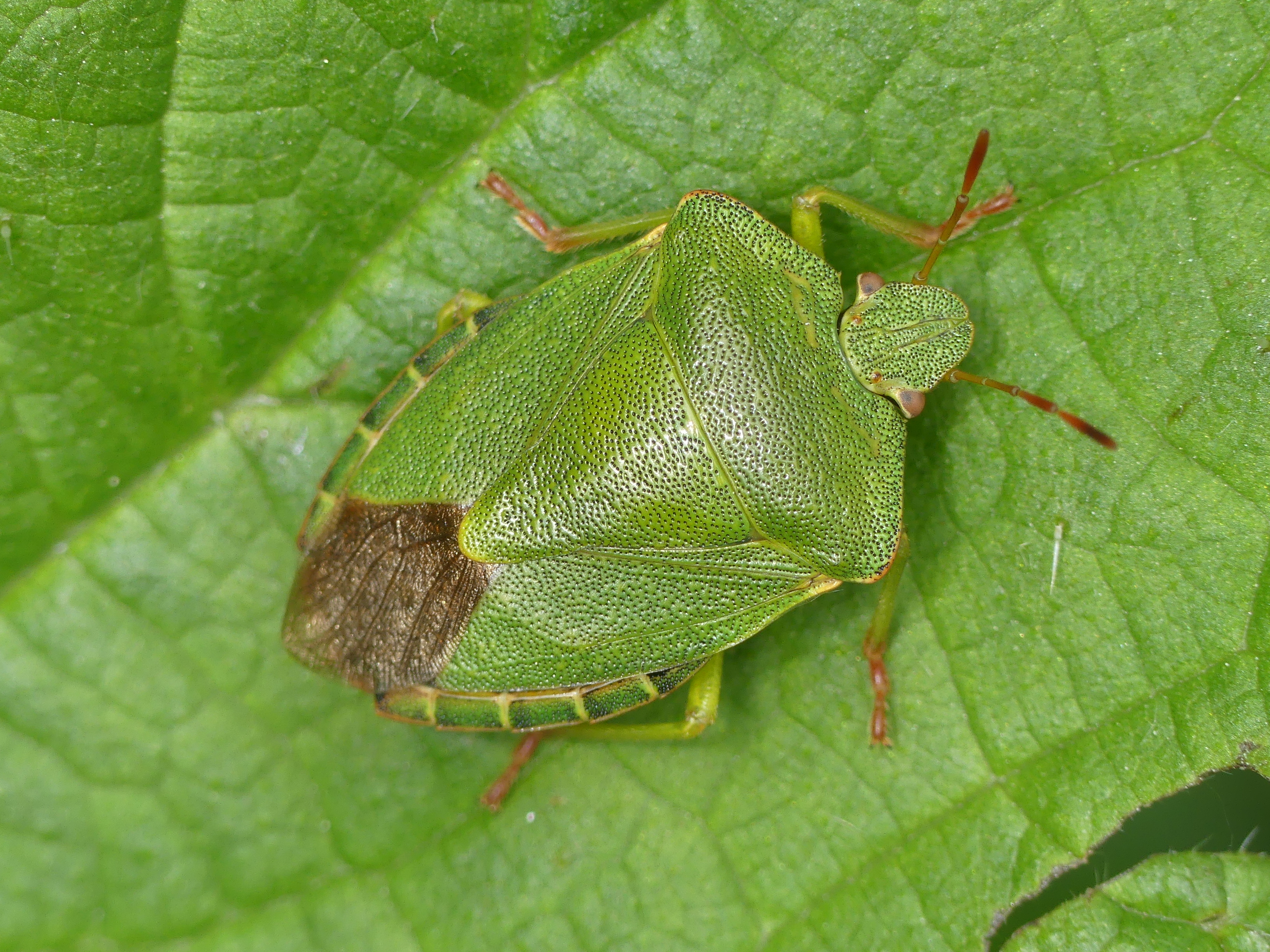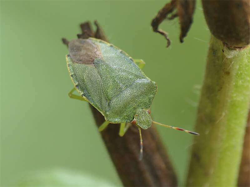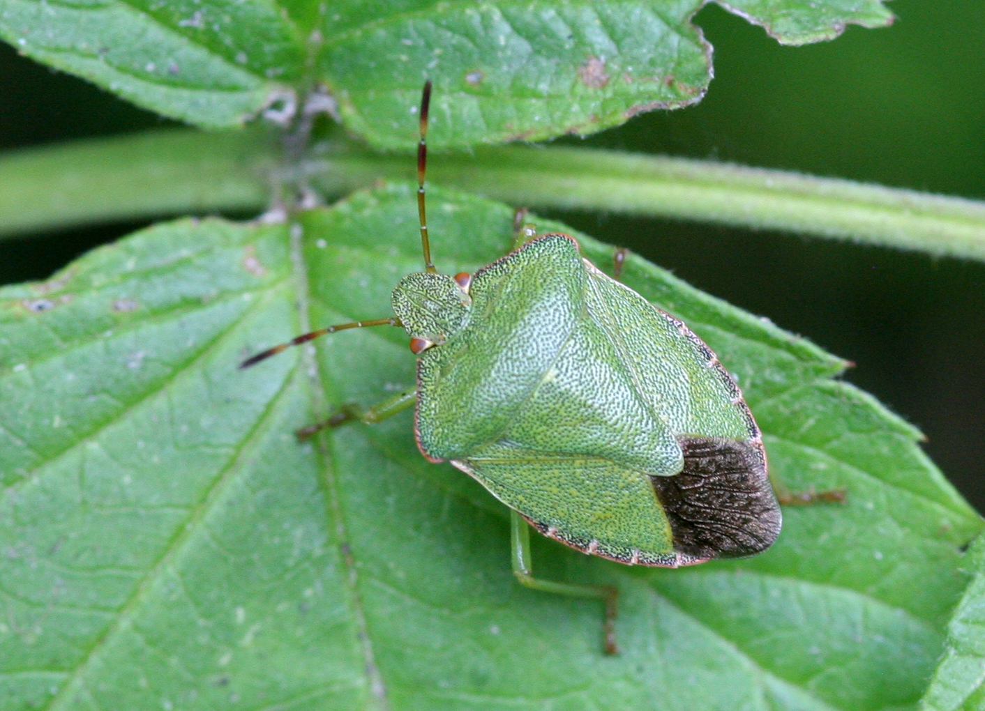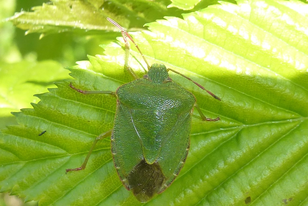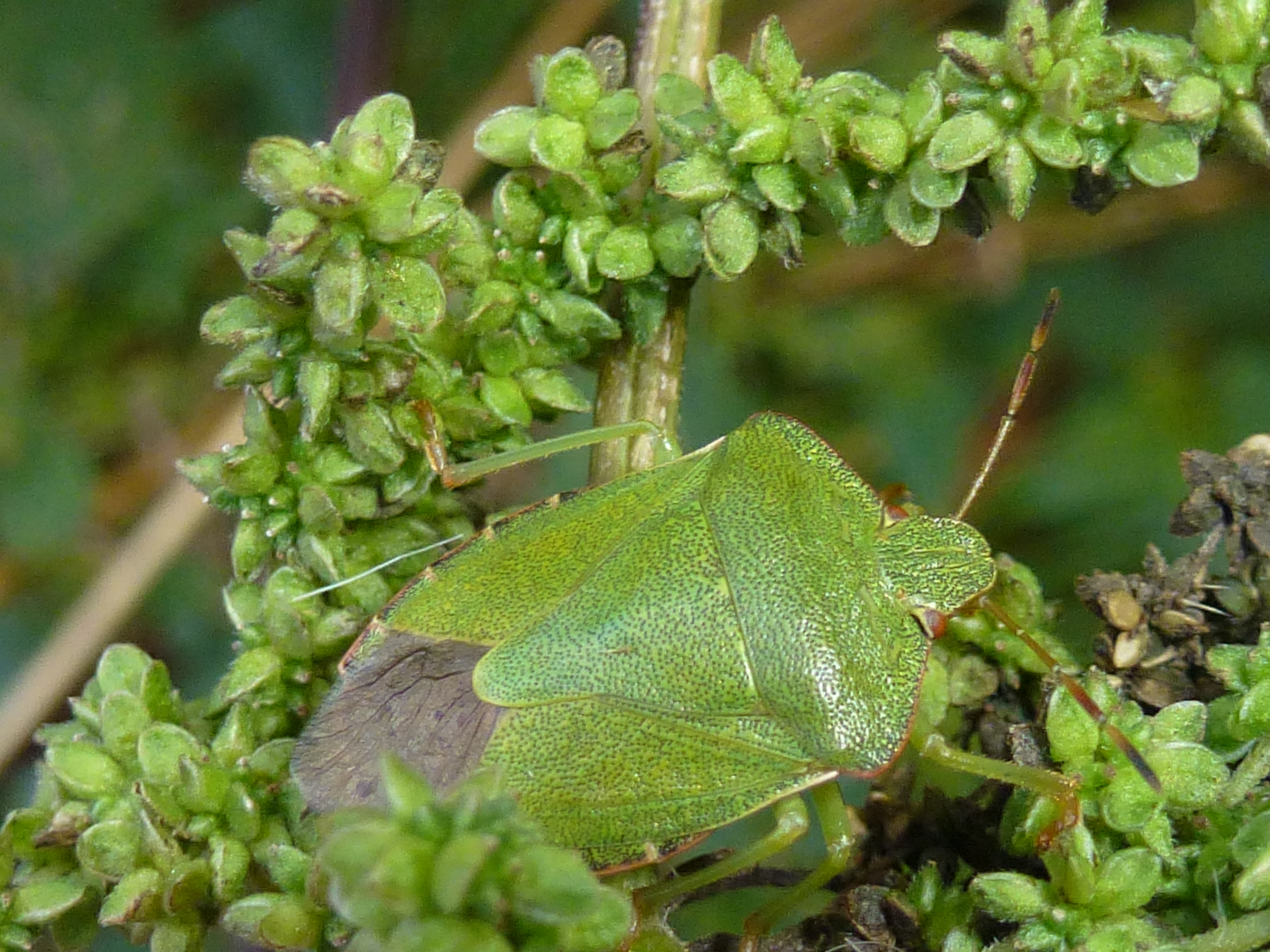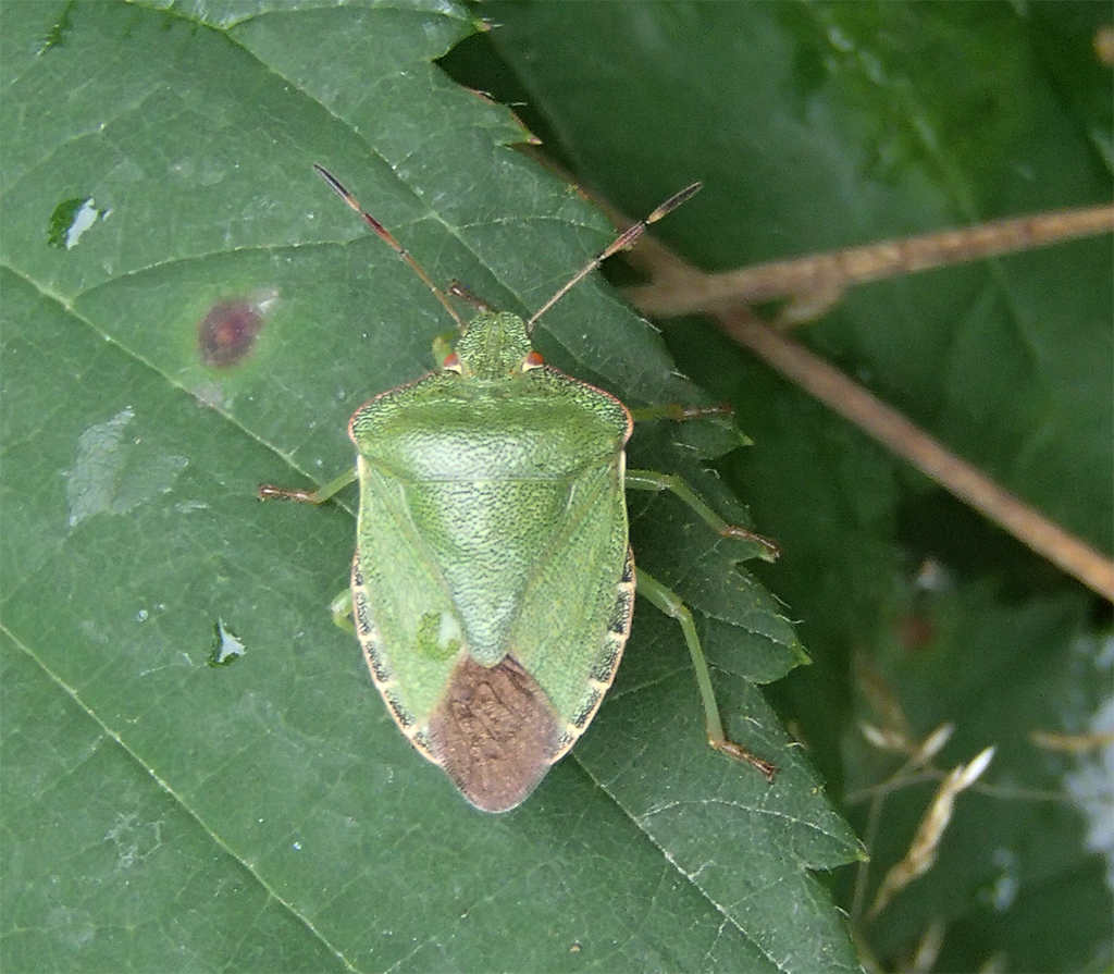 Grüne Stinkwanze (Palomena prasina (Linnaeus, 1761)), das zweite und dritte Fühlerglied sind annähernd gleich lang, im Unterschied zu Palomena viridissima, wo das dritte Fühlerglied kürzer als das zweite ist, am 1. Mai 2013 im Seifersdorfer Tal.