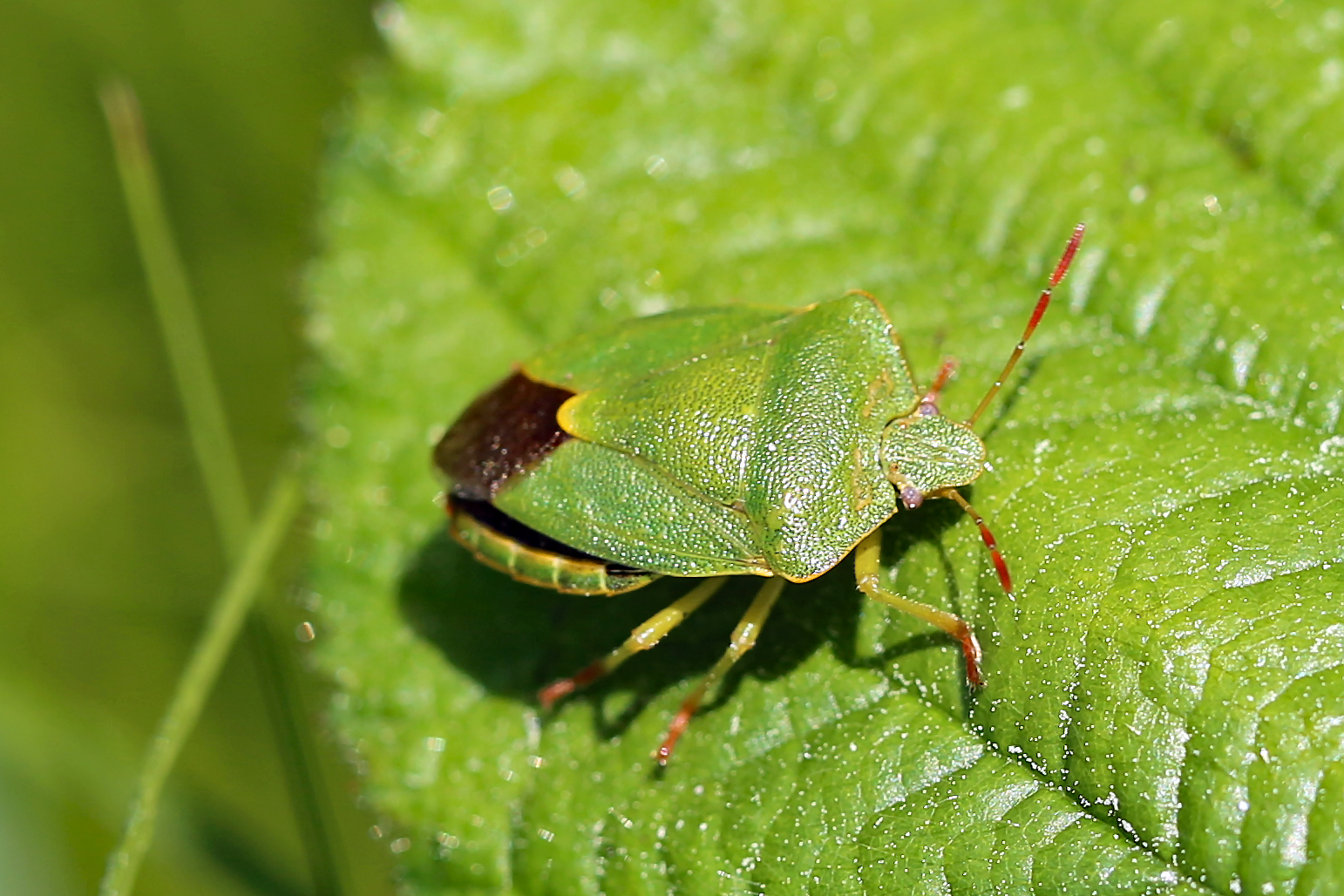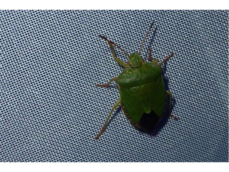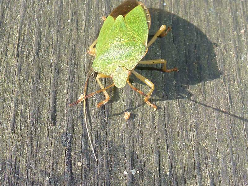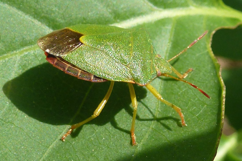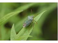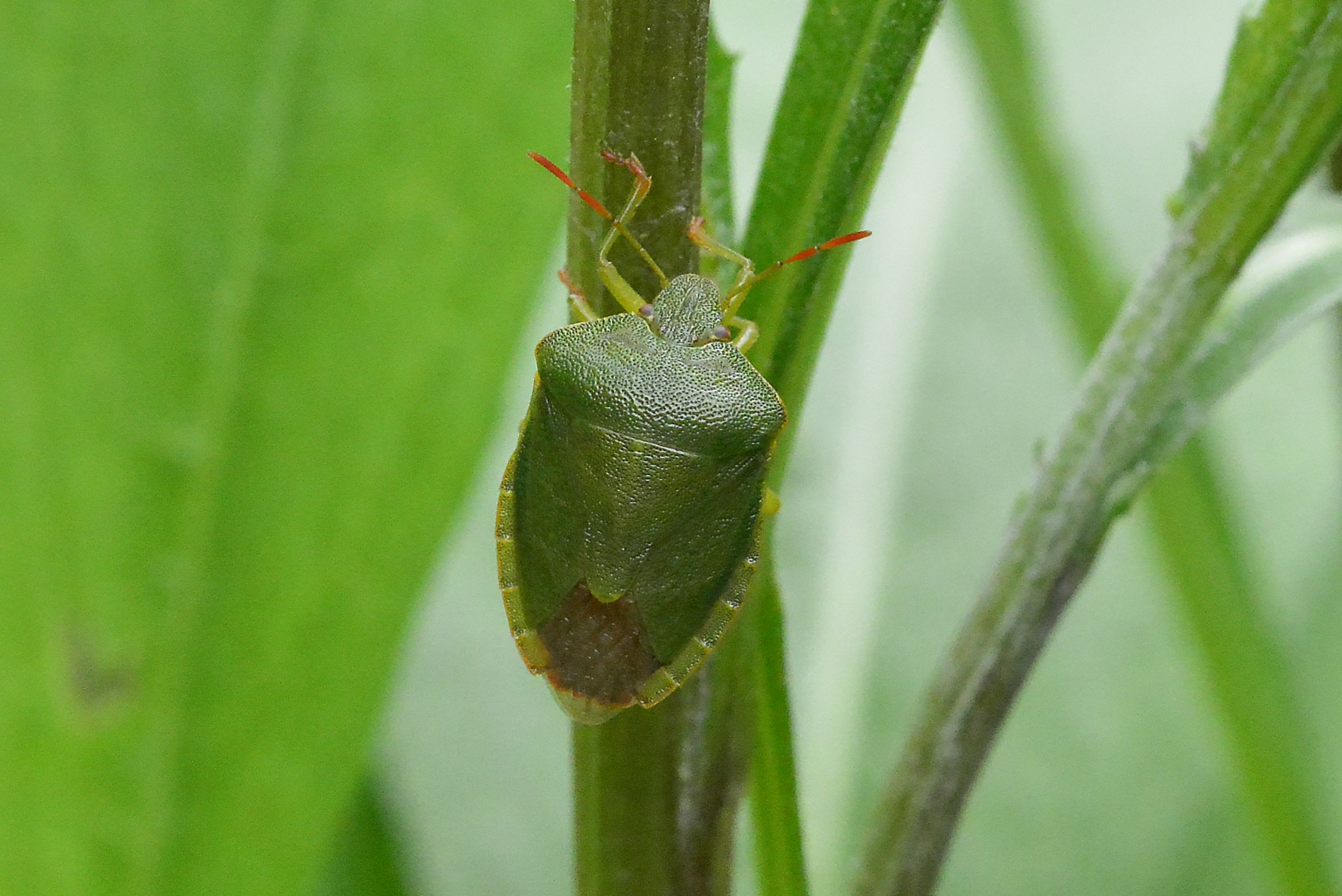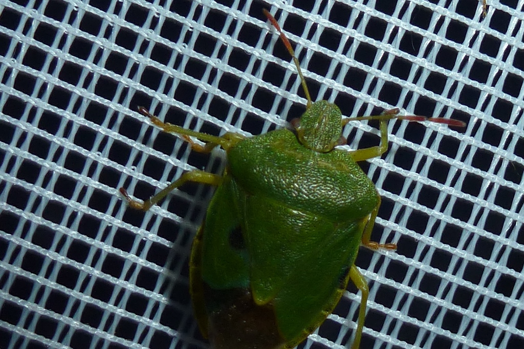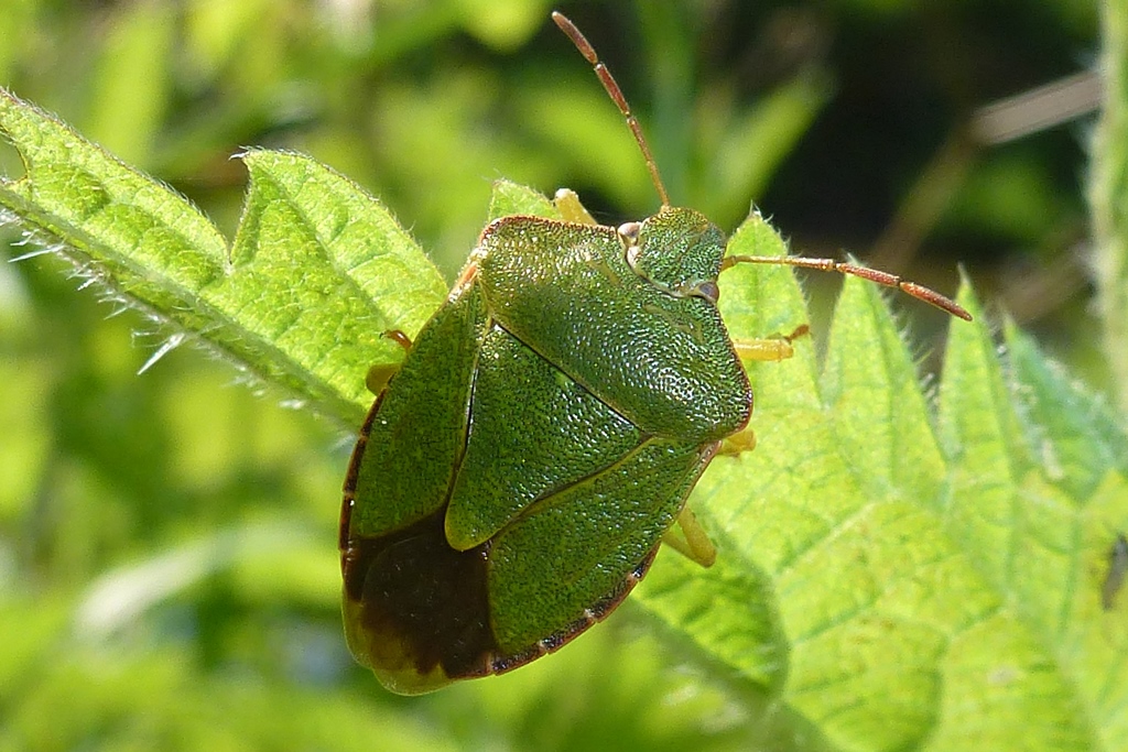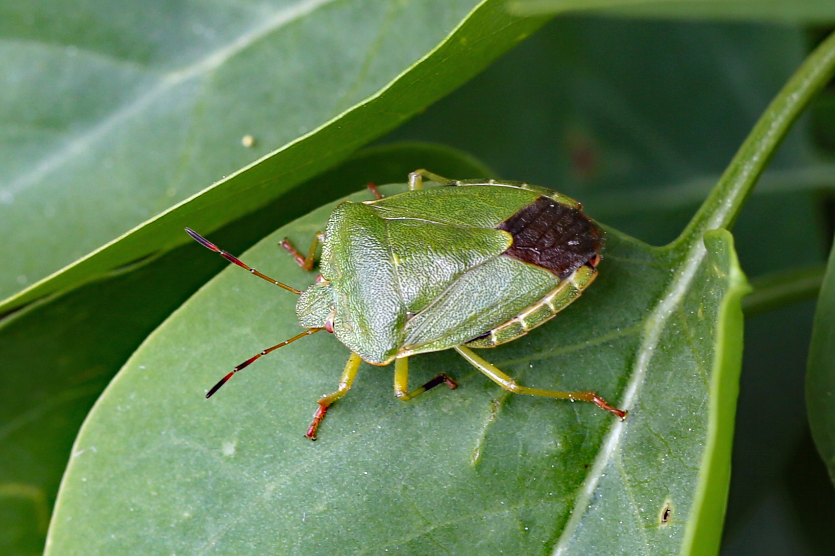 Grüne Stinkwanze (Palomena prasina (Linnaeus, 1761)), das zweite und dritte Fühlerglied sind annähernd gleich lang, im Unterschied zu Palomena viridissima, wo das dritte Fühlerglied kürzer als das zweite ist, am 1. Mai 2013 im Seifersdorfer Tal.