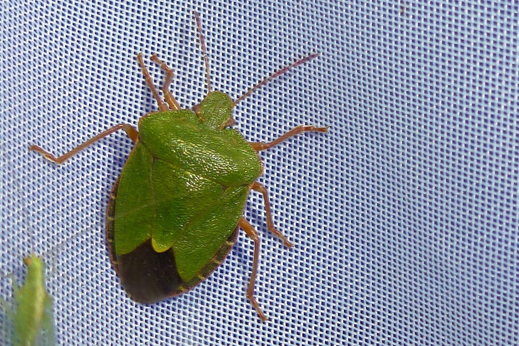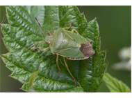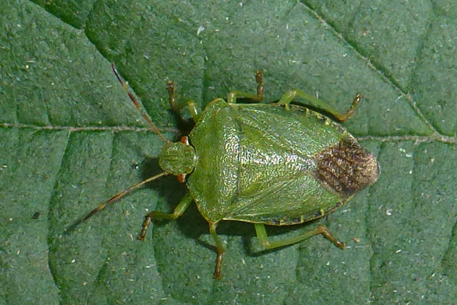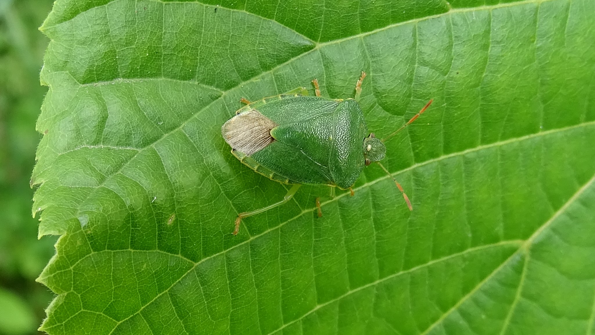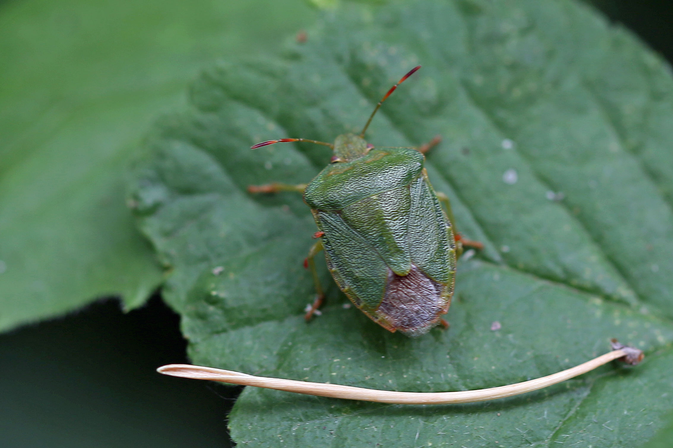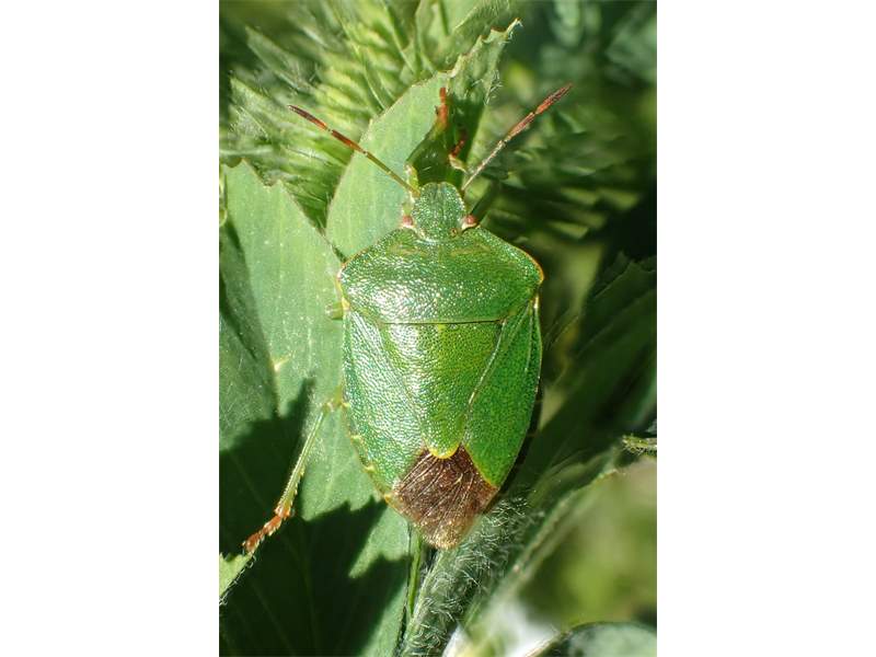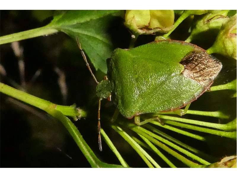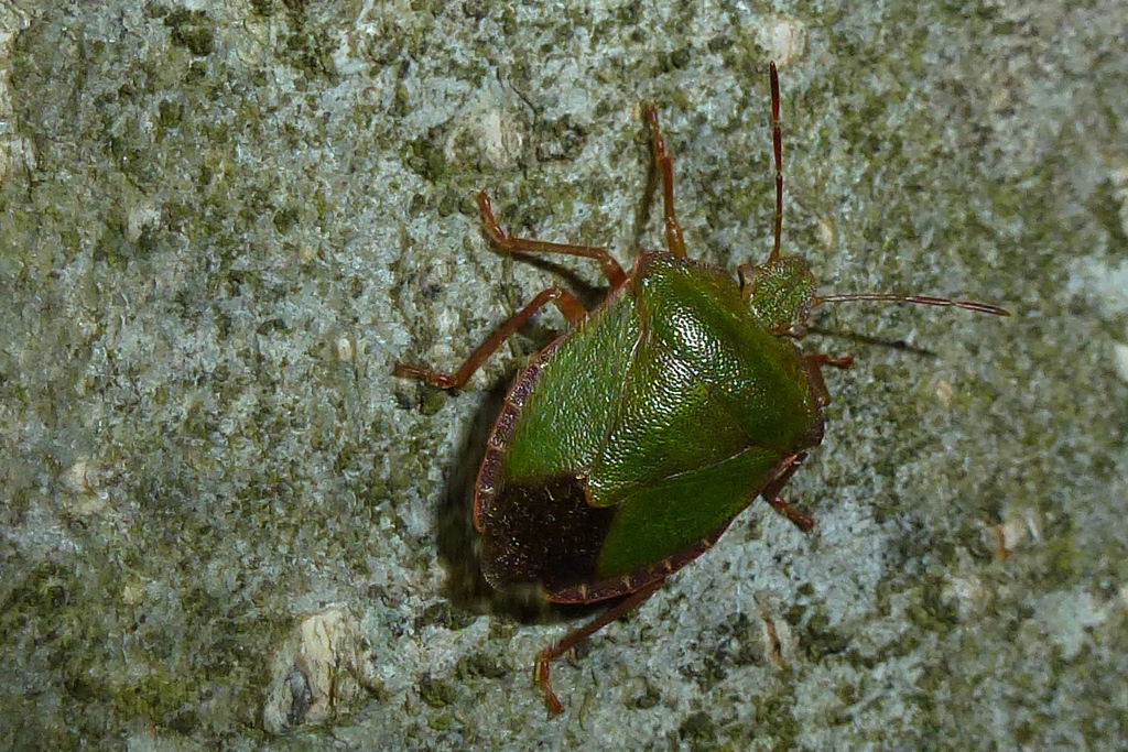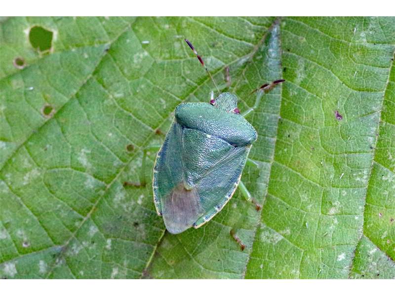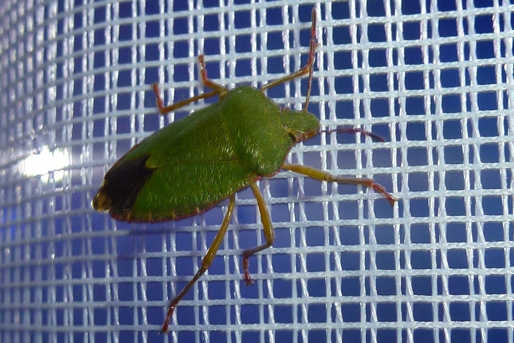 Grüne Stinkwanze (Palomena prasina (Linnaeus, 1761)), das zweite und dritte Fühlerglied sind annähernd gleich lang, im Unterschied zu Palomena viridissima, wo das dritte Fühlerglied kürzer als das zweite ist, am 1. Mai 2013 im Seifersdorfer Tal.