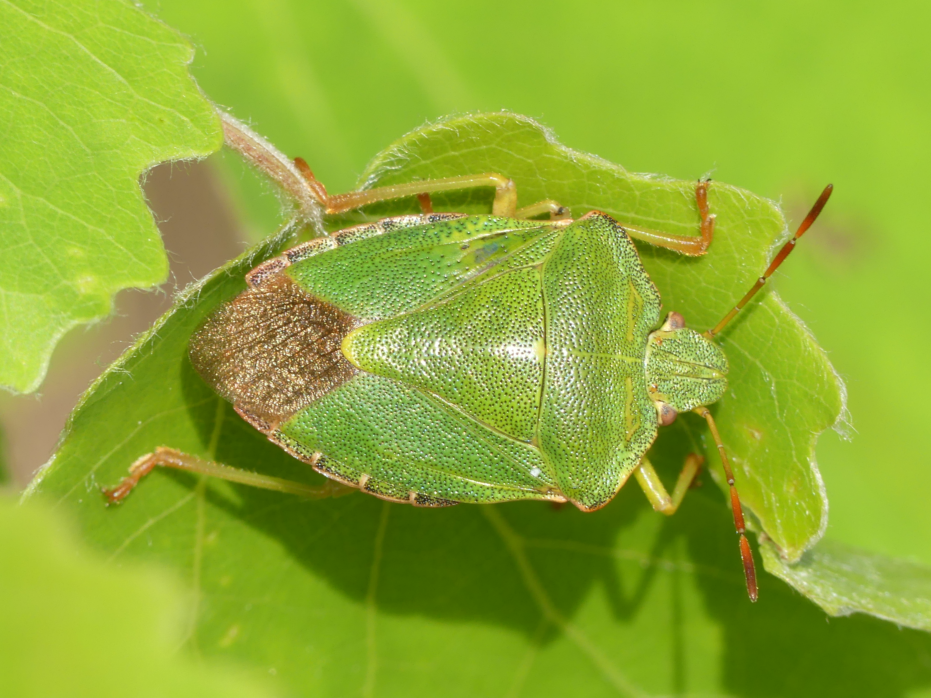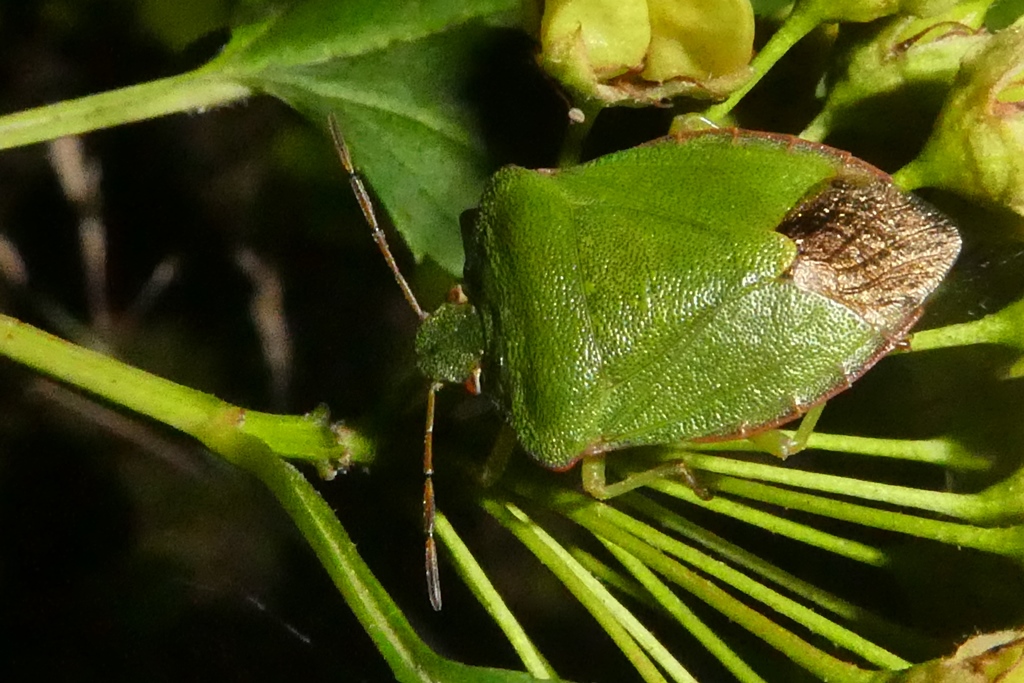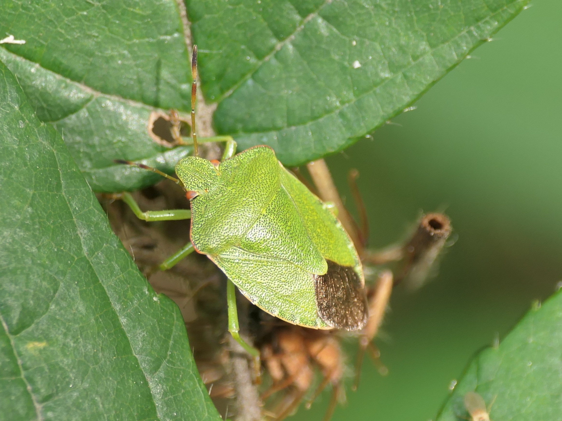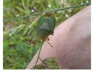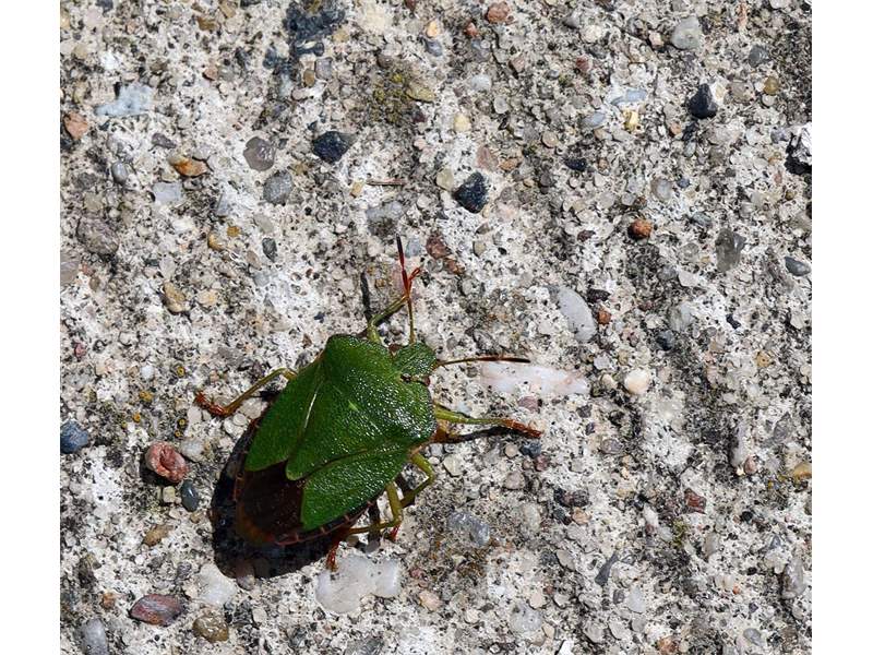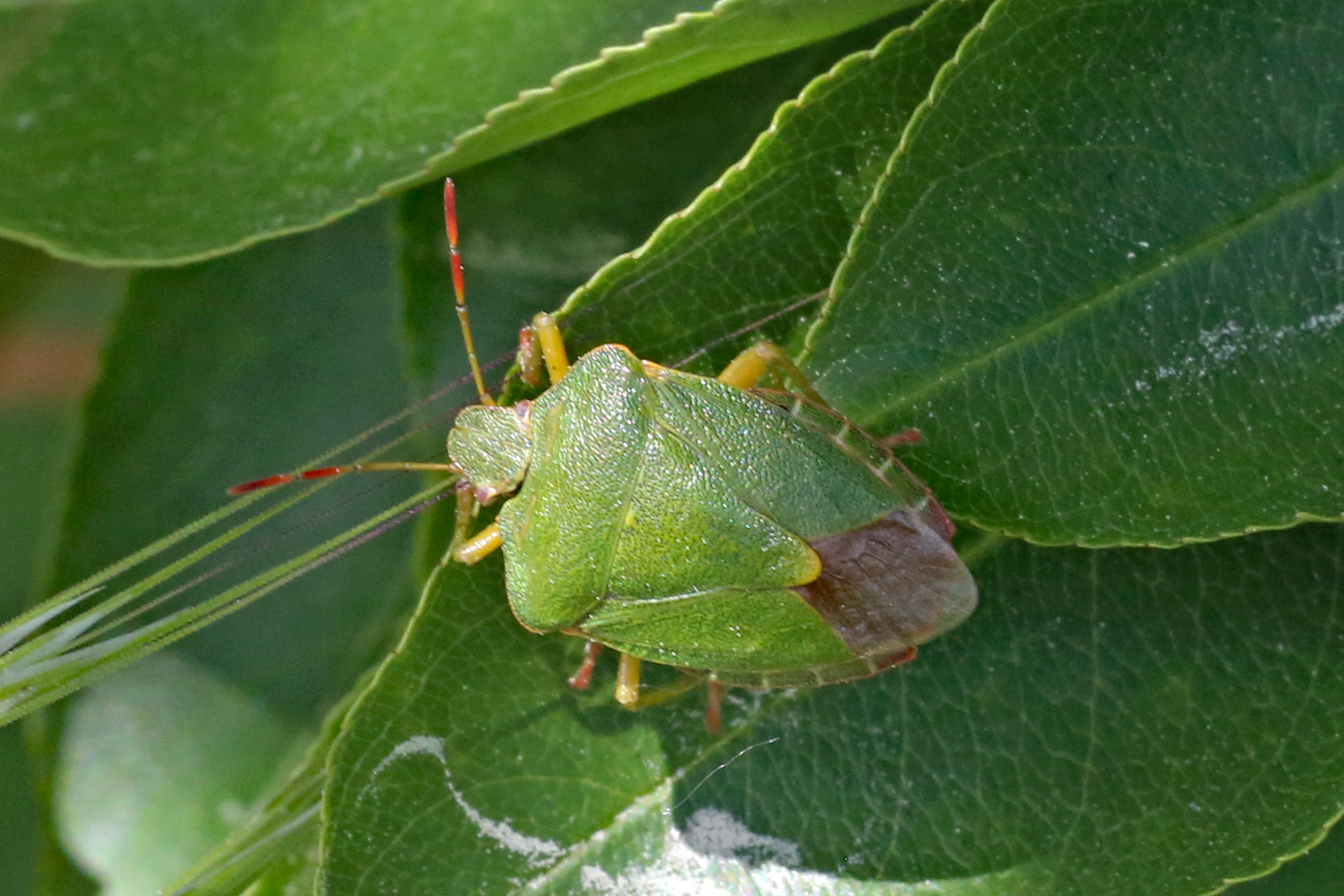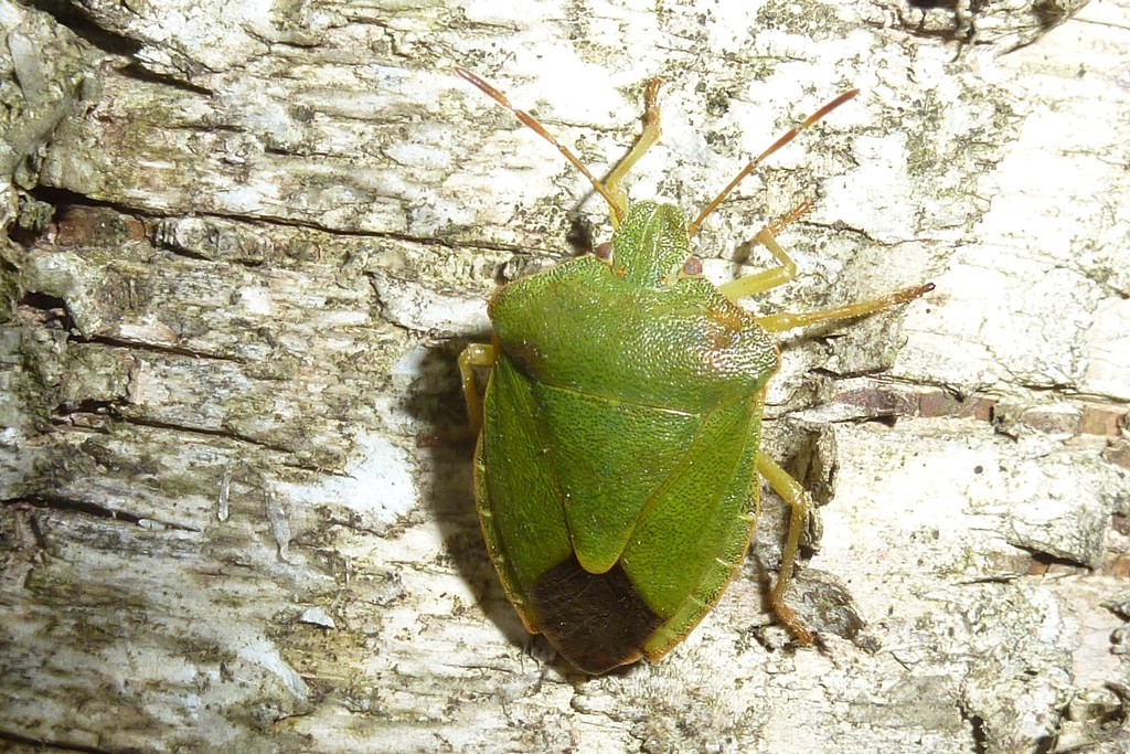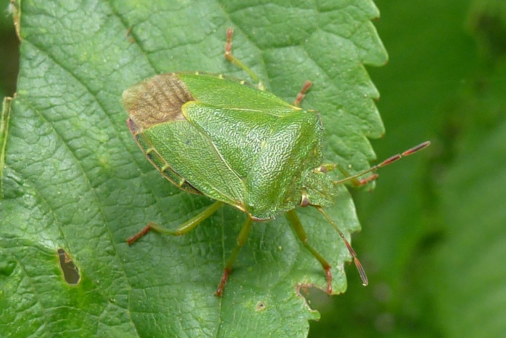 Grüne Stinkwanze (Palomena prasina (Linnaeus, 1761)), das zweite und dritte Fühlerglied sind annähernd gleich lang, im Unterschied zu Palomena viridissima, wo das dritte Fühlerglied kürzer als das zweite ist, am 1. Mai 2013 im Seifersdorfer Tal.