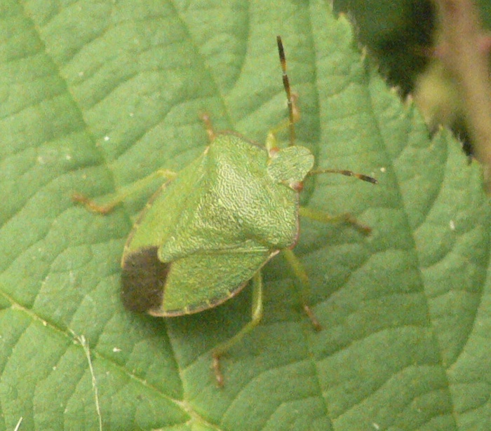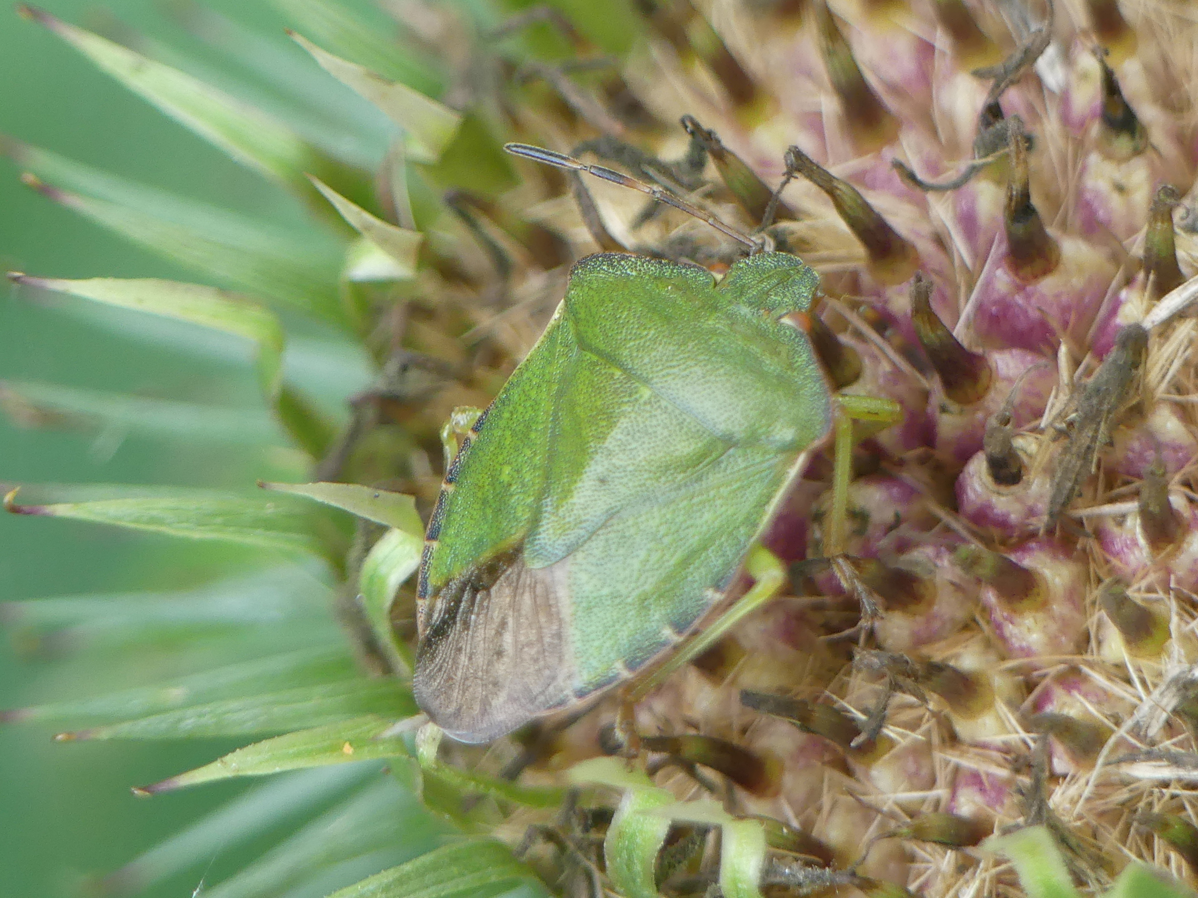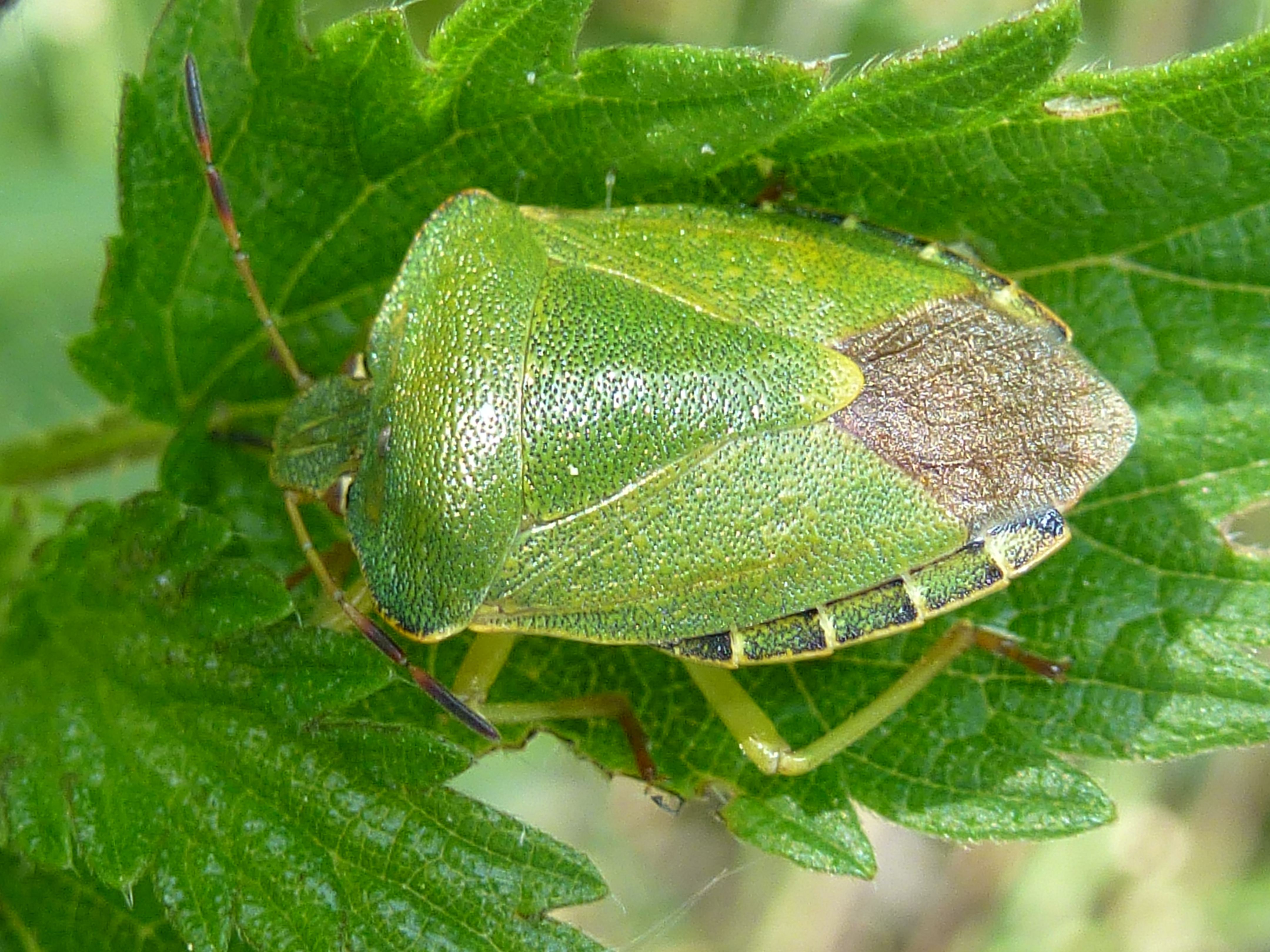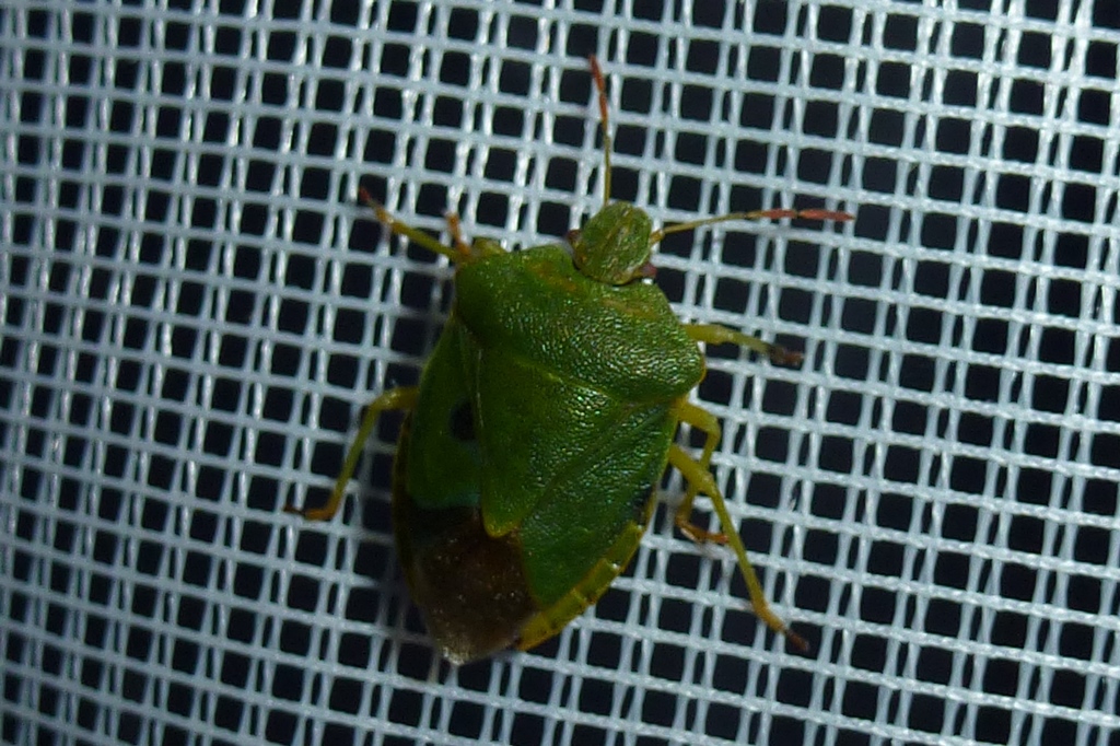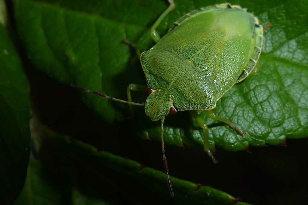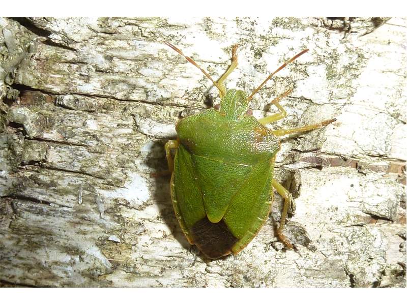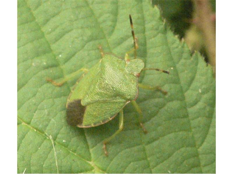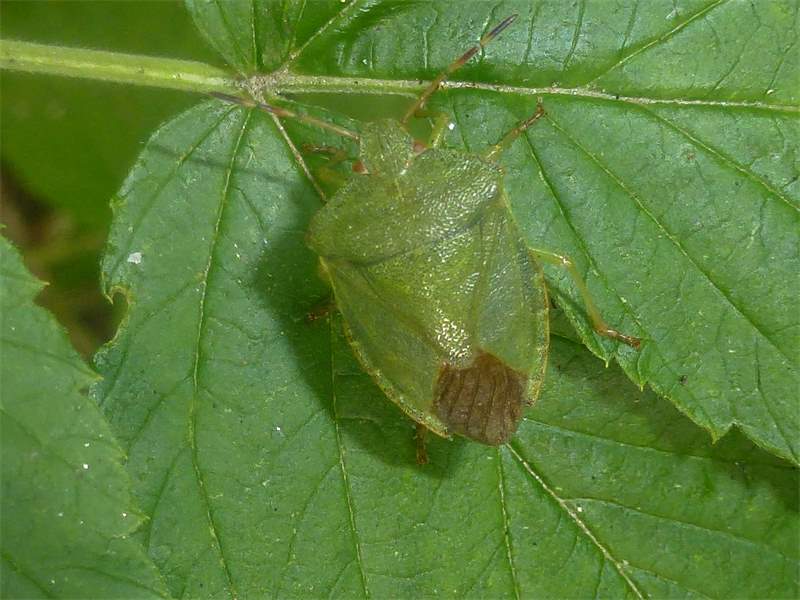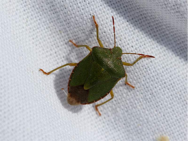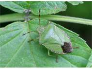 Grüne Stinkwanze (Palomena prasina (Linnaeus, 1761)), das zweite und dritte Fühlerglied sind annähernd gleich lang, im Unterschied zu Palomena viridissima, wo das dritte Fühlerglied kürzer als das zweite ist, am 1. Mai 2013 im Seifersdorfer Tal.