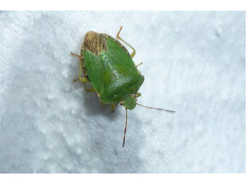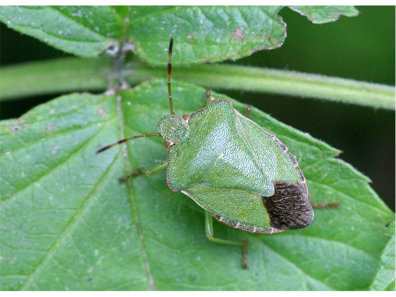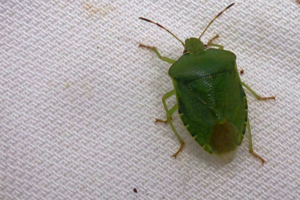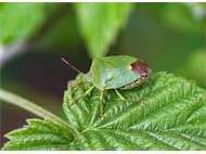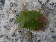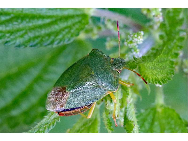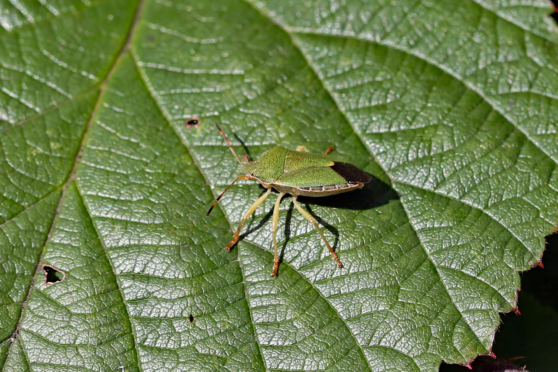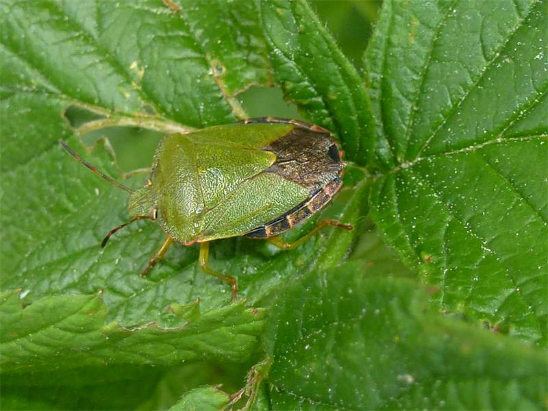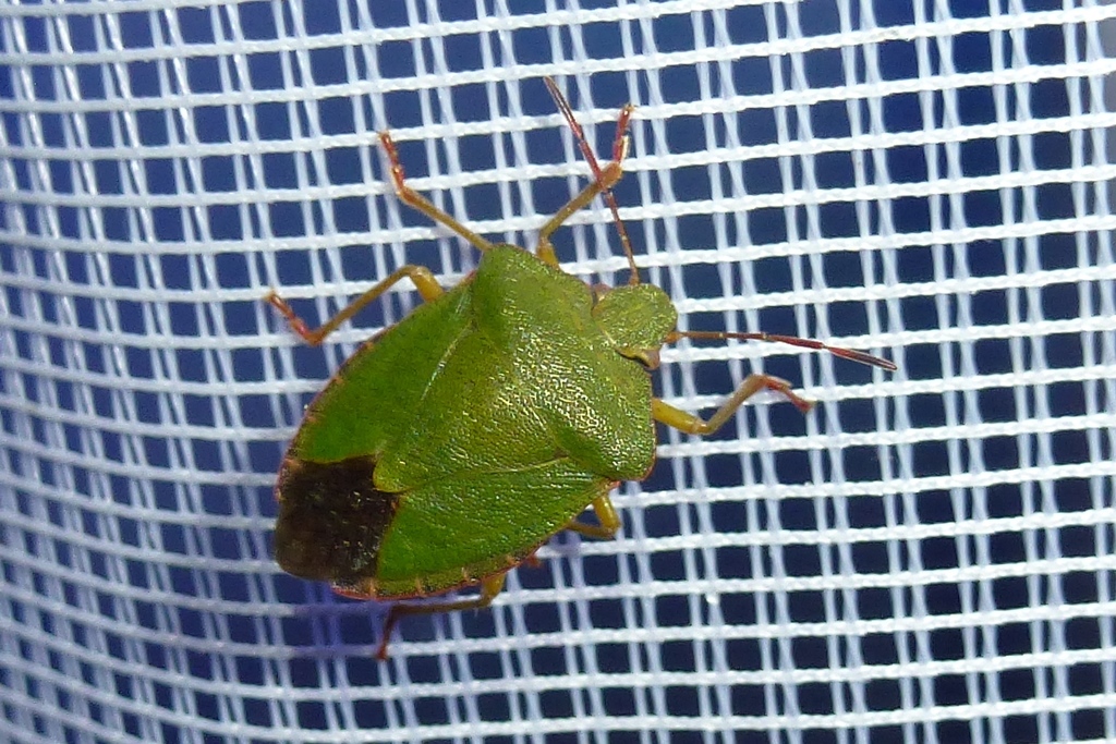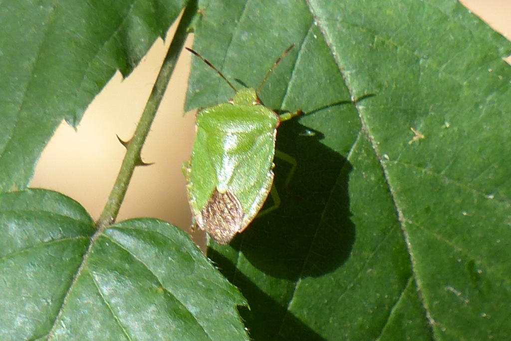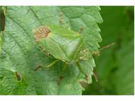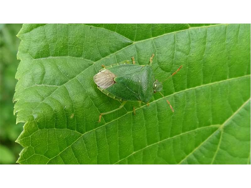 Grüne Stinkwanze (Palomena prasina (Linnaeus, 1761)), das zweite und dritte Fühlerglied sind annähernd gleich lang, im Unterschied zu Palomena viridissima, wo das dritte Fühlerglied kürzer als das zweite ist, am 1. Mai 2013 im Seifersdorfer Tal.