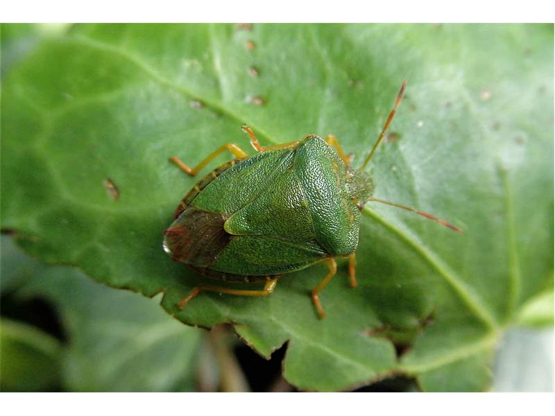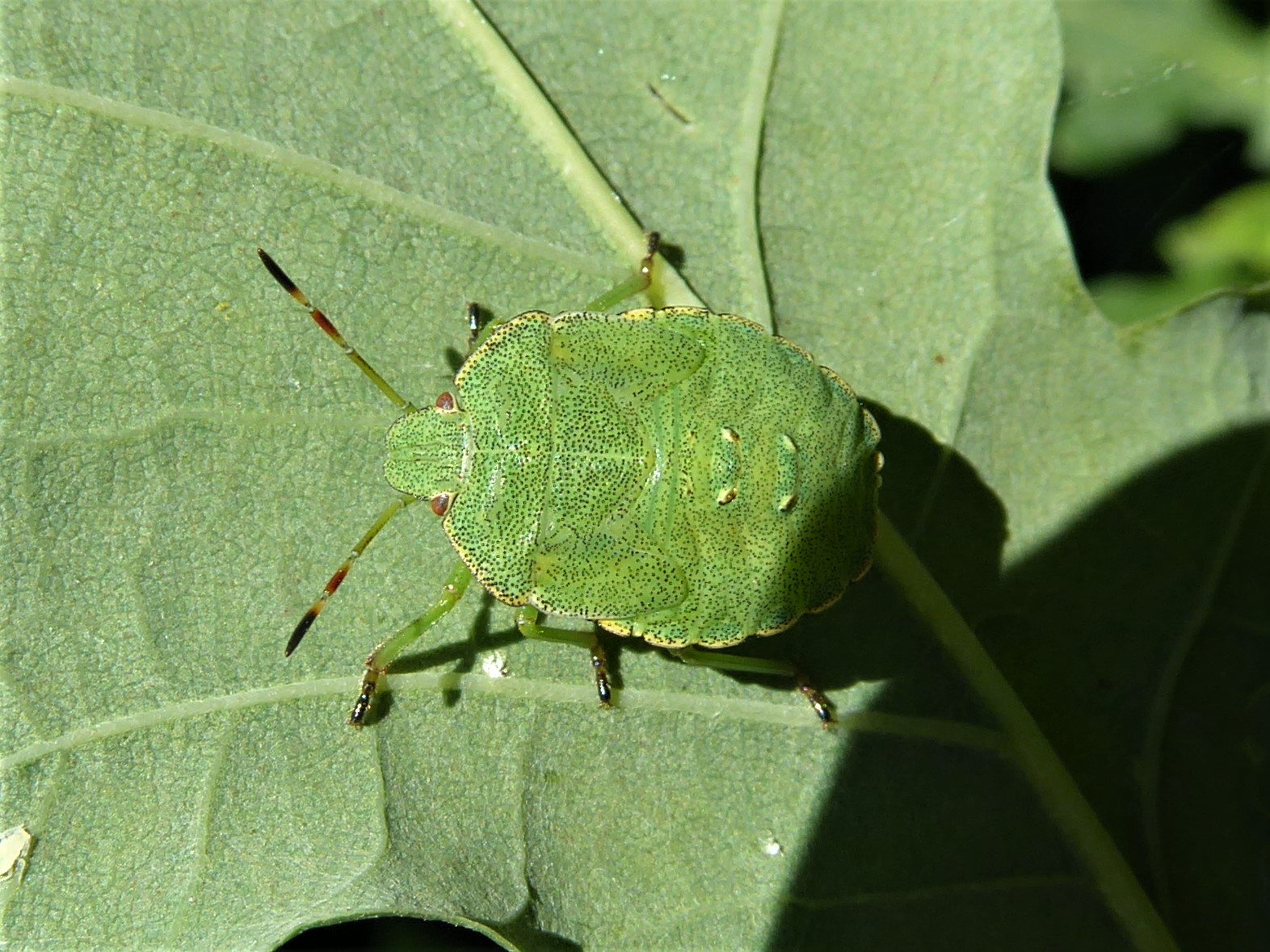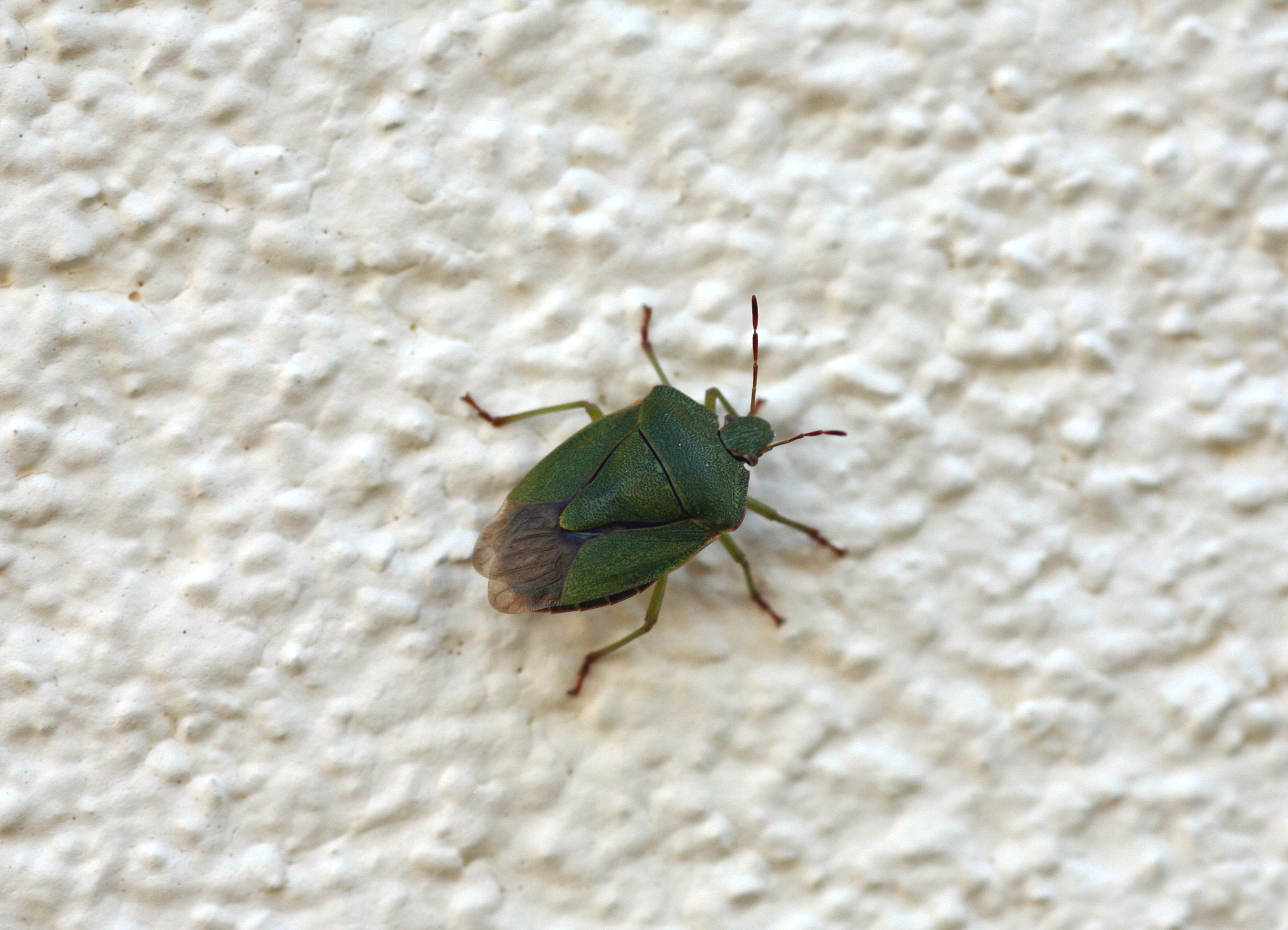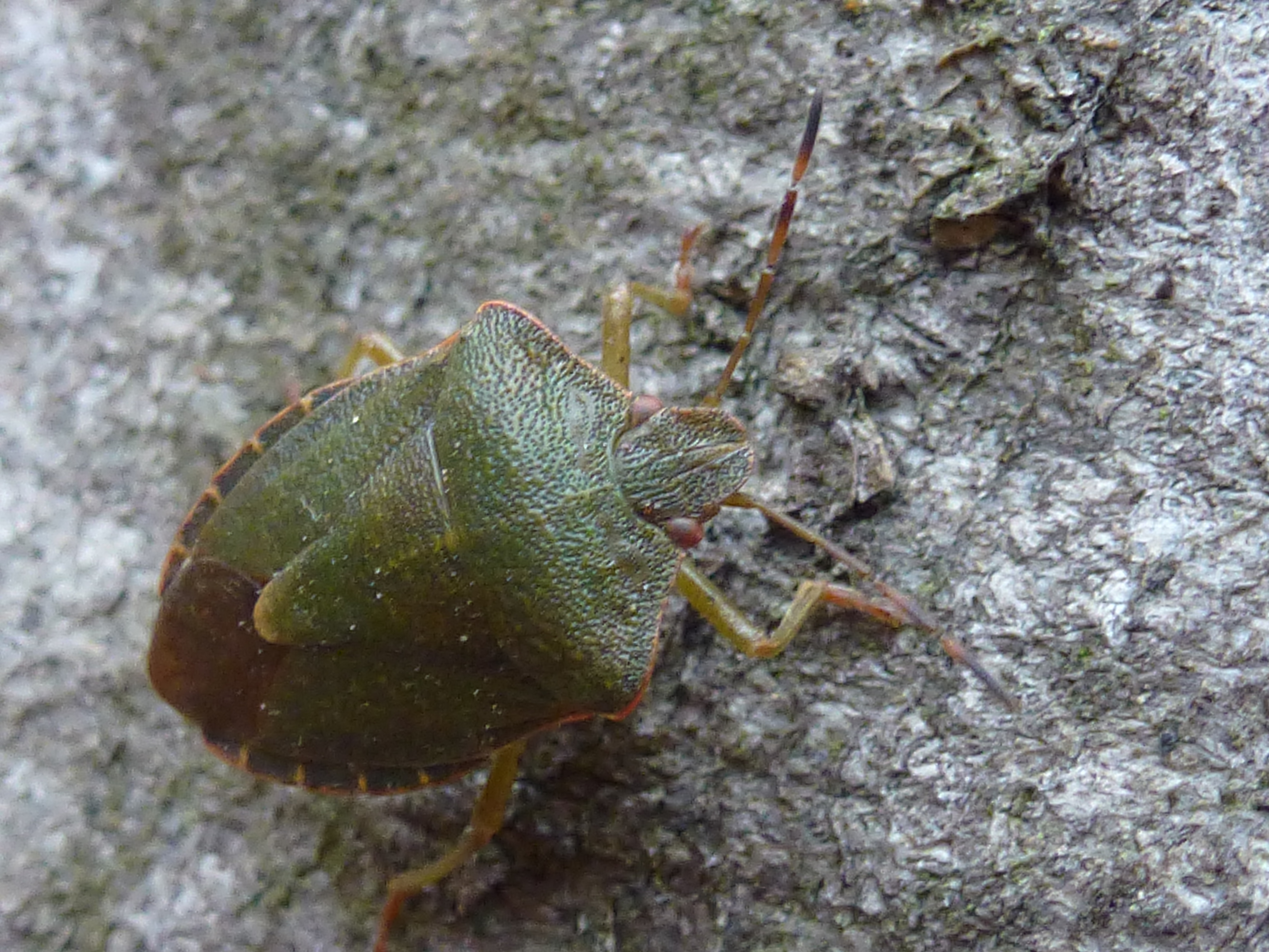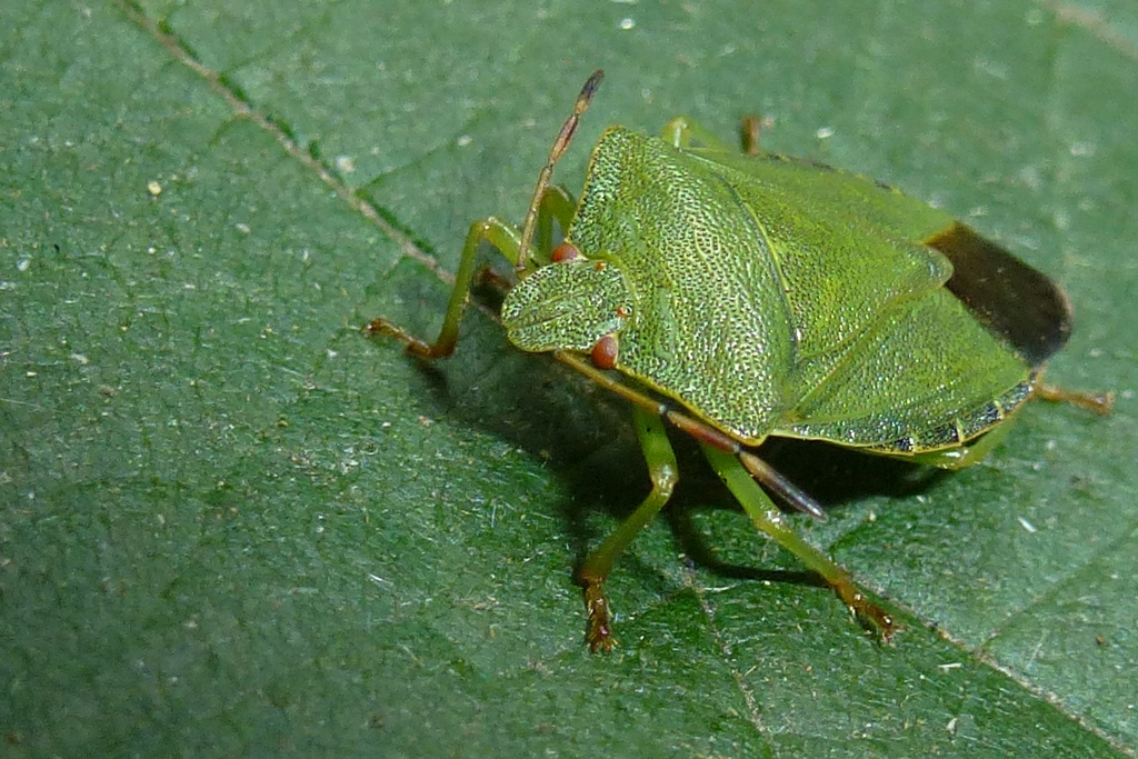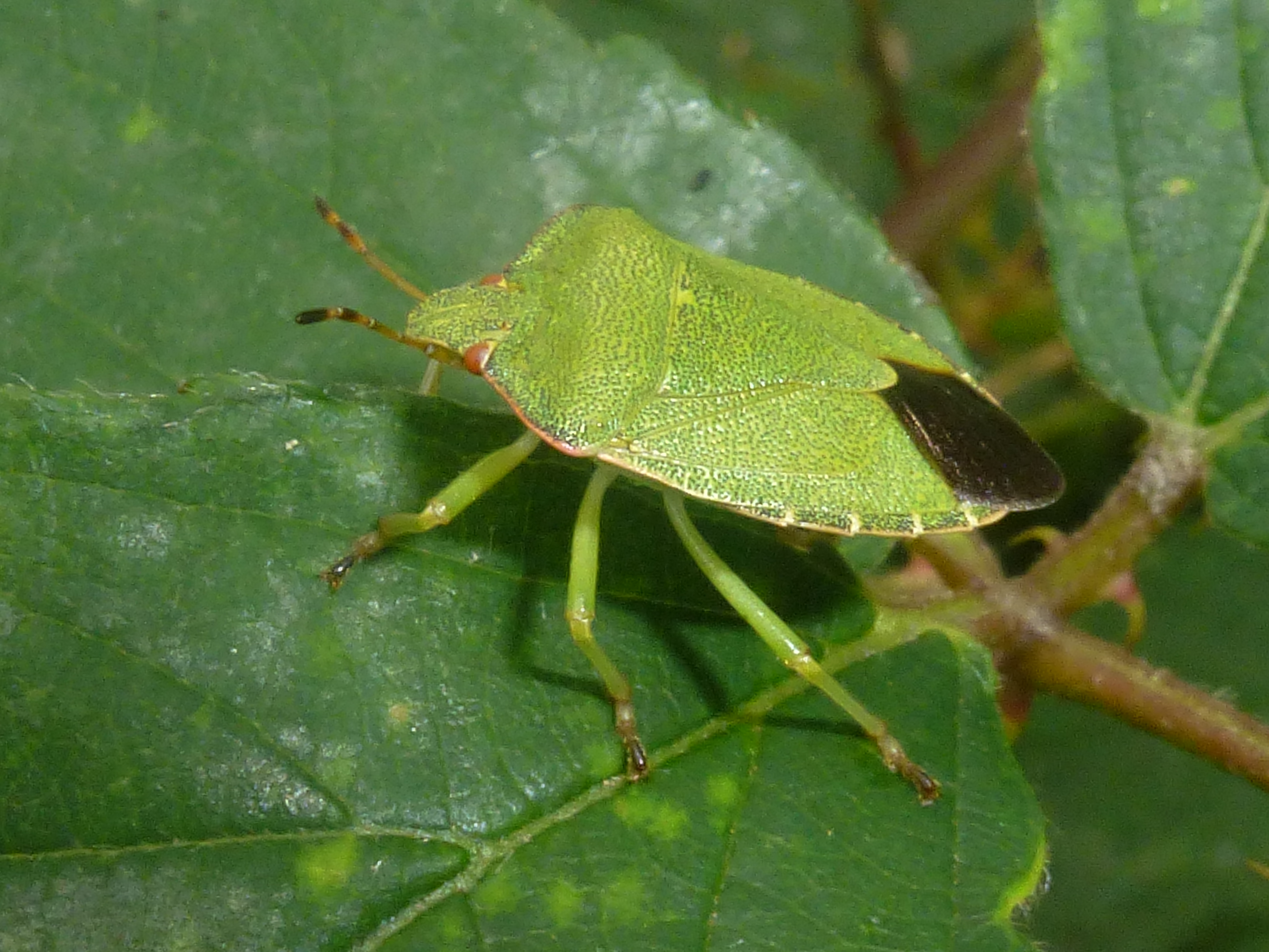 Grüne Stinkwanze (Palomena prasina (Linnaeus, 1761)), das zweite und dritte Fühlerglied sind annähernd gleich lang, im Unterschied zu Palomena viridissima, wo das dritte Fühlerglied kürzer als das zweite ist, am 1. Mai 2013 im Seifersdorfer Tal.