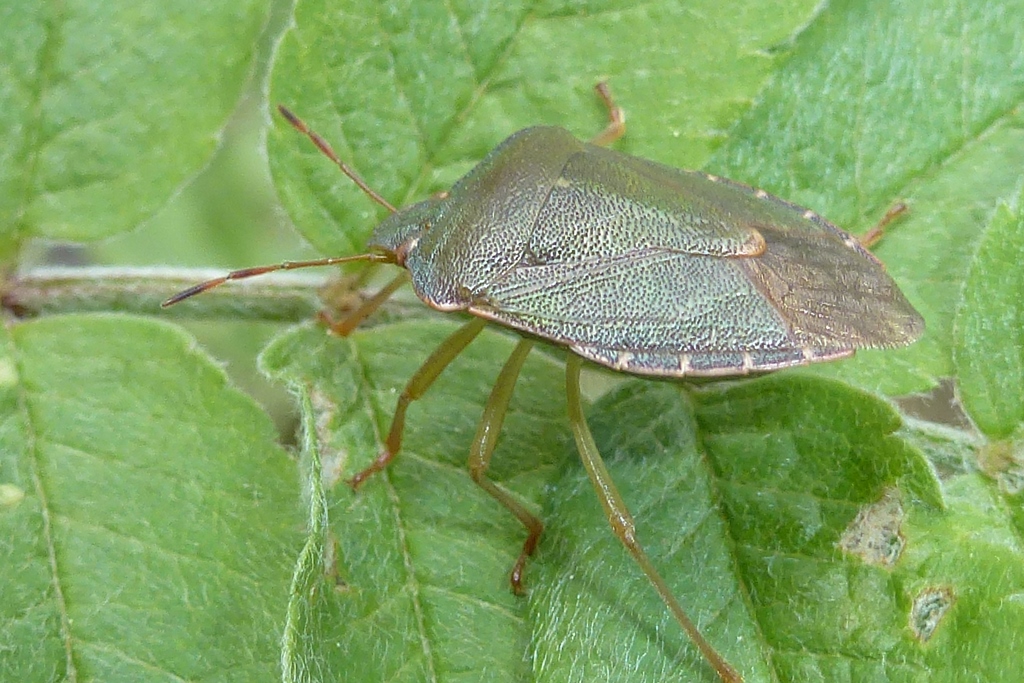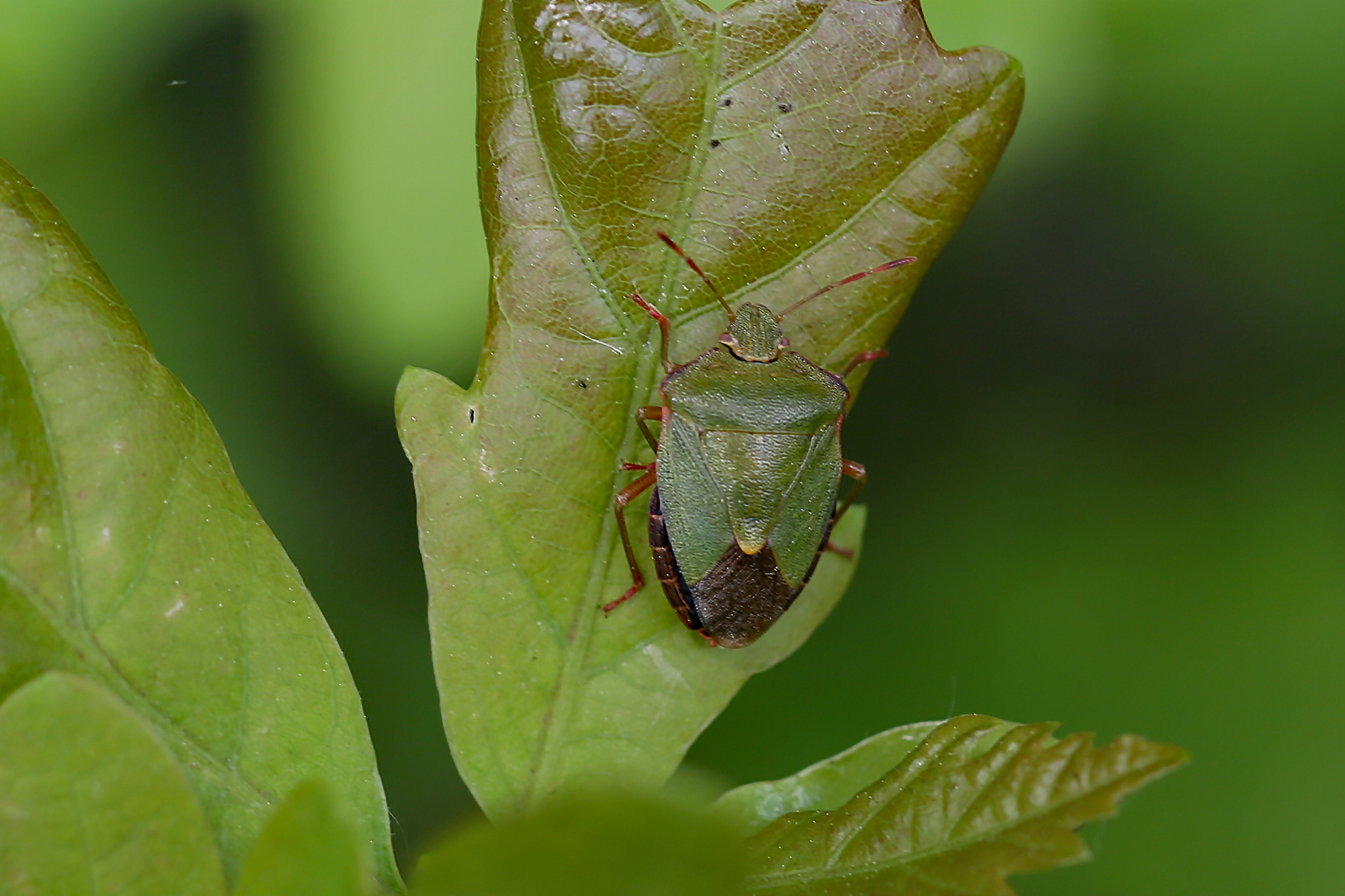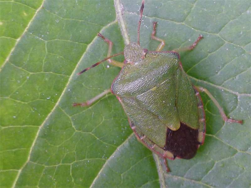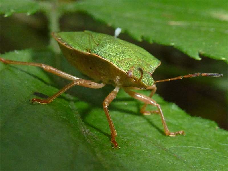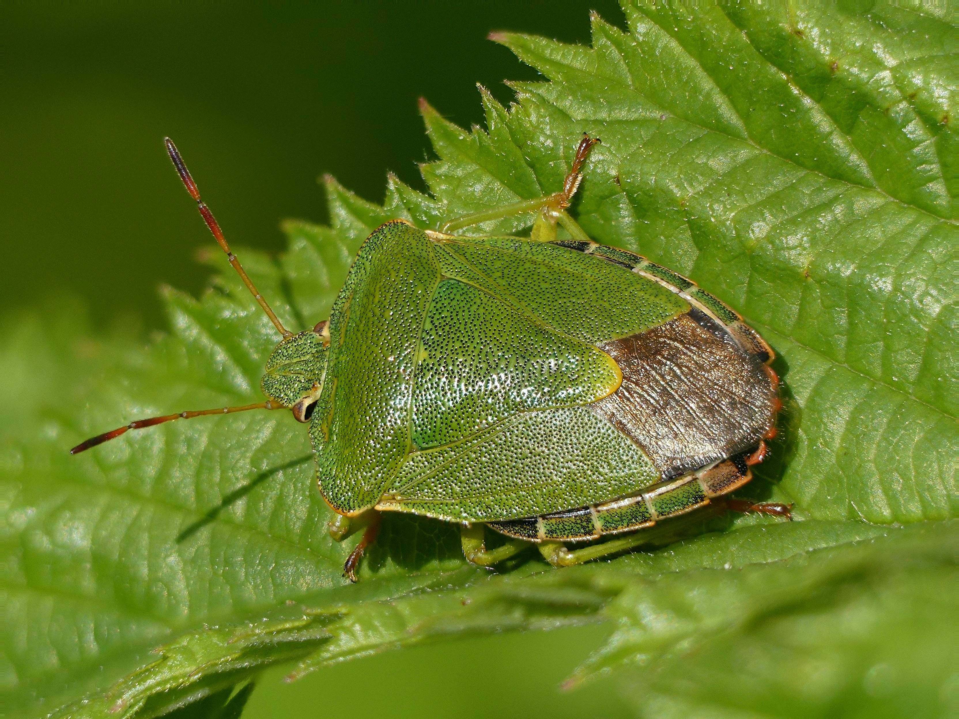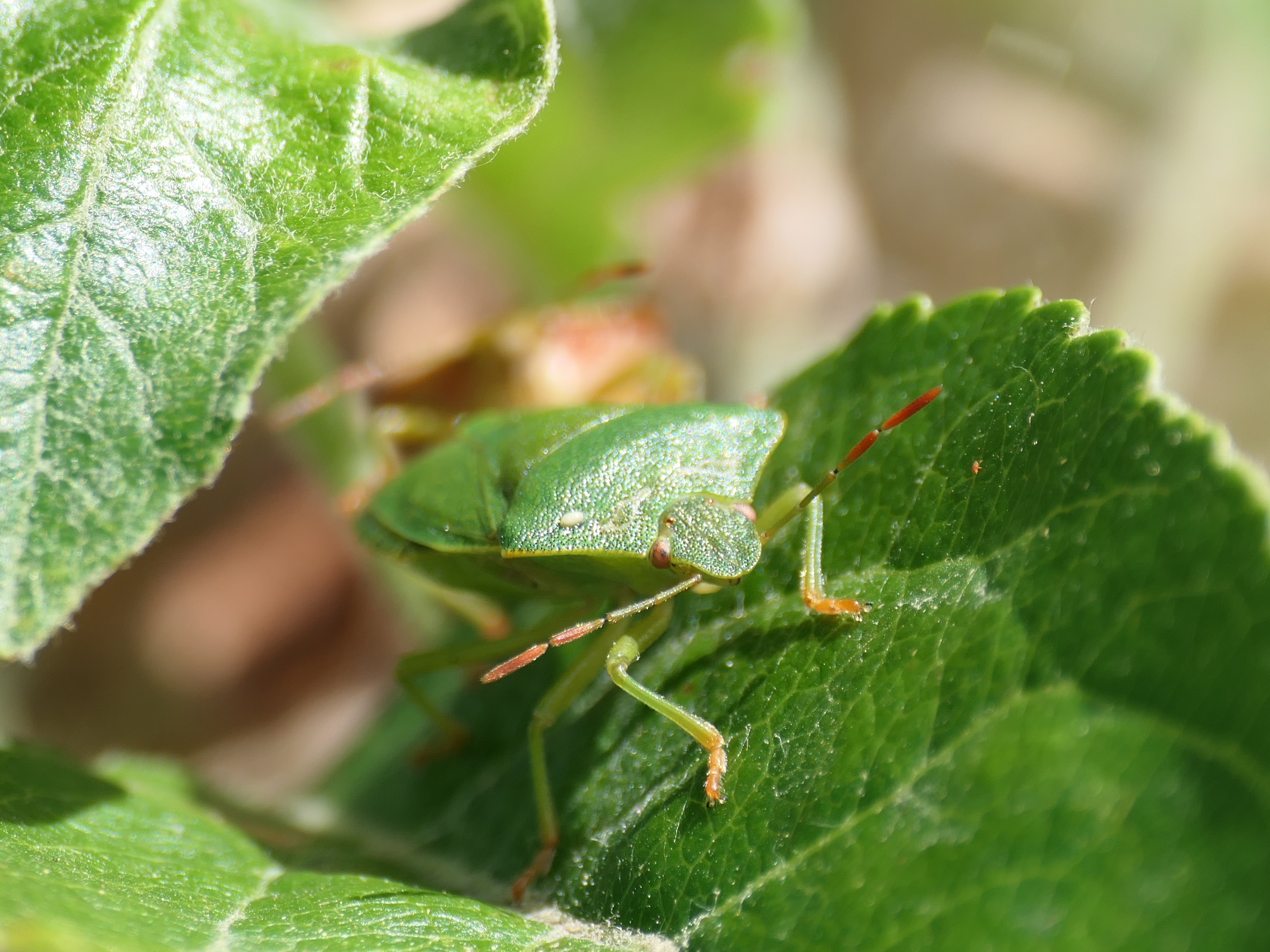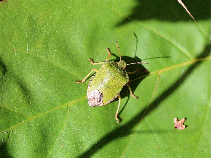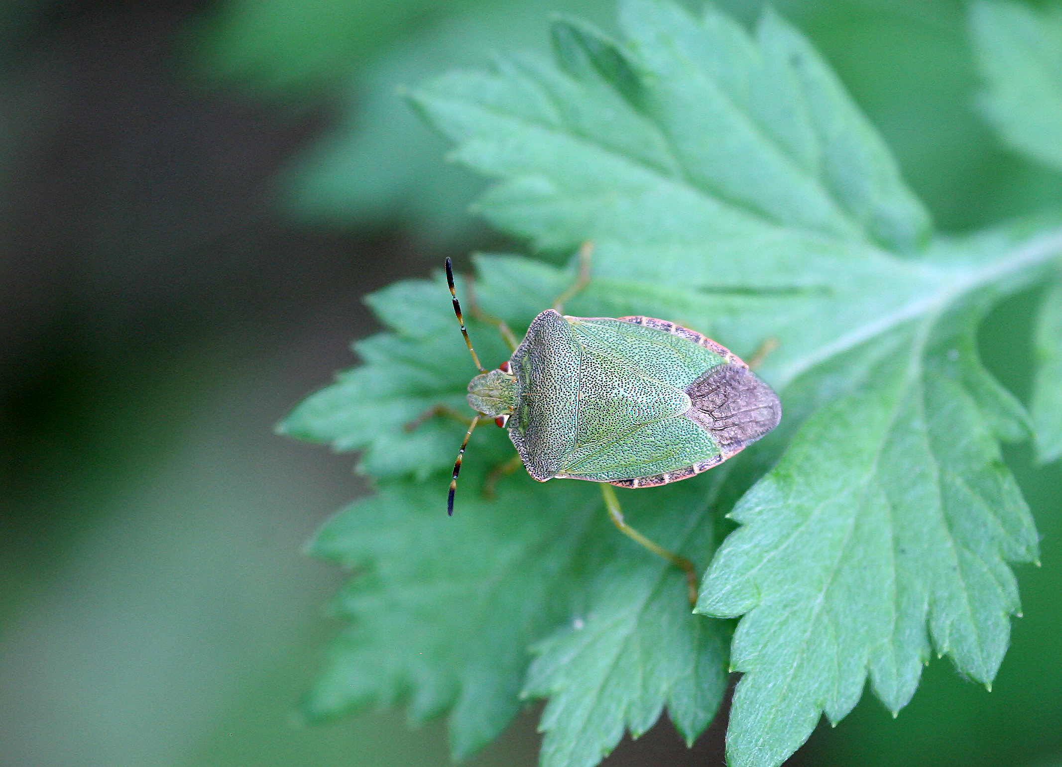 Grüne Stinkwanze (Palomena prasina (Linnaeus, 1761)), das zweite und dritte Fühlerglied sind annähernd gleich lang, im Unterschied zu Palomena viridissima, wo das dritte Fühlerglied kürzer als das zweite ist, am 1. Mai 2013 im Seifersdorfer Tal.