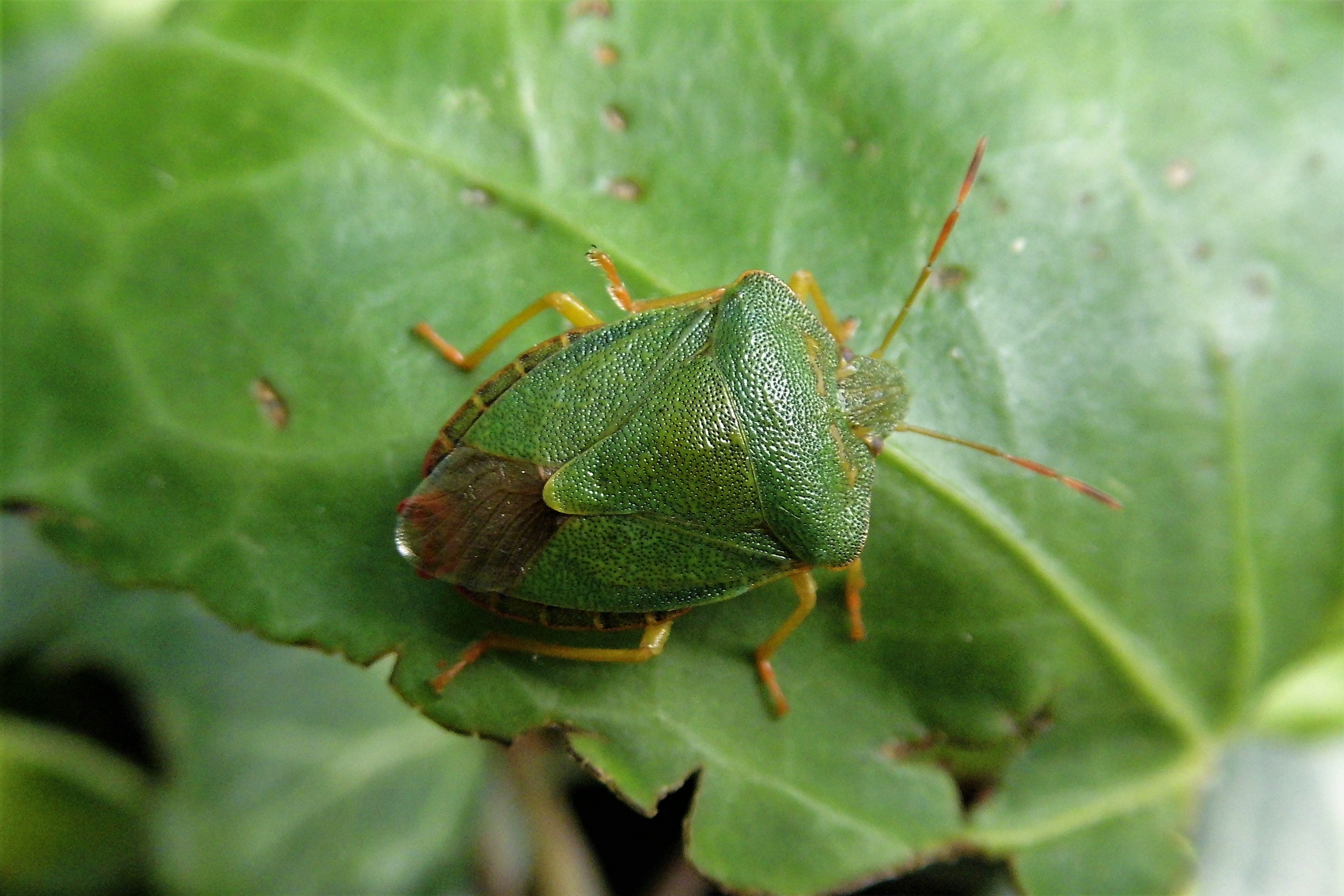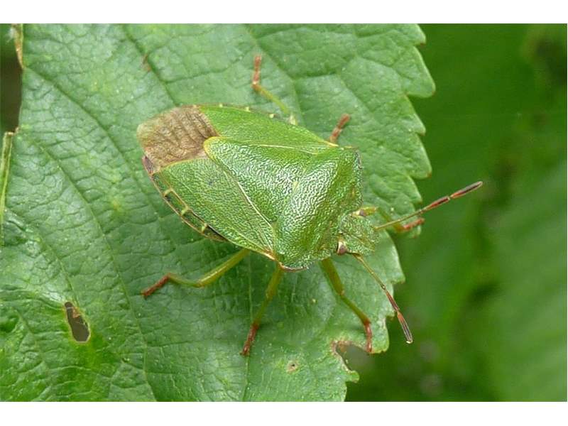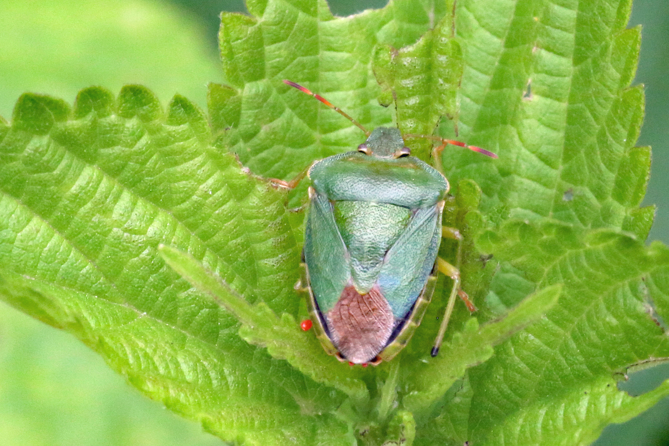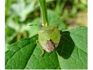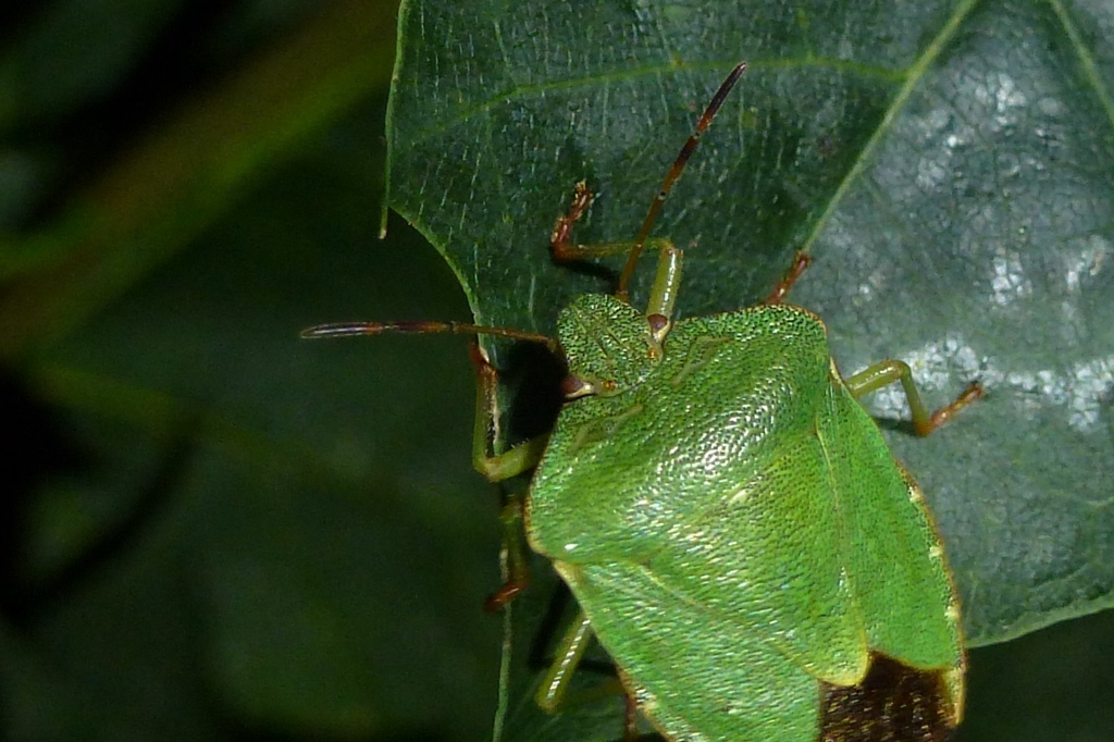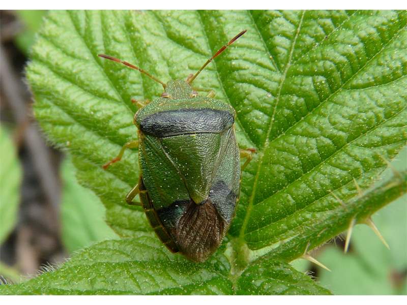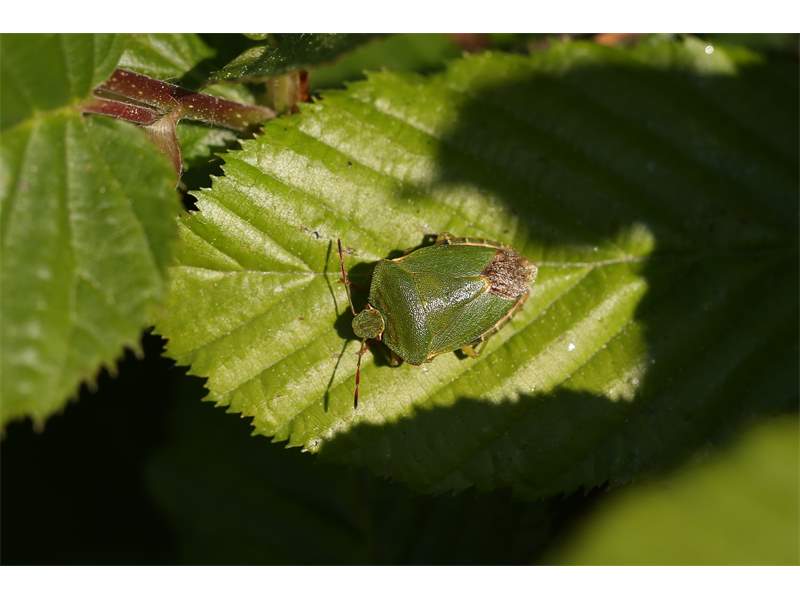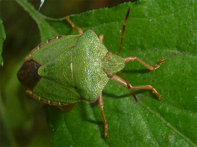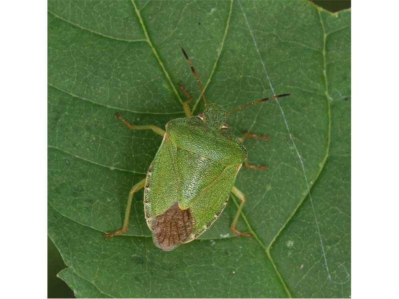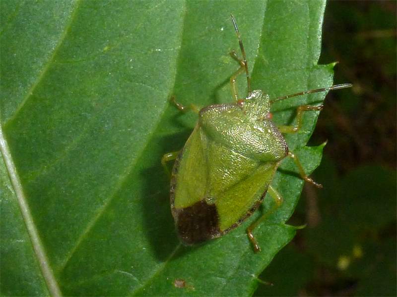 Grüne Stinkwanze (Palomena prasina (Linnaeus, 1761)), das zweite und dritte Fühlerglied sind annähernd gleich lang, im Unterschied zu Palomena viridissima, wo das dritte Fühlerglied kürzer als das zweite ist, am 1. Mai 2013 im Seifersdorfer Tal.