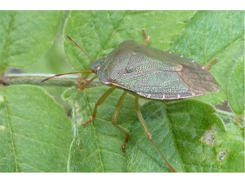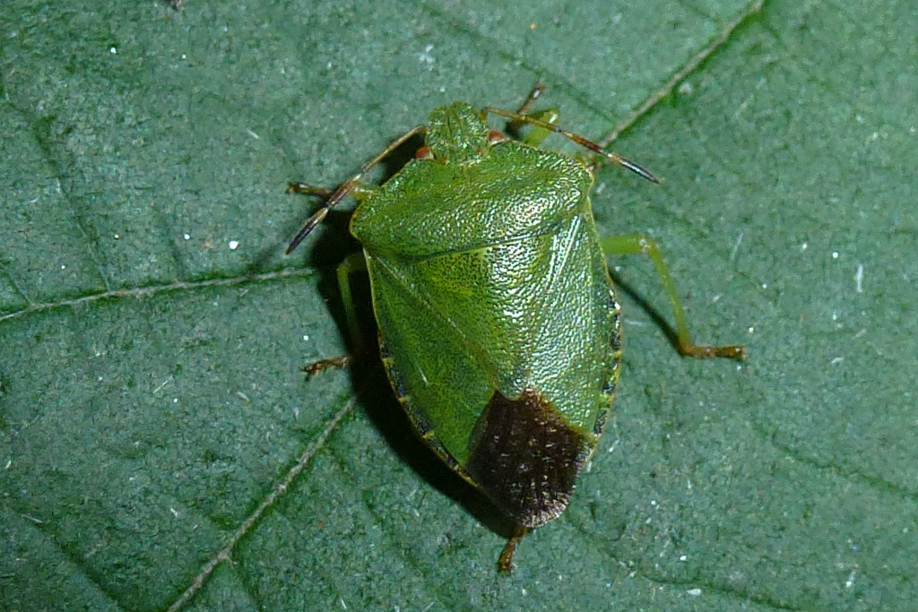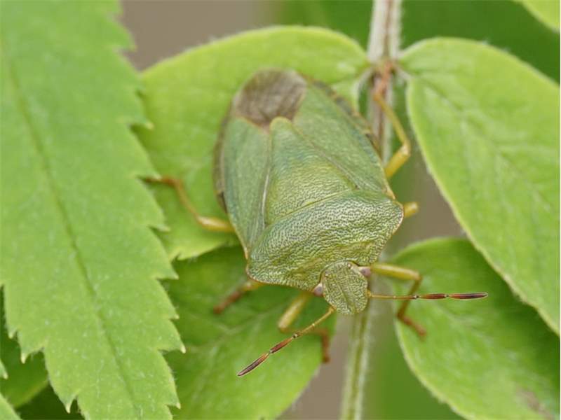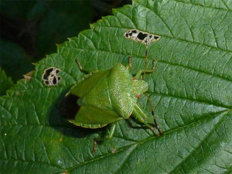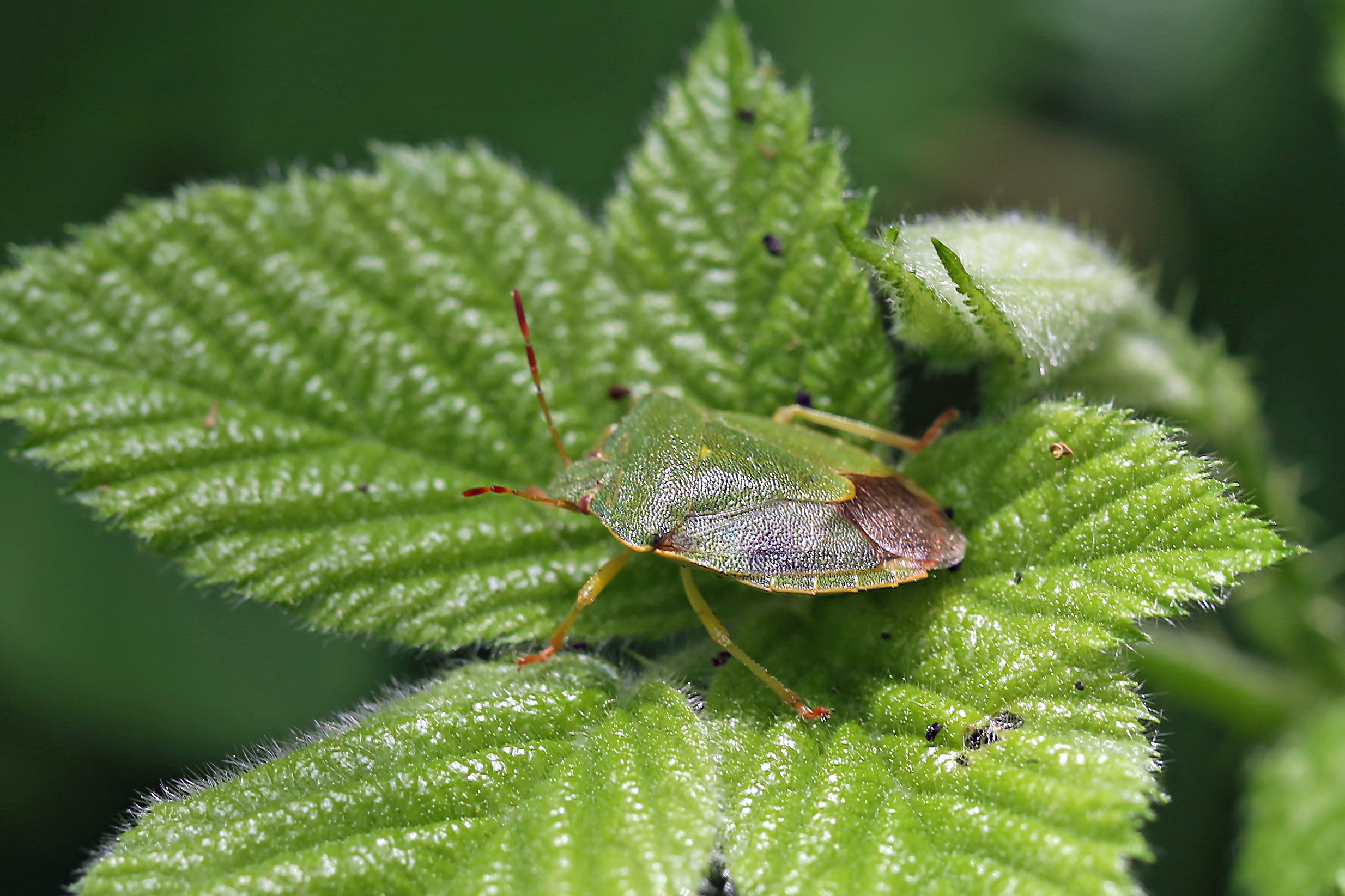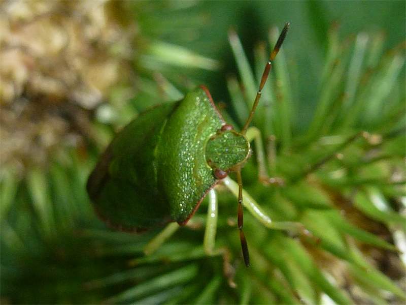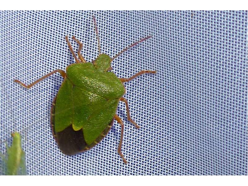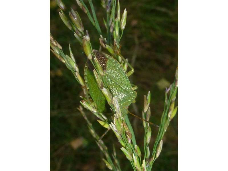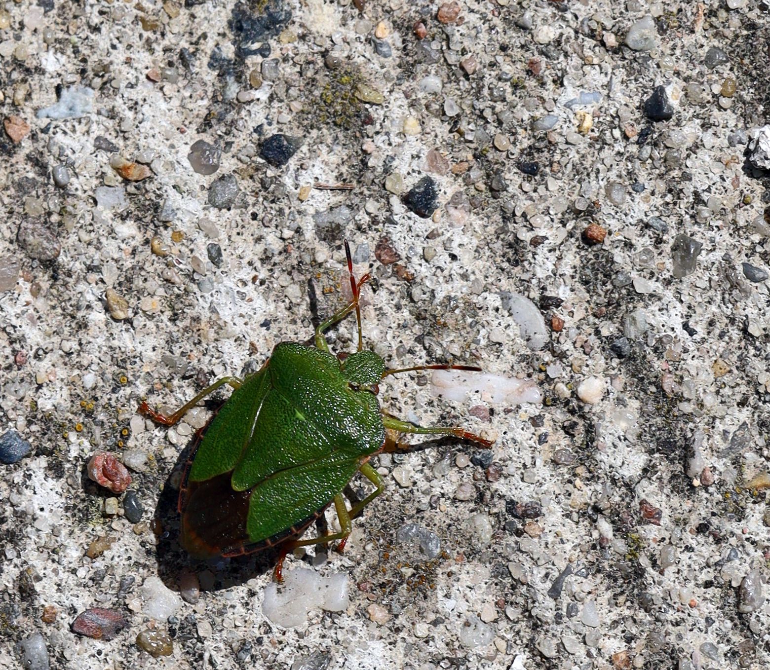 Grüne Stinkwanze (Palomena prasina (Linnaeus, 1761)), das zweite und dritte Fühlerglied sind annähernd gleich lang, im Unterschied zu Palomena viridissima, wo das dritte Fühlerglied kürzer als das zweite ist, am 1. Mai 2013 im Seifersdorfer Tal.