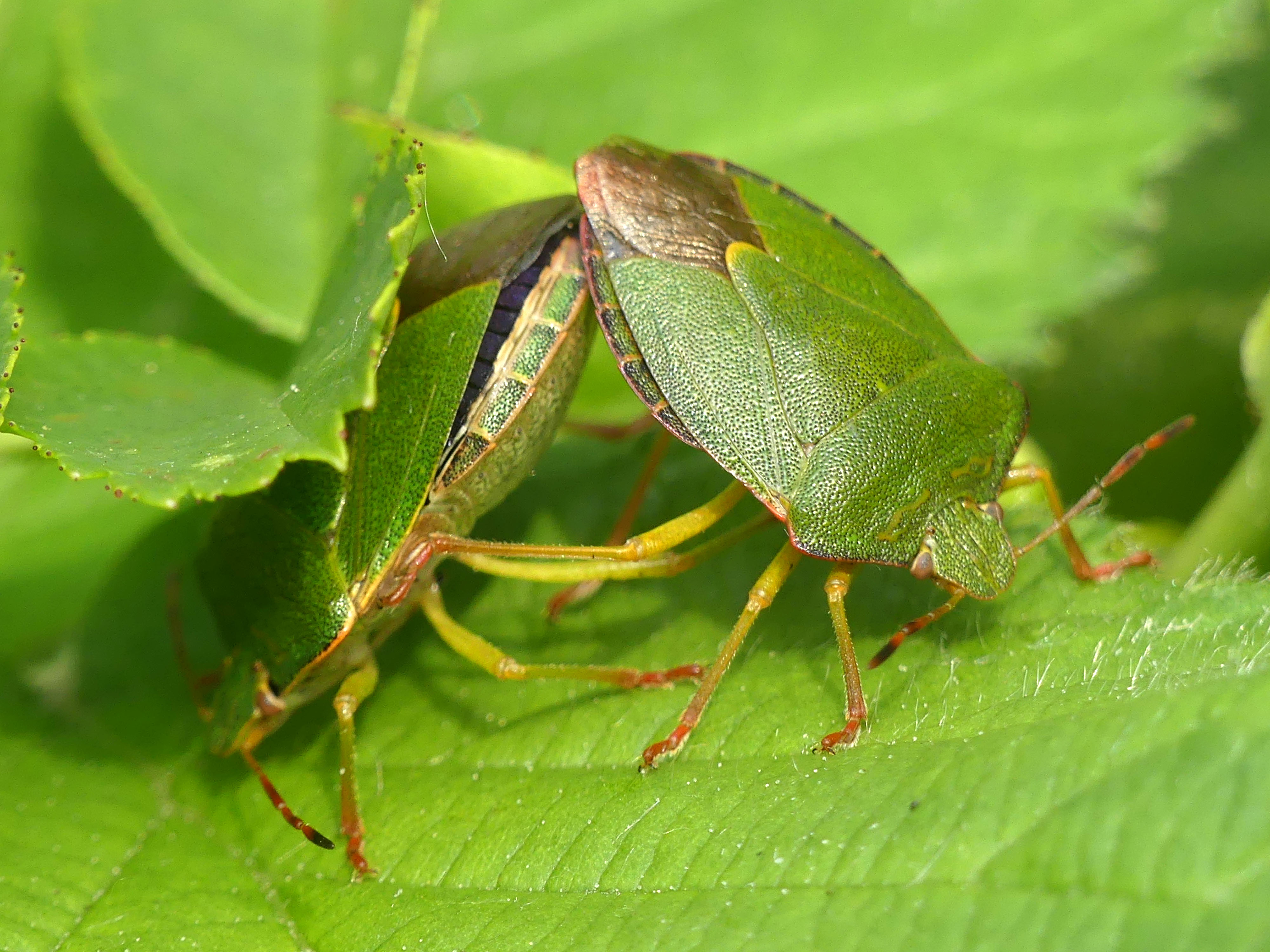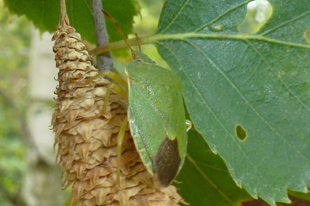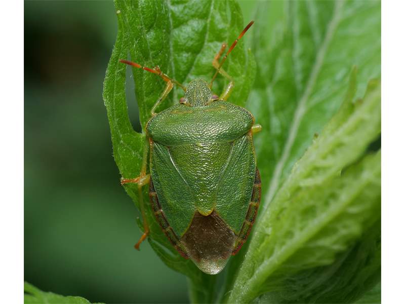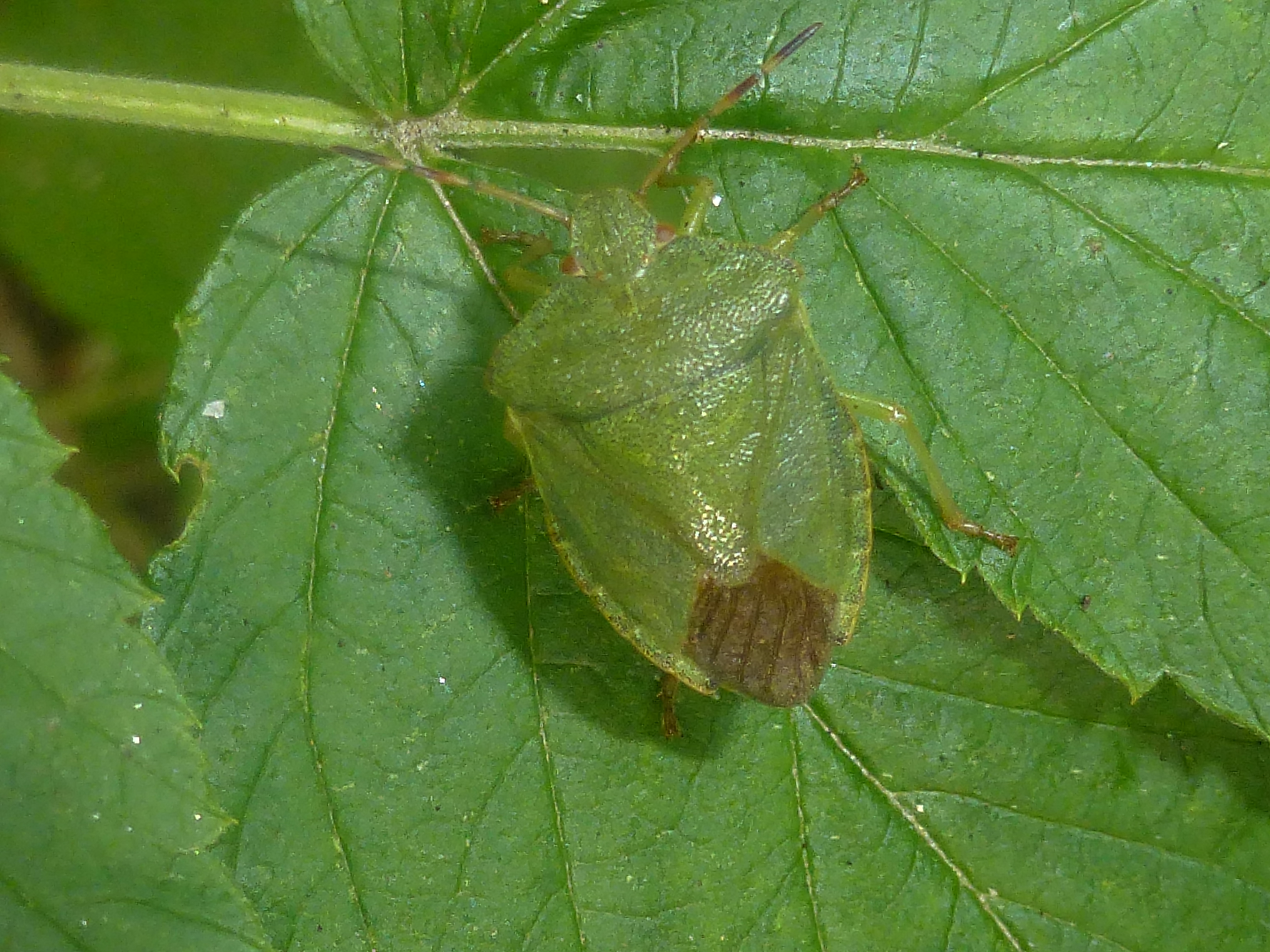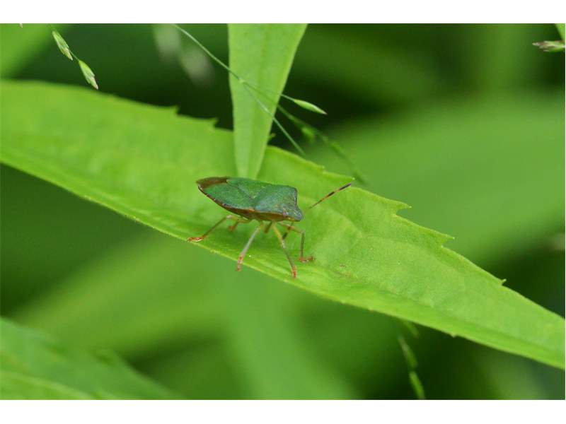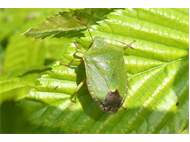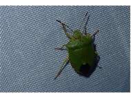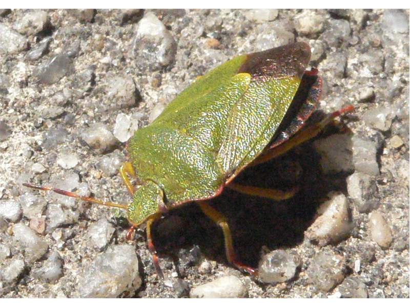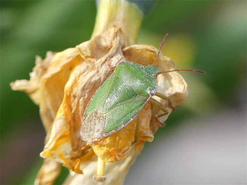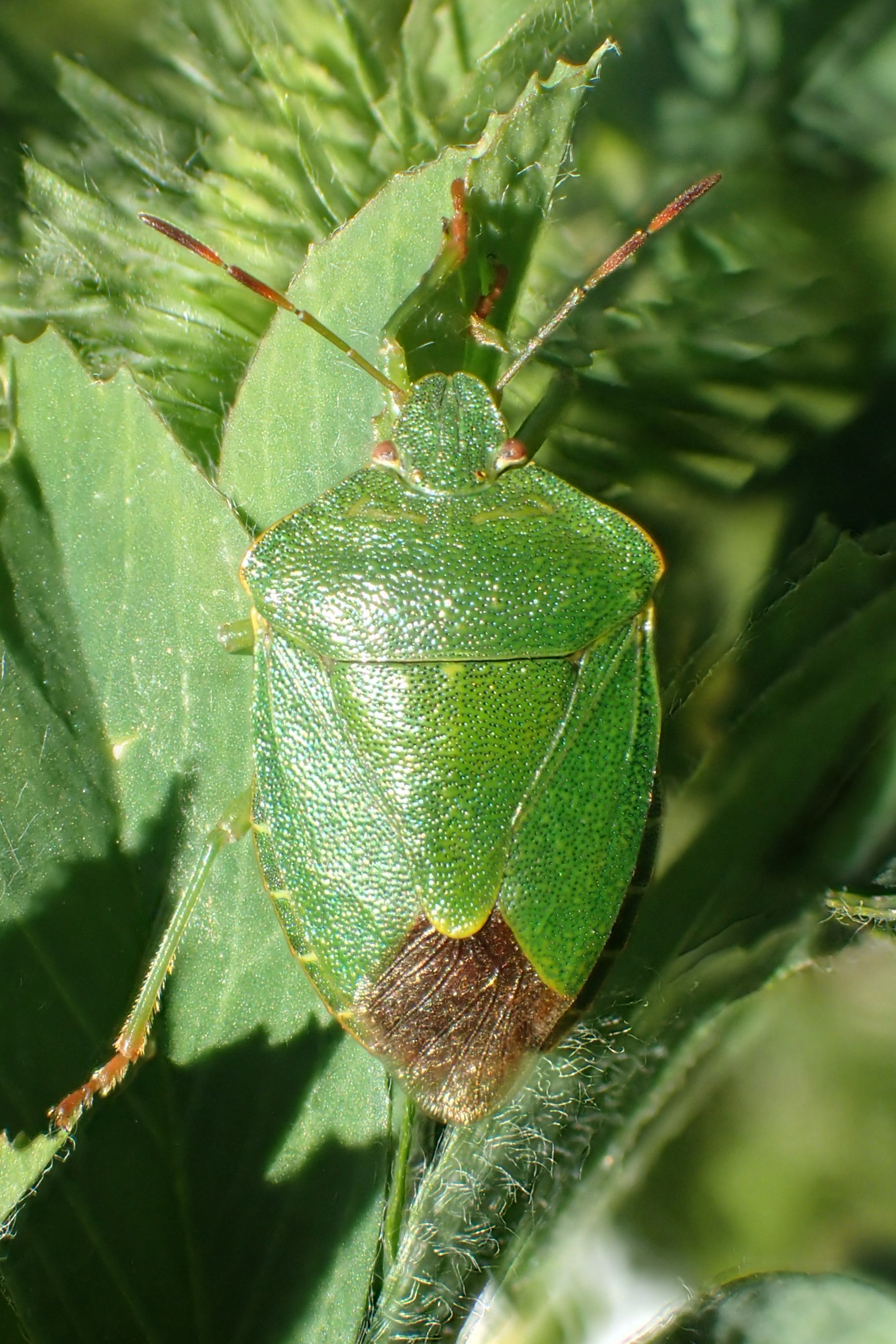 Grüne Stinkwanze (Palomena prasina (Linnaeus, 1761)), das zweite und dritte Fühlerglied sind annähernd gleich lang, im Unterschied zu Palomena viridissima, wo das dritte Fühlerglied kürzer als das zweite ist, am 1. Mai 2013 im Seifersdorfer Tal.
