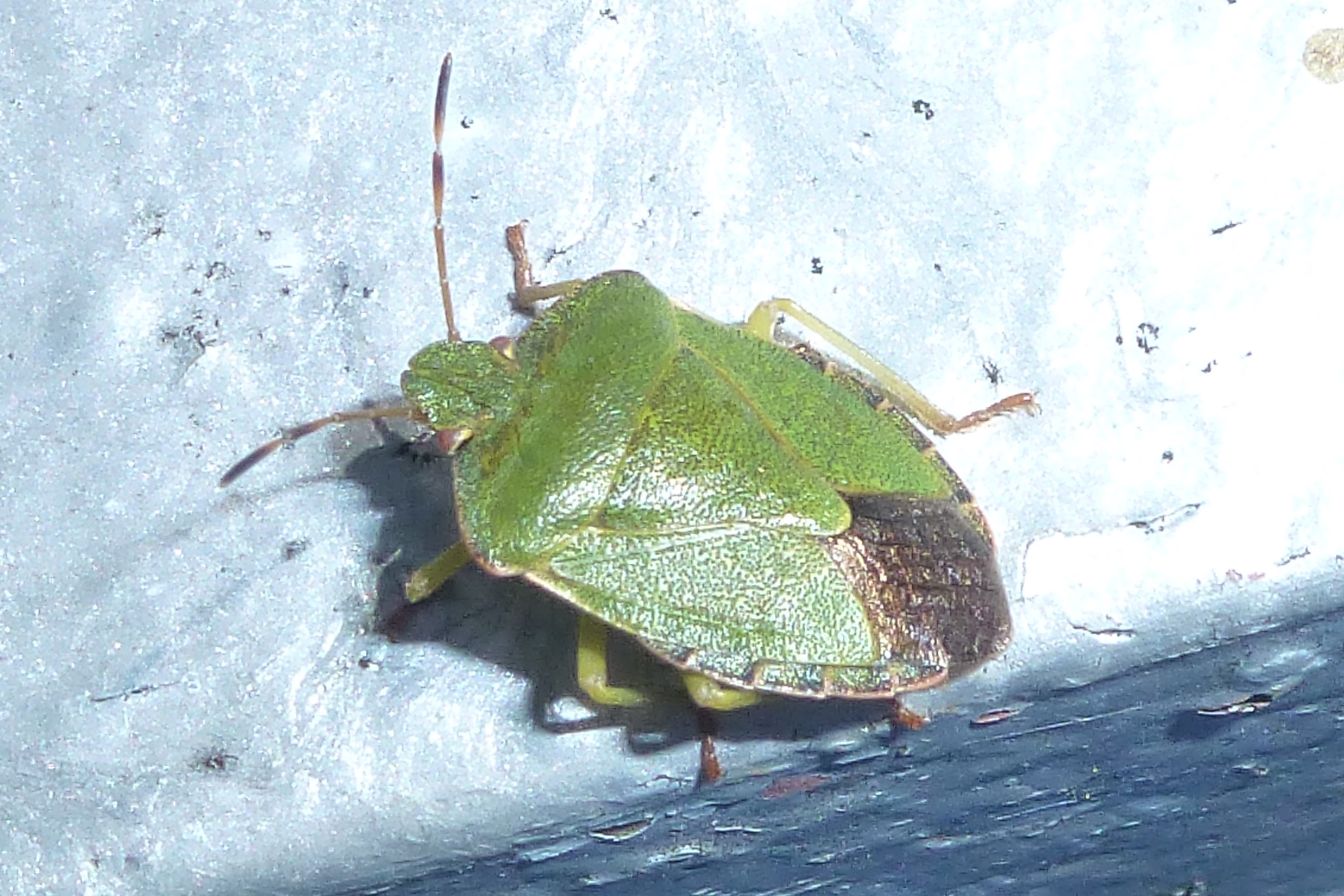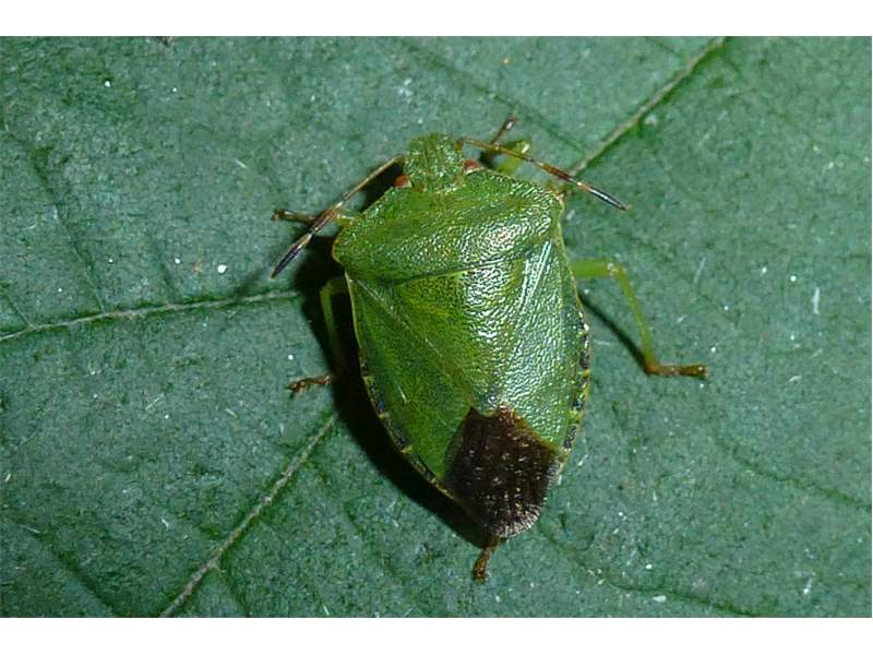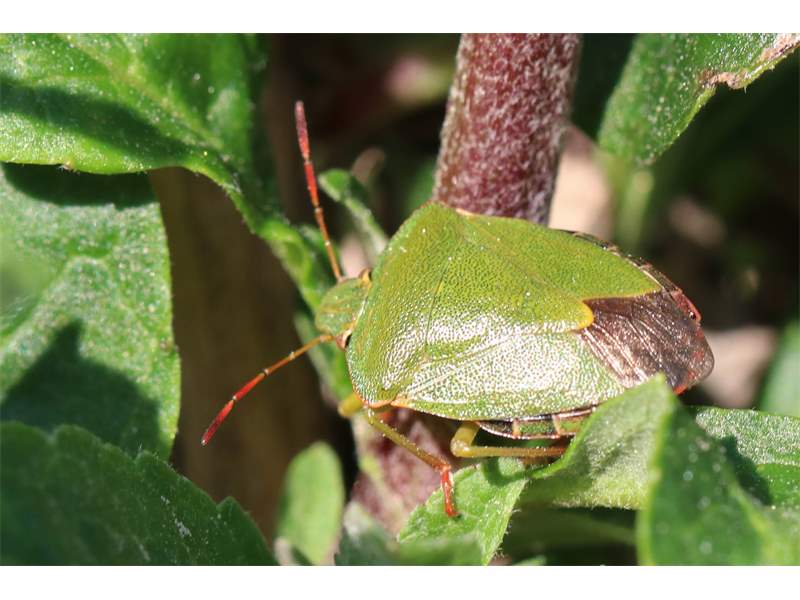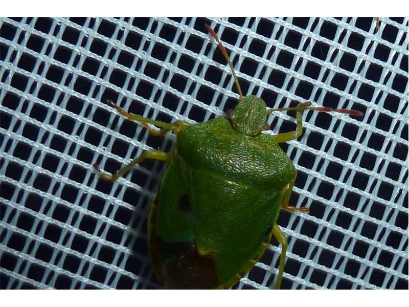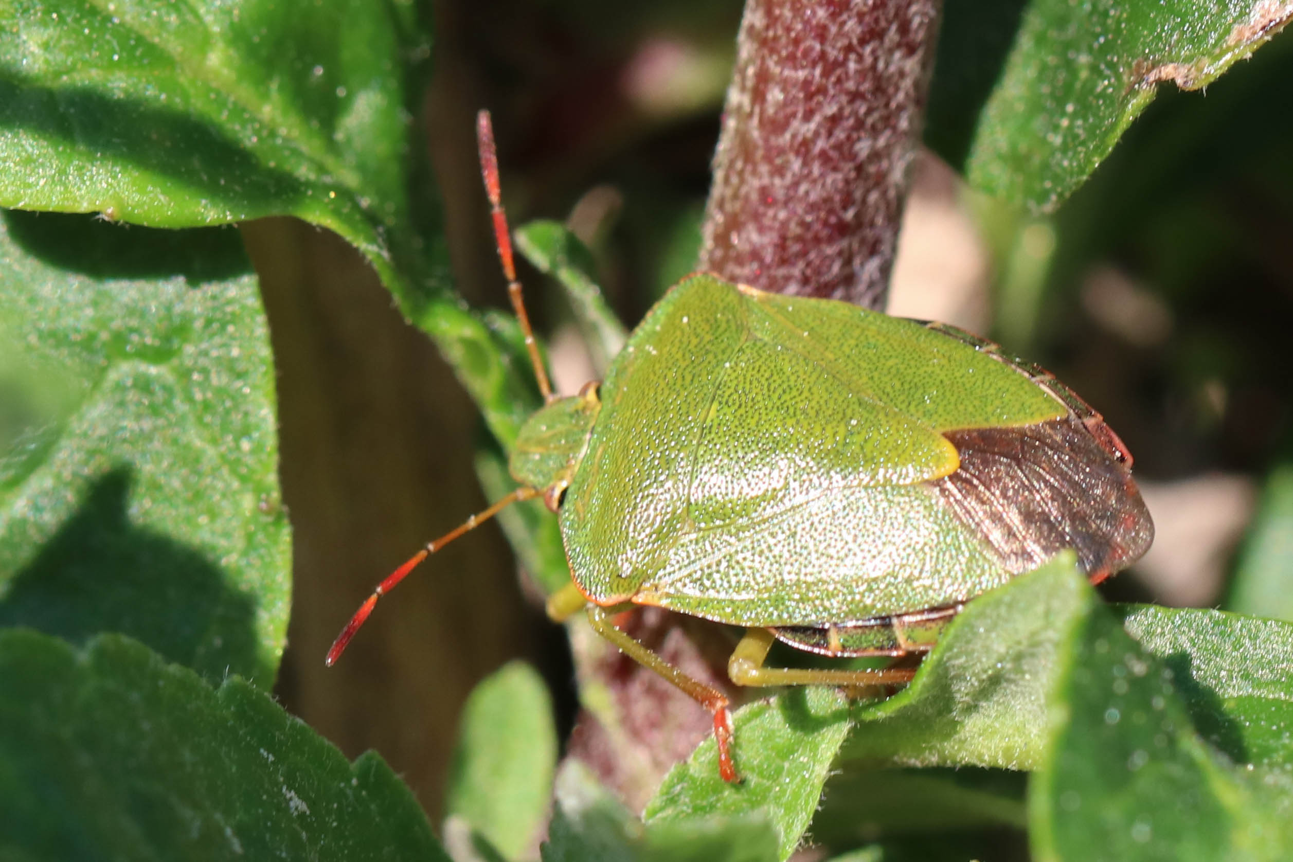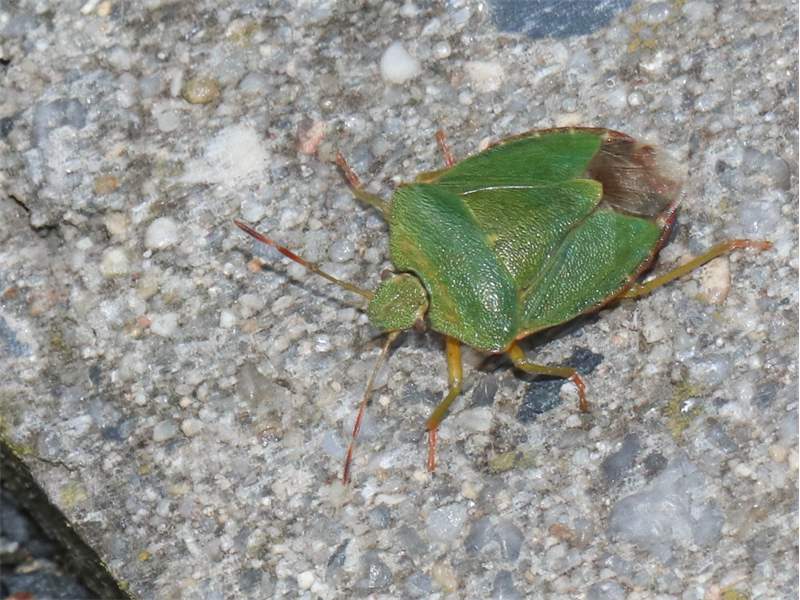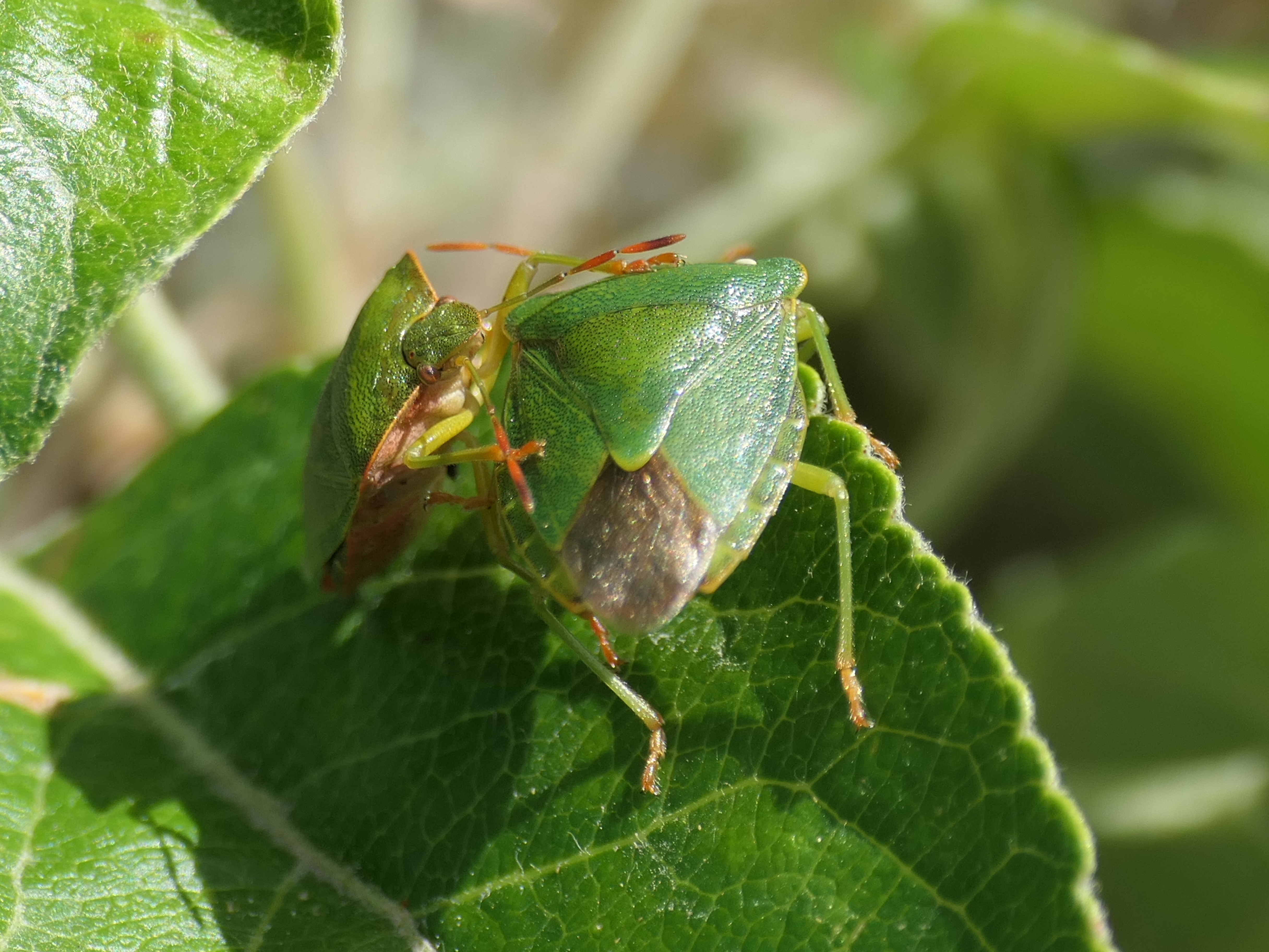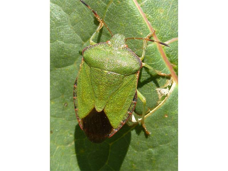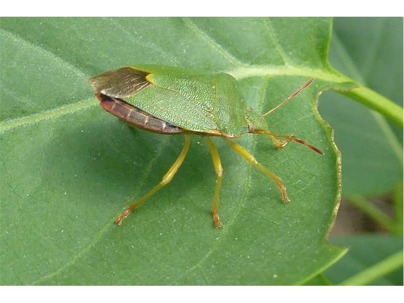 Grüne Stinkwanze (Palomena prasina (Linnaeus, 1761)), das zweite und dritte Fühlerglied sind annähernd gleich lang, im Unterschied zu Palomena viridissima, wo das dritte Fühlerglied kürzer als das zweite ist, am 1. Mai 2013 im Seifersdorfer Tal.
