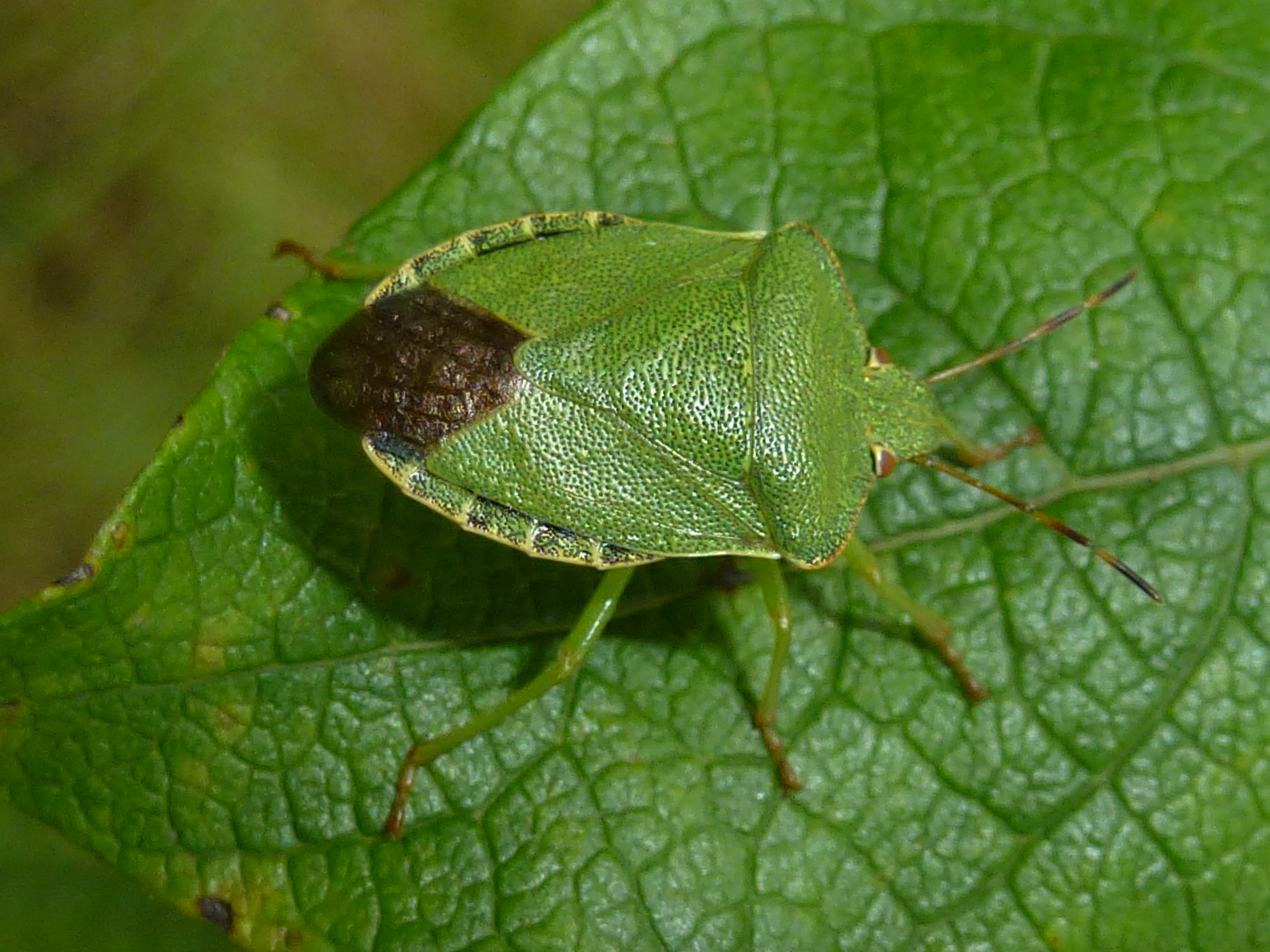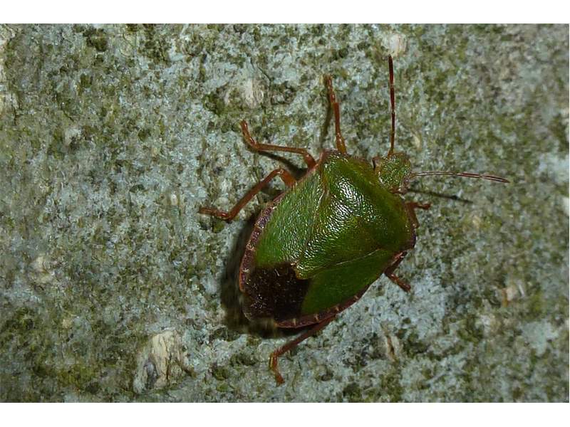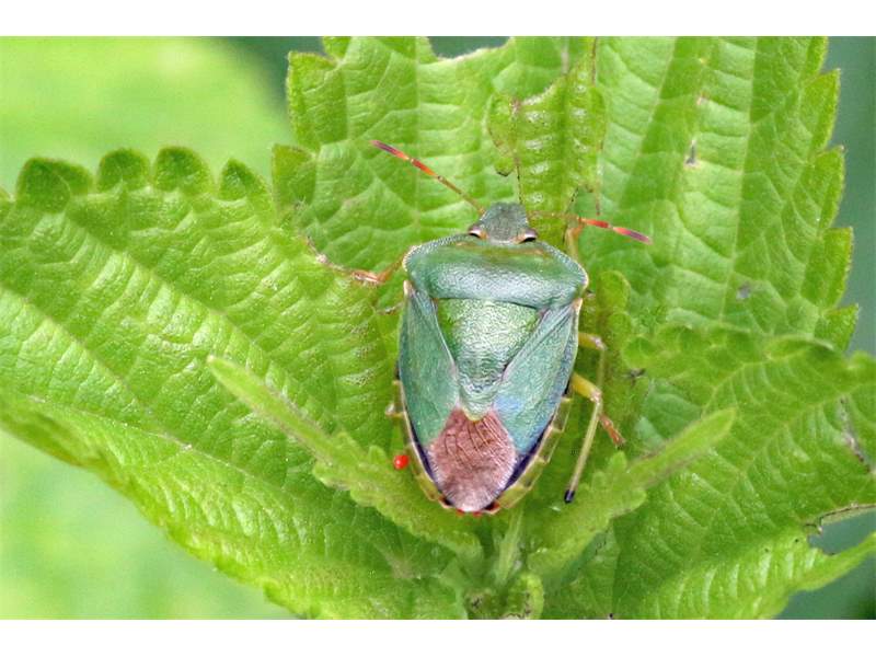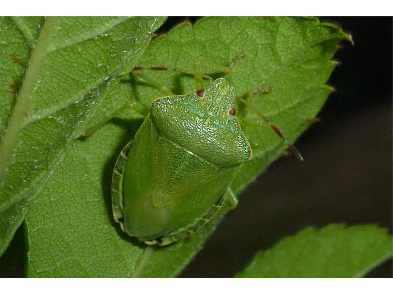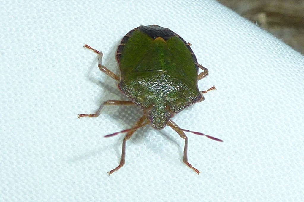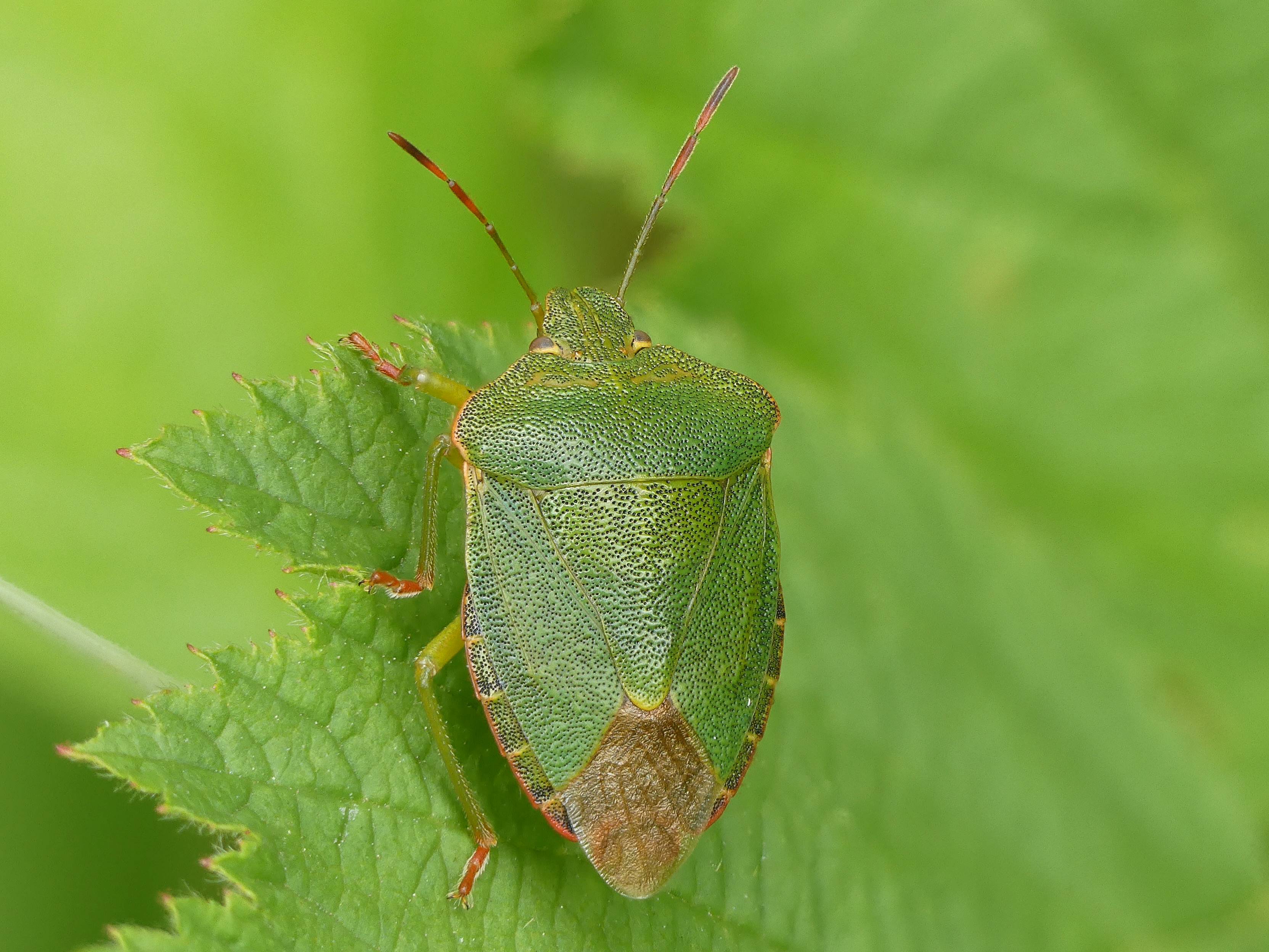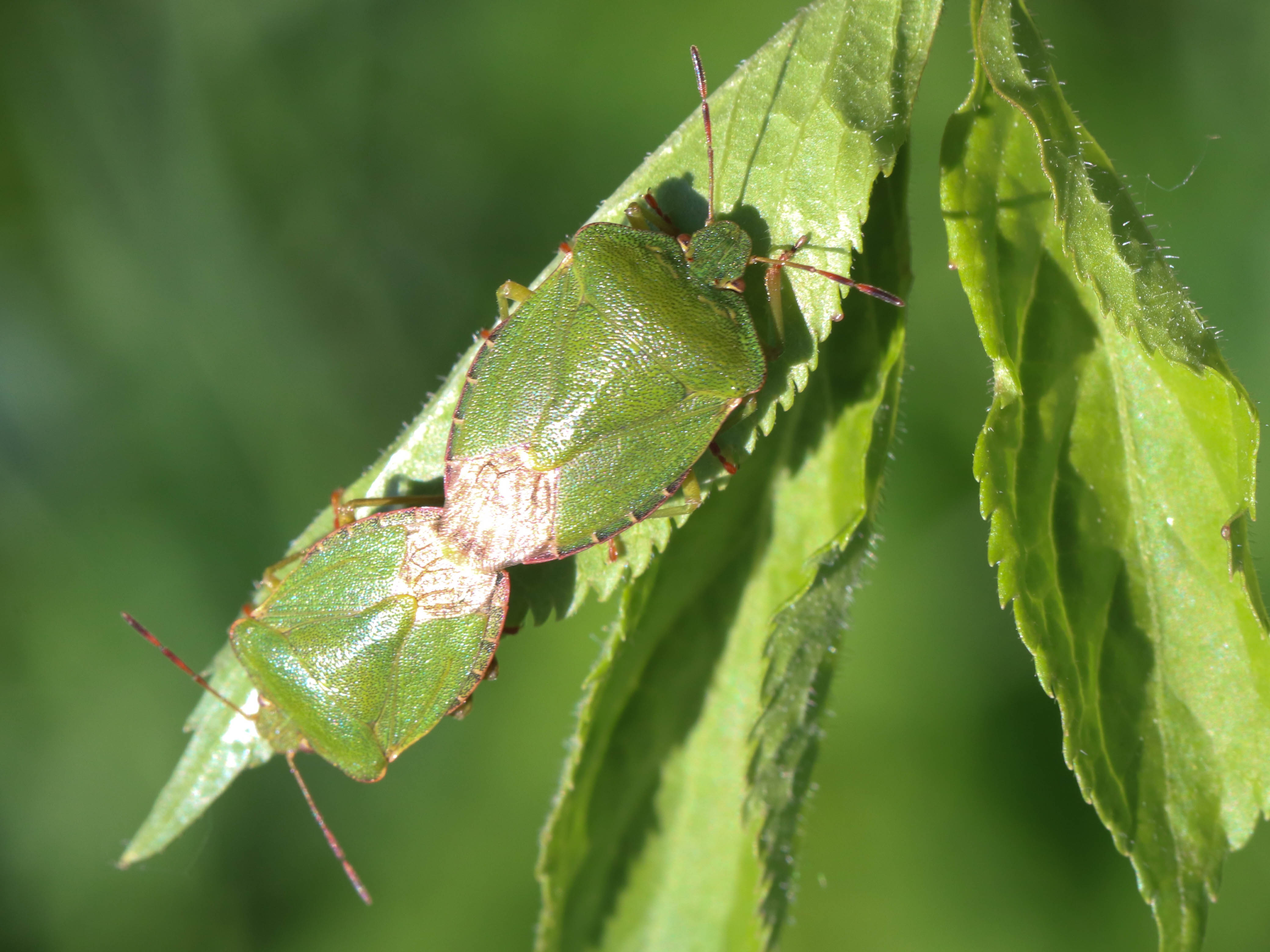 Grüne Stinkwanze (Palomena prasina (Linnaeus, 1761)), das zweite und dritte Fühlerglied sind annähernd gleich lang, im Unterschied zu Palomena viridissima, wo das dritte Fühlerglied kürzer als das zweite ist, am 1. Mai 2013 im Seifersdorfer Tal.
