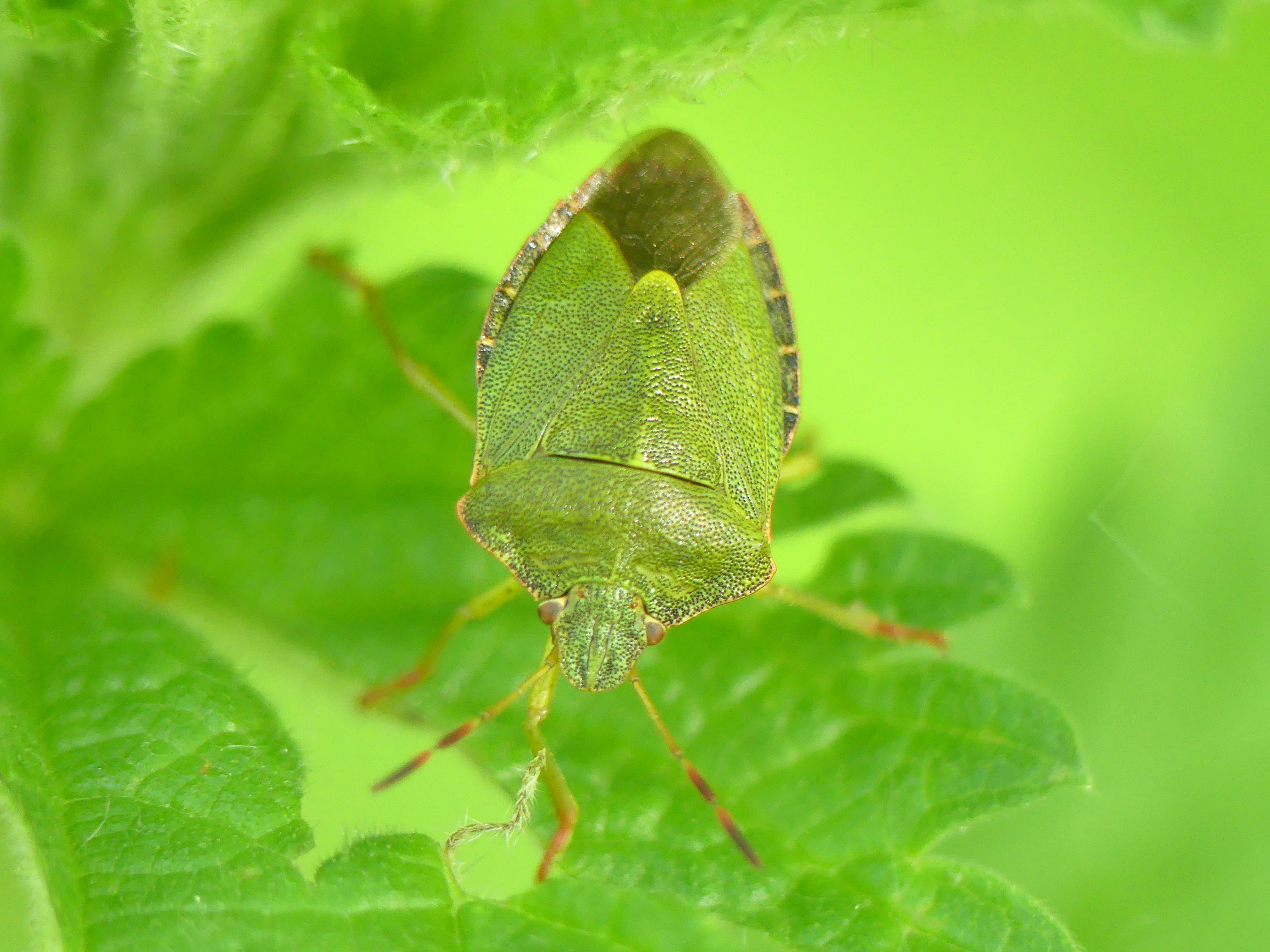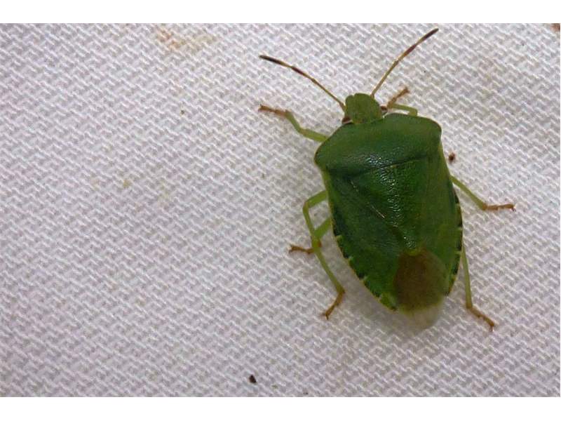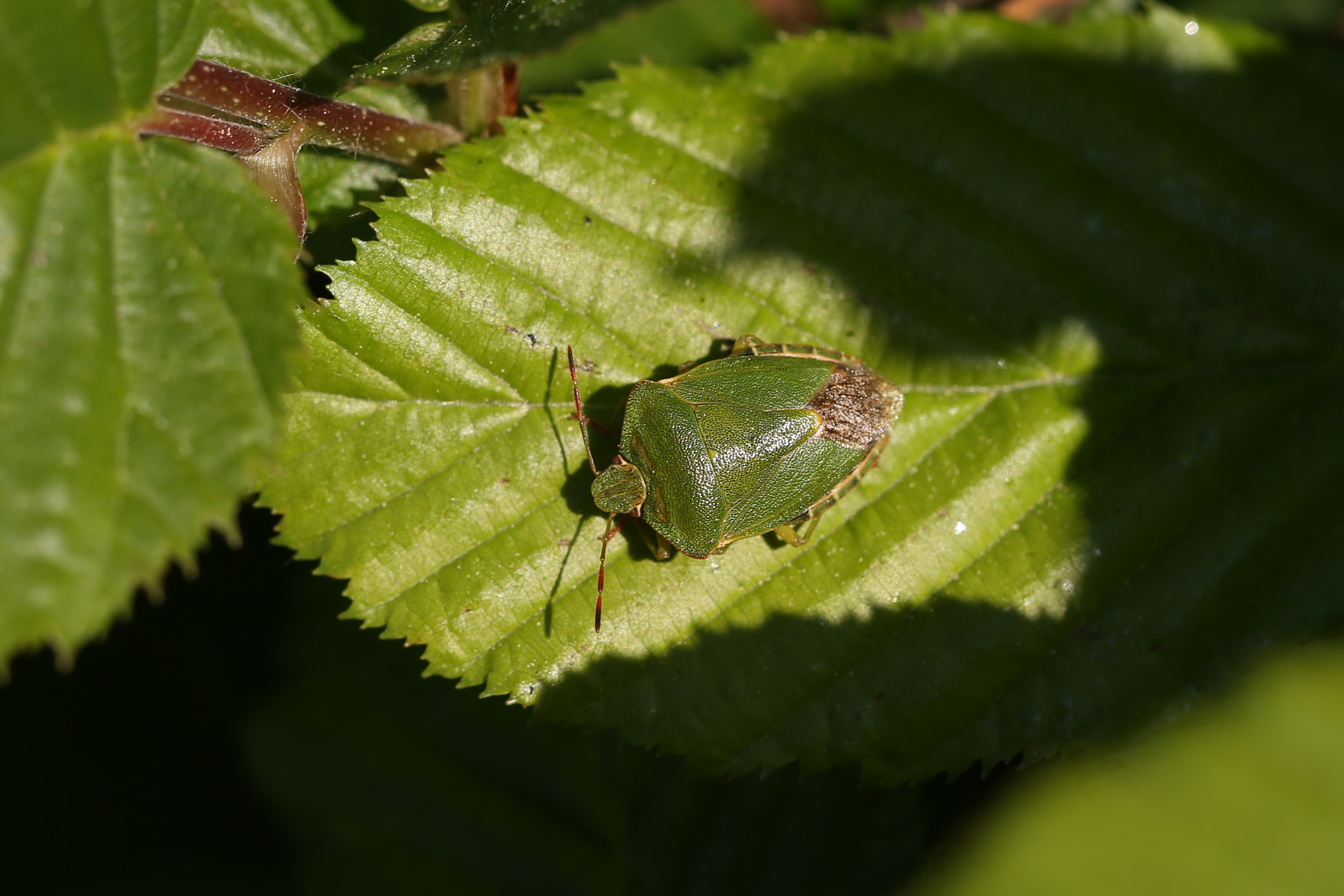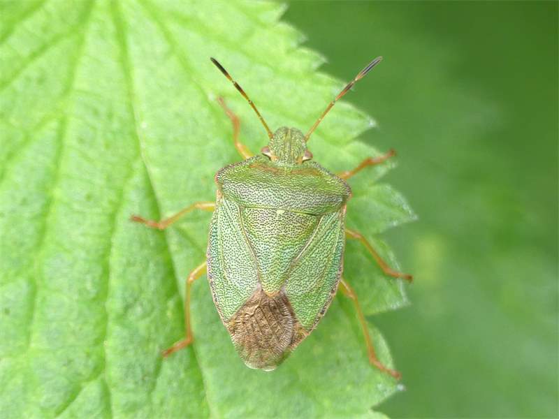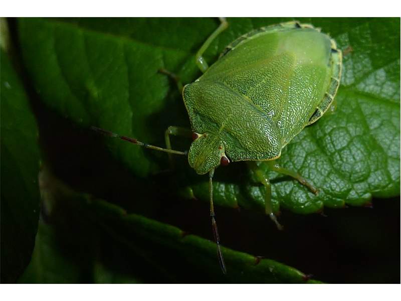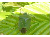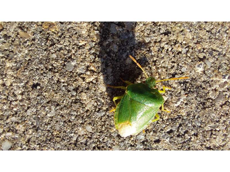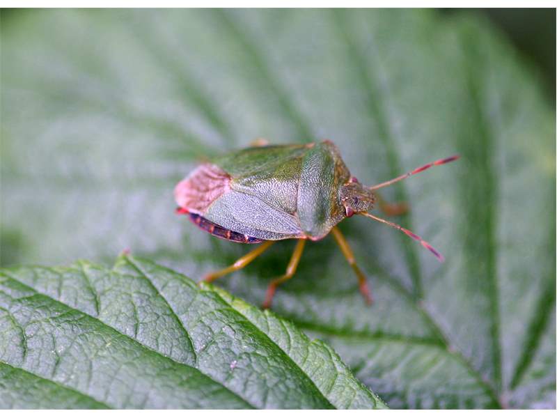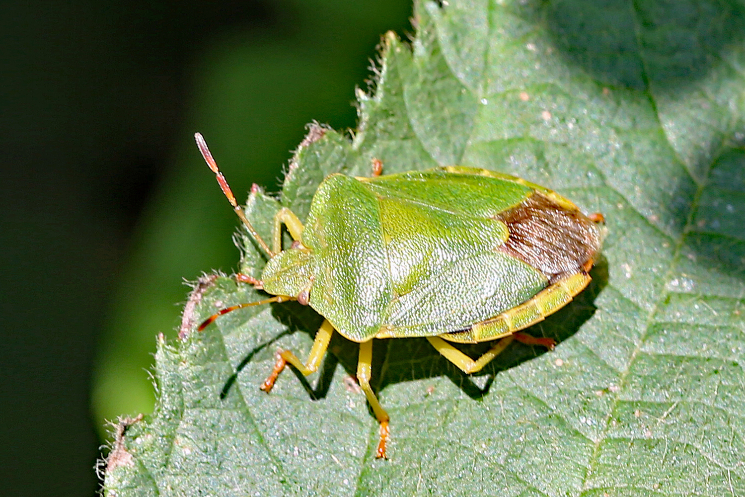 Grüne Stinkwanze (Palomena prasina (Linnaeus, 1761)), das zweite und dritte Fühlerglied sind annähernd gleich lang, im Unterschied zu Palomena viridissima, wo das dritte Fühlerglied kürzer als das zweite ist, am 1. Mai 2013 im Seifersdorfer Tal.
