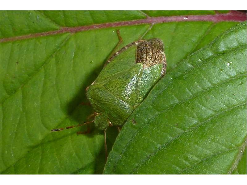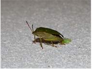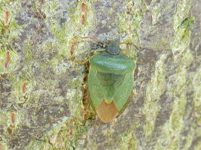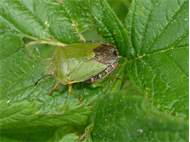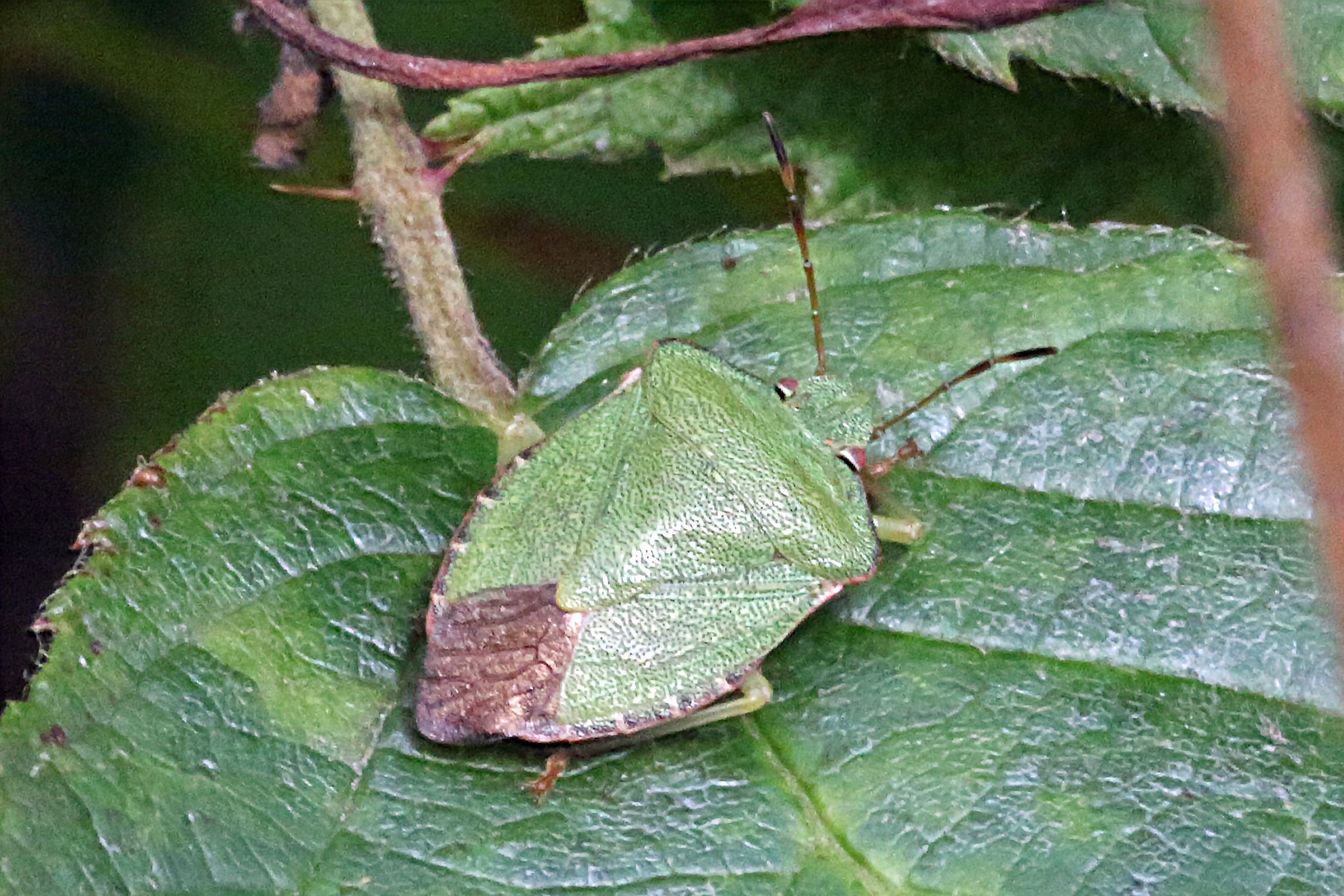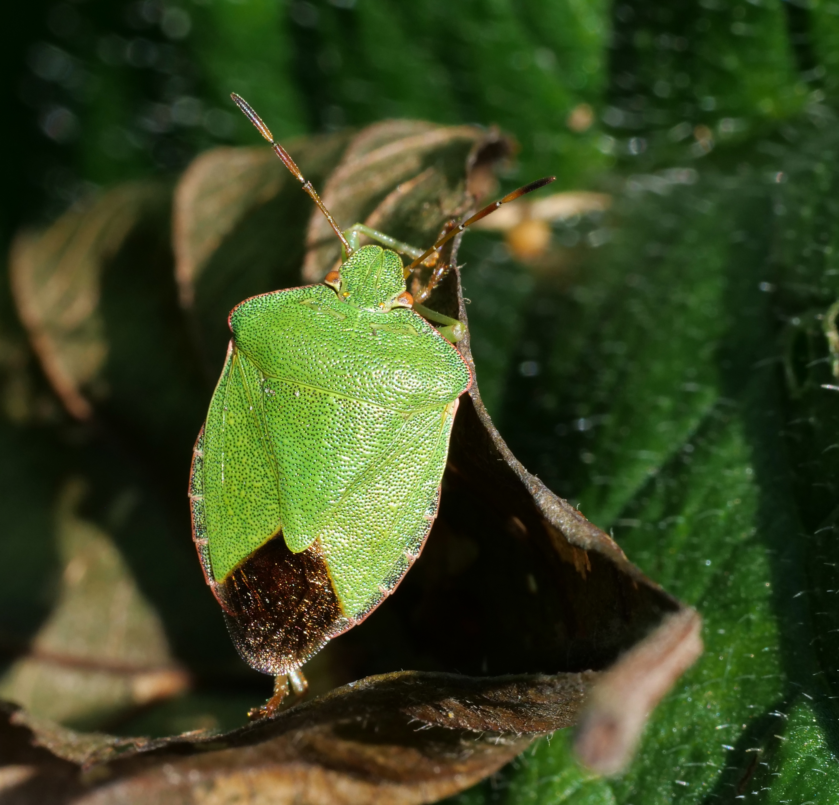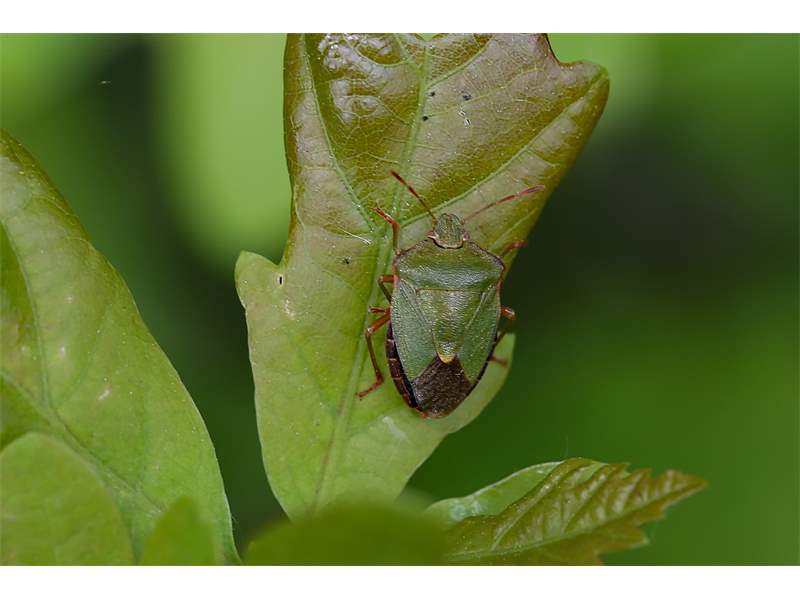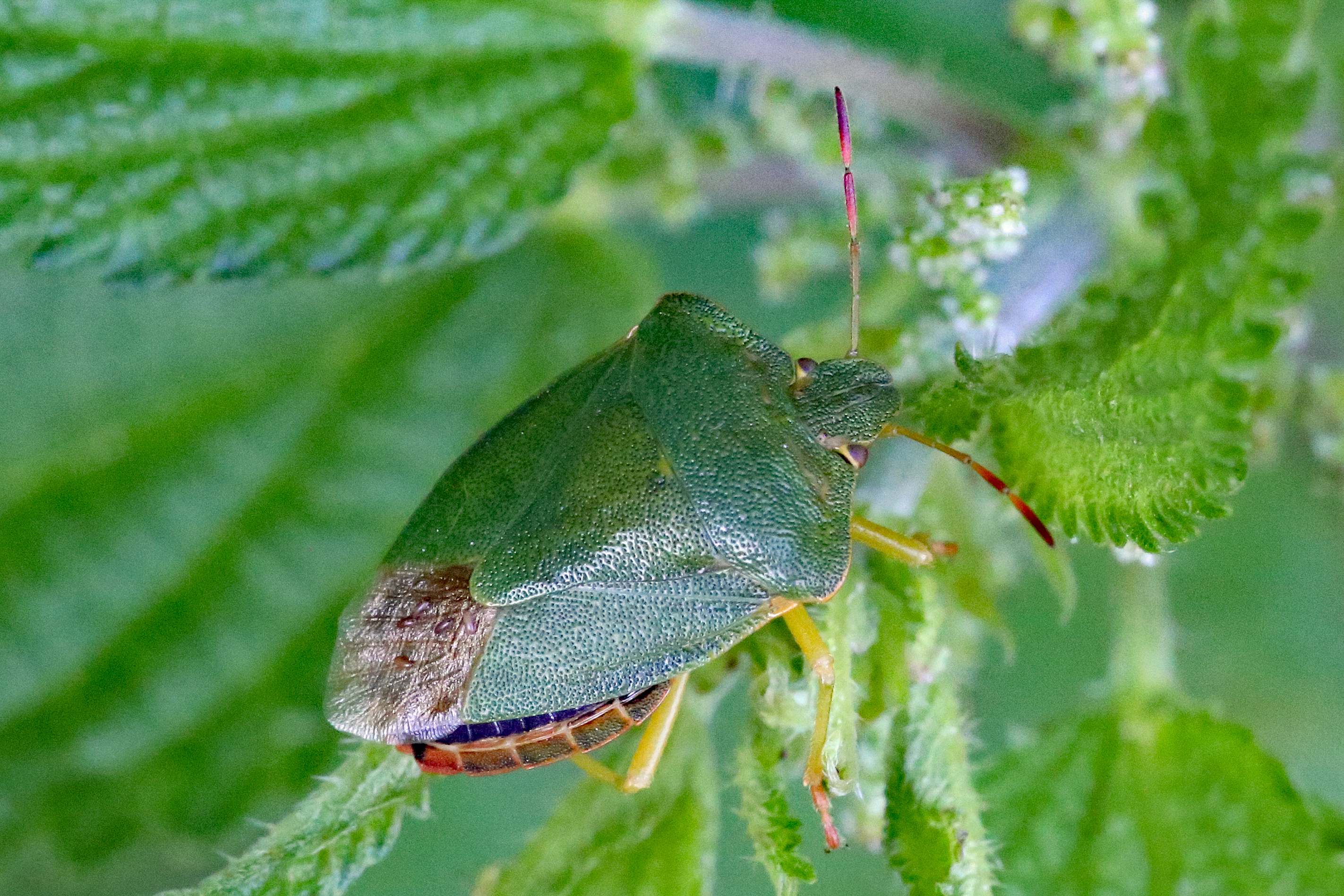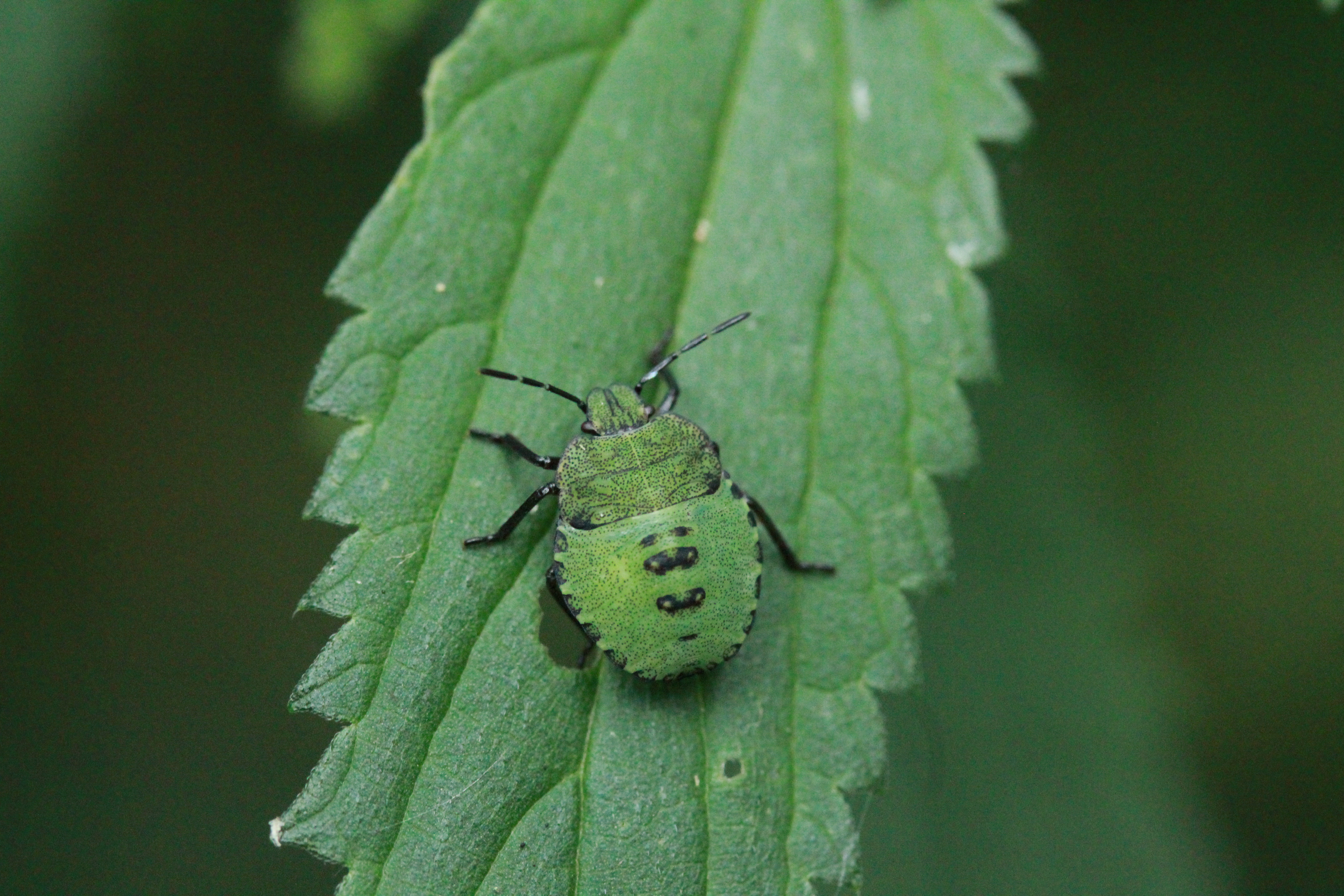 Grüne Stinkwanze (Palomena prasina (Linnaeus, 1761)), das zweite und dritte Fühlerglied sind annähernd gleich lang, im Unterschied zu Palomena viridissima, wo das dritte Fühlerglied kürzer als das zweite ist, am 1. Mai 2013 im Seifersdorfer Tal.