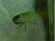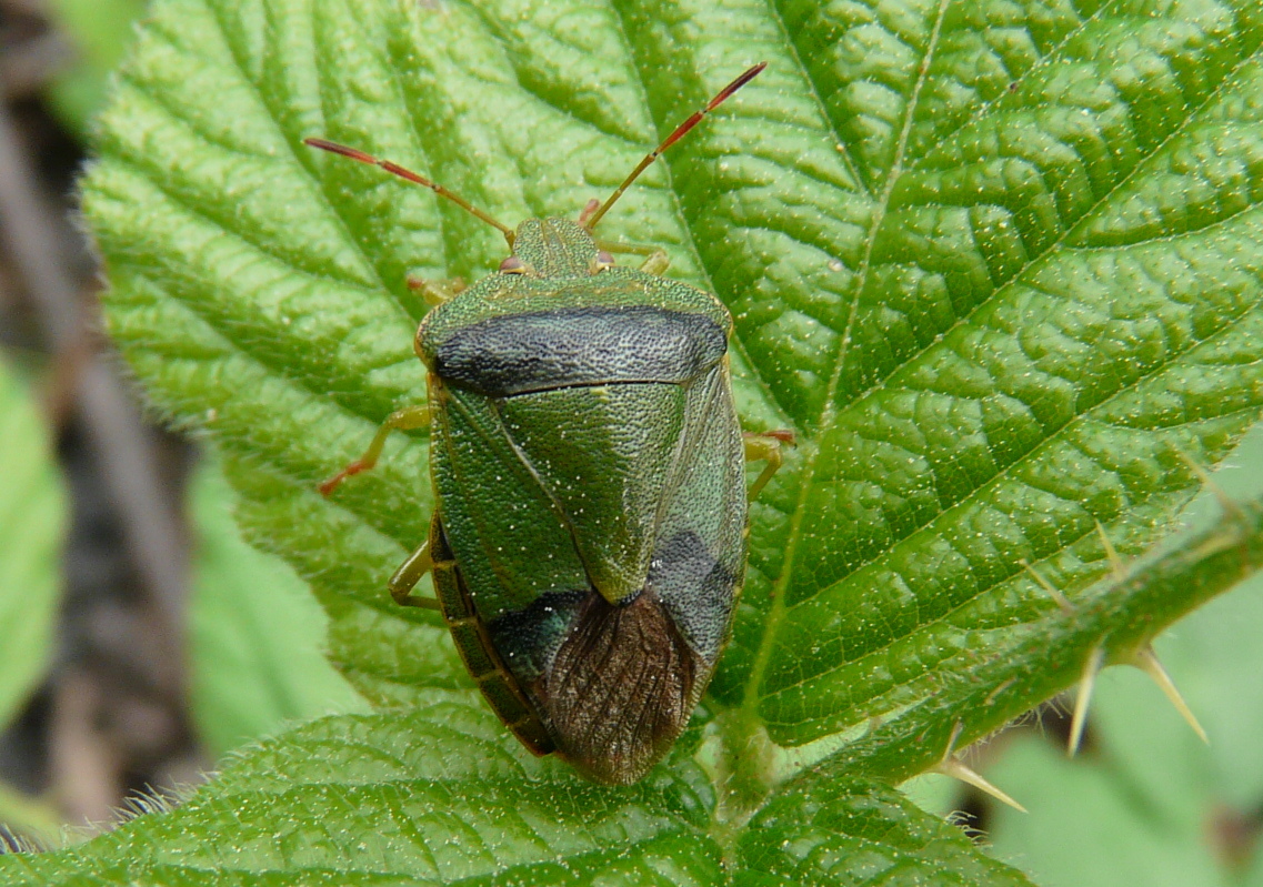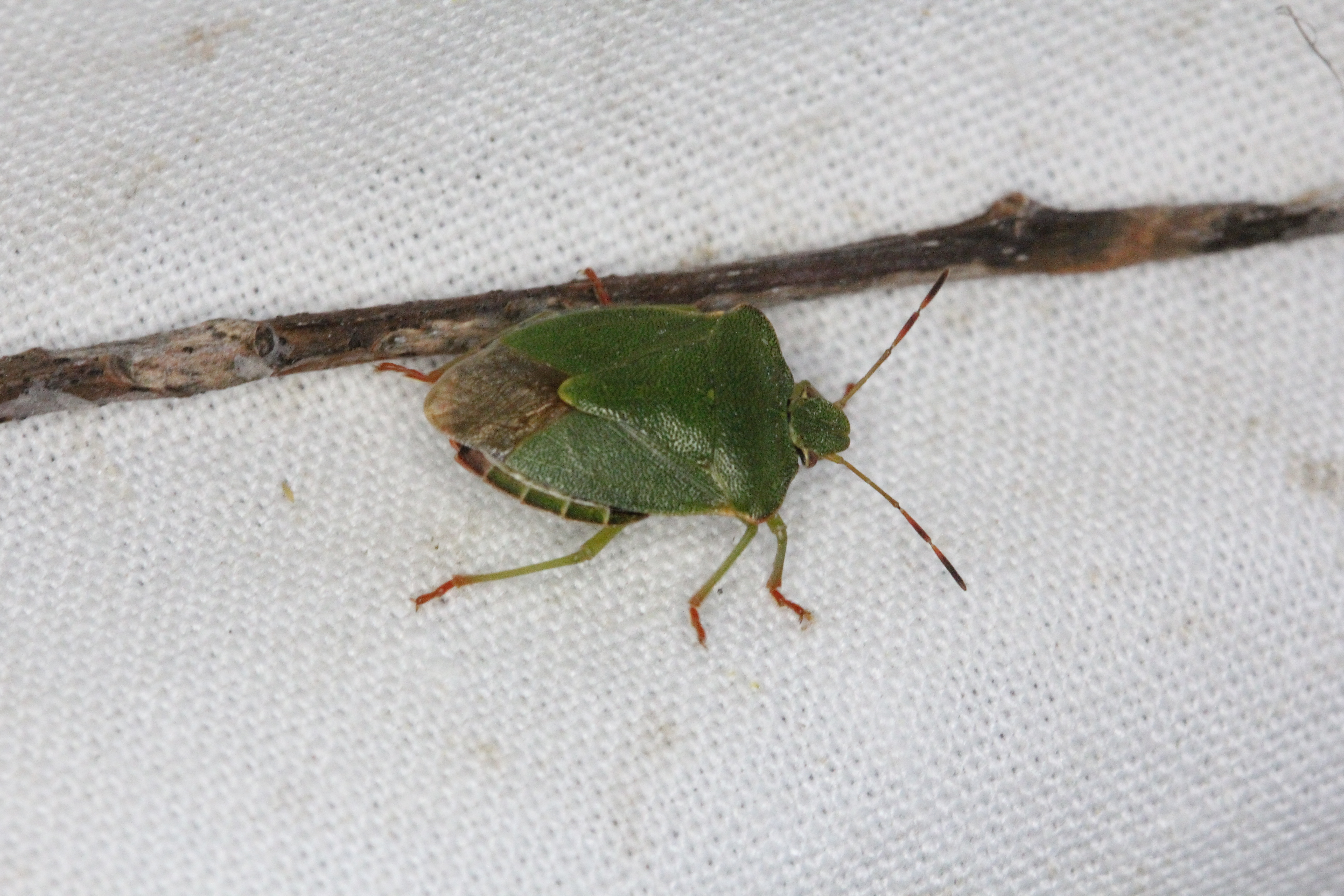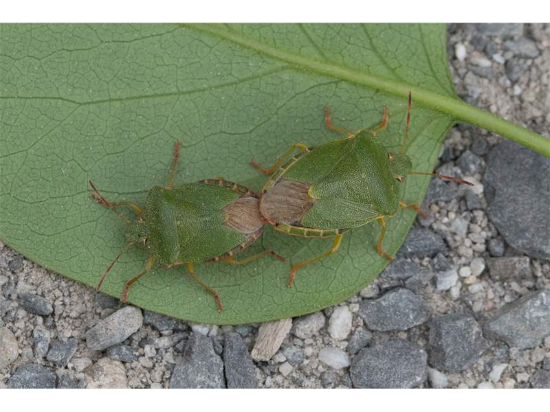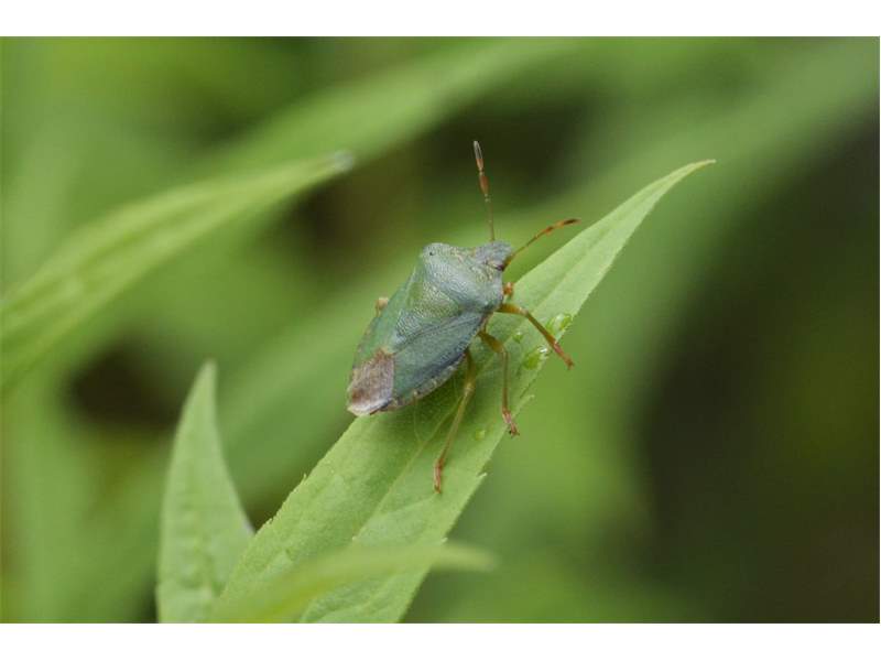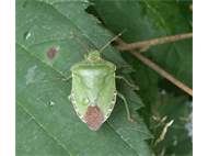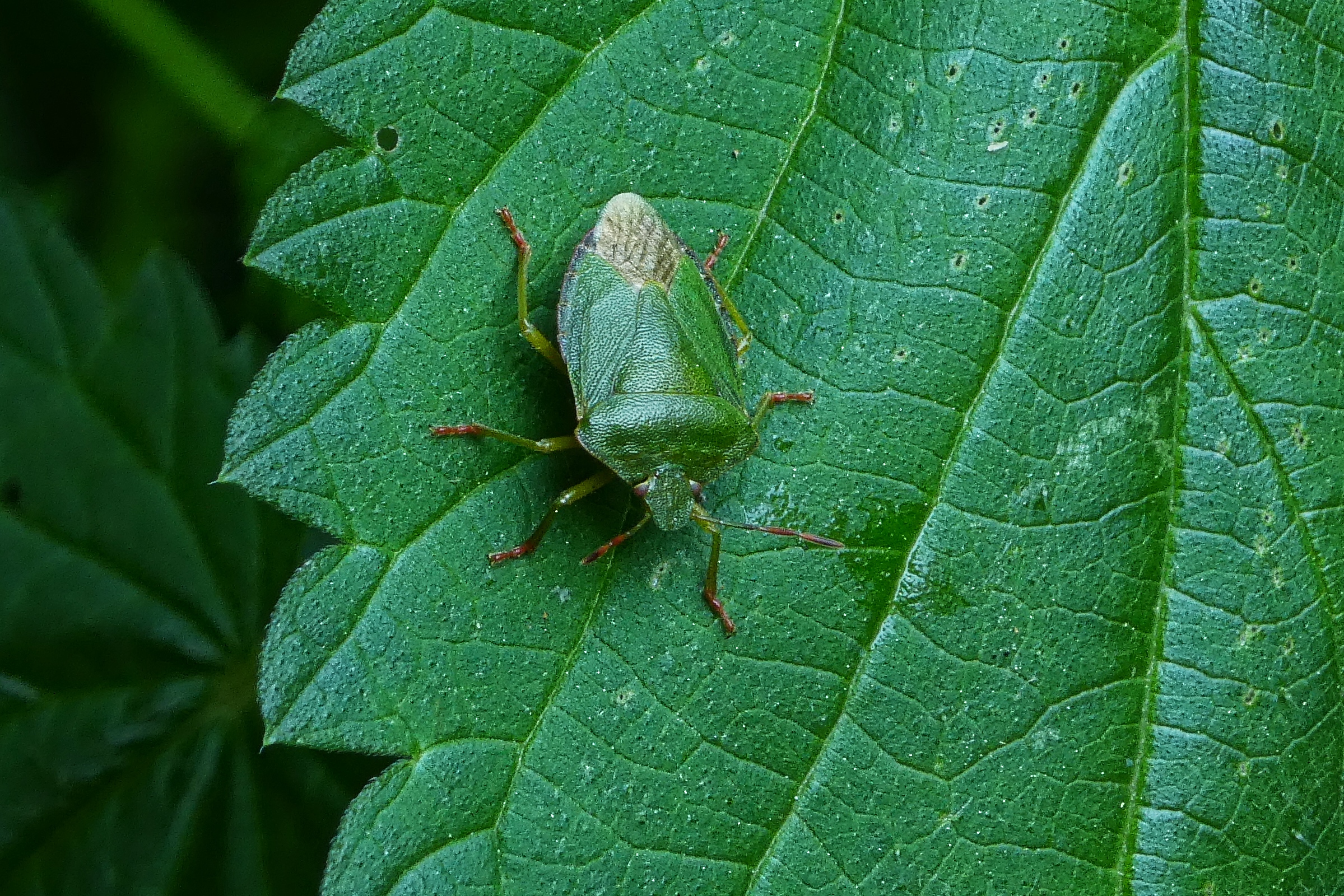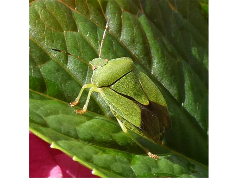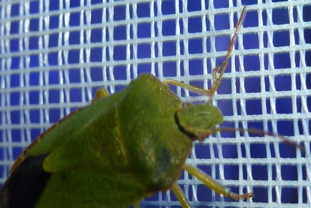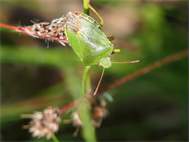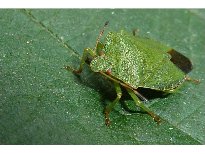 Grüne Stinkwanze (Palomena prasina (Linnaeus, 1761)), das zweite und dritte Fühlerglied sind annähernd gleich lang, im Unterschied zu Palomena viridissima, wo das dritte Fühlerglied kürzer als das zweite ist, am 1. Mai 2013 im Seifersdorfer Tal.