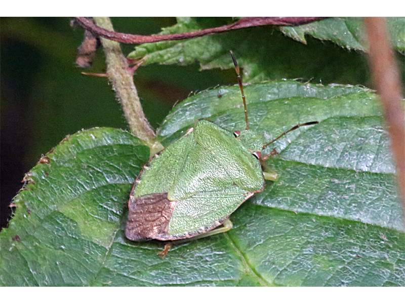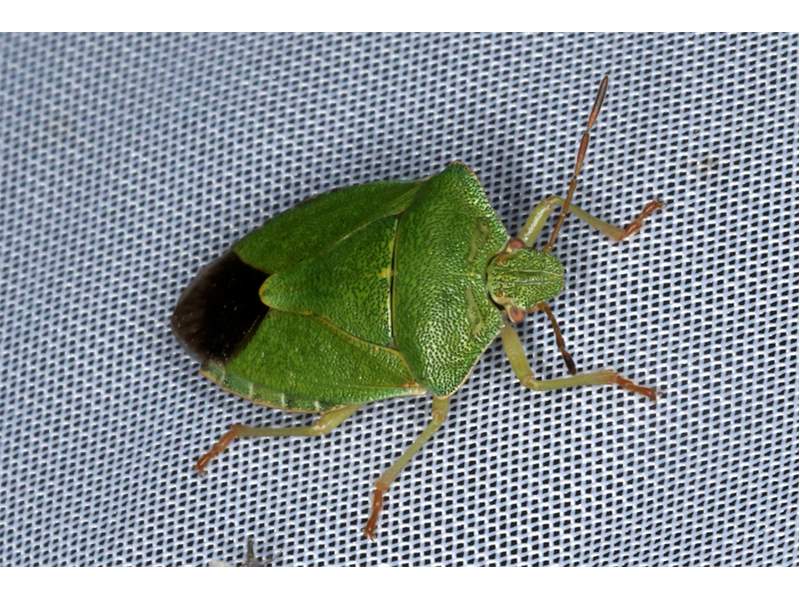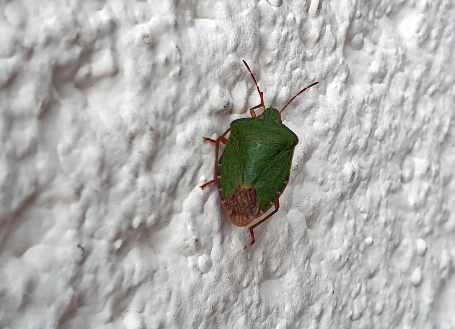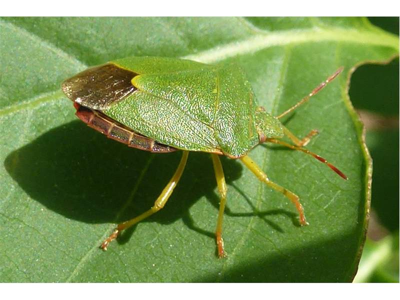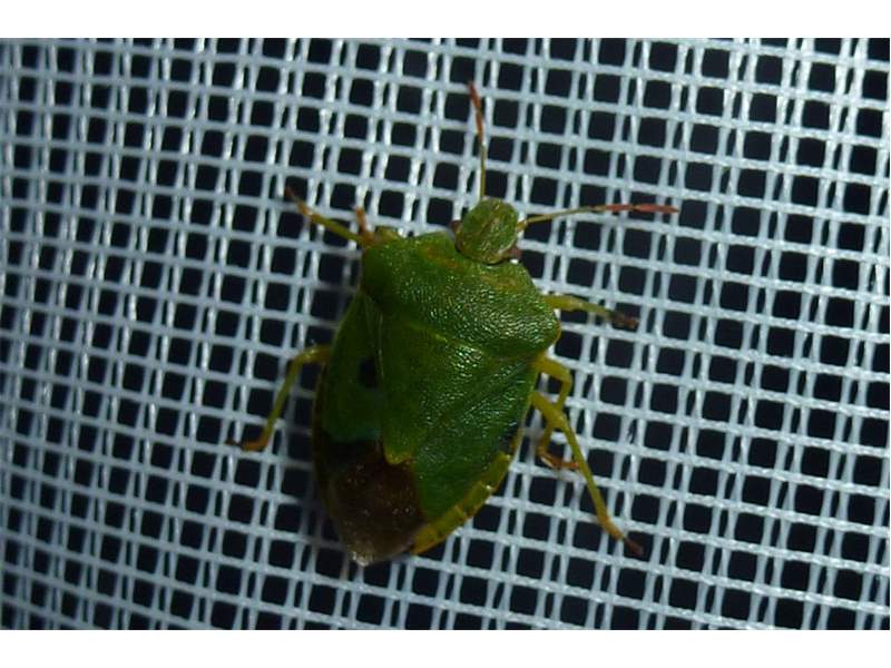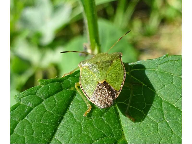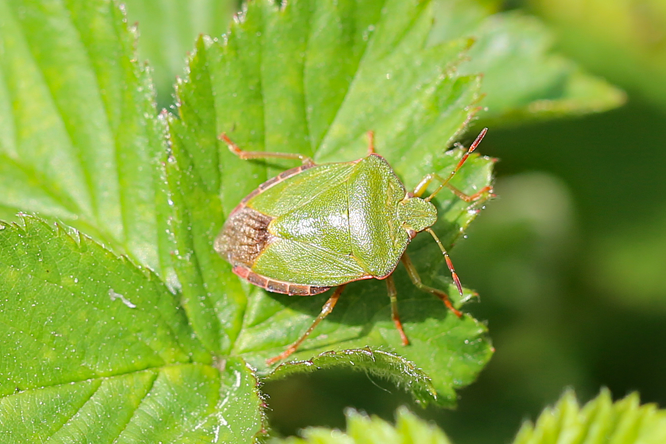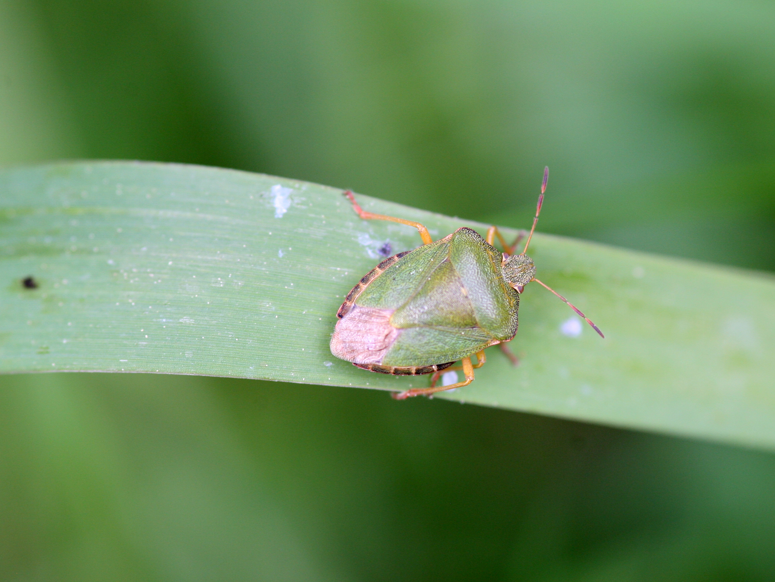 Grüne Stinkwanze (Palomena prasina (Linnaeus, 1761)), das zweite und dritte Fühlerglied sind annähernd gleich lang, im Unterschied zu Palomena viridissima, wo das dritte Fühlerglied kürzer als das zweite ist, am 1. Mai 2013 im Seifersdorfer Tal.