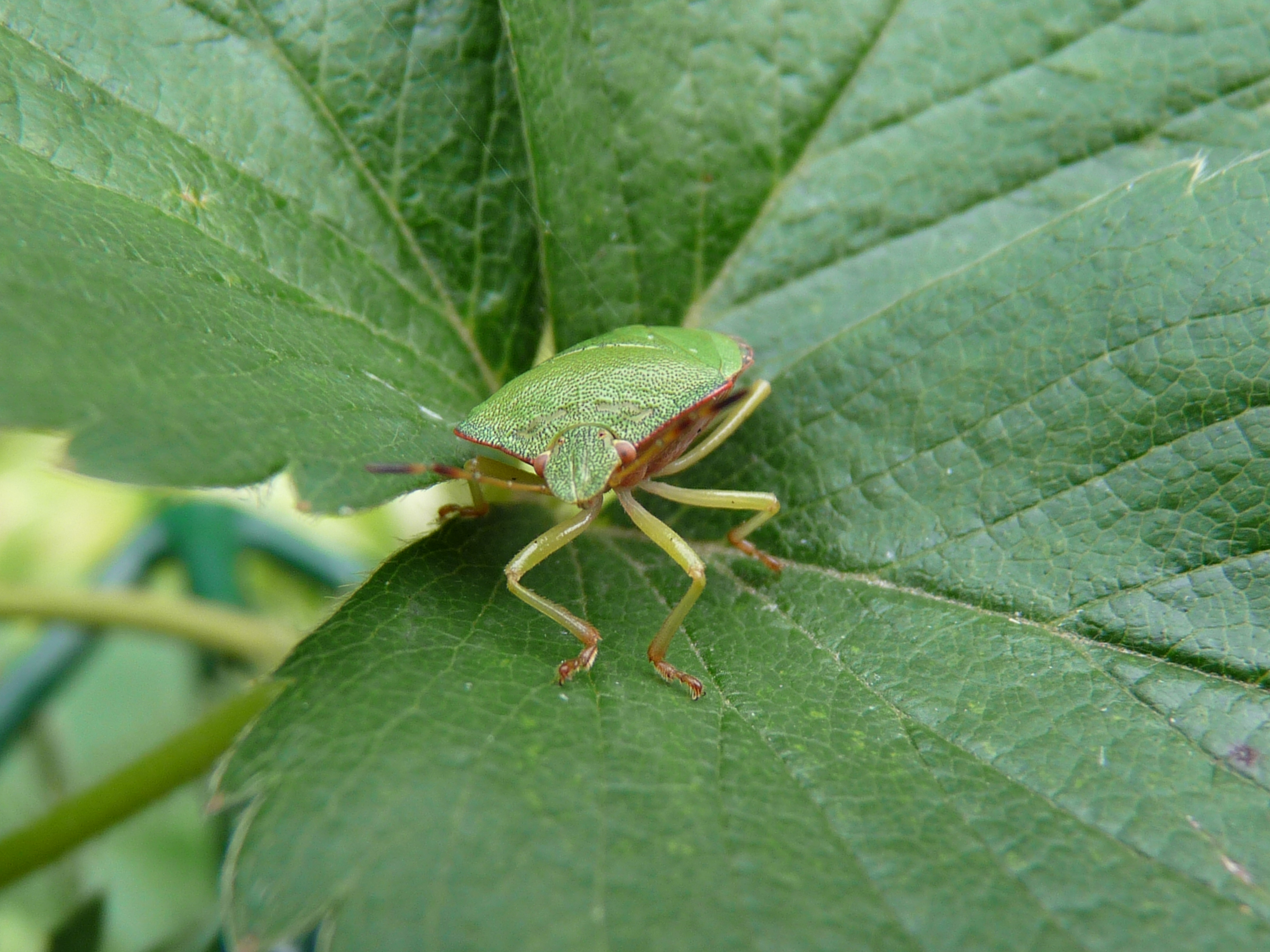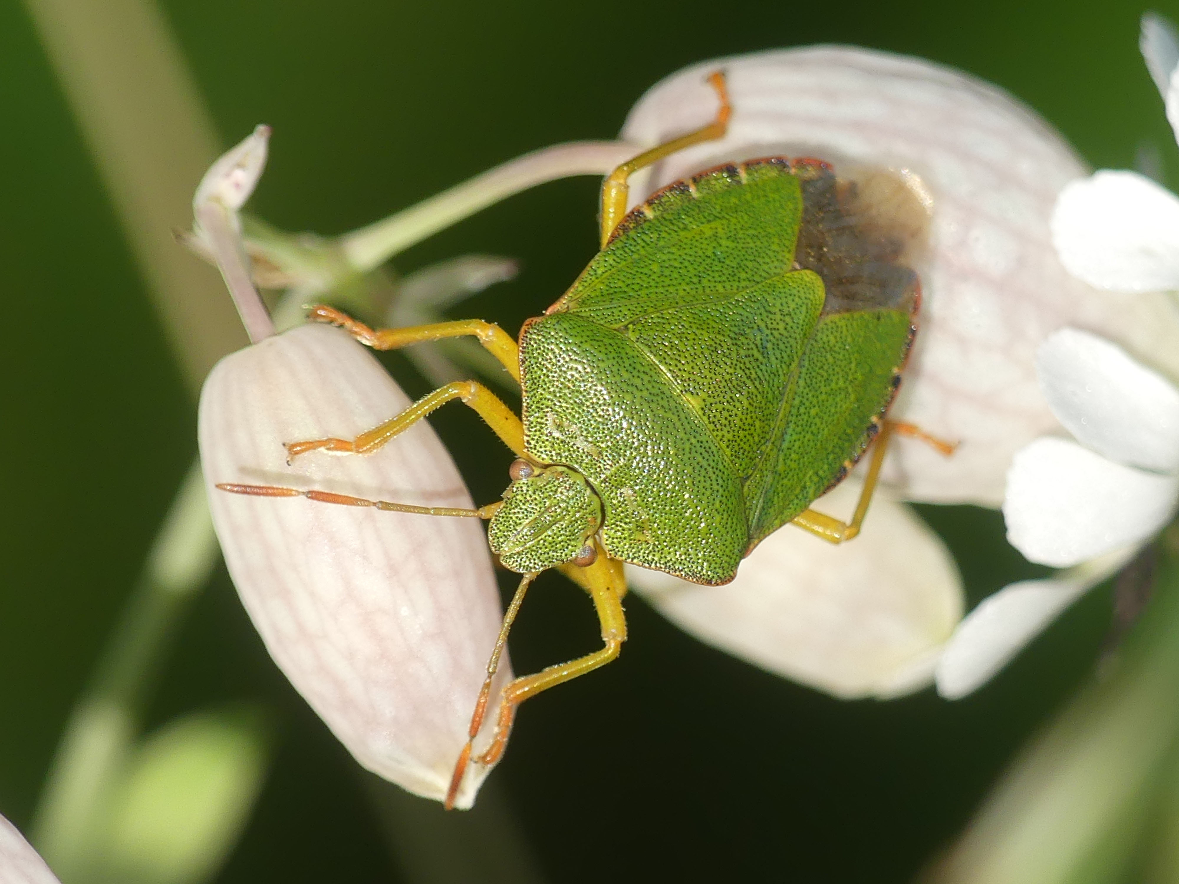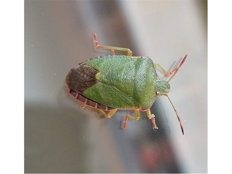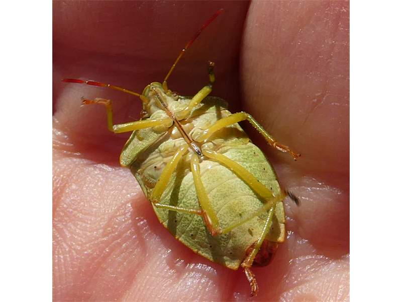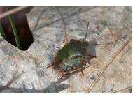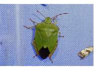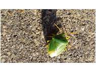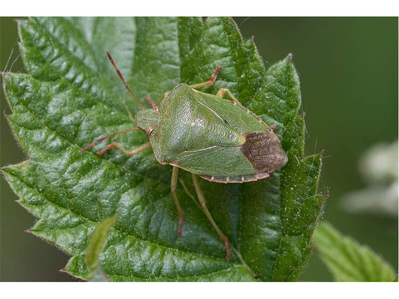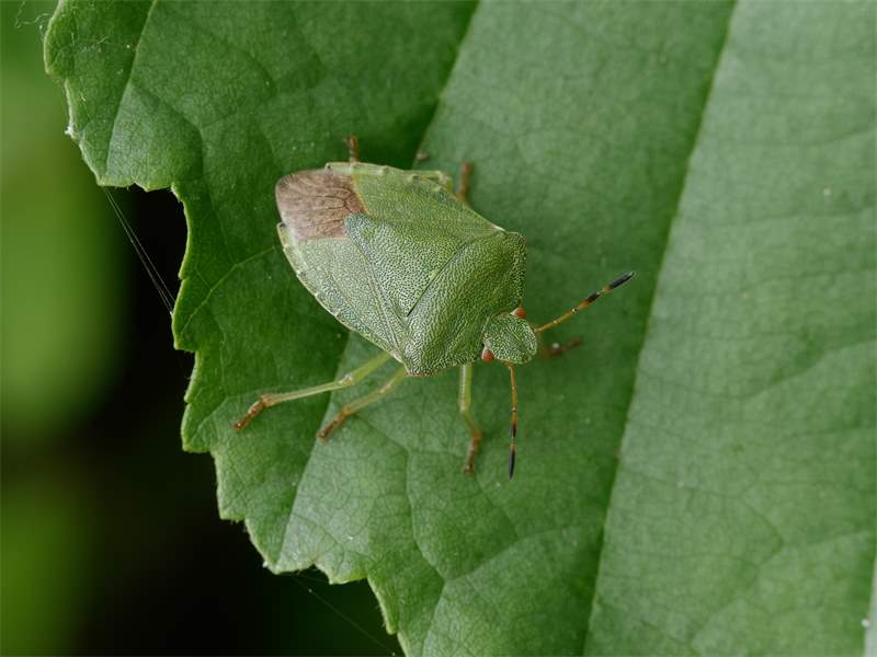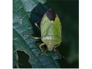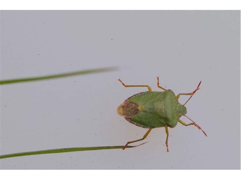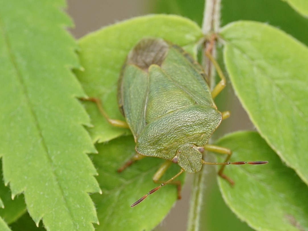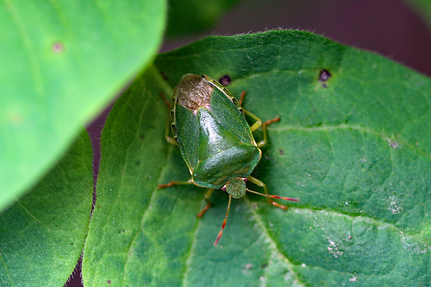 Grüne Stinkwanze (Palomena prasina (Linnaeus, 1761)), das zweite und dritte Fühlerglied sind annähernd gleich lang, im Unterschied zu Palomena viridissima, wo das dritte Fühlerglied kürzer als das zweite ist, am 1. Mai 2013 im Seifersdorfer Tal.