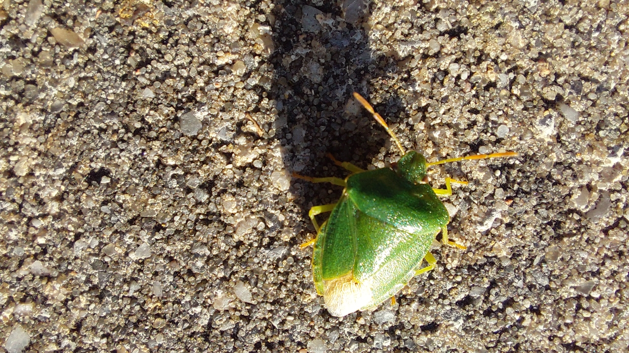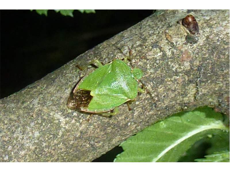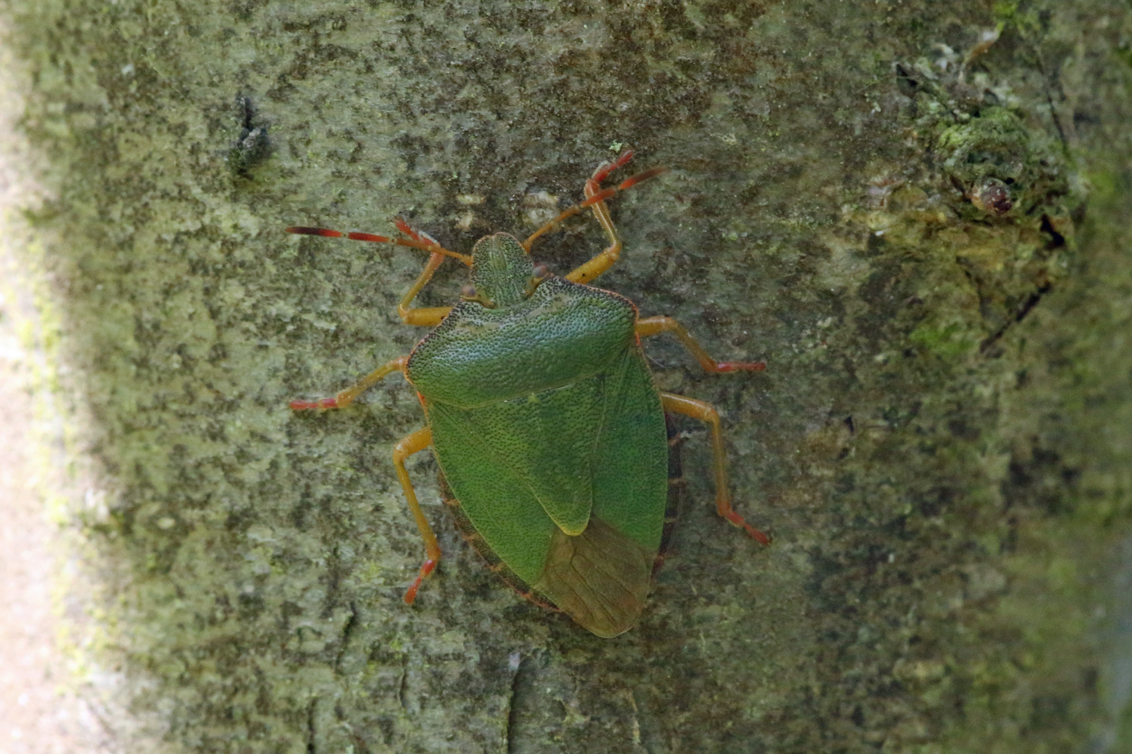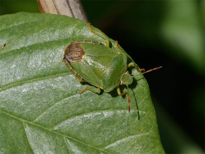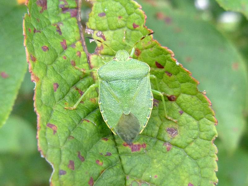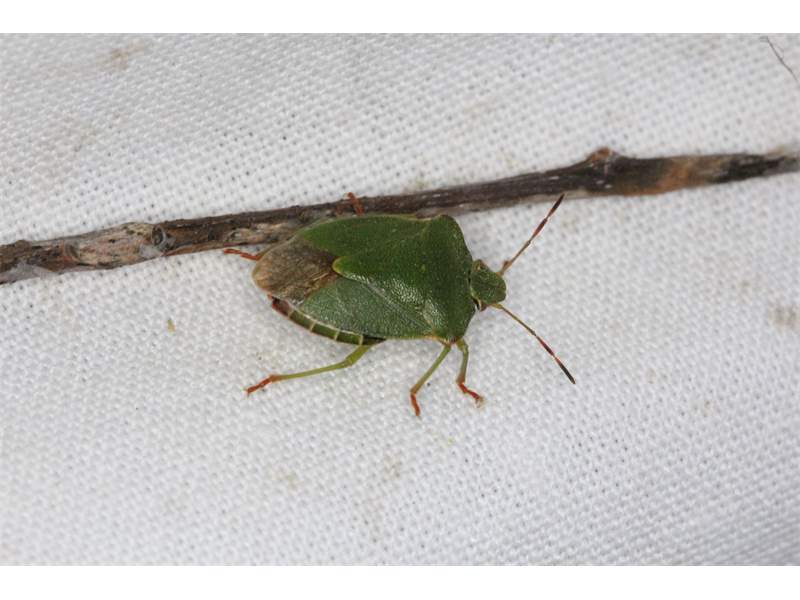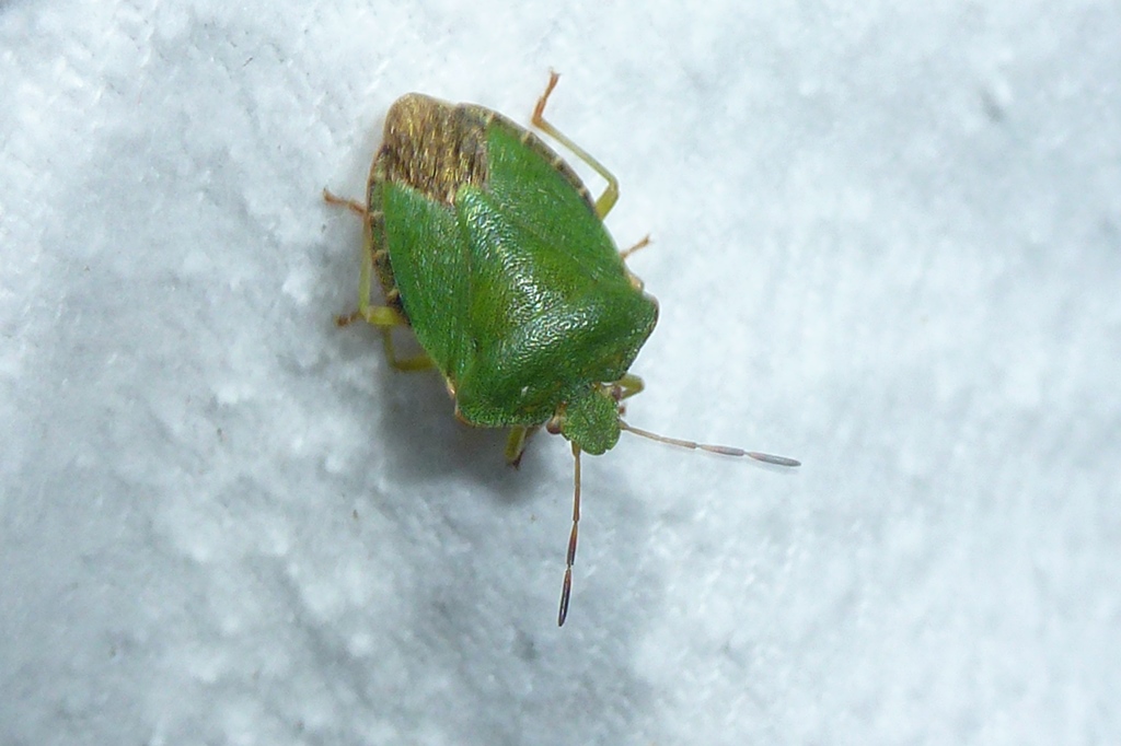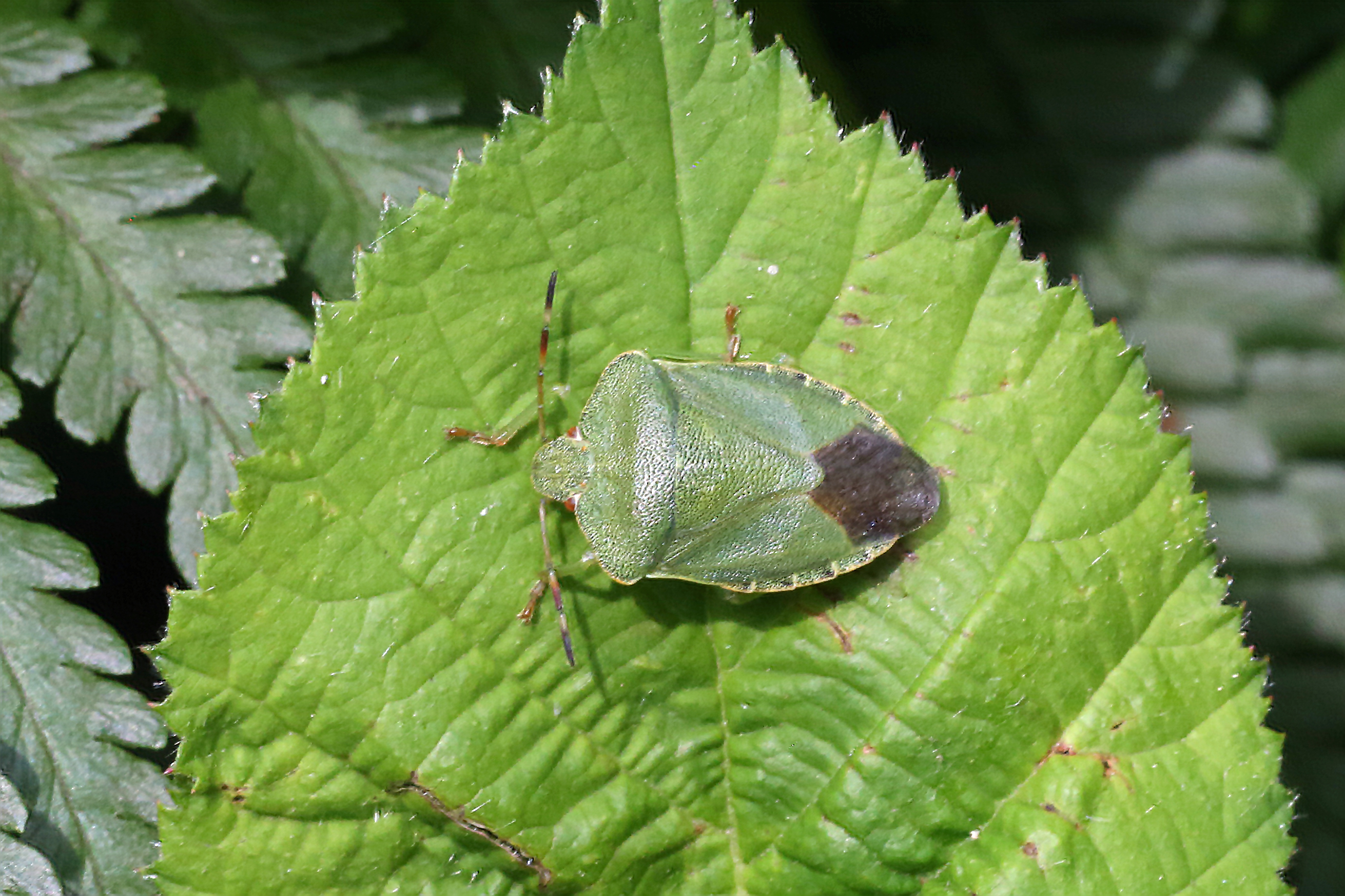 Grüne Stinkwanze (Palomena prasina (Linnaeus, 1761)), das zweite und dritte Fühlerglied sind annähernd gleich lang, im Unterschied zu Palomena viridissima, wo das dritte Fühlerglied kürzer als das zweite ist, am 1. Mai 2013 im Seifersdorfer Tal.