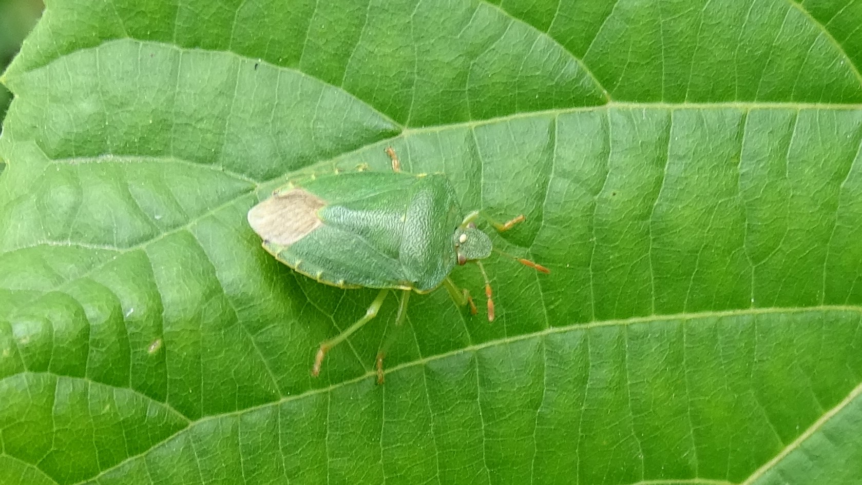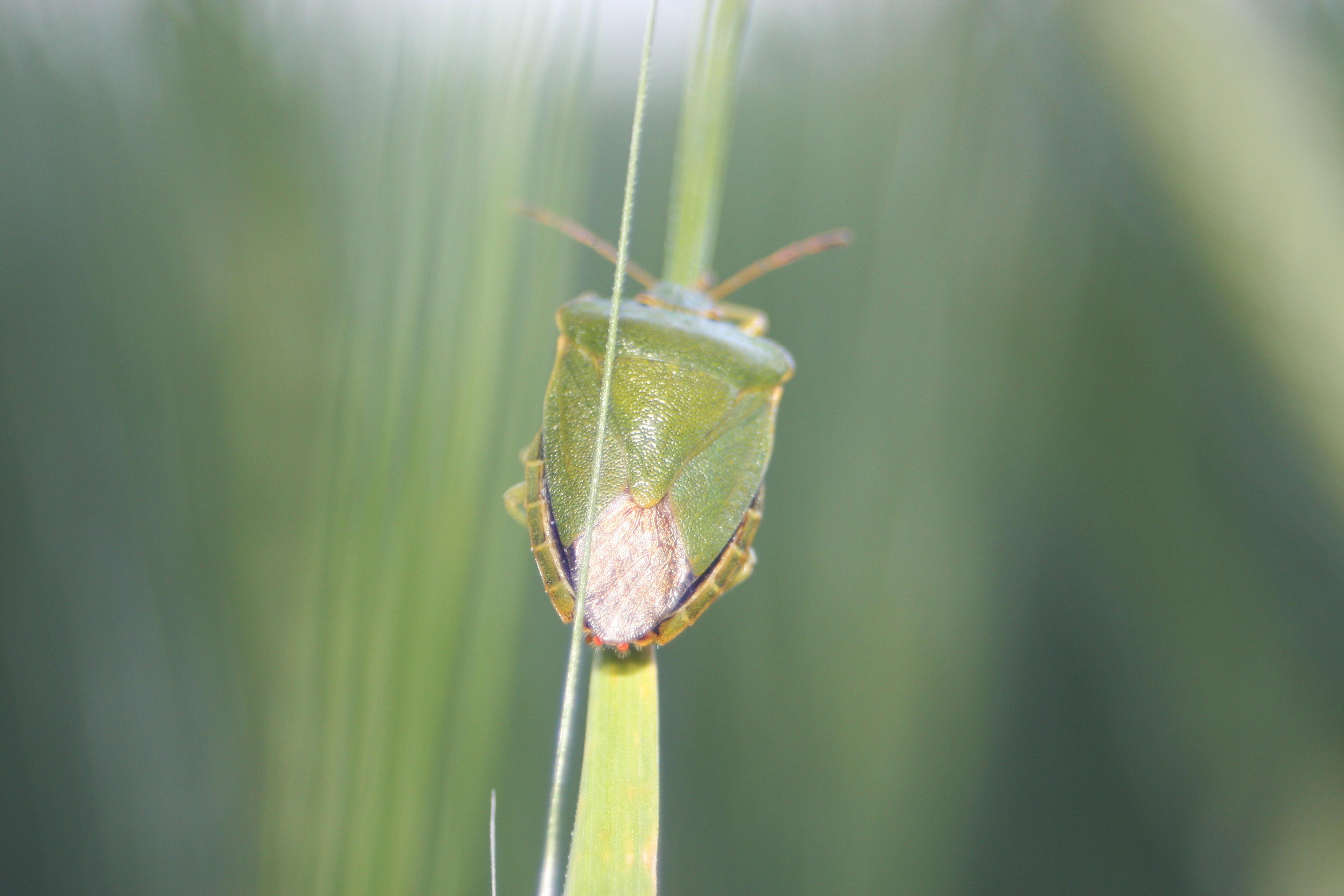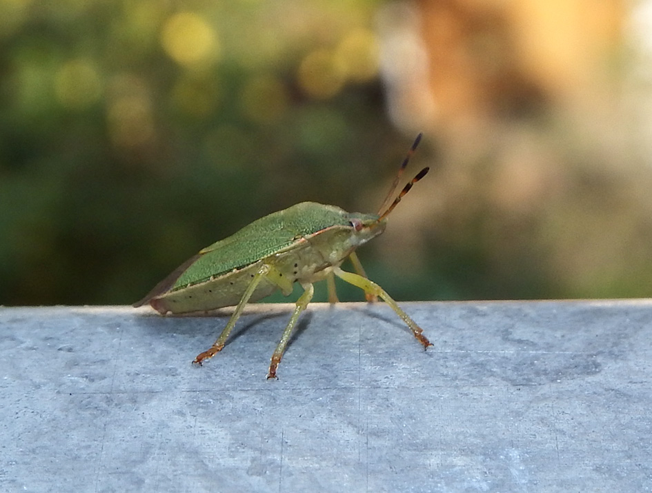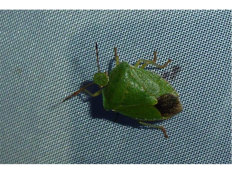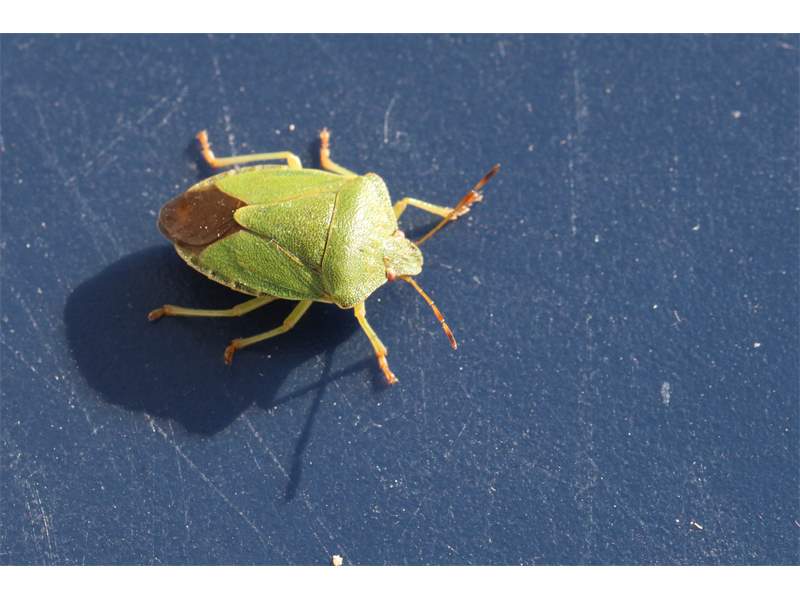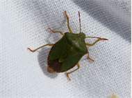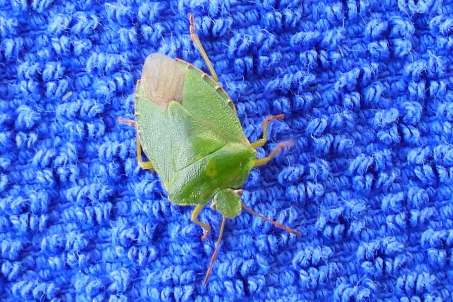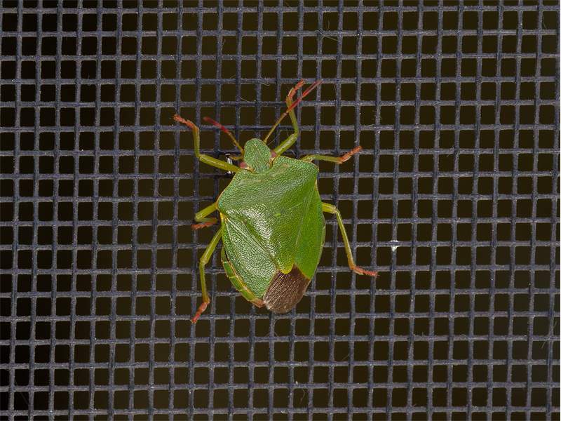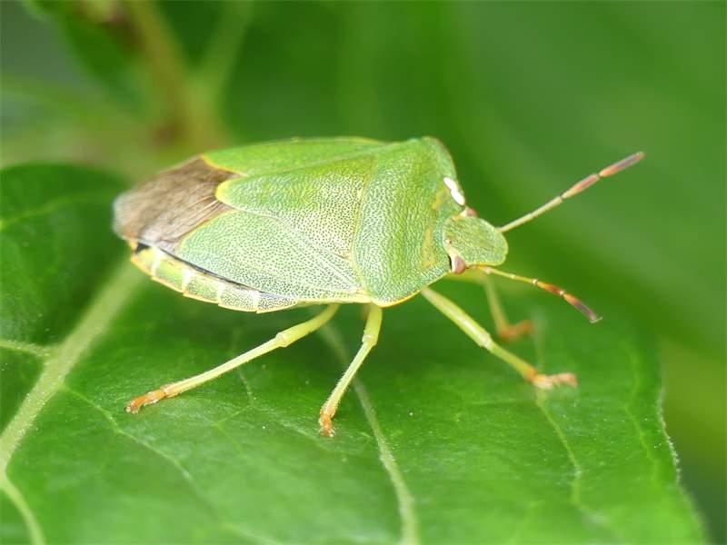 Grüne Stinkwanze (Palomena prasina (Linnaeus, 1761)), das zweite und dritte Fühlerglied sind annähernd gleich lang, im Unterschied zu Palomena viridissima, wo das dritte Fühlerglied kürzer als das zweite ist, am 1. Mai 2013 im Seifersdorfer Tal.