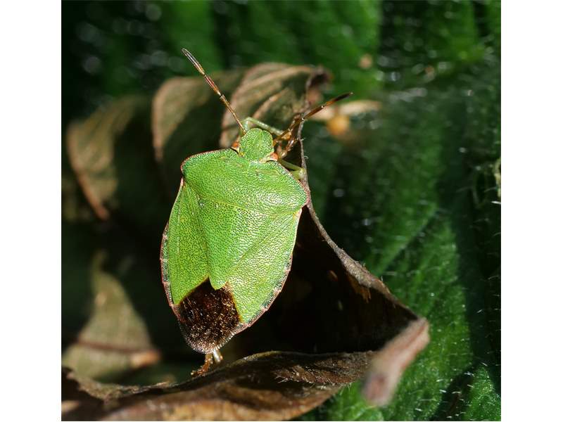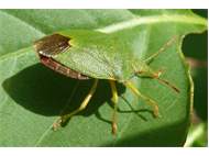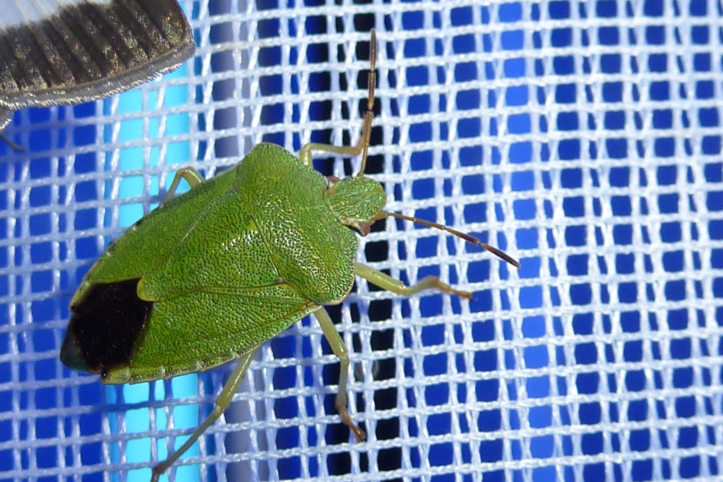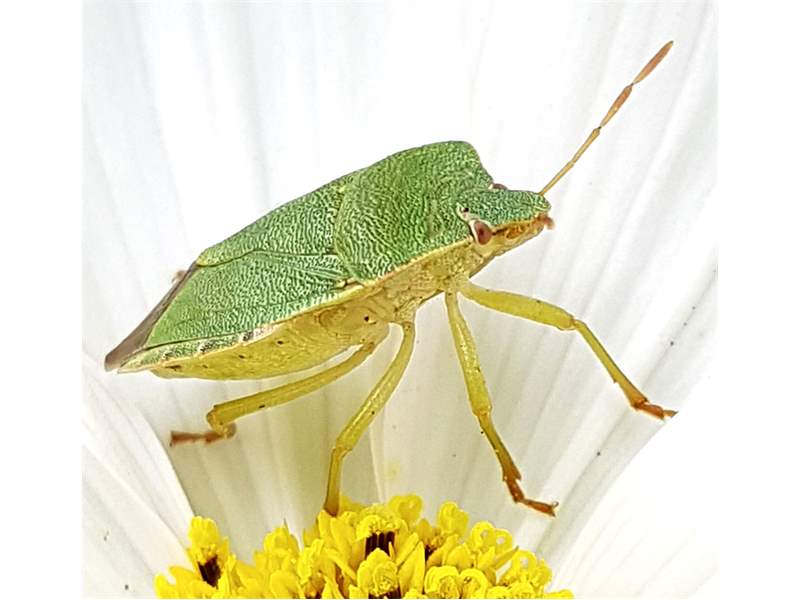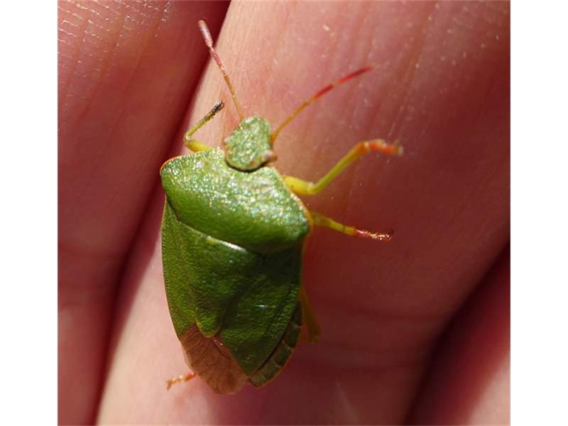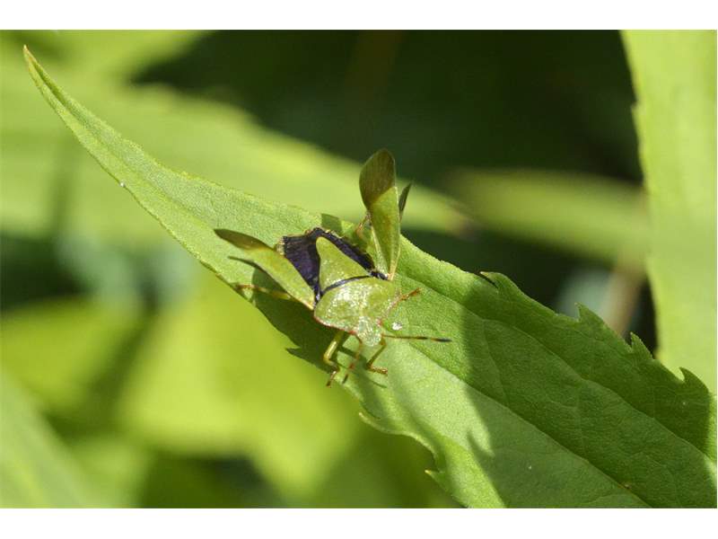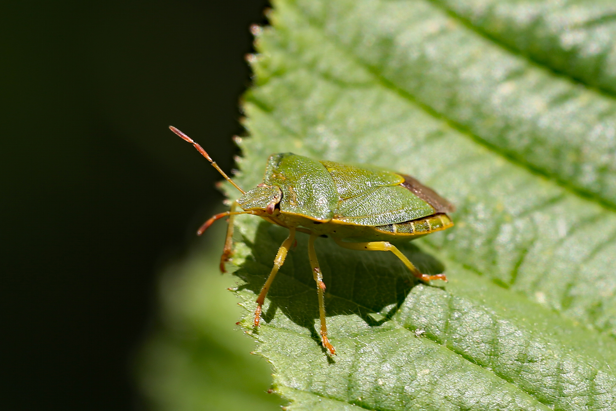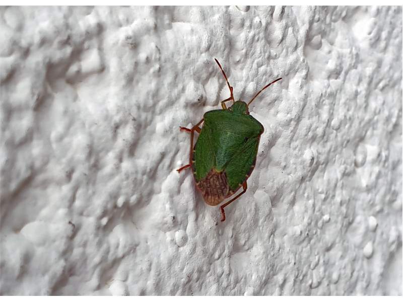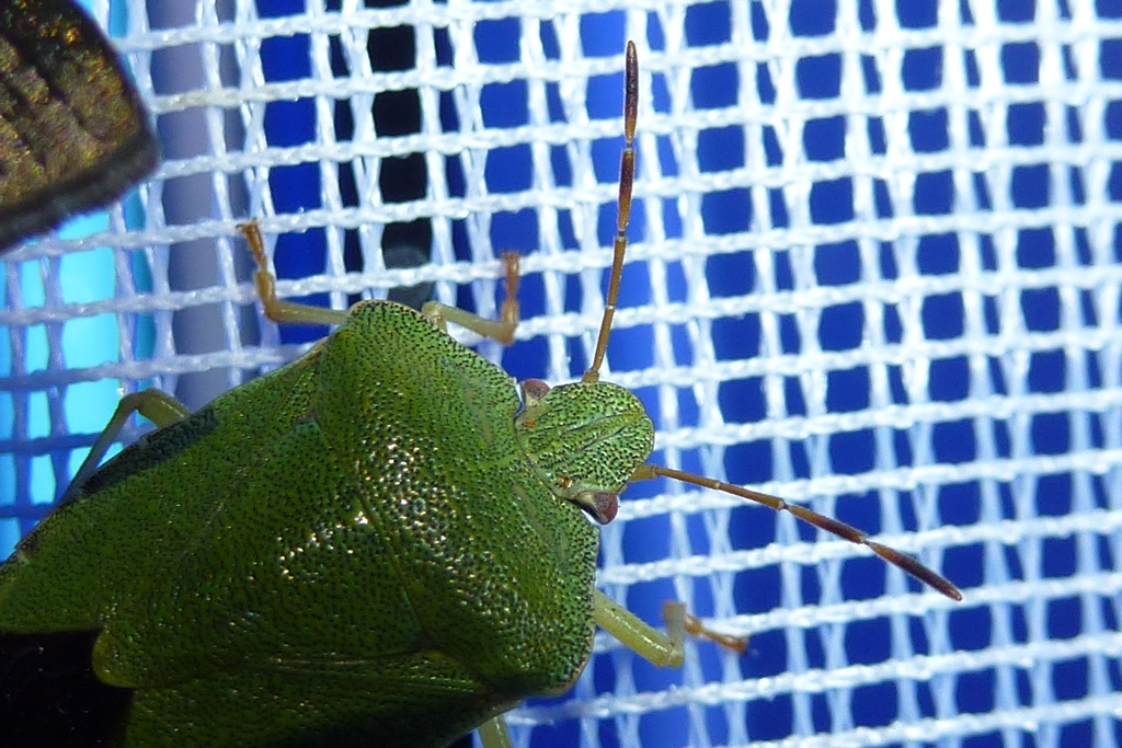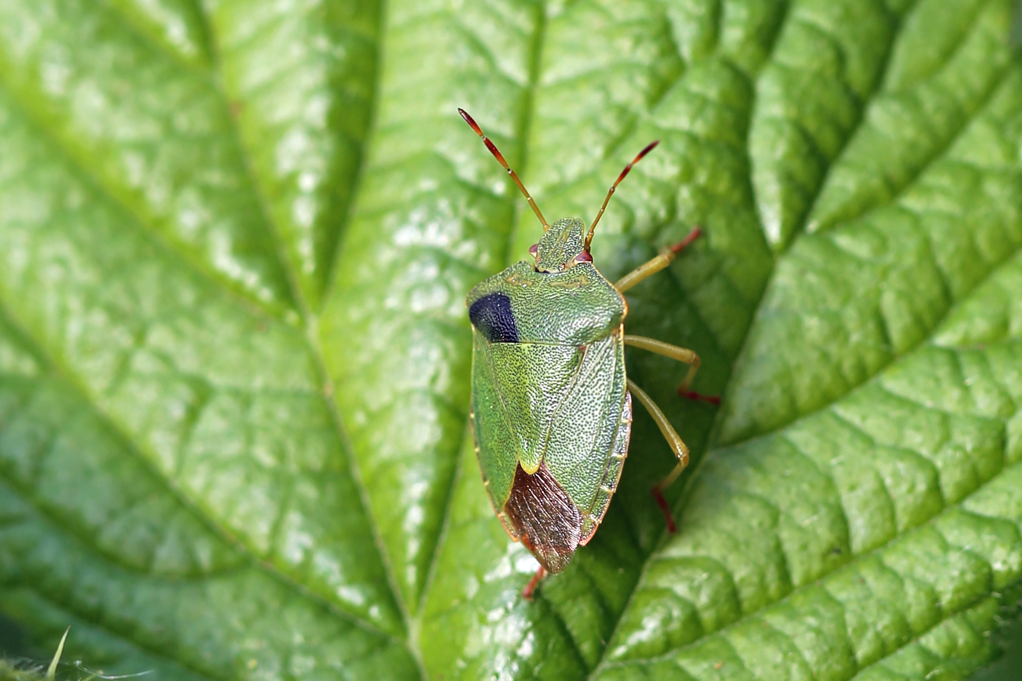 Grüne Stinkwanze (Palomena prasina (Linnaeus, 1761)), das zweite und dritte Fühlerglied sind annähernd gleich lang, im Unterschied zu Palomena viridissima, wo das dritte Fühlerglied kürzer als das zweite ist, am 1. Mai 2013 im Seifersdorfer Tal.