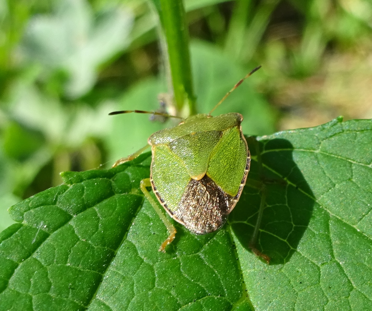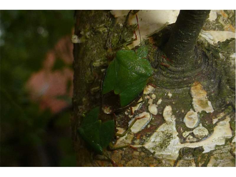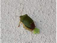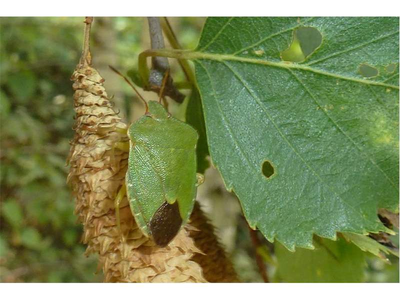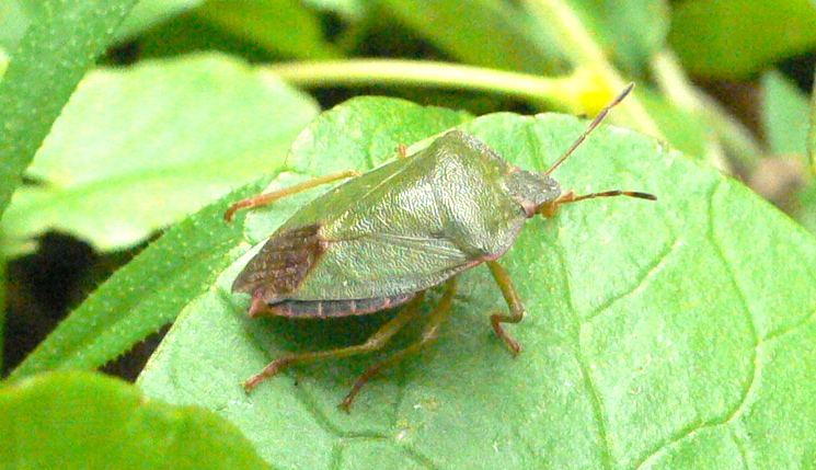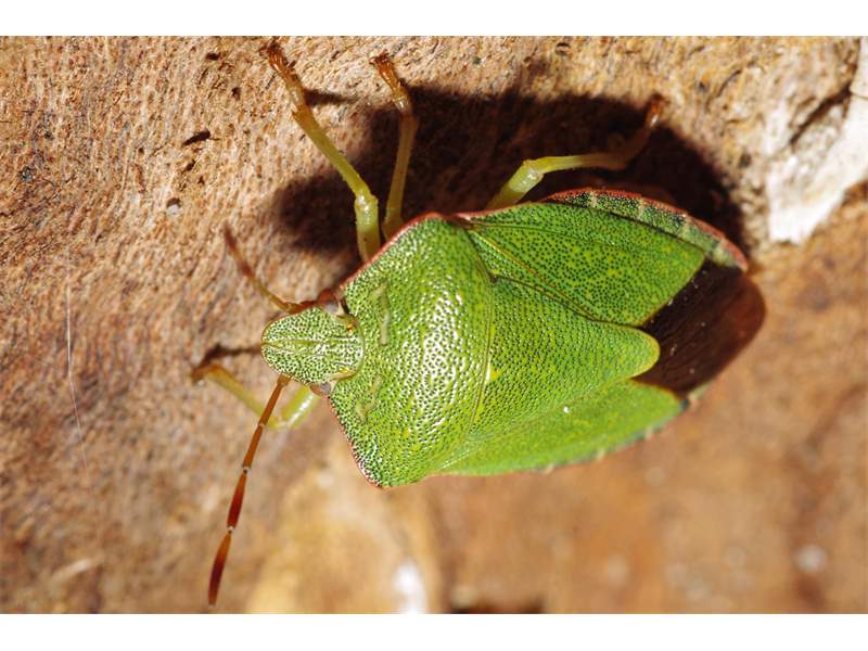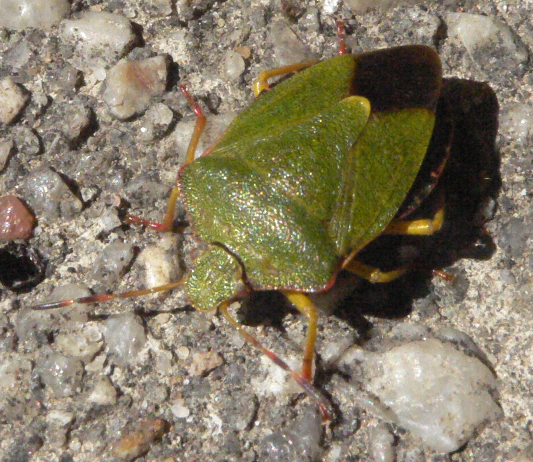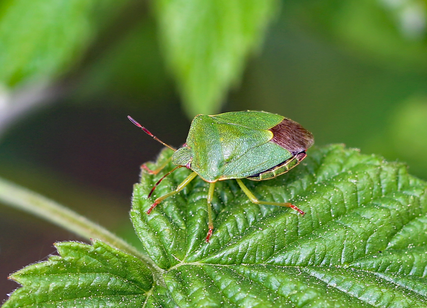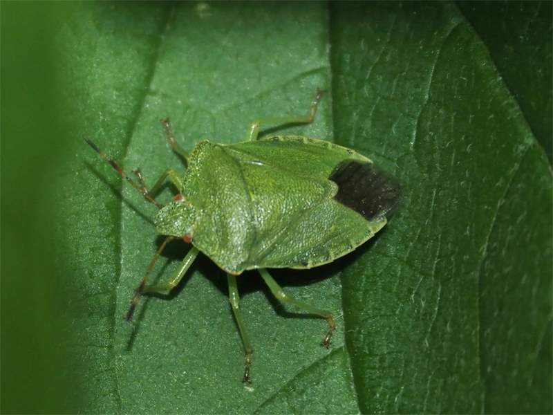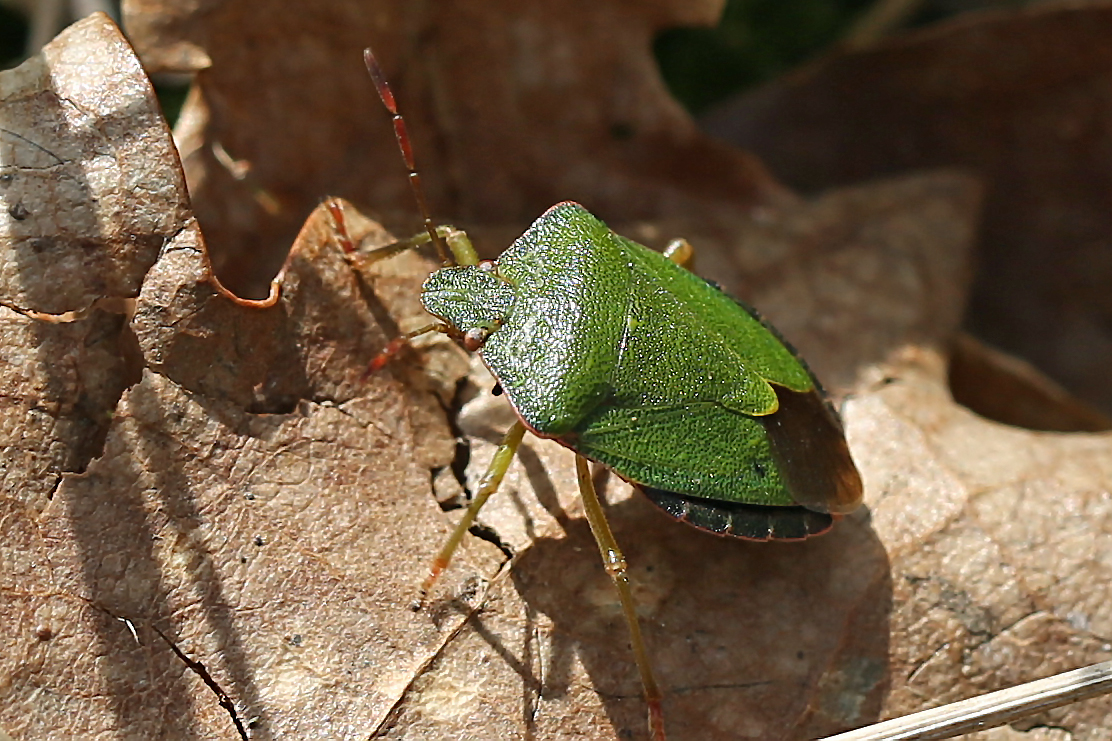 Grüne Stinkwanze (Palomena prasina (Linnaeus, 1761)), das zweite und dritte Fühlerglied sind annähernd gleich lang, im Unterschied zu Palomena viridissima, wo das dritte Fühlerglied kürzer als das zweite ist, am 1. Mai 2013 im Seifersdorfer Tal.
