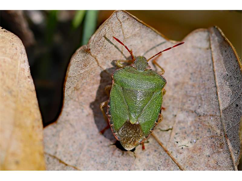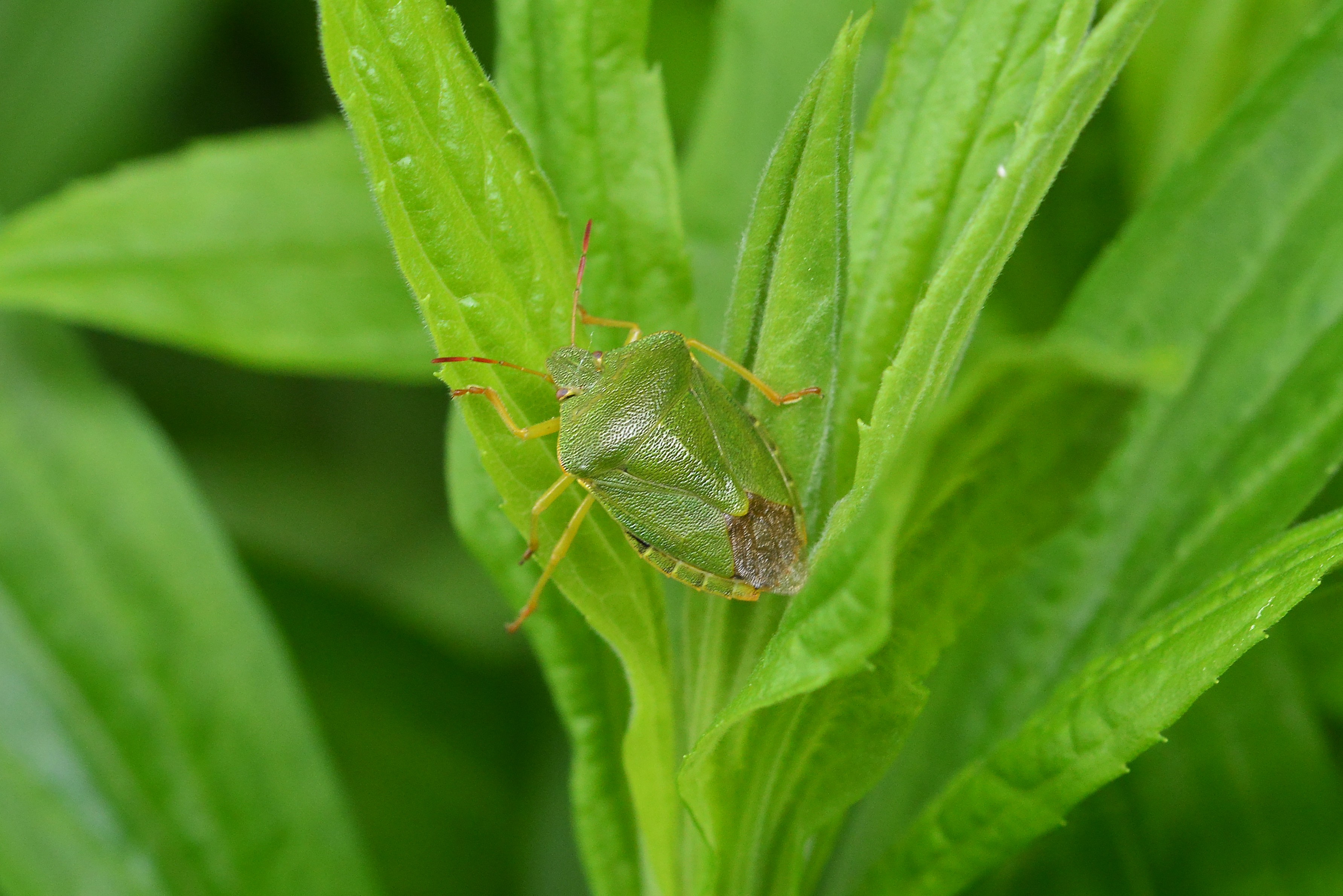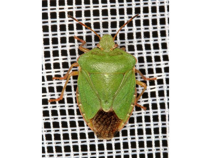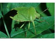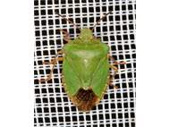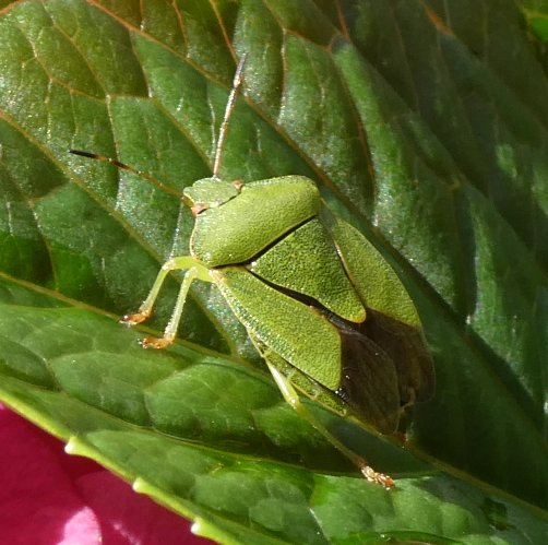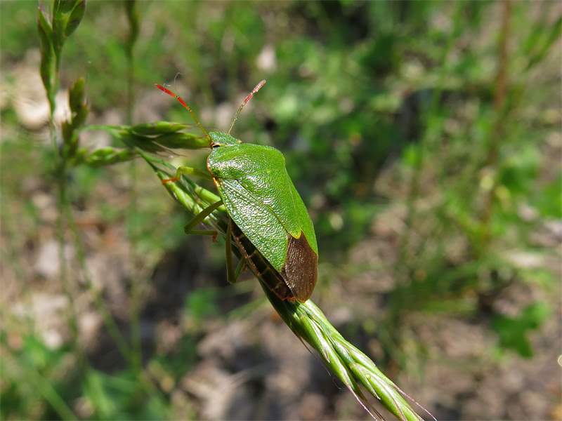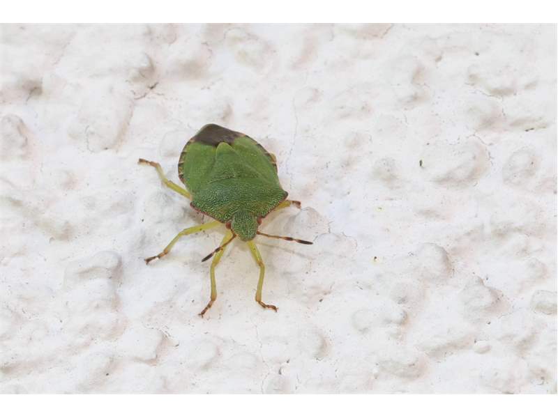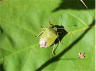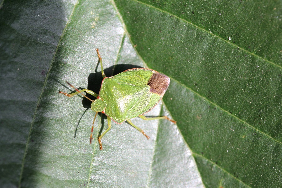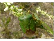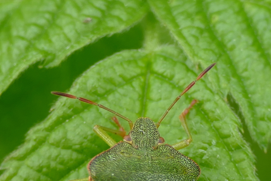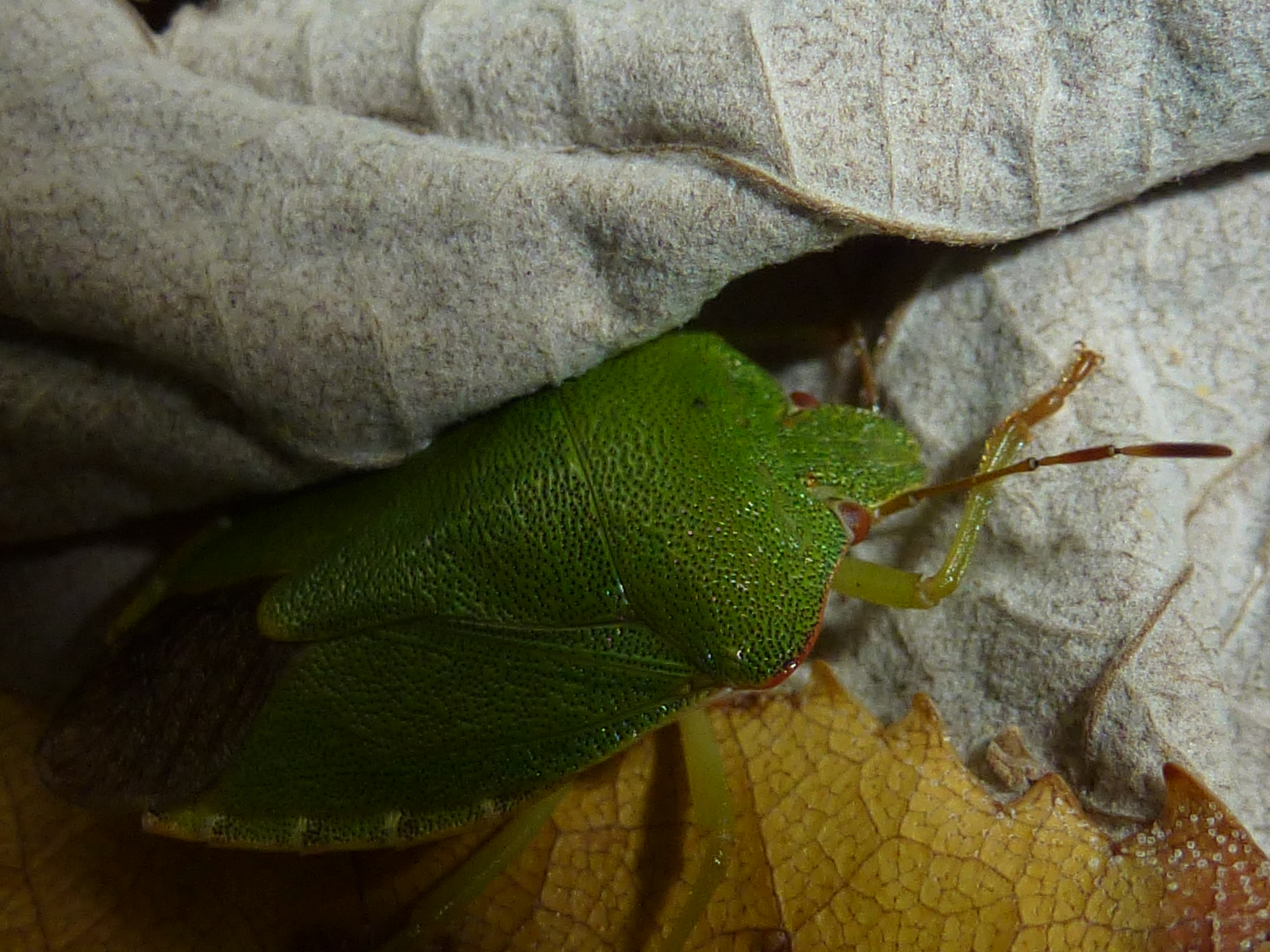 Grüne Stinkwanze (Palomena prasina (Linnaeus, 1761)), das zweite und dritte Fühlerglied sind annähernd gleich lang, im Unterschied zu Palomena viridissima, wo das dritte Fühlerglied kürzer als das zweite ist, am 1. Mai 2013 im Seifersdorfer Tal.