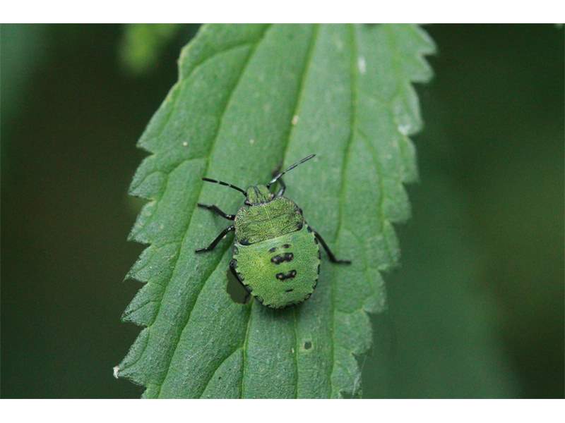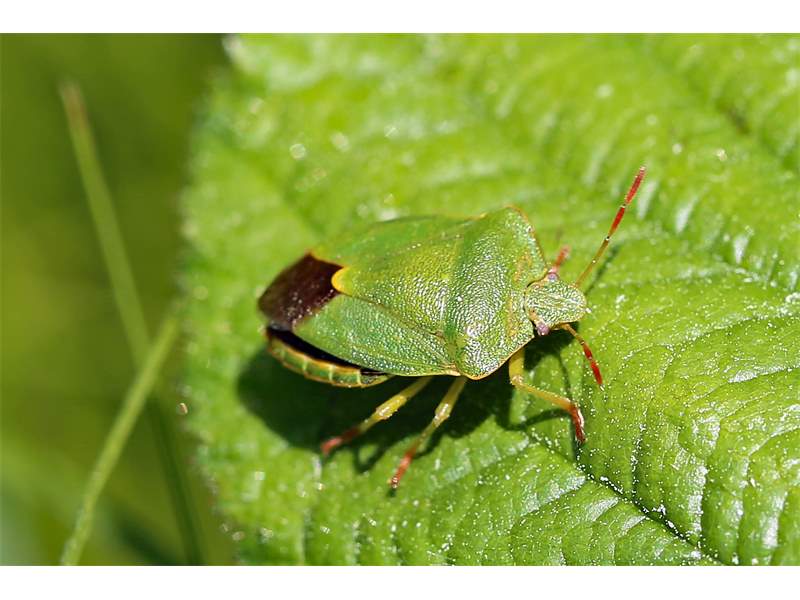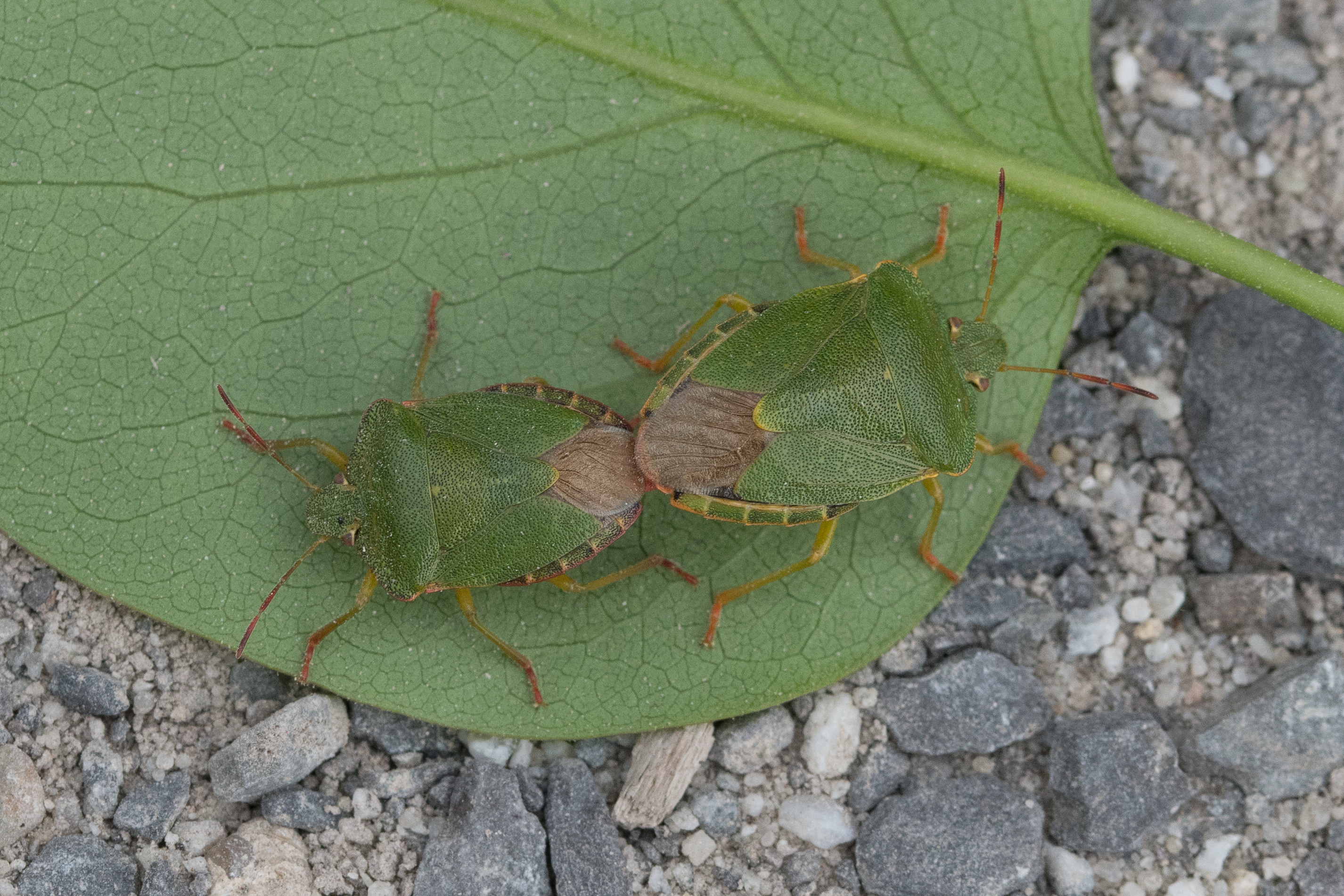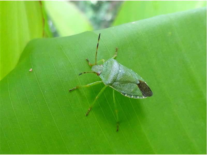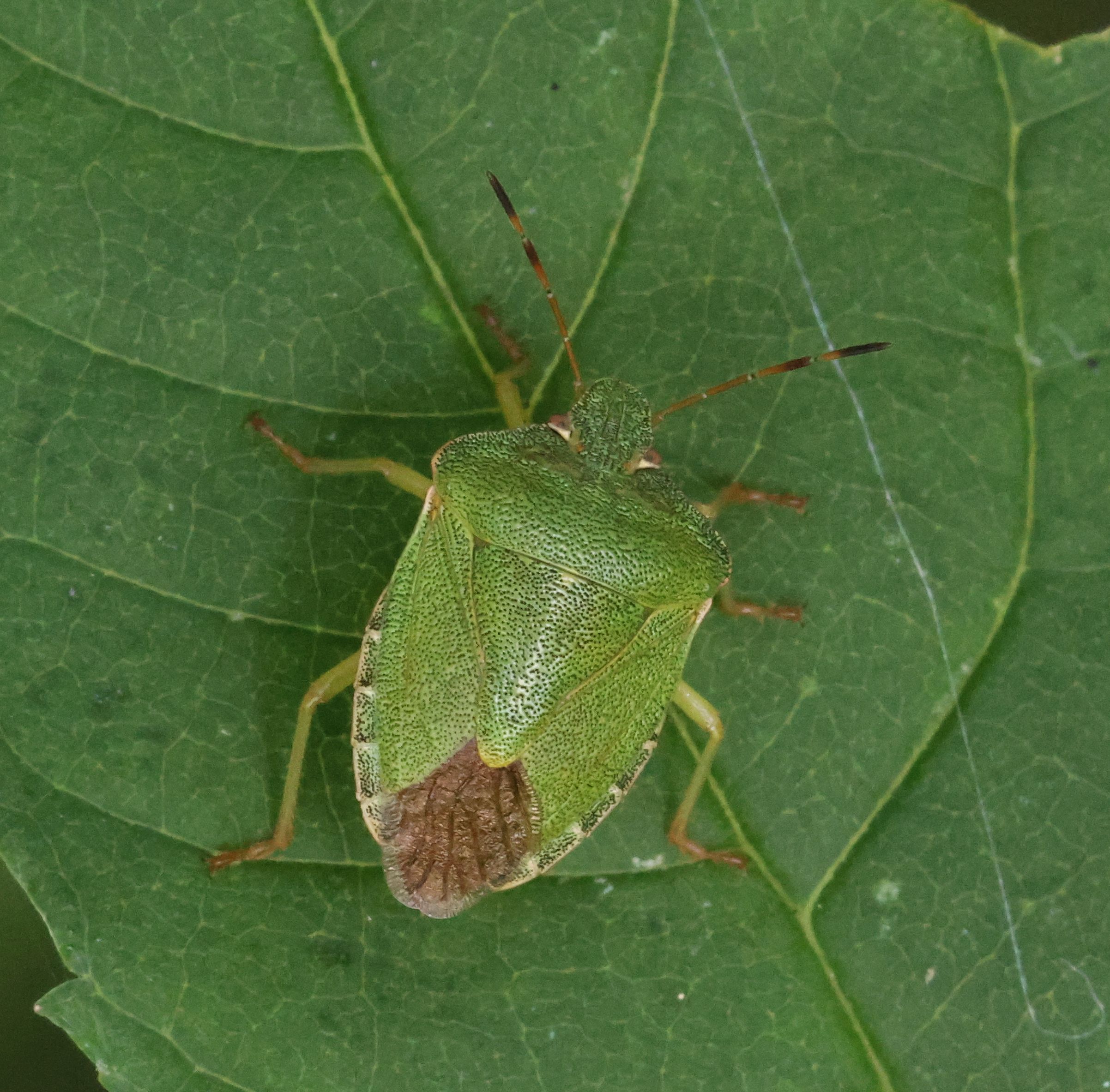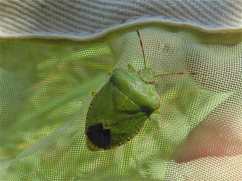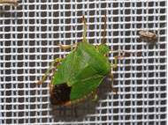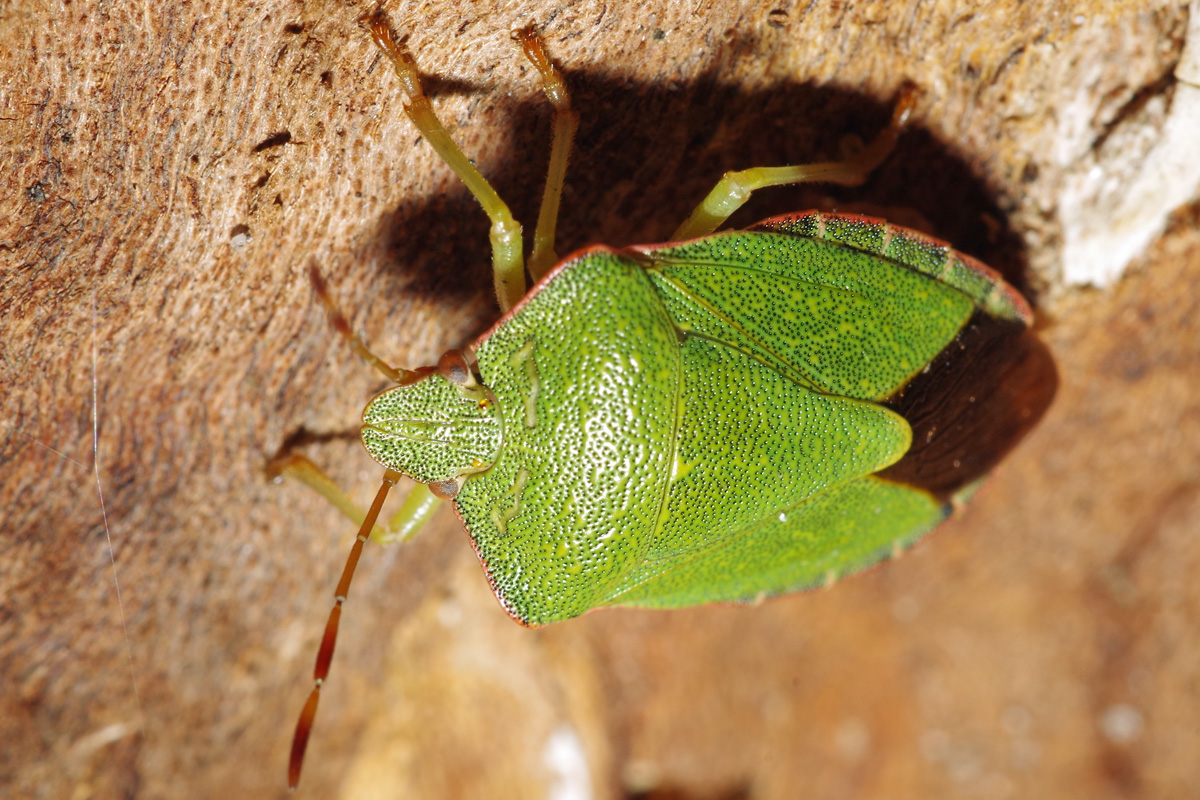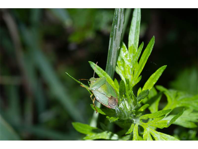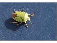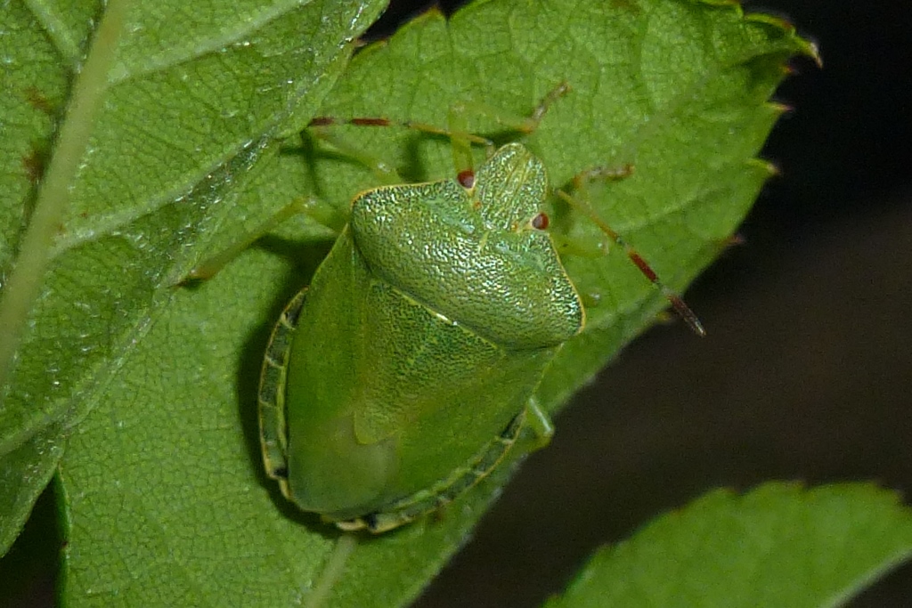 Grüne Stinkwanze (Palomena prasina (Linnaeus, 1761)), das zweite und dritte Fühlerglied sind annähernd gleich lang, im Unterschied zu Palomena viridissima, wo das dritte Fühlerglied kürzer als das zweite ist, am 1. Mai 2013 im Seifersdorfer Tal.
