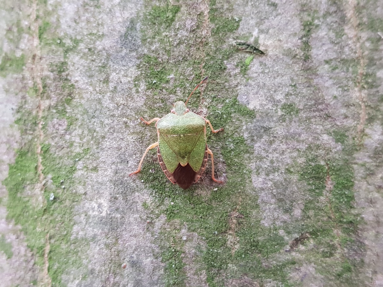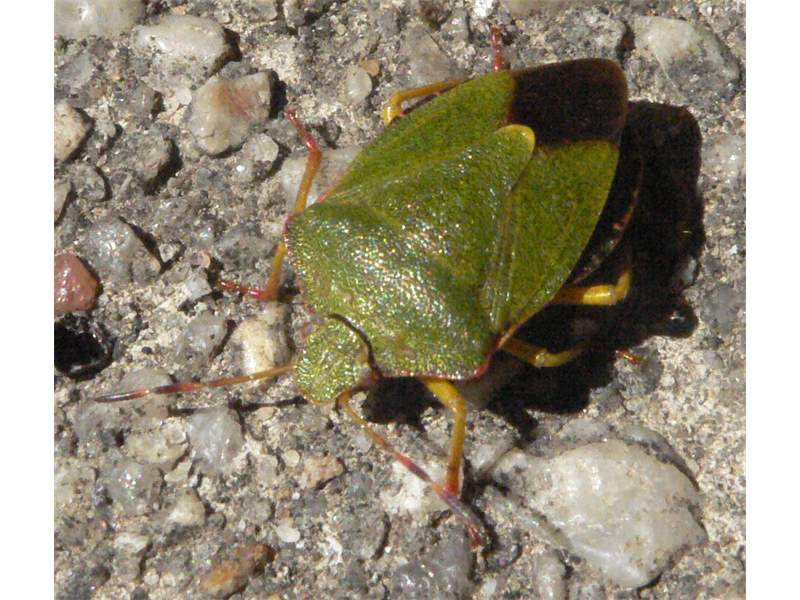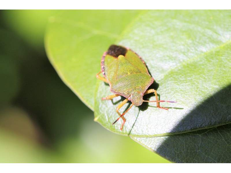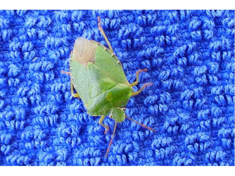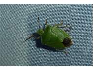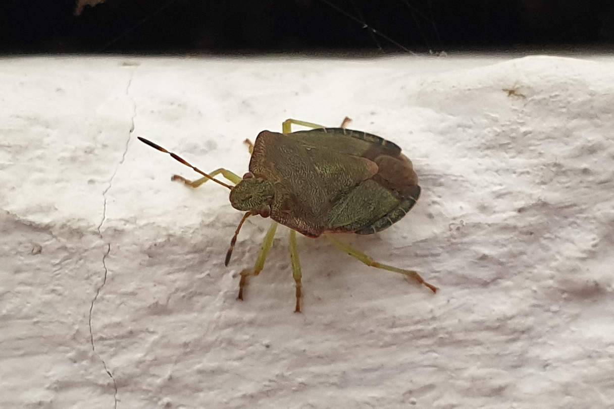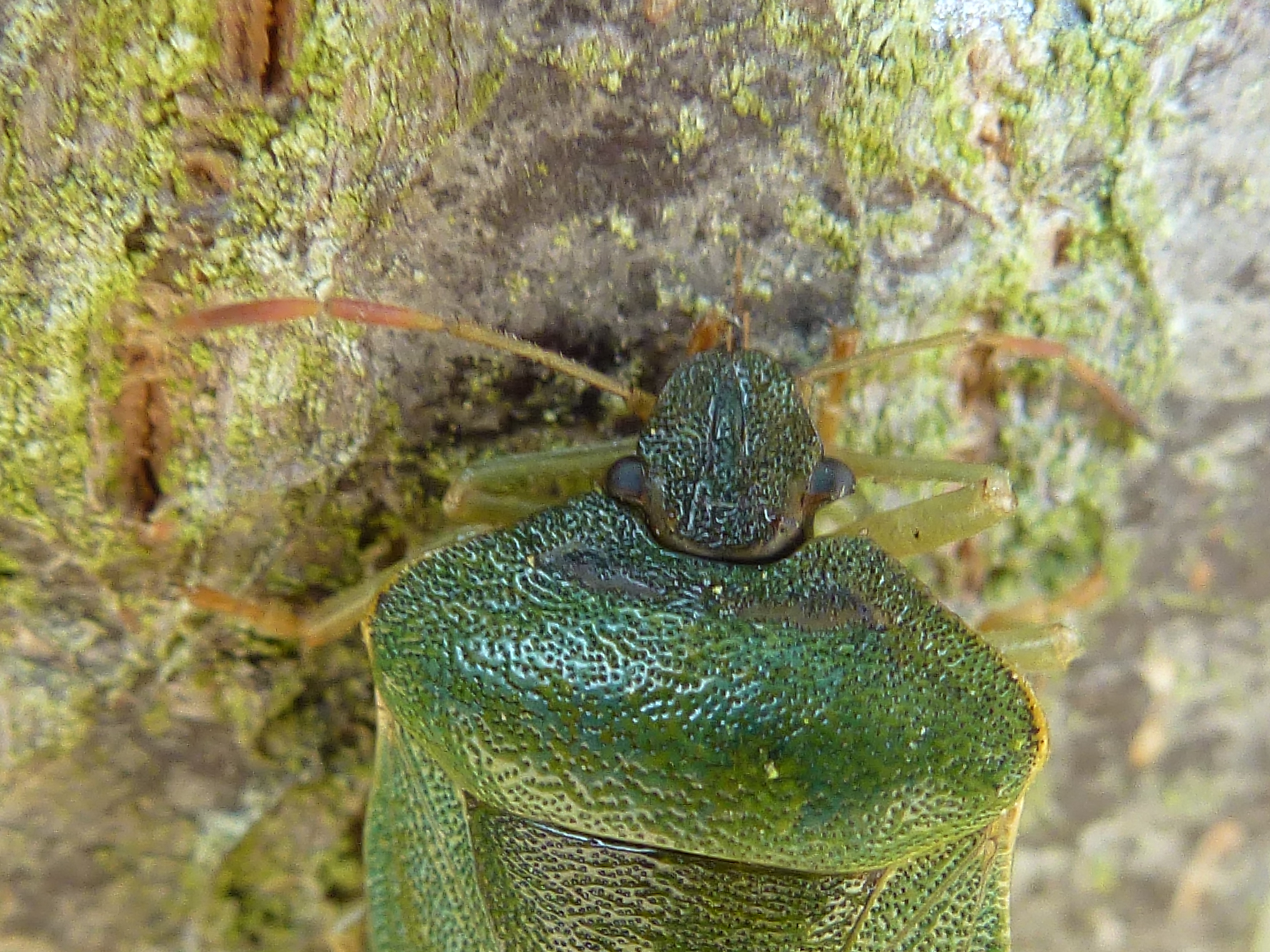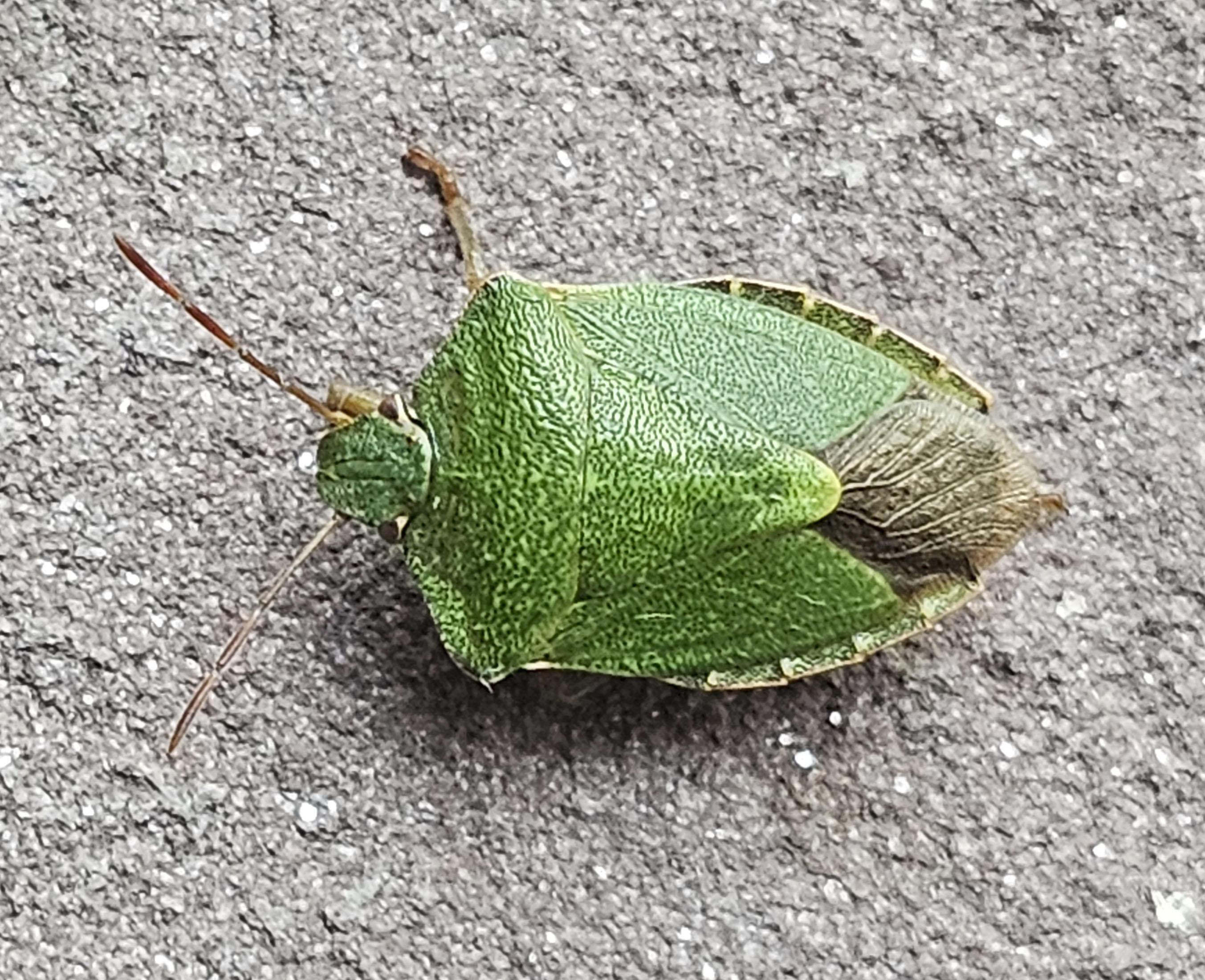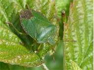Grüne Stinkwanze (Palomena prasina (Linnaeus, 1761)), das zweite und dritte Fühlerglied sind annähernd gleich lang, im Unterschied zu Palomena viridissima, wo das dritte Fühlerglied kürzer als das zweite ist, am 1. Mai 2013 im Seifersdorfer Tal.
