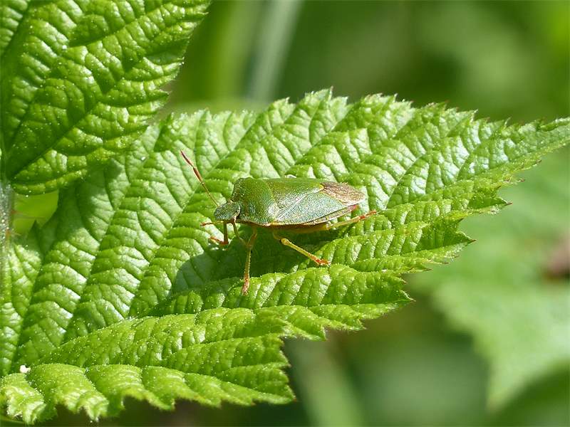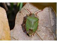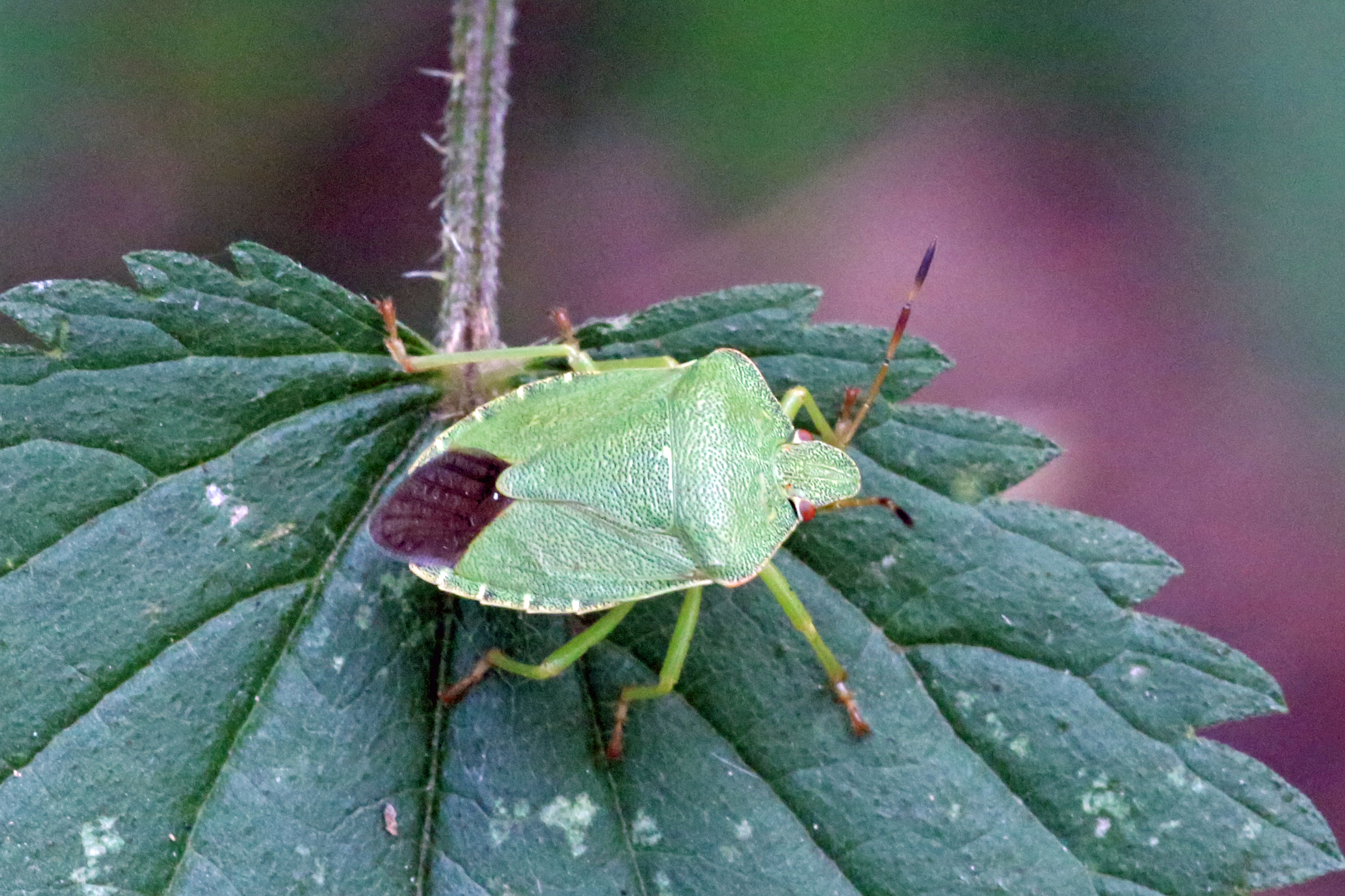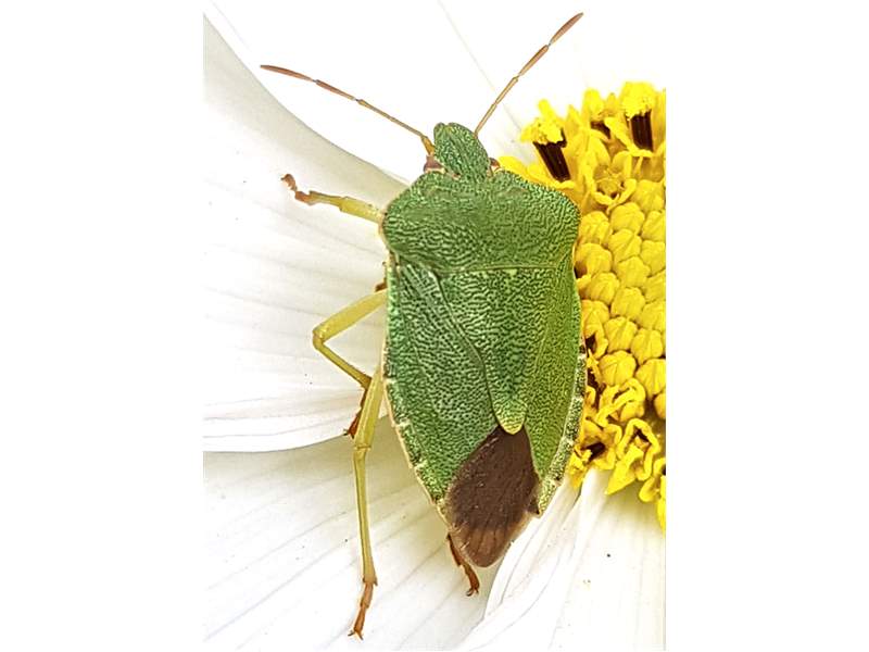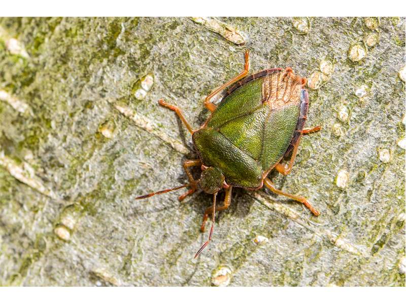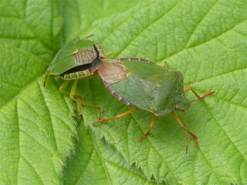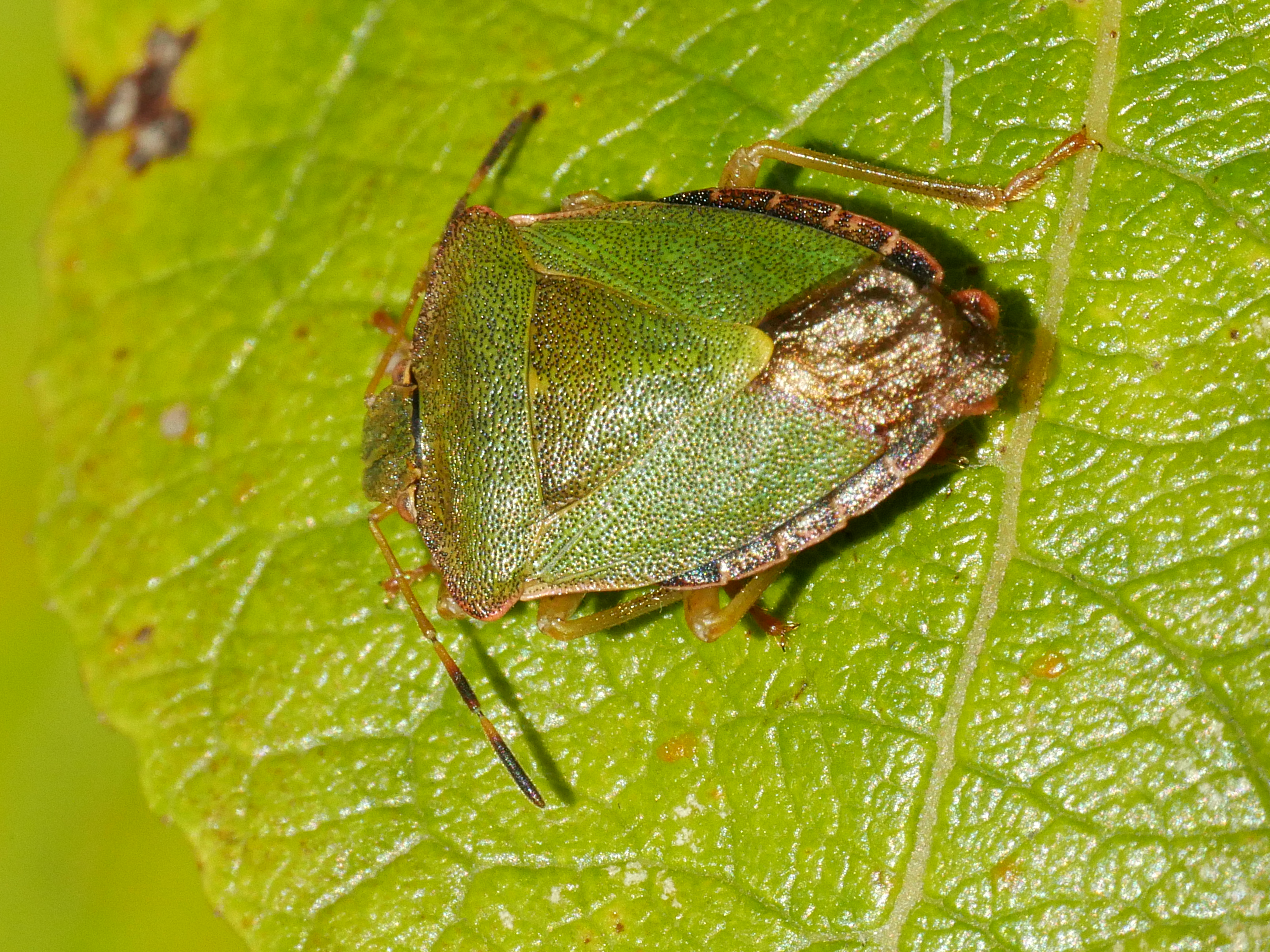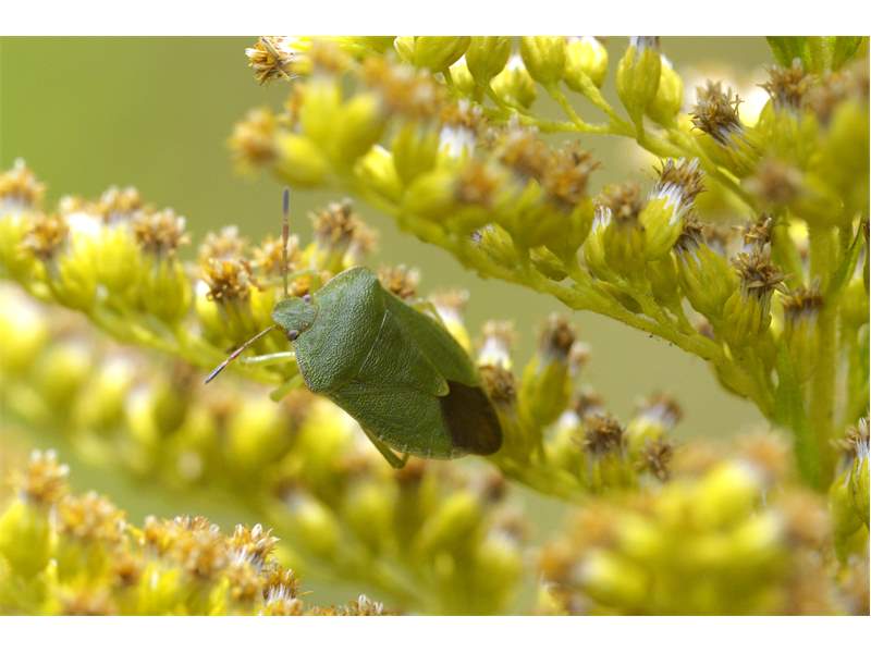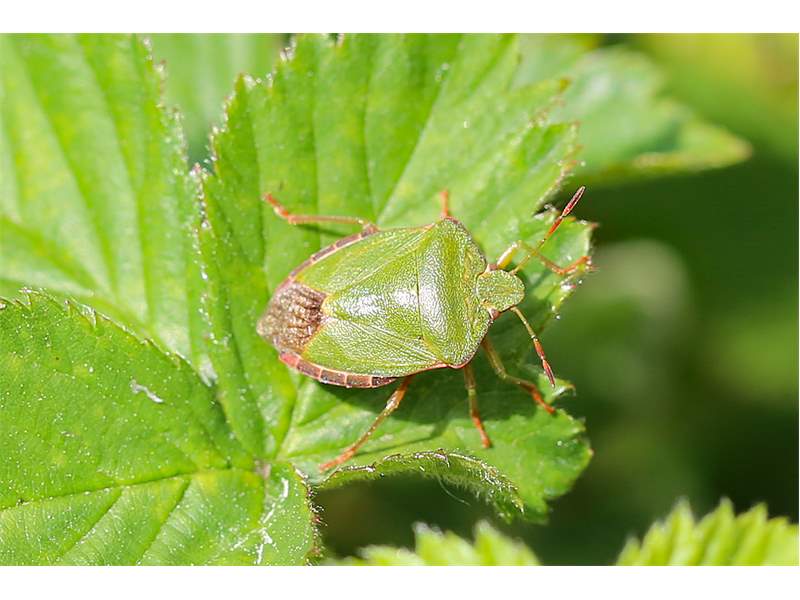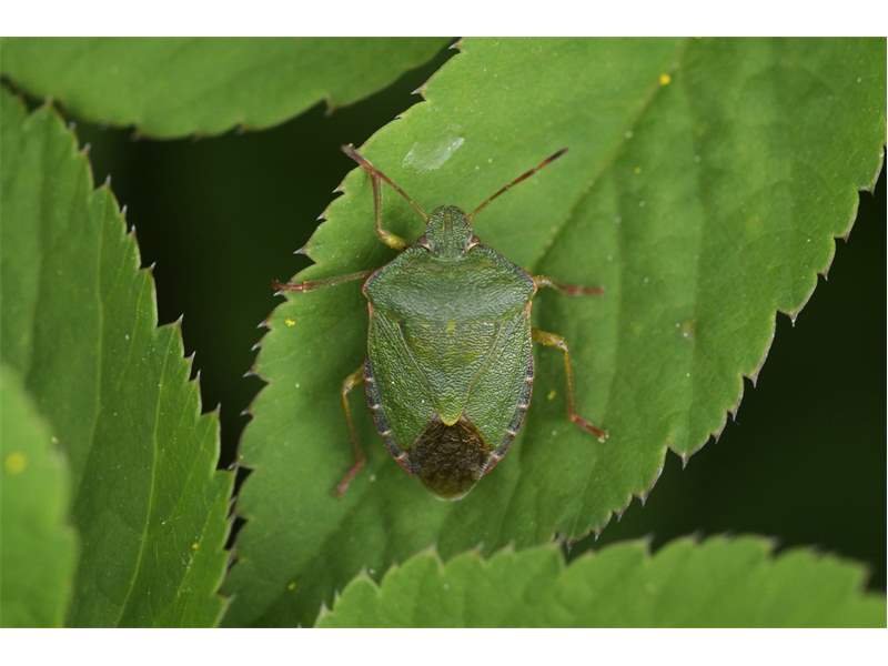 Grüne Stinkwanze (Palomena prasina (Linnaeus, 1761)), das zweite und dritte Fühlerglied sind annähernd gleich lang, im Unterschied zu Palomena viridissima, wo das dritte Fühlerglied kürzer als das zweite ist, am 1. Mai 2013 im Seifersdorfer Tal.