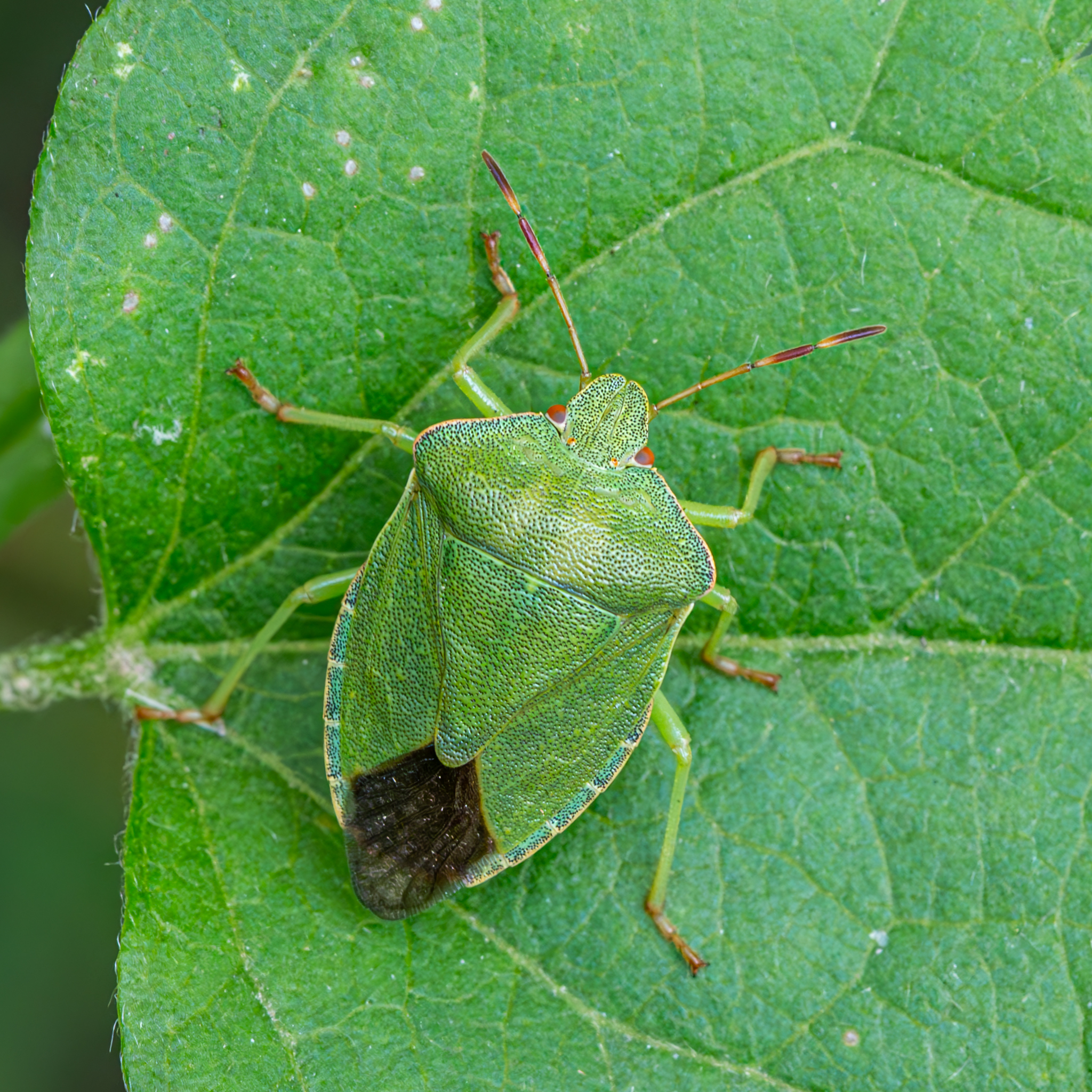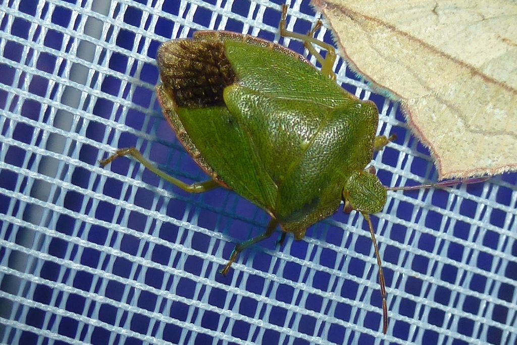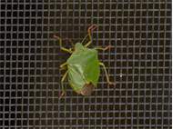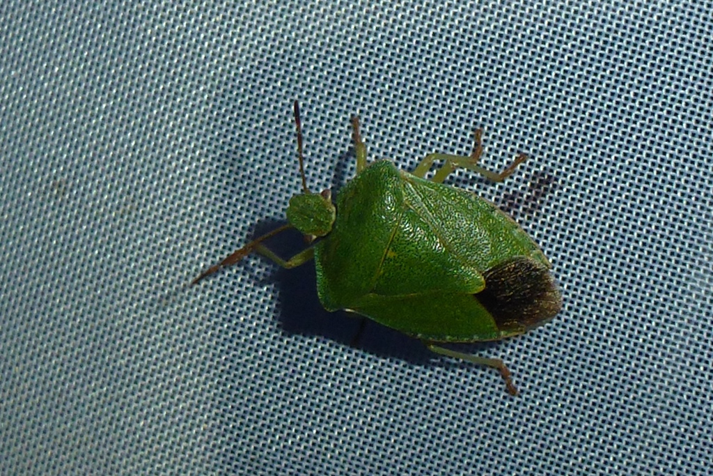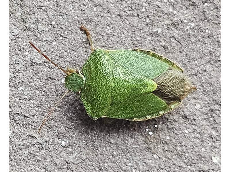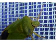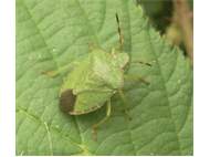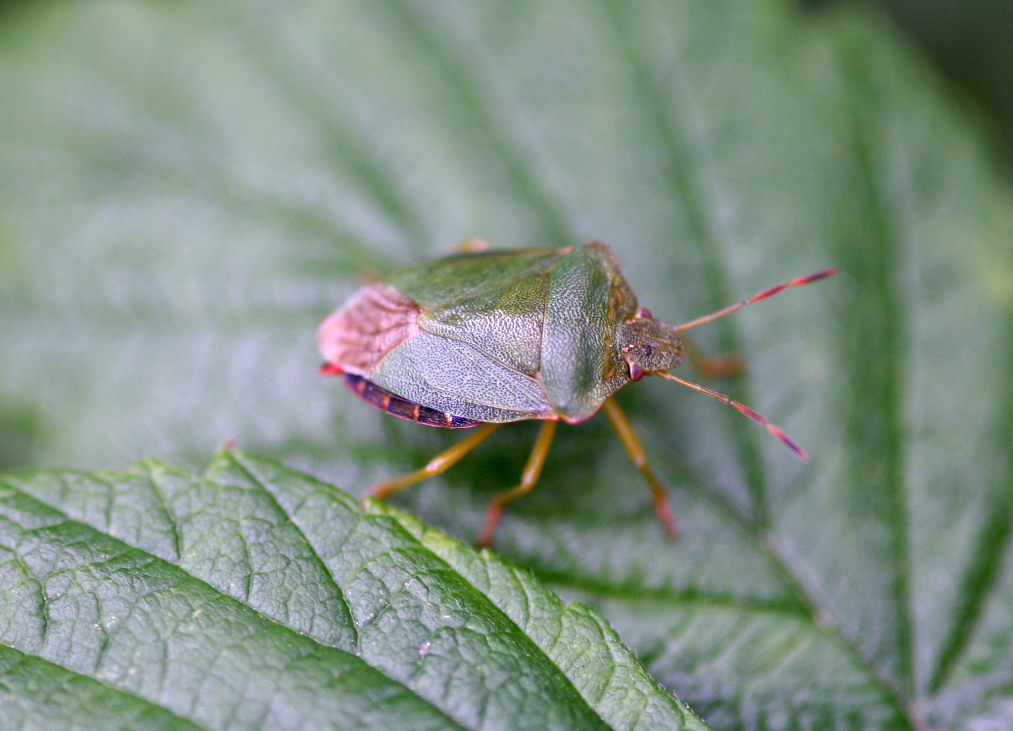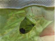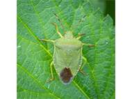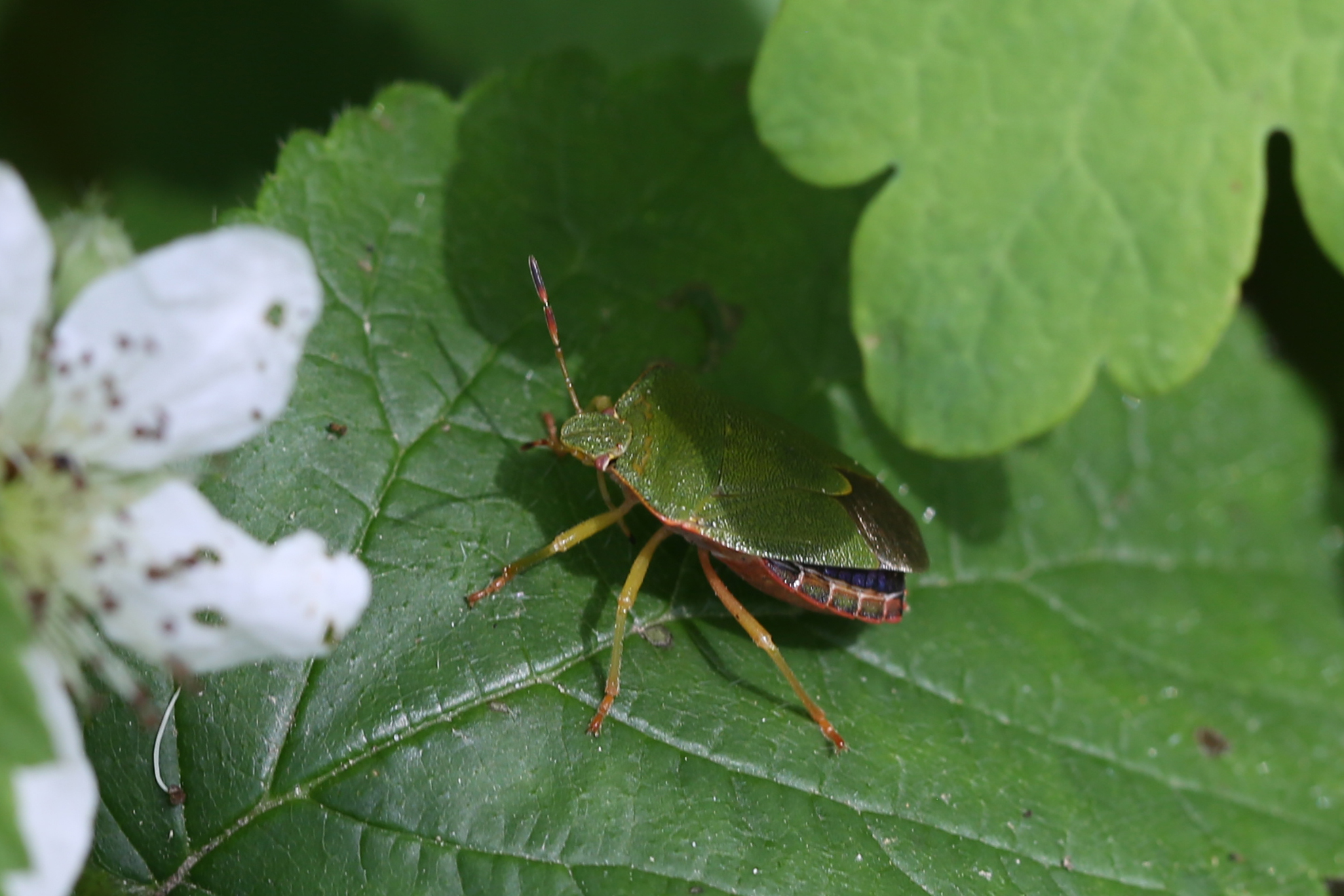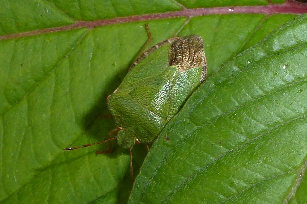 Grüne Stinkwanze (Palomena prasina (Linnaeus, 1761)), das zweite und dritte Fühlerglied sind annähernd gleich lang, im Unterschied zu Palomena viridissima, wo das dritte Fühlerglied kürzer als das zweite ist, am 1. Mai 2013 im Seifersdorfer Tal.
