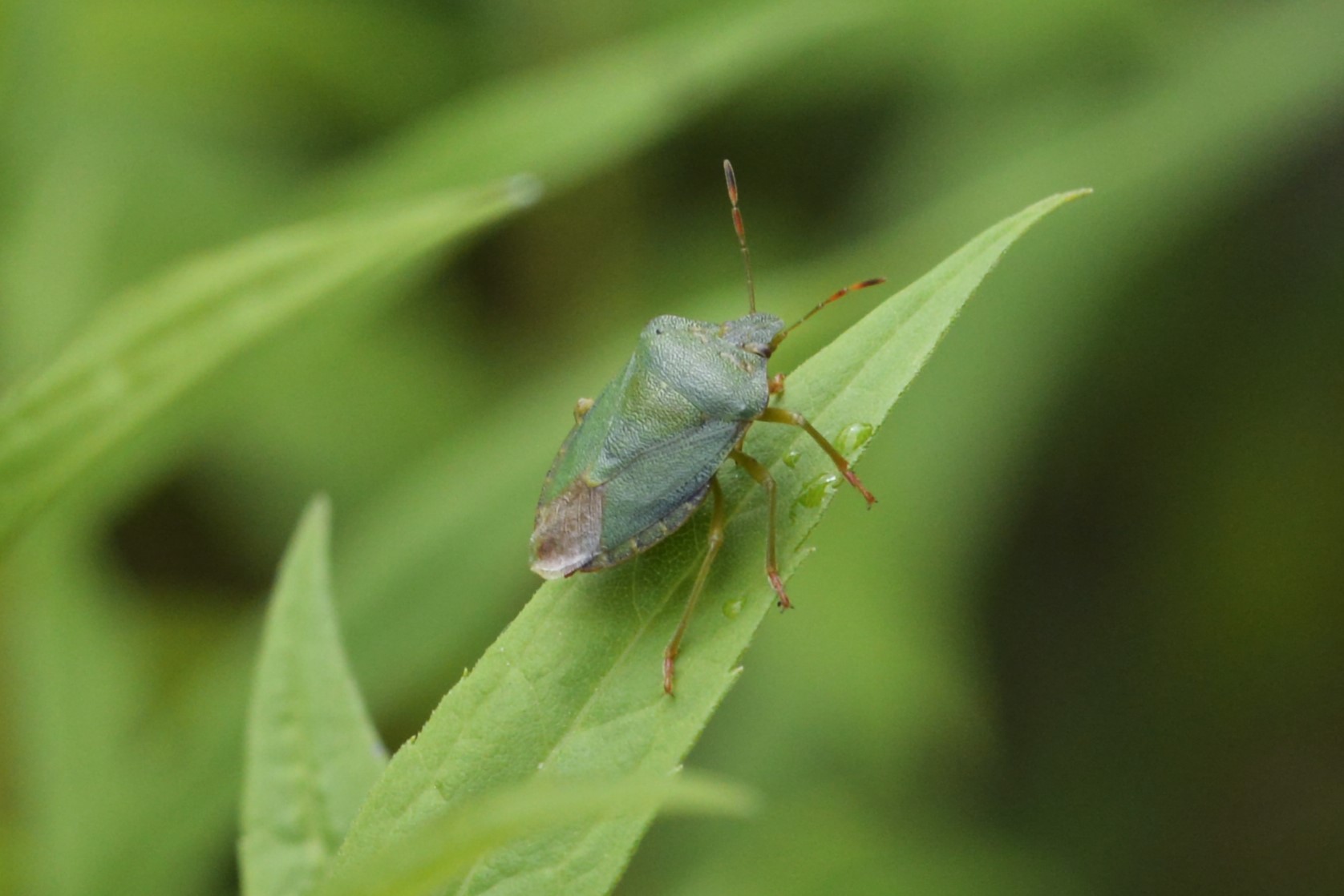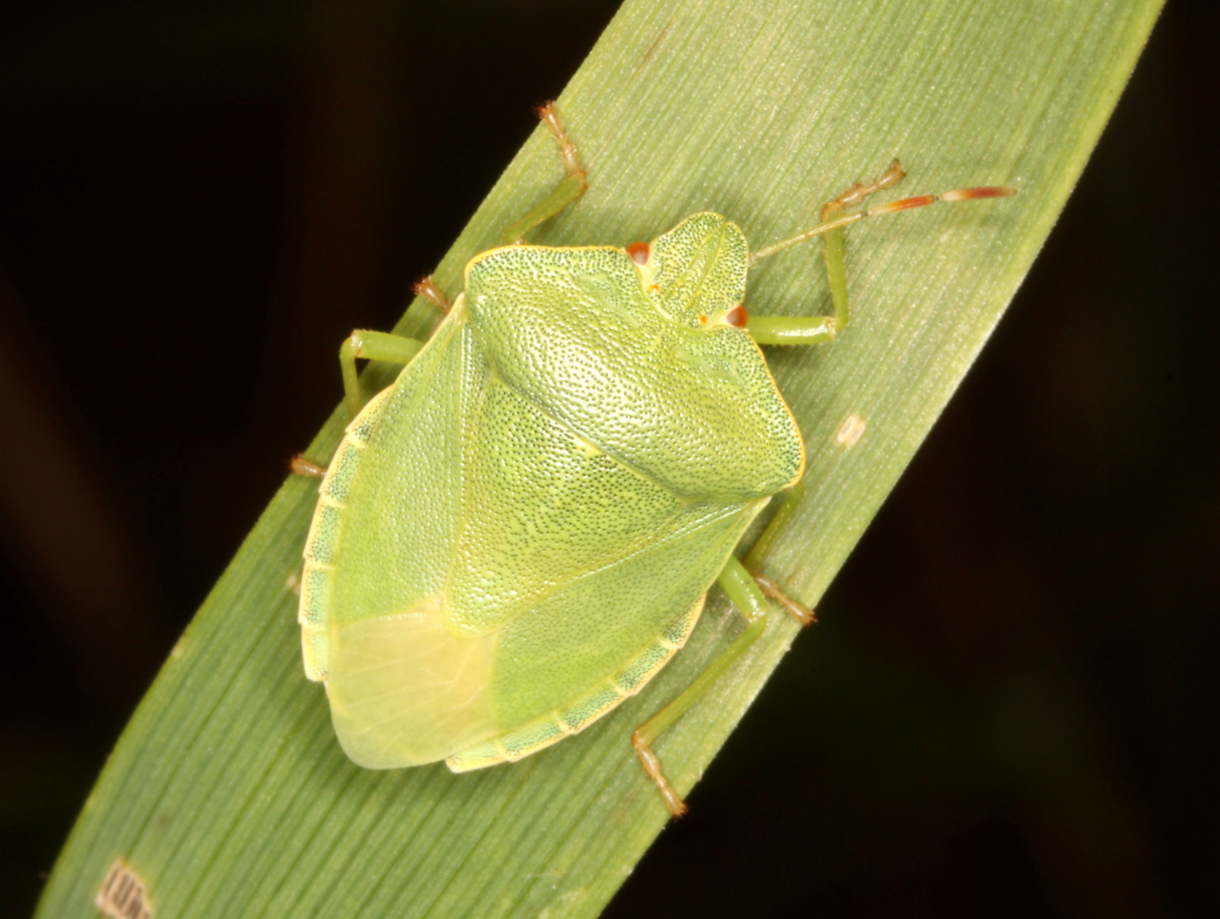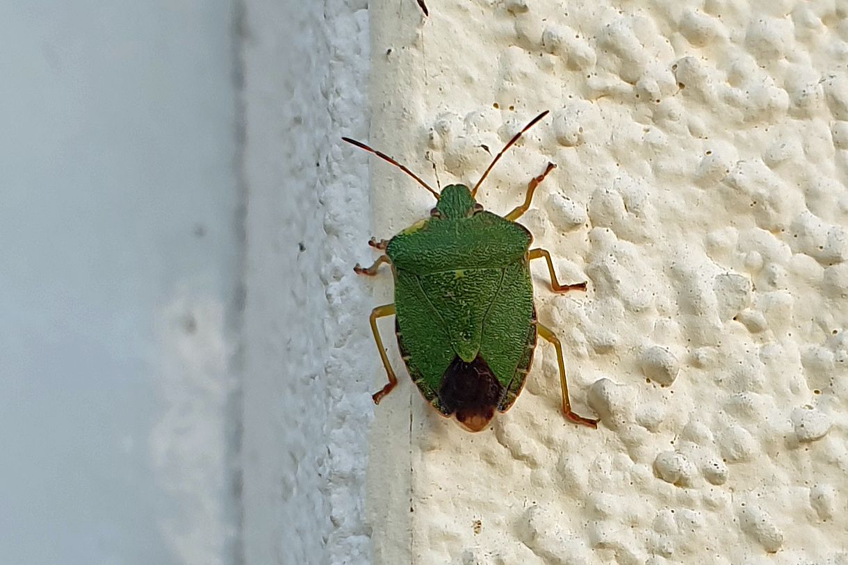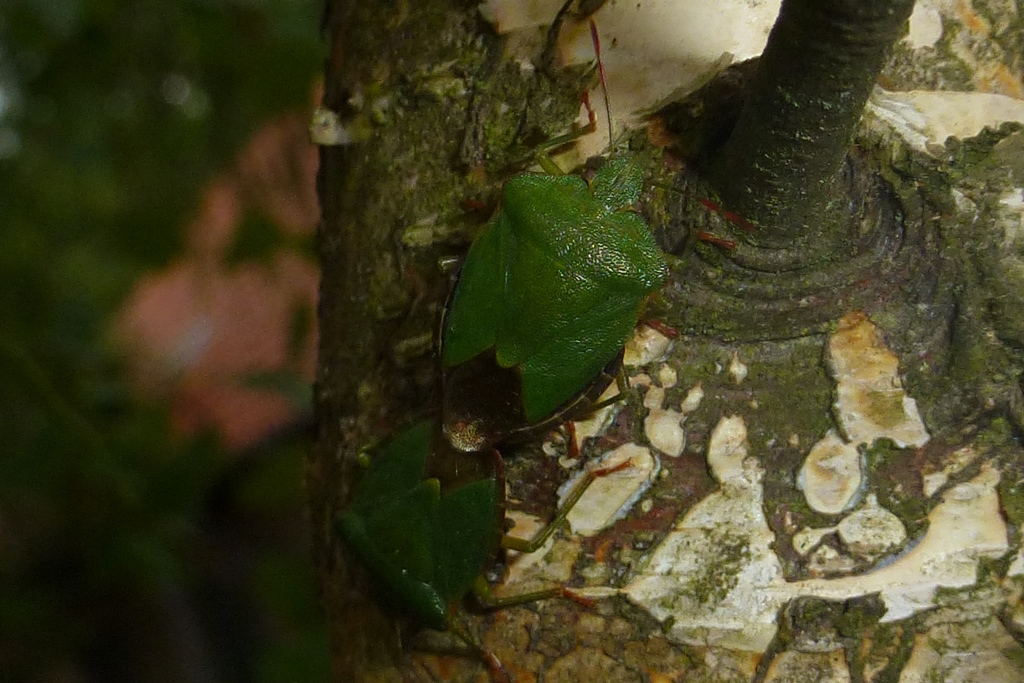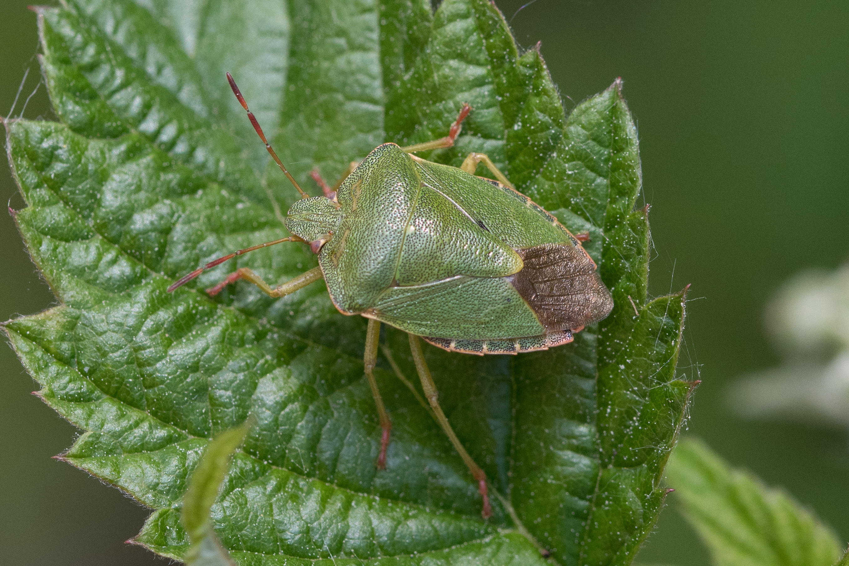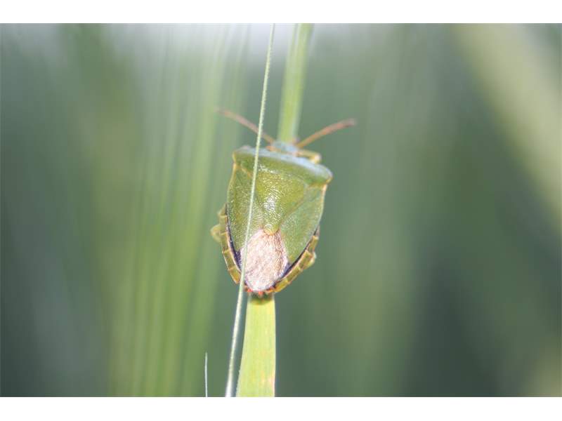 Grüne Stinkwanze (Palomena prasina (Linnaeus, 1761)), das zweite und dritte Fühlerglied sind annähernd gleich lang, im Unterschied zu Palomena viridissima, wo das dritte Fühlerglied kürzer als das zweite ist, am 1. Mai 2013 im Seifersdorfer Tal.