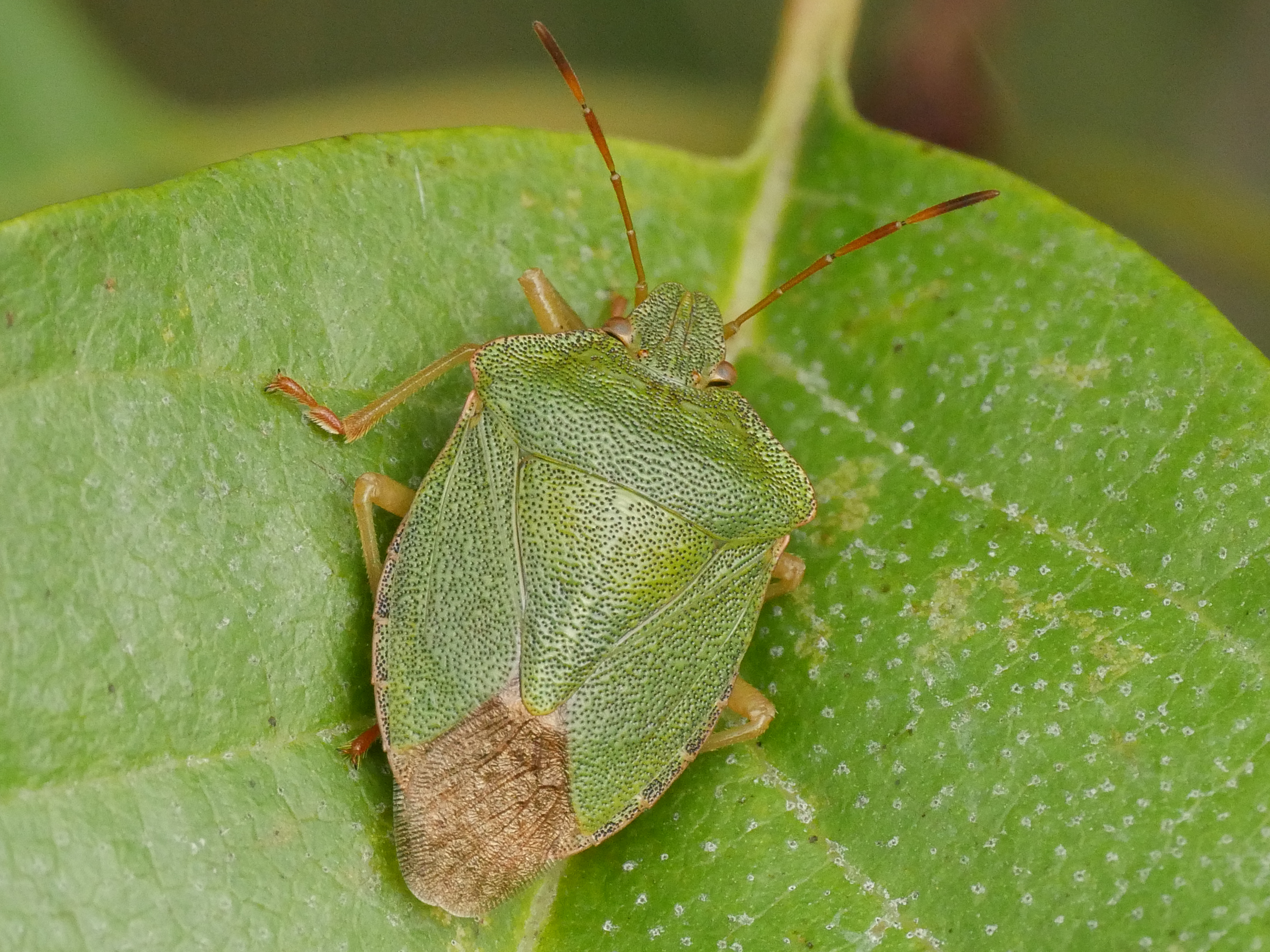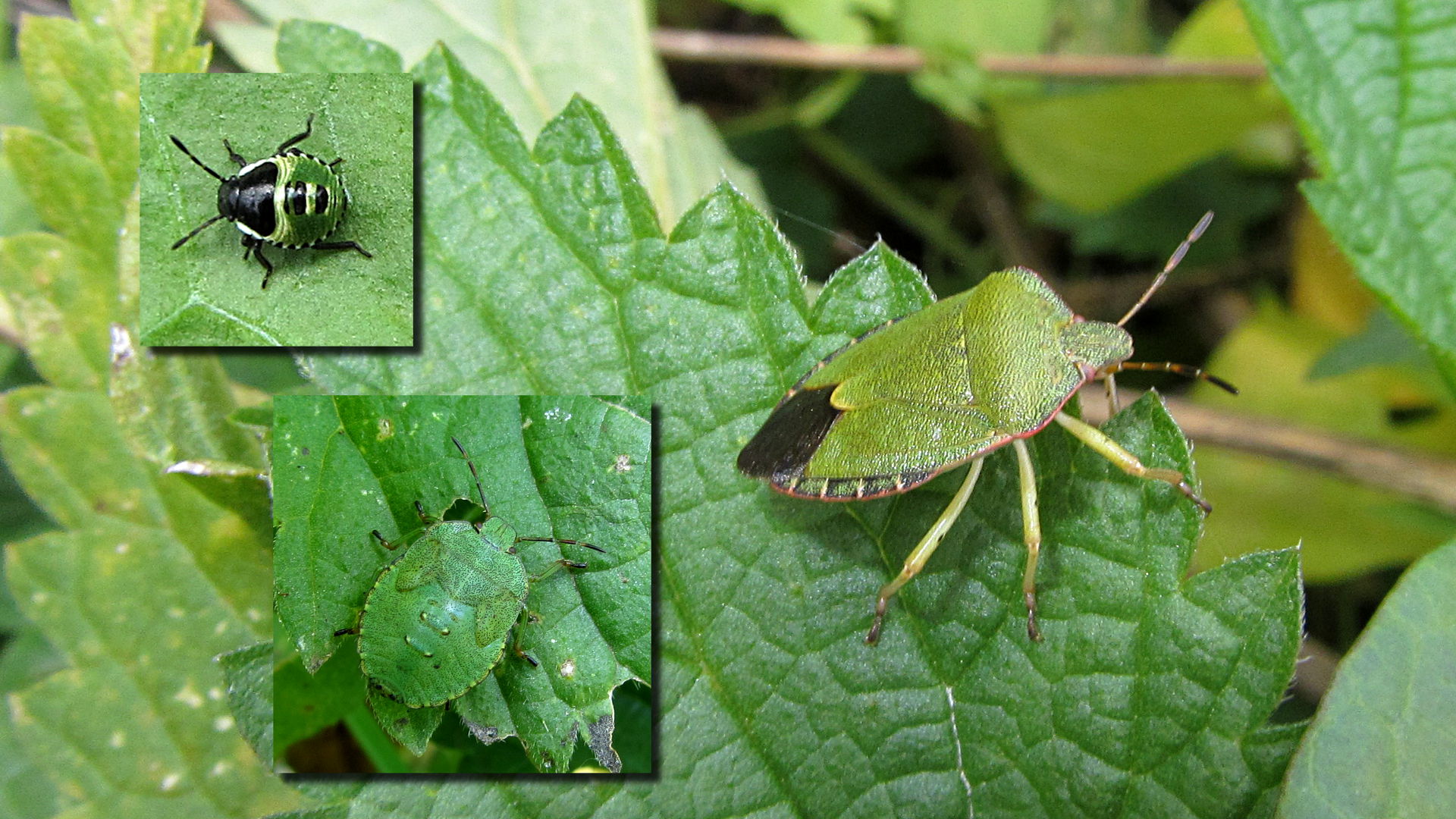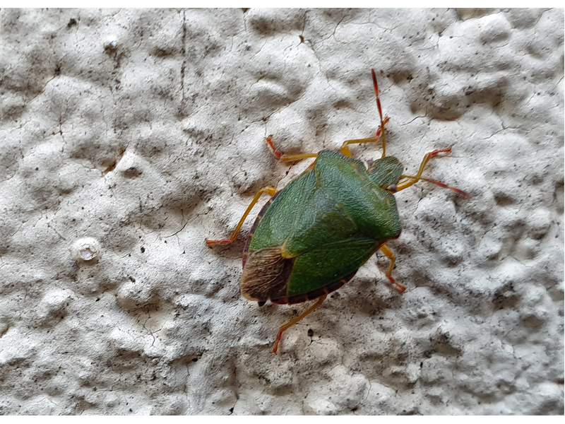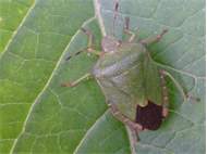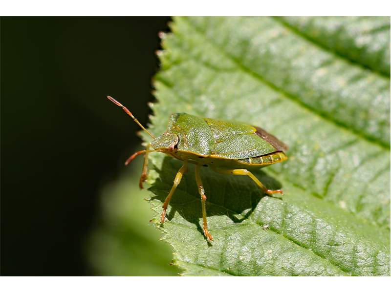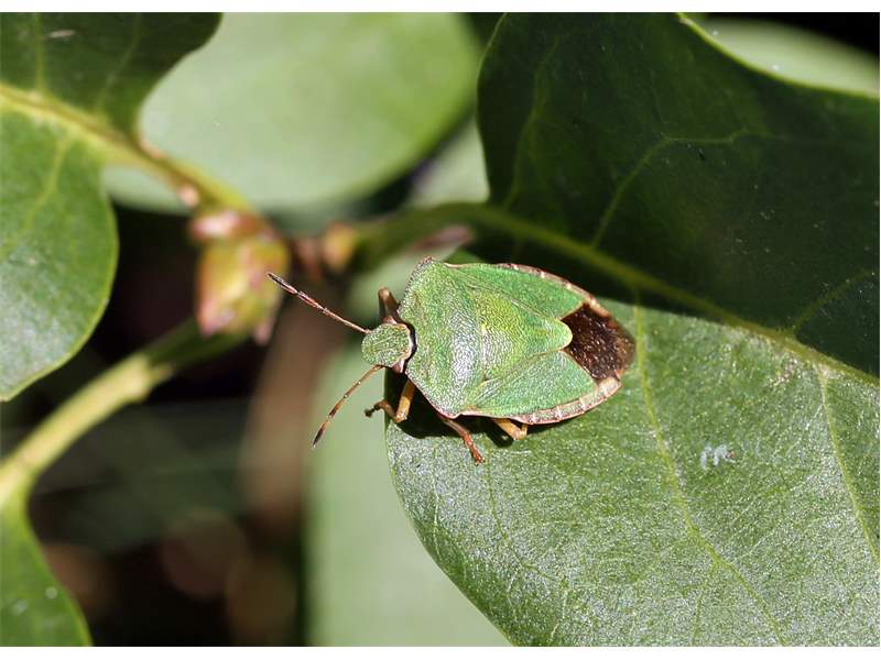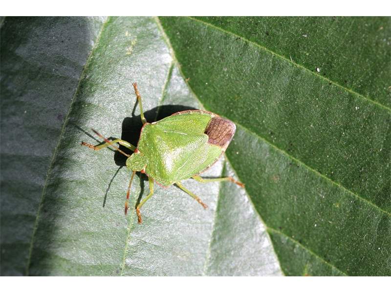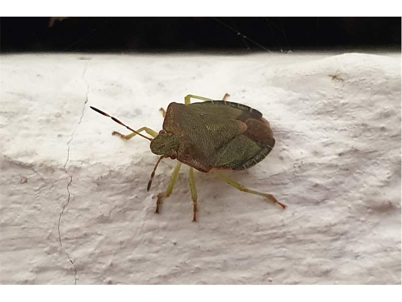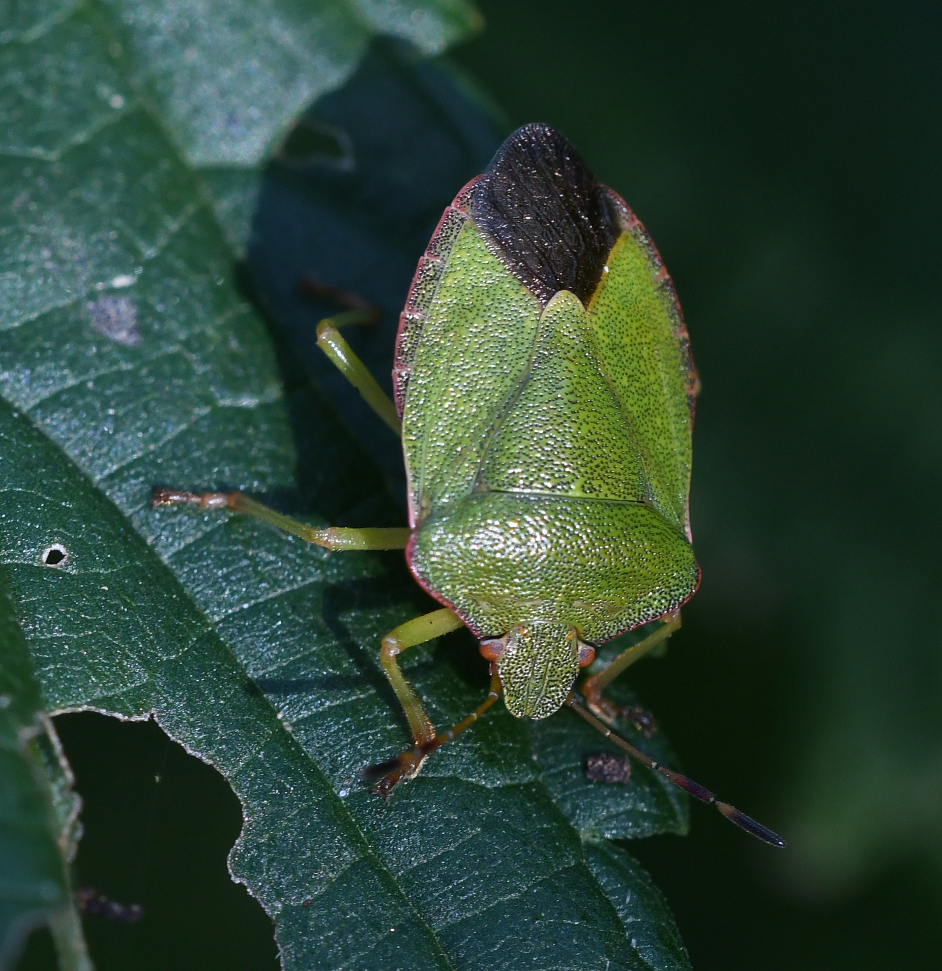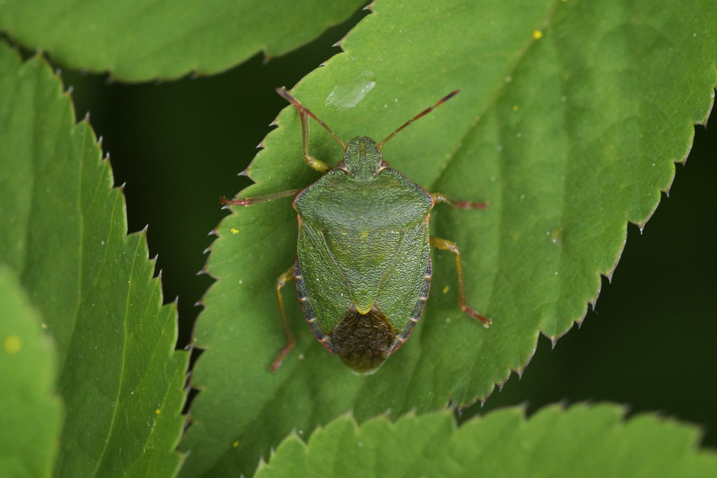 Grüne Stinkwanze (Palomena prasina (Linnaeus, 1761)), das zweite und dritte Fühlerglied sind annähernd gleich lang, im Unterschied zu Palomena viridissima, wo das dritte Fühlerglied kürzer als das zweite ist, am 1. Mai 2013 im Seifersdorfer Tal.