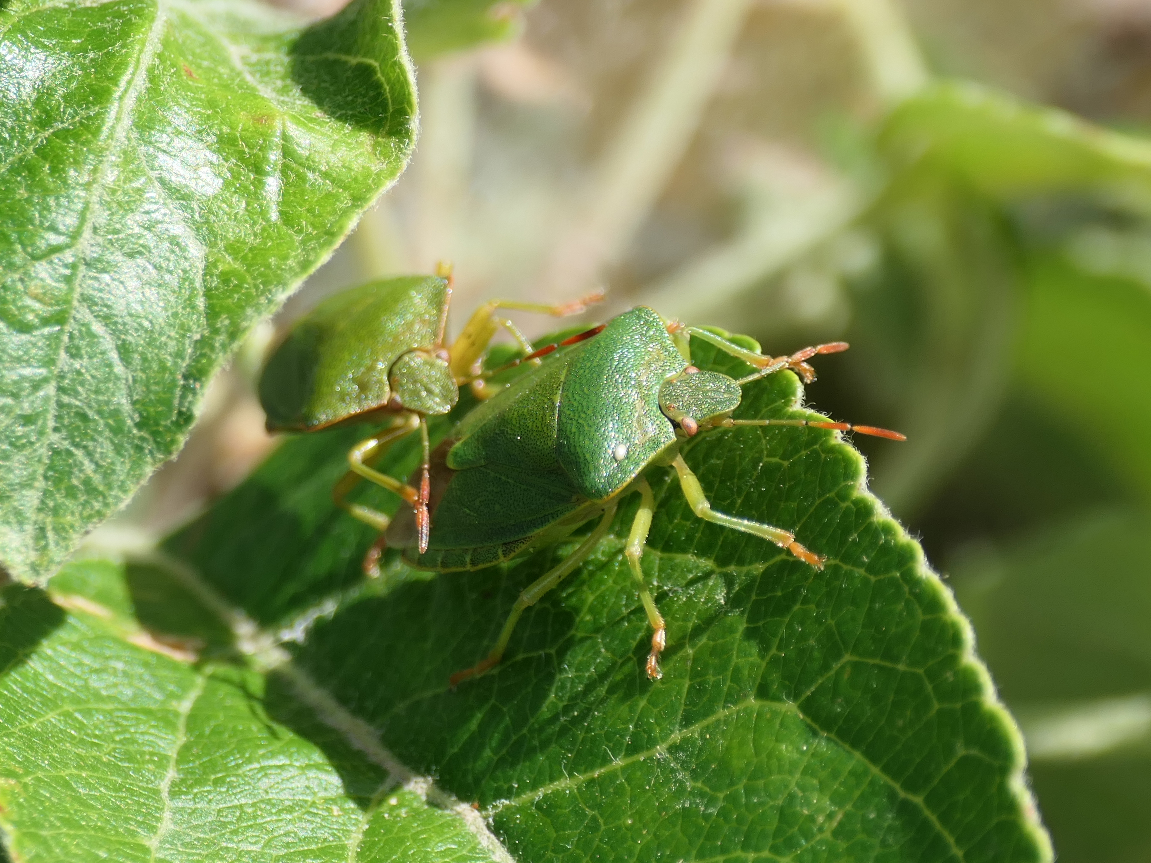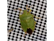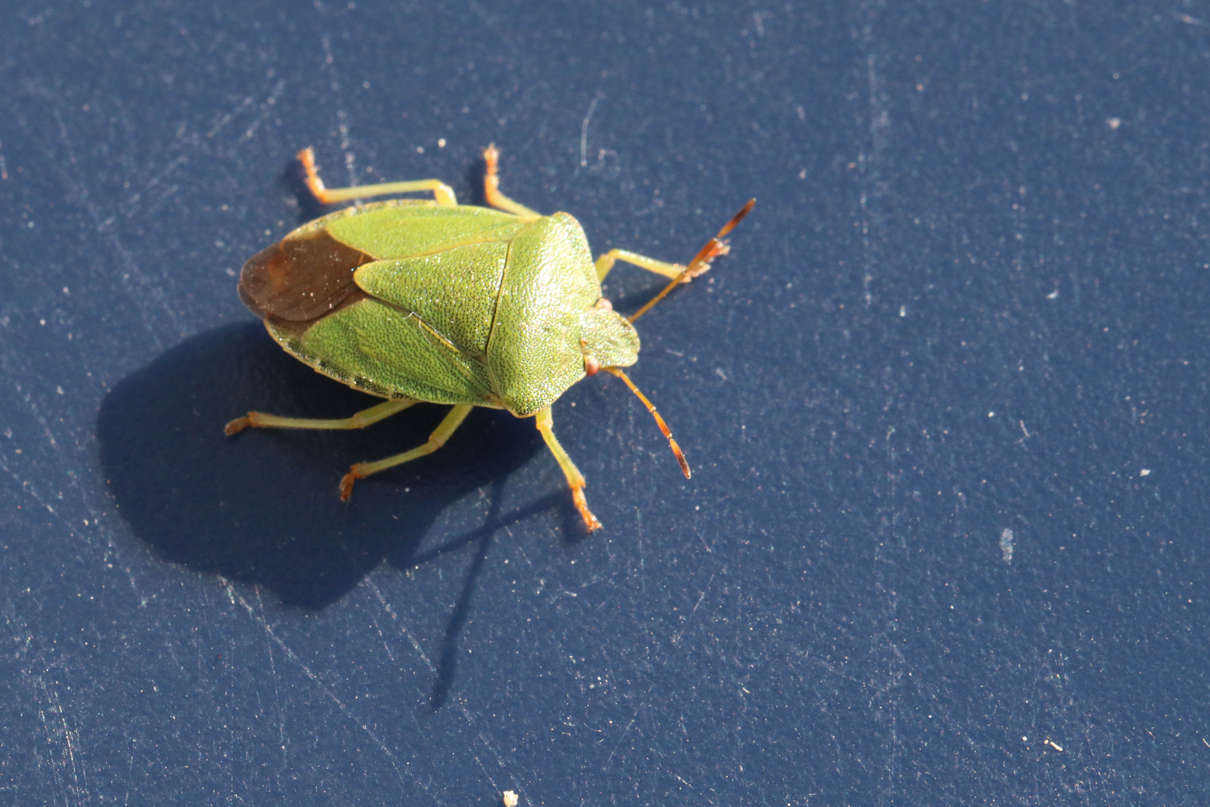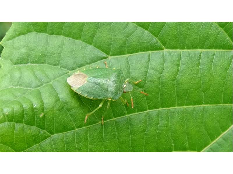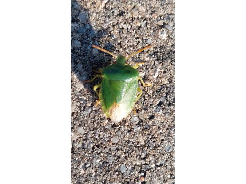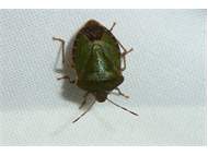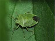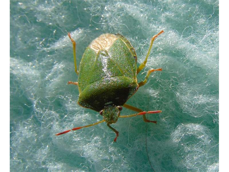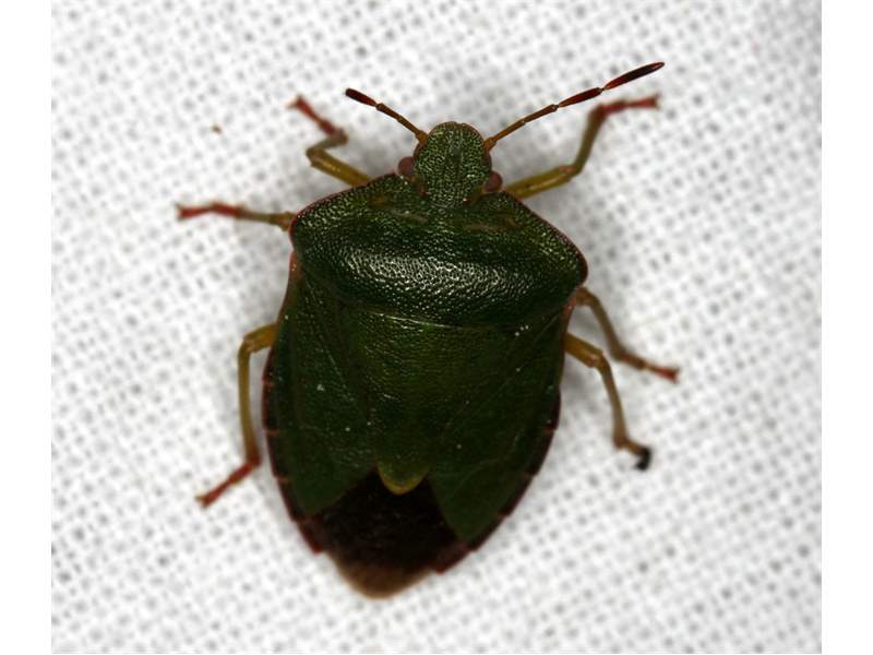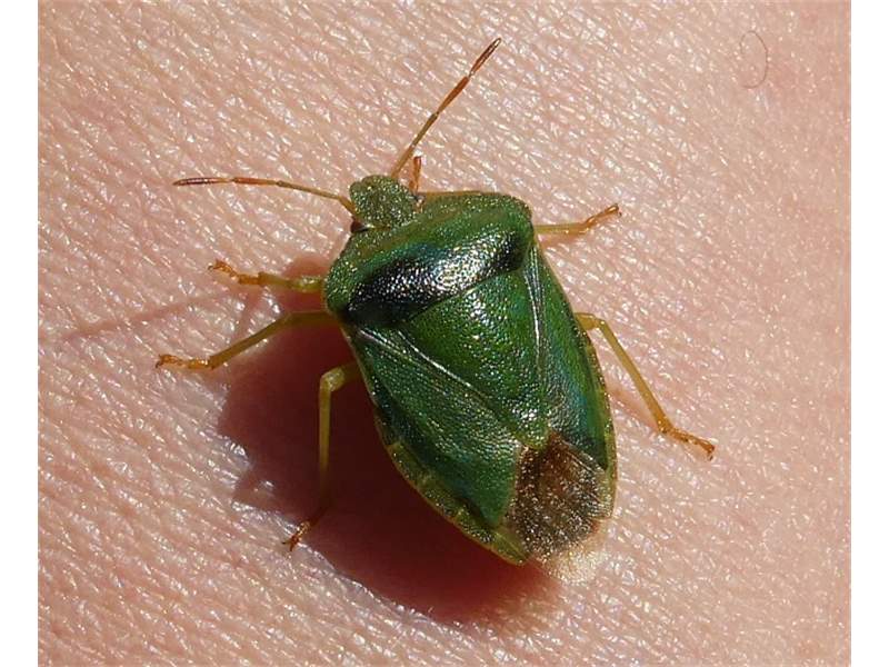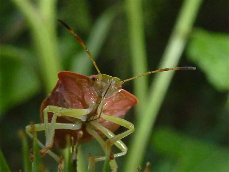 Grüne Stinkwanze (Palomena prasina (Linnaeus, 1761)), das zweite und dritte Fühlerglied sind annähernd gleich lang, im Unterschied zu Palomena viridissima, wo das dritte Fühlerglied kürzer als das zweite ist, am 1. Mai 2013 im Seifersdorfer Tal.