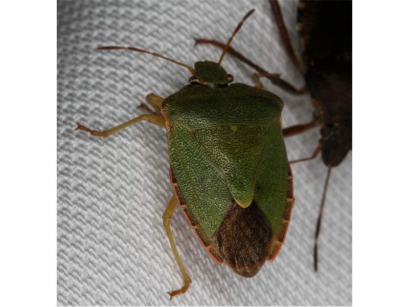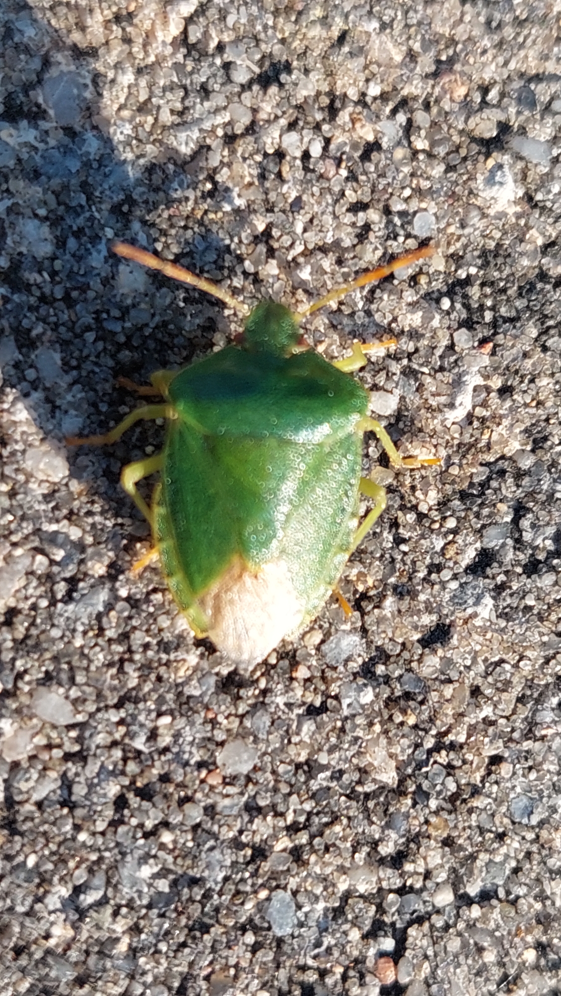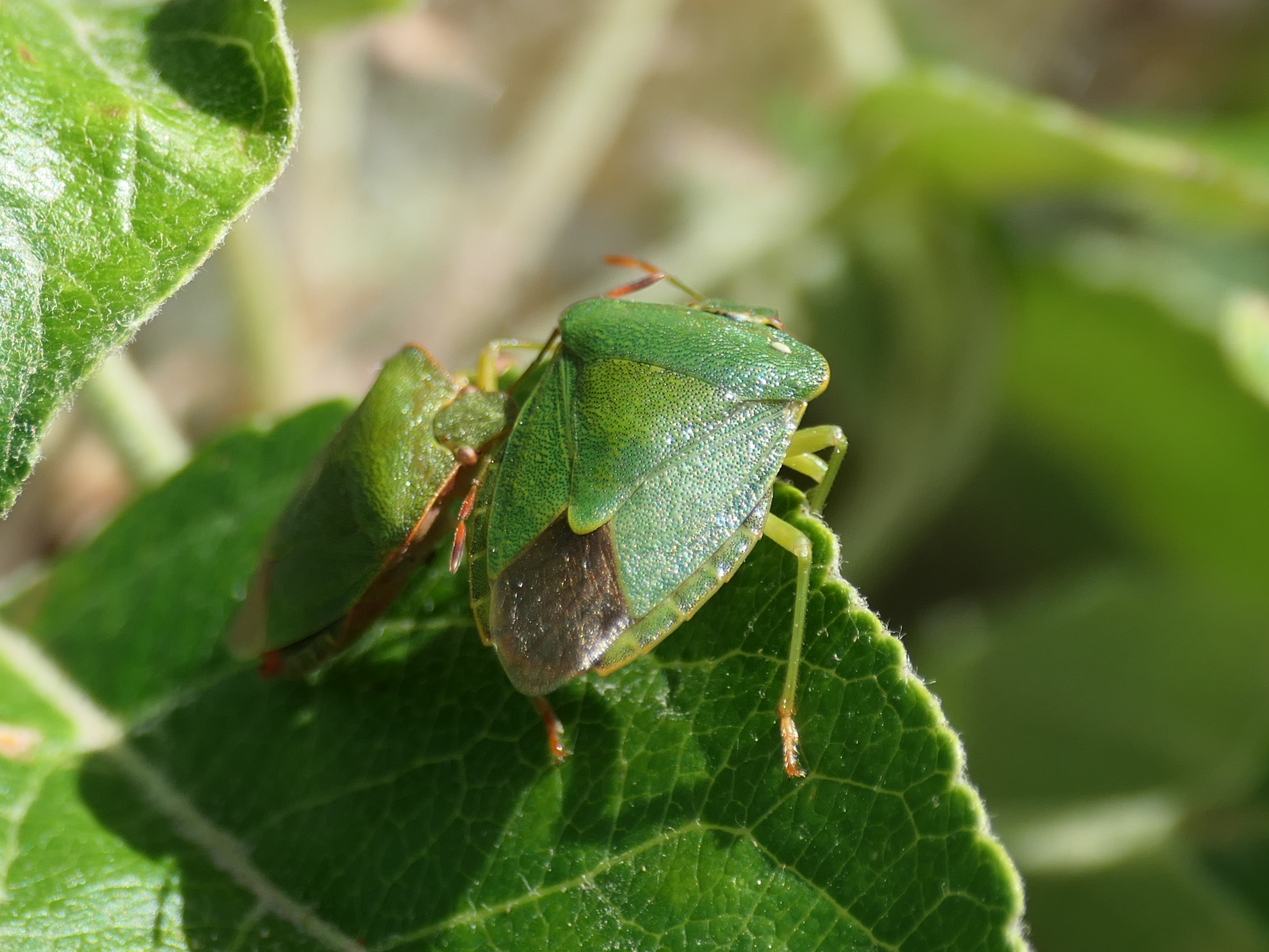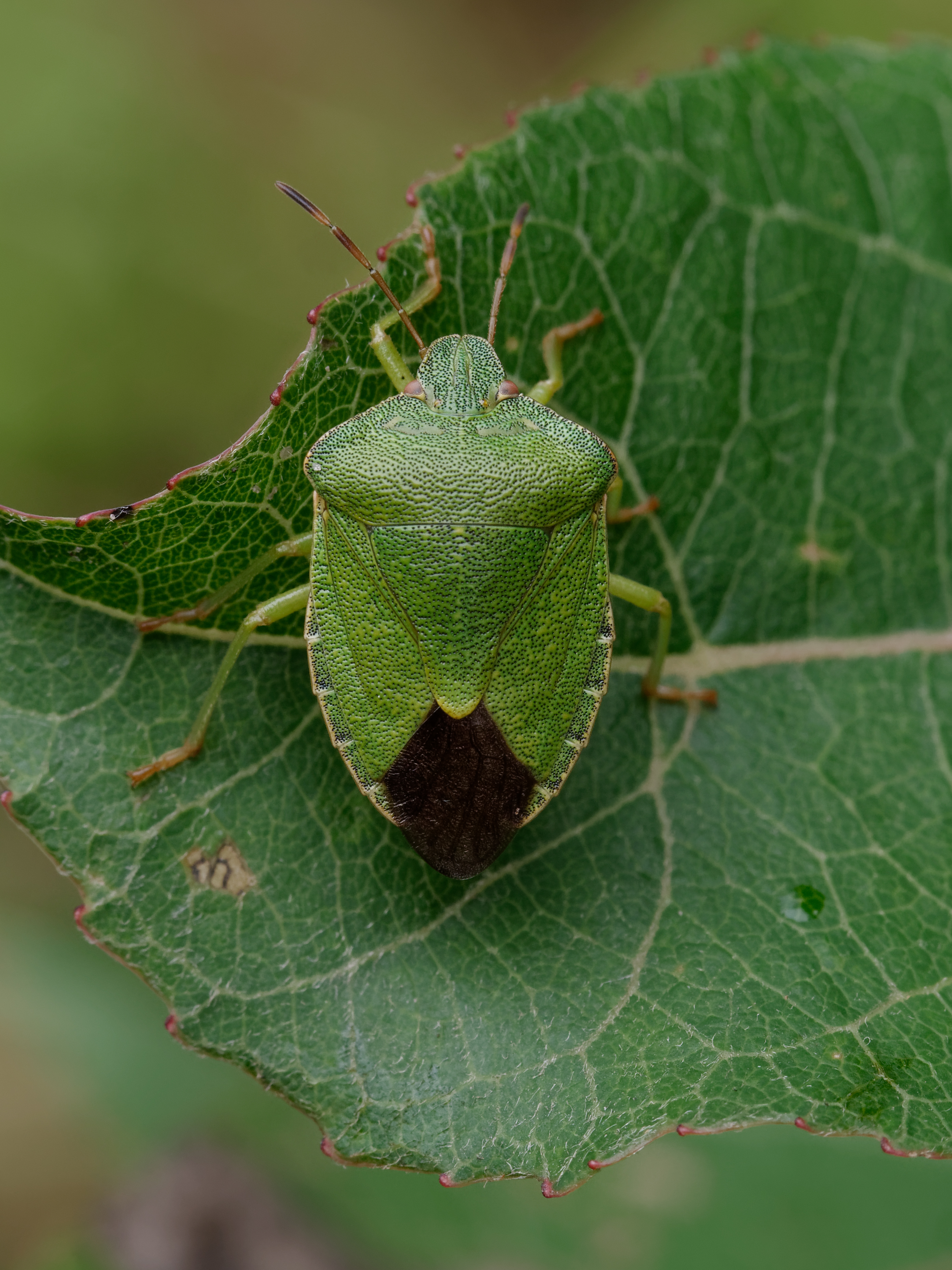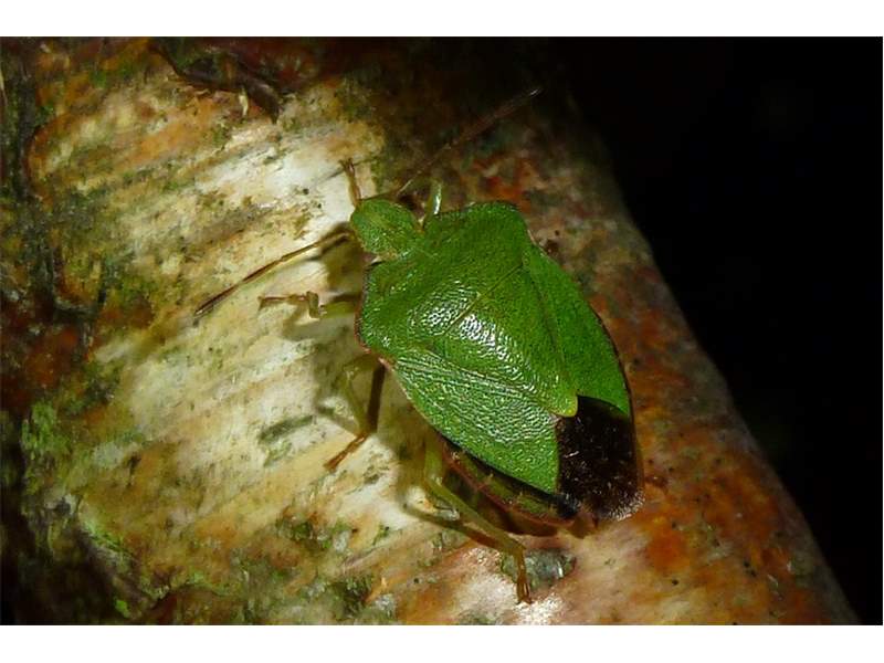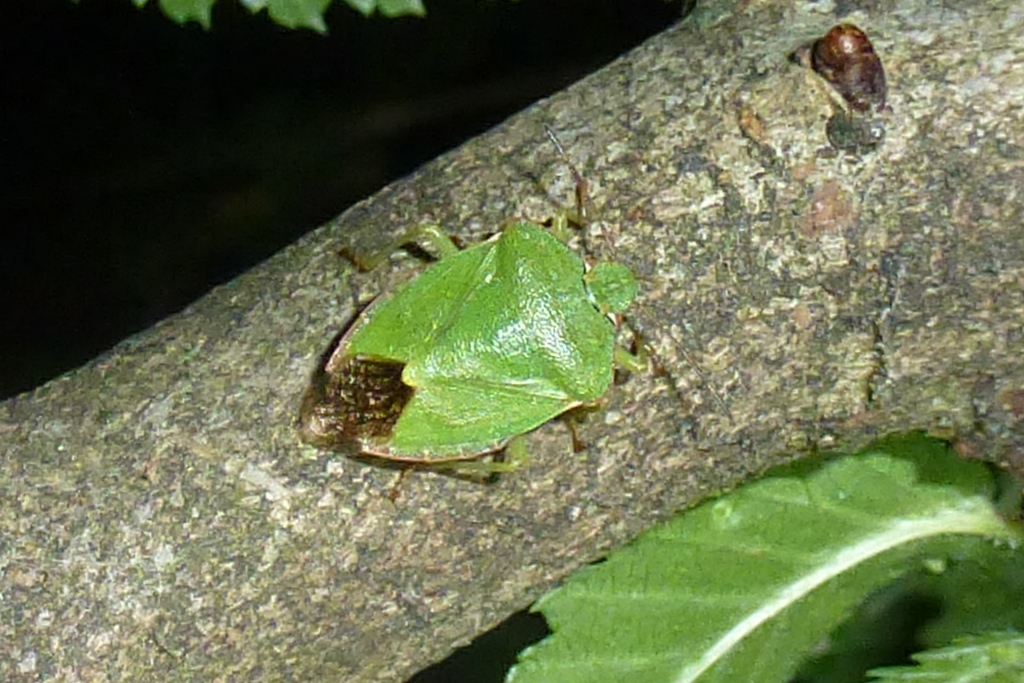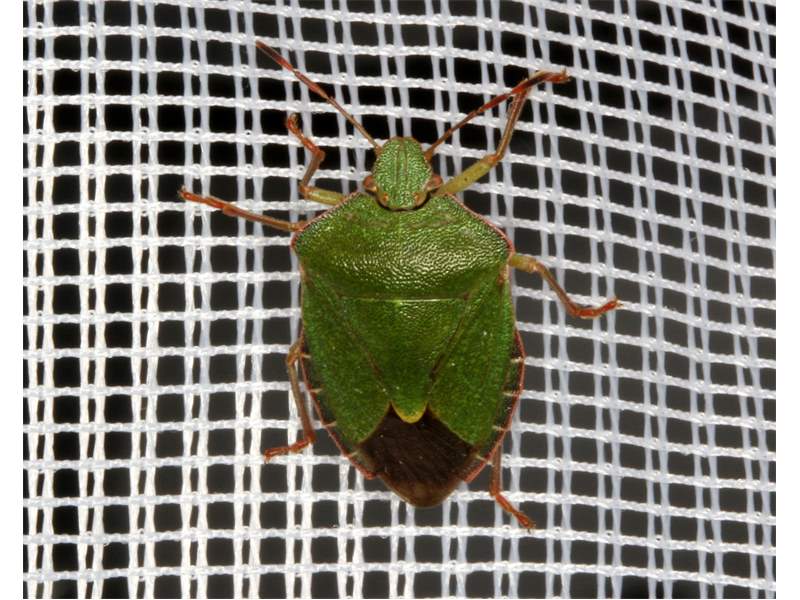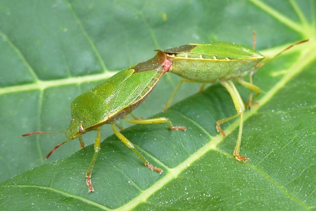 Grüne Stinkwanze (Palomena prasina (Linnaeus, 1761)), das zweite und dritte Fühlerglied sind annähernd gleich lang, im Unterschied zu Palomena viridissima, wo das dritte Fühlerglied kürzer als das zweite ist, am 1. Mai 2013 im Seifersdorfer Tal.