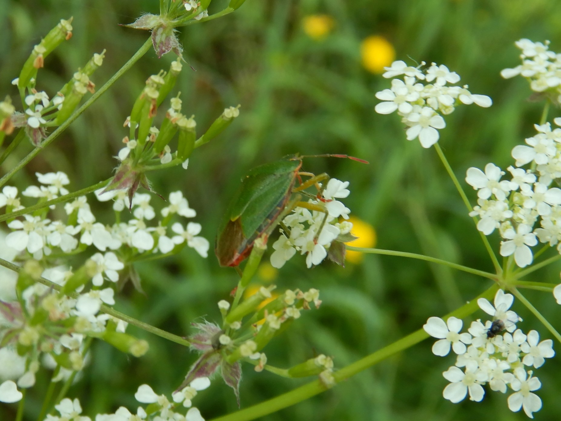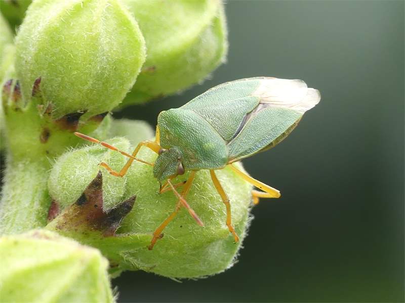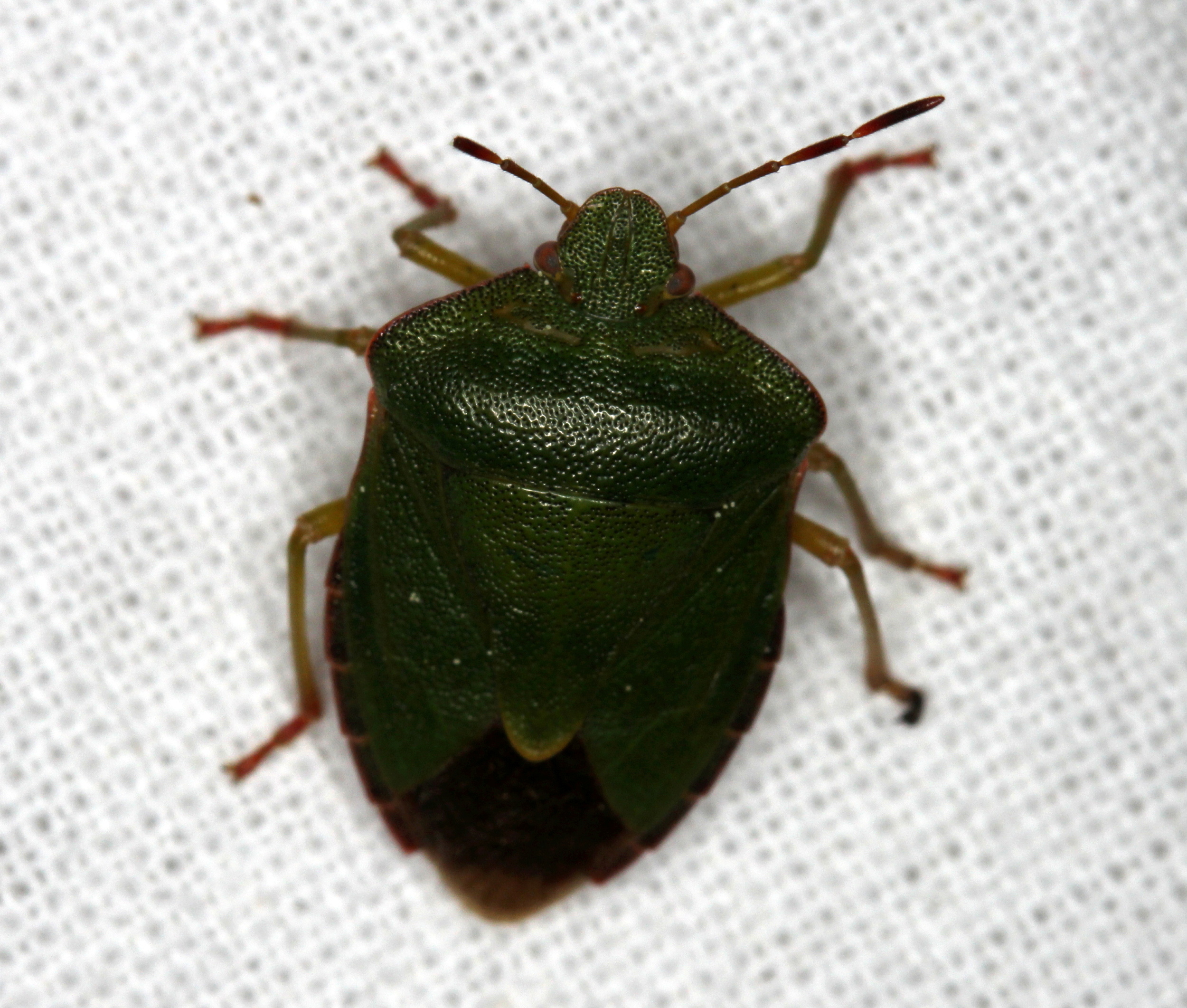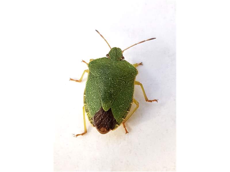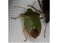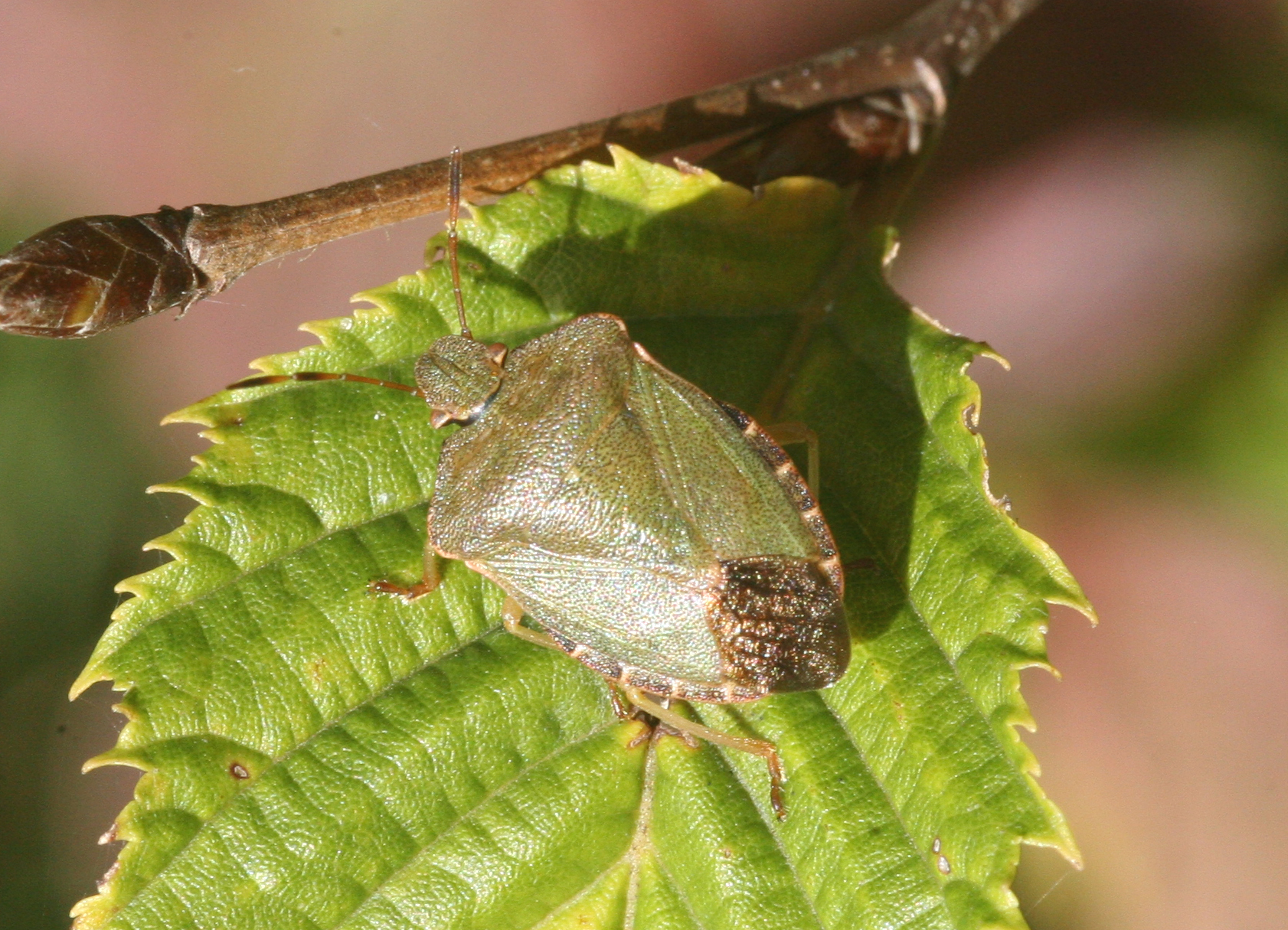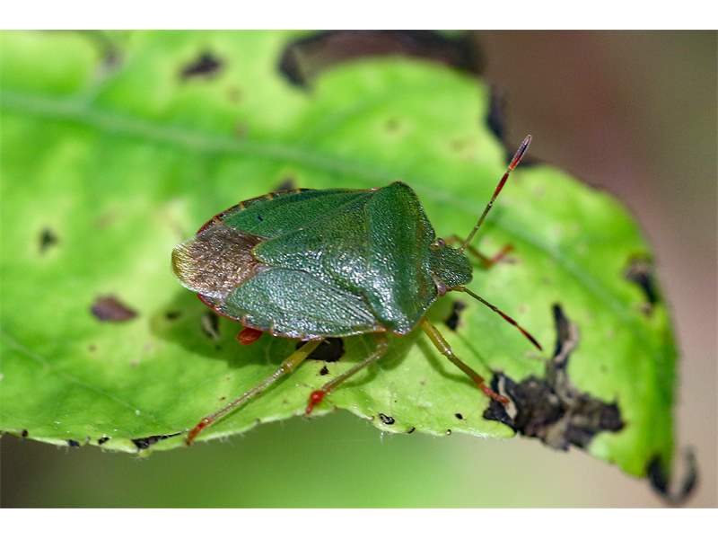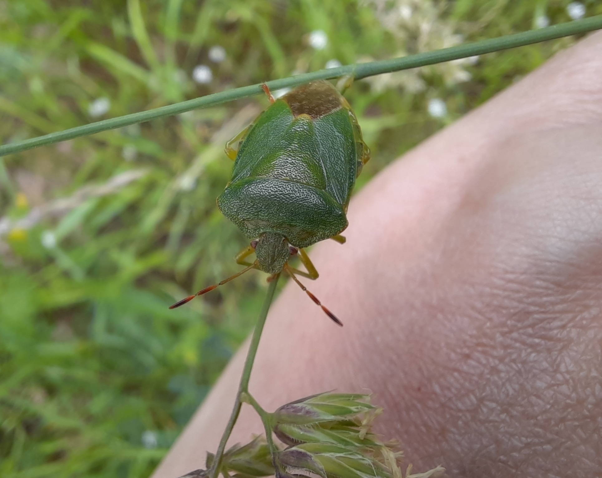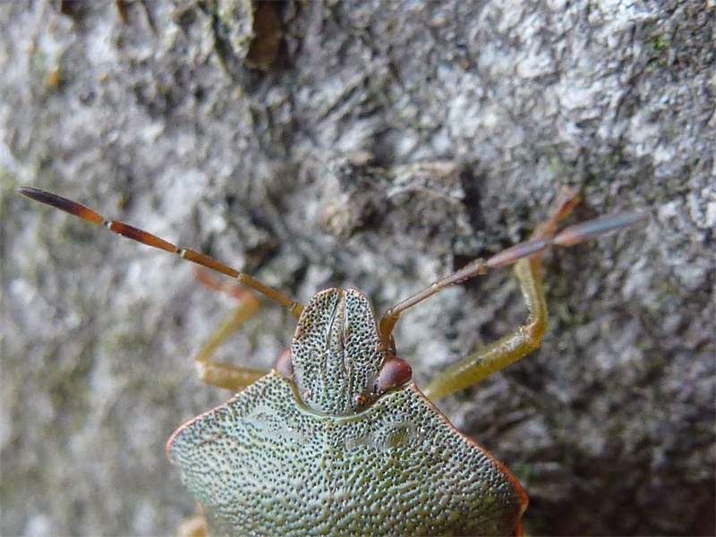 Grüne Stinkwanze (Palomena prasina (Linnaeus, 1761)), das zweite und dritte Fühlerglied sind annähernd gleich lang, im Unterschied zu Palomena viridissima, wo das dritte Fühlerglied kürzer als das zweite ist, am 1. Mai 2013 im Seifersdorfer Tal.