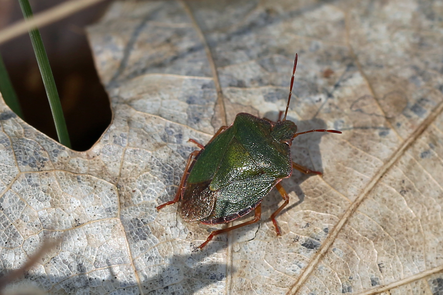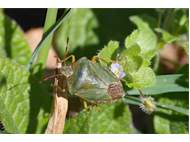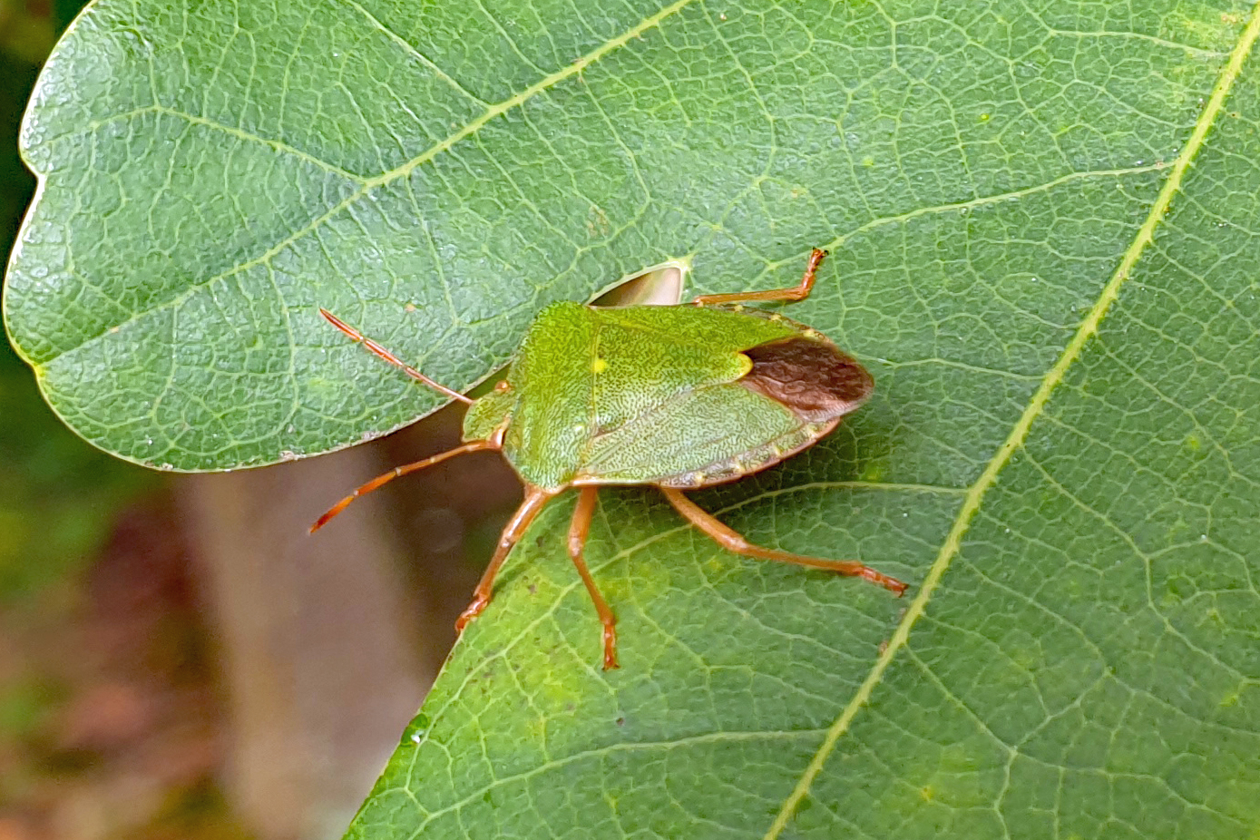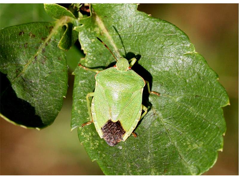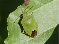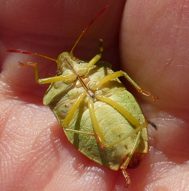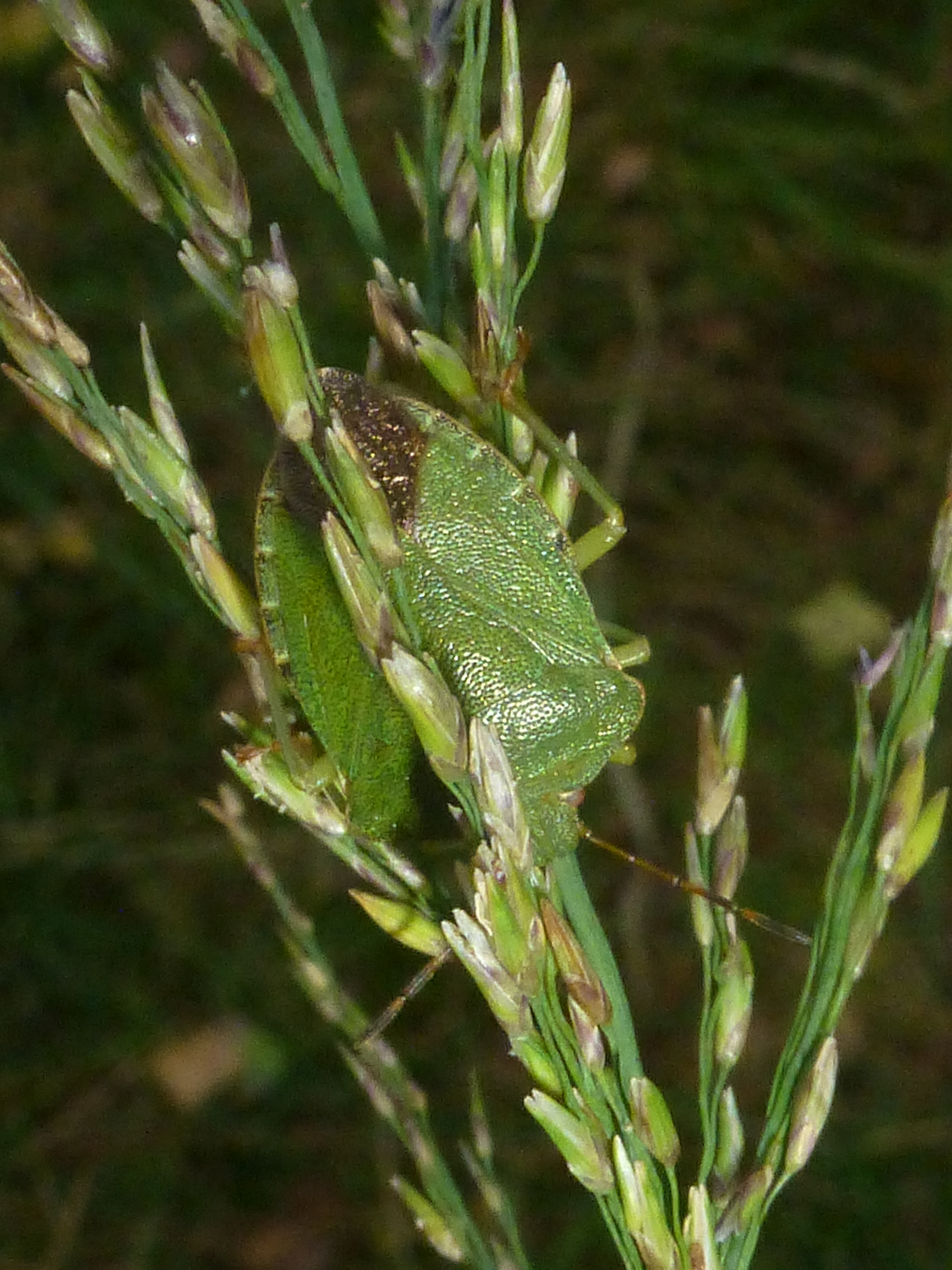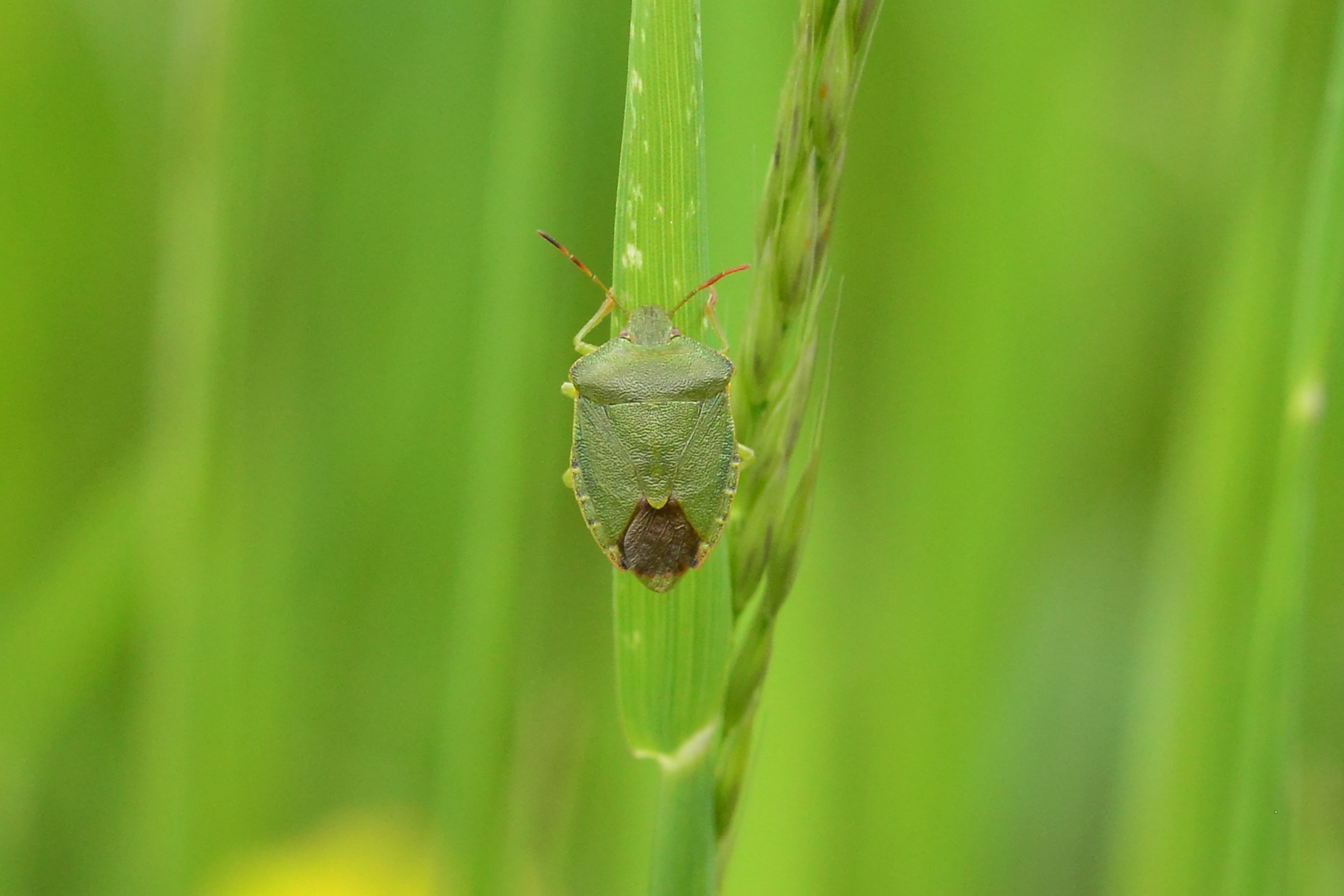 Grüne Stinkwanze (Palomena prasina (Linnaeus, 1761)), das zweite und dritte Fühlerglied sind annähernd gleich lang, im Unterschied zu Palomena viridissima, wo das dritte Fühlerglied kürzer als das zweite ist, am 1. Mai 2013 im Seifersdorfer Tal.